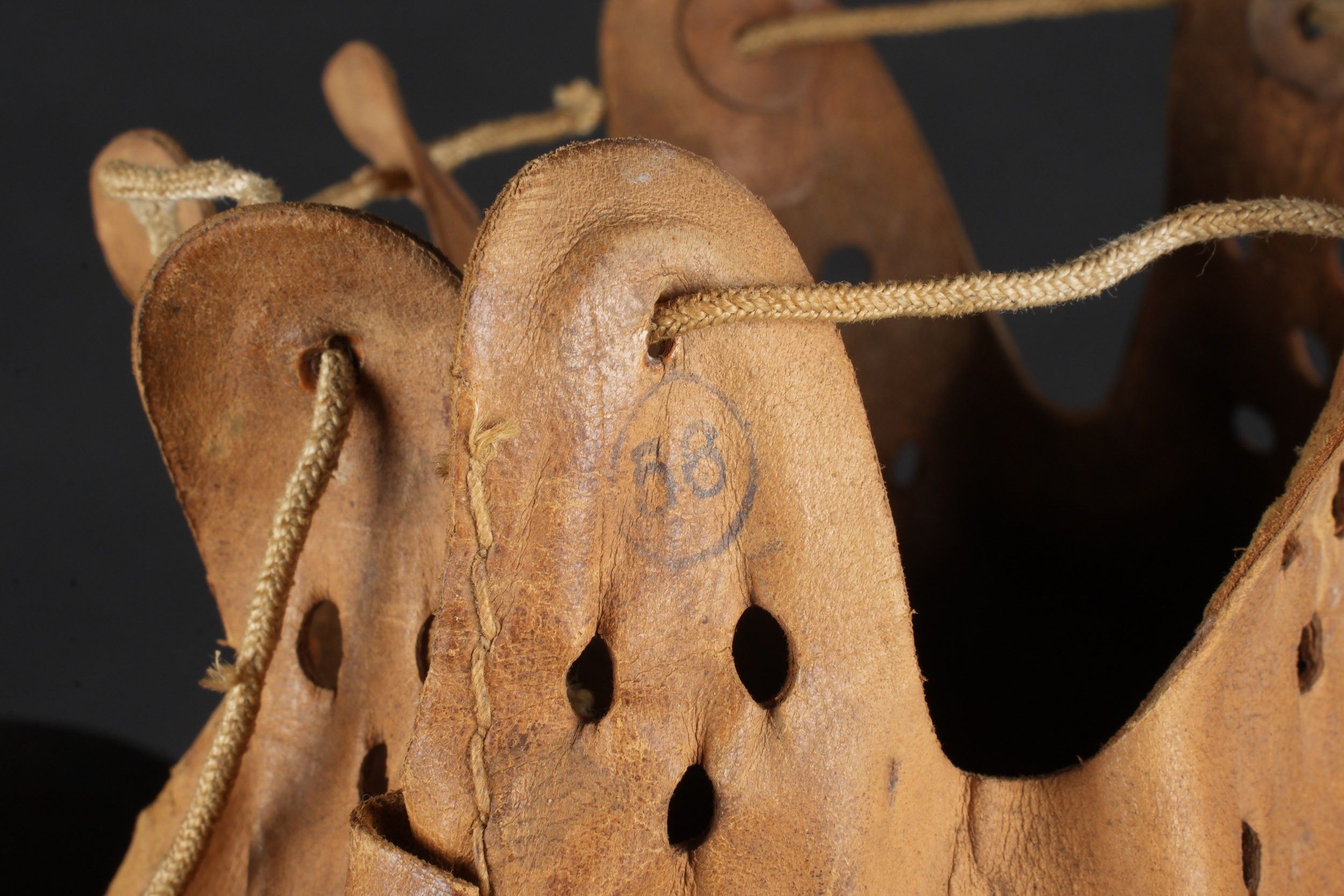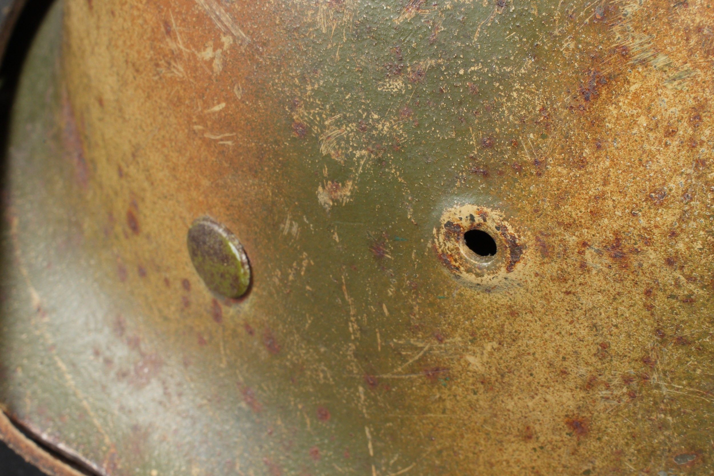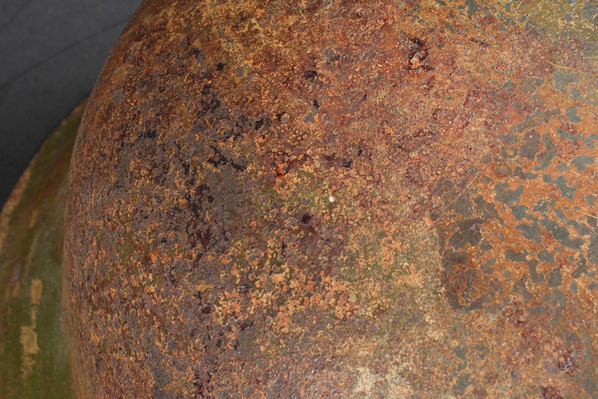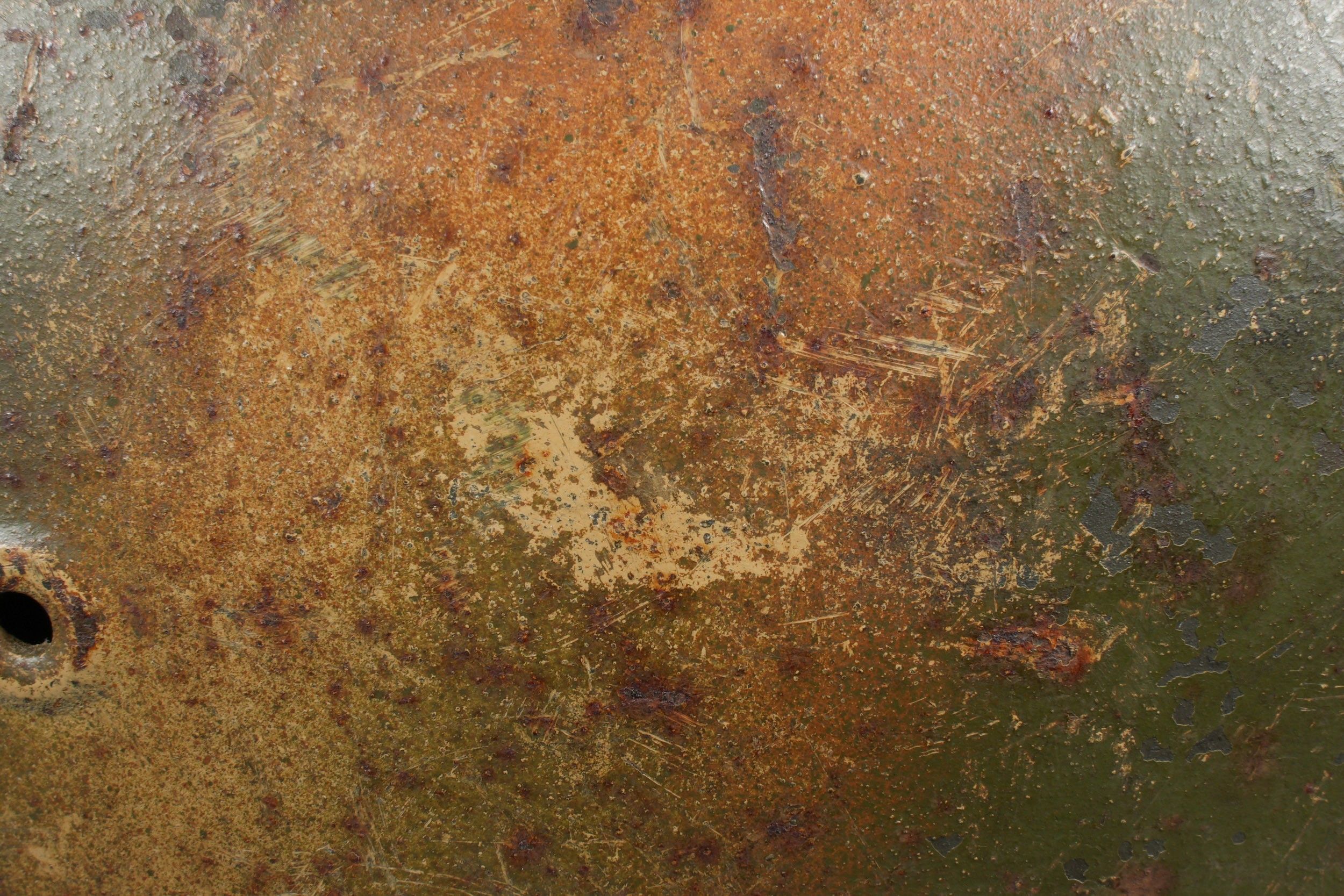 Camouflaged Heer helmet. M-42 helmet shell. Made by EF 64. Lot number 363. Complete leather cap. Drawstring is present. Relatively soft leather. Black leather chinstrap, made by FTB 4. Two rivets are repainted later. Two-tone green camouflage paint at 70%. Some wear and patina. Condition II+. Heer camouflage helmet M42 shell, maker EF 64, lot number 363. Complete leather liner with drawstring, supple leather. Black leather chinstrap, maker FTB 4. Two rivets repainted postwar. Two-tone greenochre camouflage paint retained at 70%. Shows some wear and patina. Condition II+.