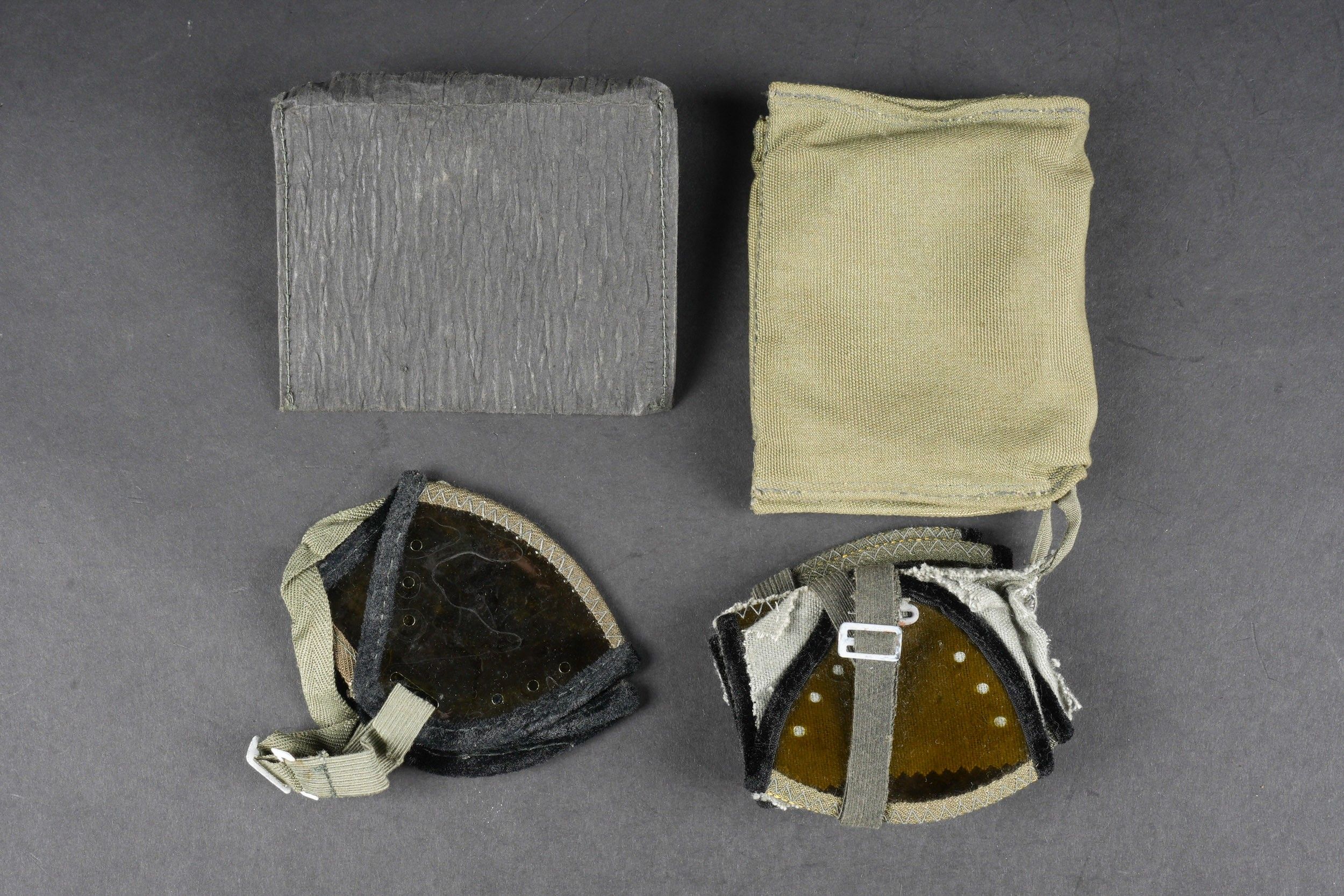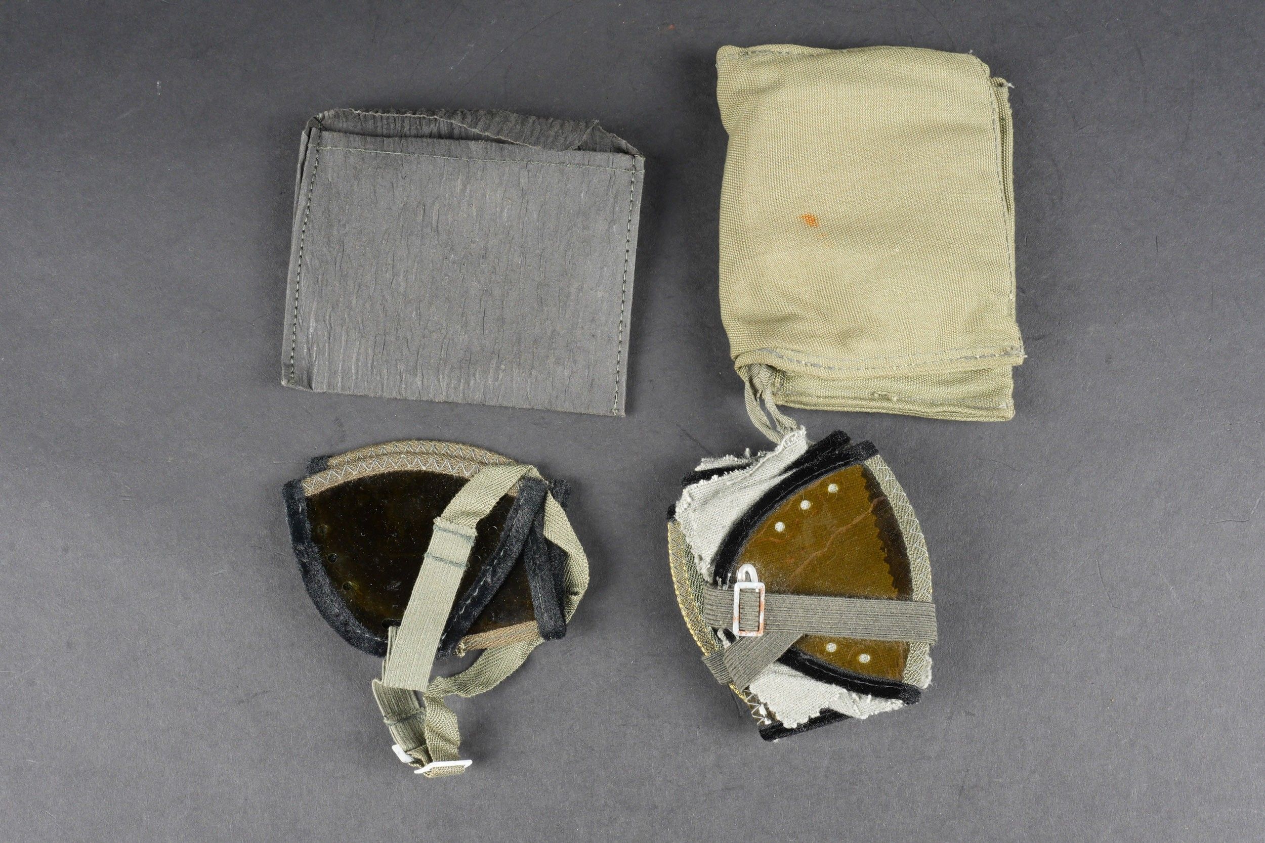 German goggles. Comprising two pairs of complete dust goggles, cloths present. Feldgrau canvas case, marked GNG with Waa eagle. One pair of complete dust goggles, in its cardboard paper pouch. Some wear and patina. Condition II+. German goggles Including two complete pairs of anti-dust goggles with cleaning cloths. Feldgrau canvas pouch marked GNG with eagle Waa. One complete pair of anti-dust goggles in original cardboard sleeve. Shows some wear and patina. Condition II+.