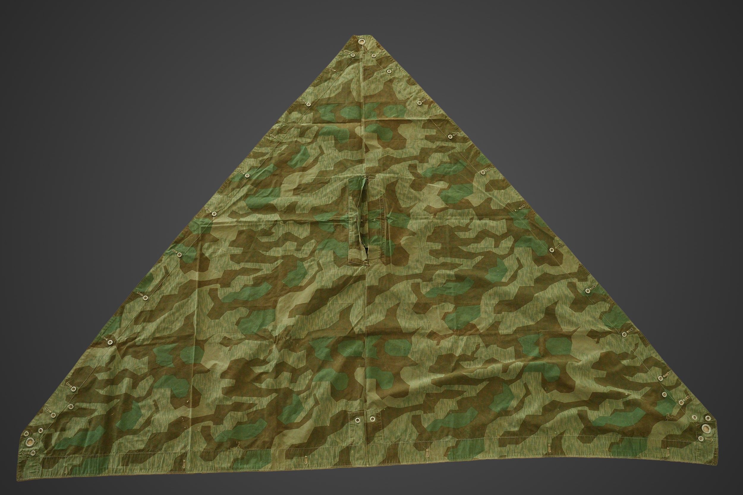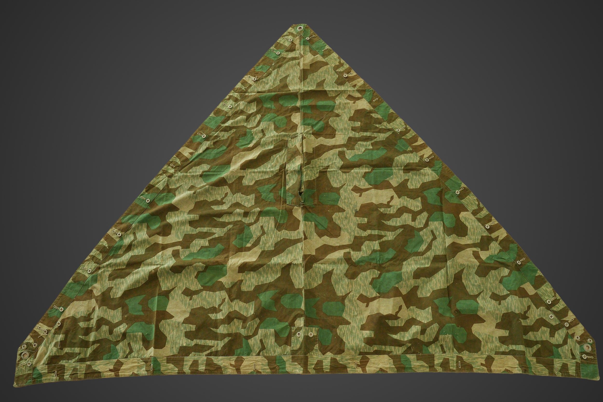 Heer tent canvas. Bright camouflage, the colours are very vivid. Most of the buttons are present. The cords are missing. No visible markings. Some wear and patina, as well as a few stains and tears. Condition II+. Heer shelter quarter Bright camouflage pattern with vivid colours. Most buttons present, cords missing. No visible markings. Shows some wear and patina, with stains and small tears. Condition II+.