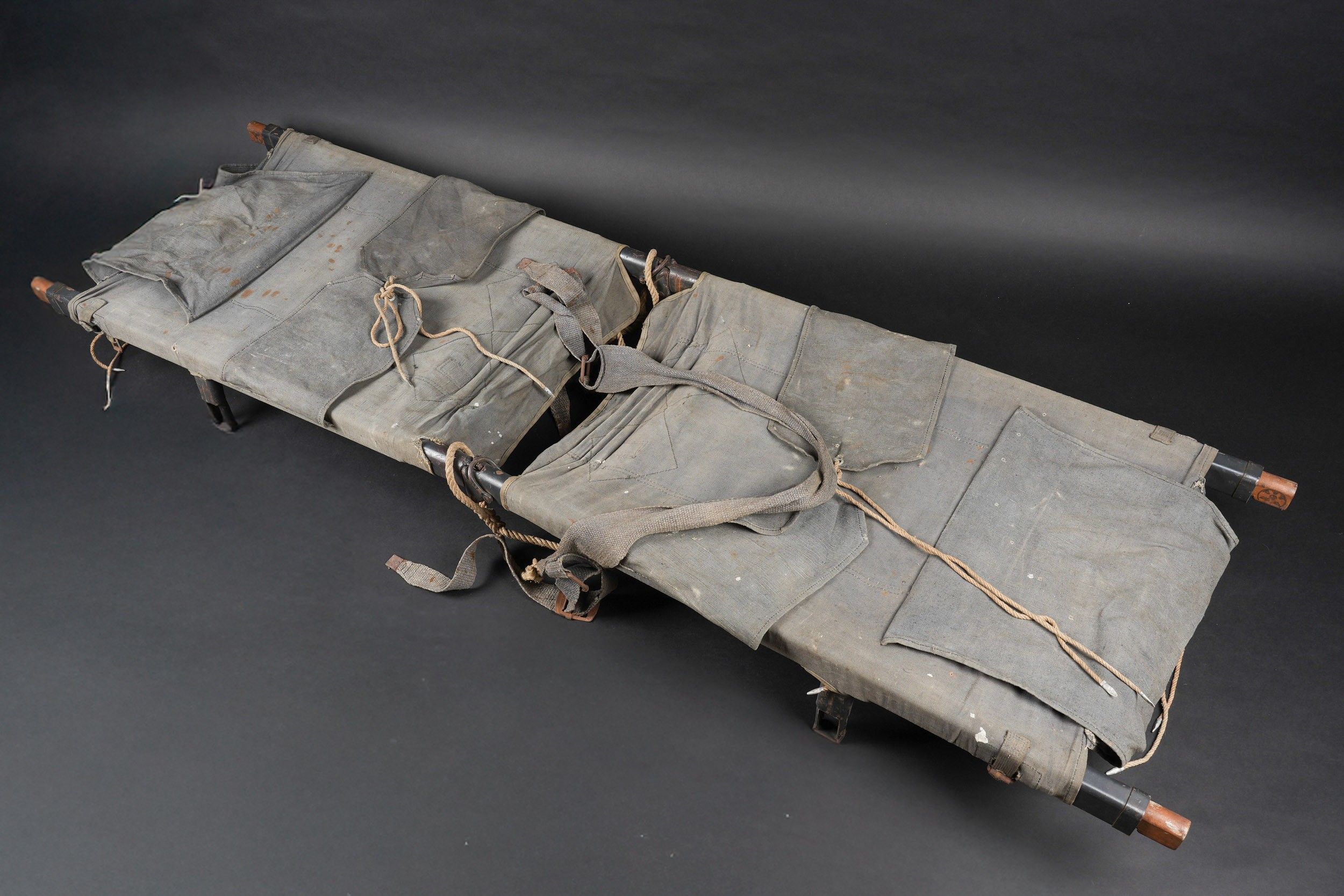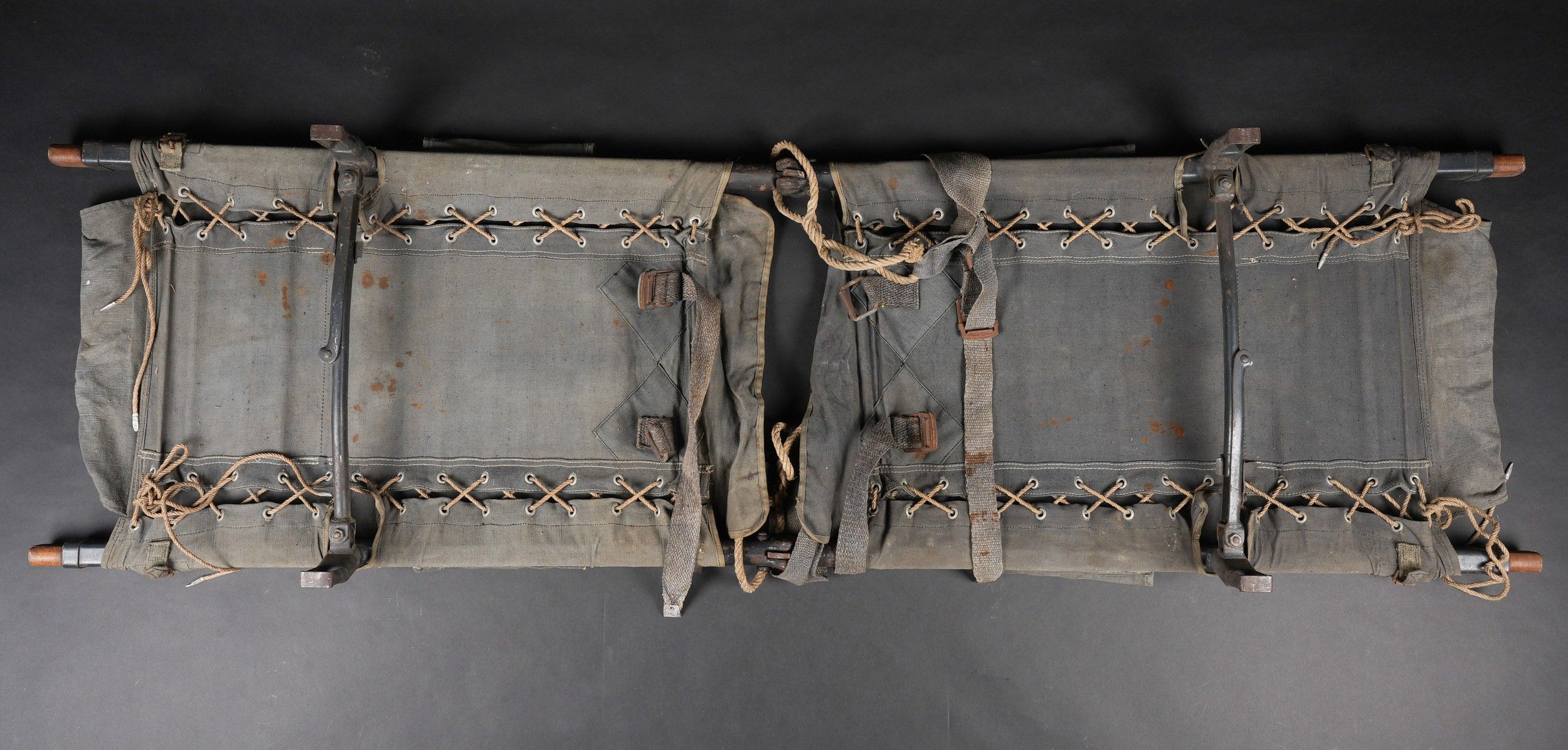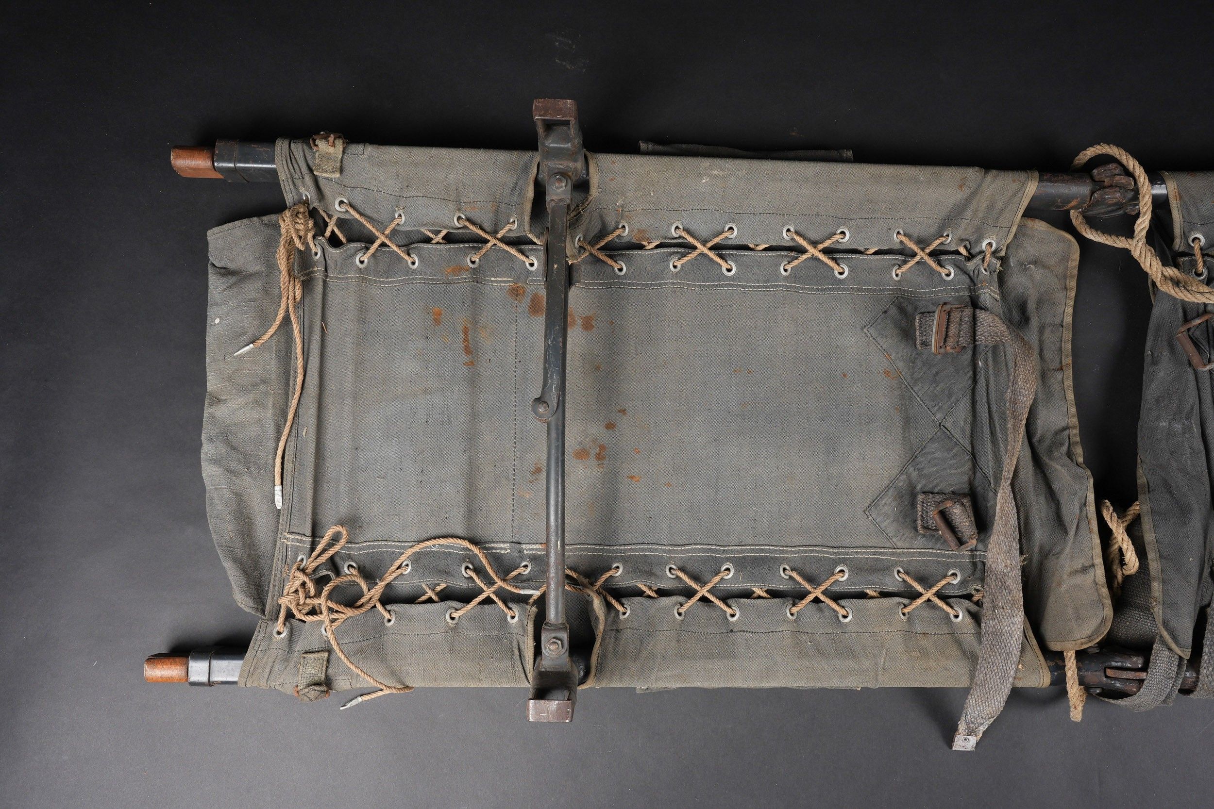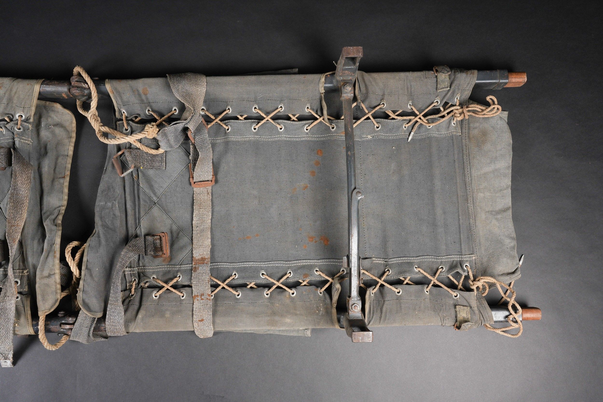 German stretcher. Metal frame, 80% original colour. Blue-grey canvas, all straps present. Made in two parts. The wooden parts have RAD markings with German eagle. These may be later. The rope braiding is complete. The wooden carrying handles are retractable. A carrying strap is complete with cord rings. There is some wear and patina to the piece, as well as stains and tears. Condition II+. German stretcher Metal frame retaining 80% of original paint. Grey-blue fabric with all straps present. Two-part construction, wooden handles marked RAD with German eagle possibly postwar markings. Complete rope weave. Wooden carrying handles retractable. Carrying strap complete with cord loops. Shows wear and patina, with stains and small tears. Condition II+.