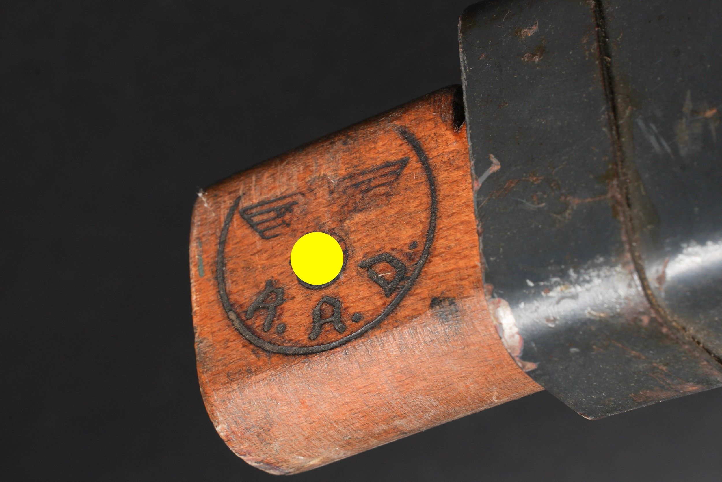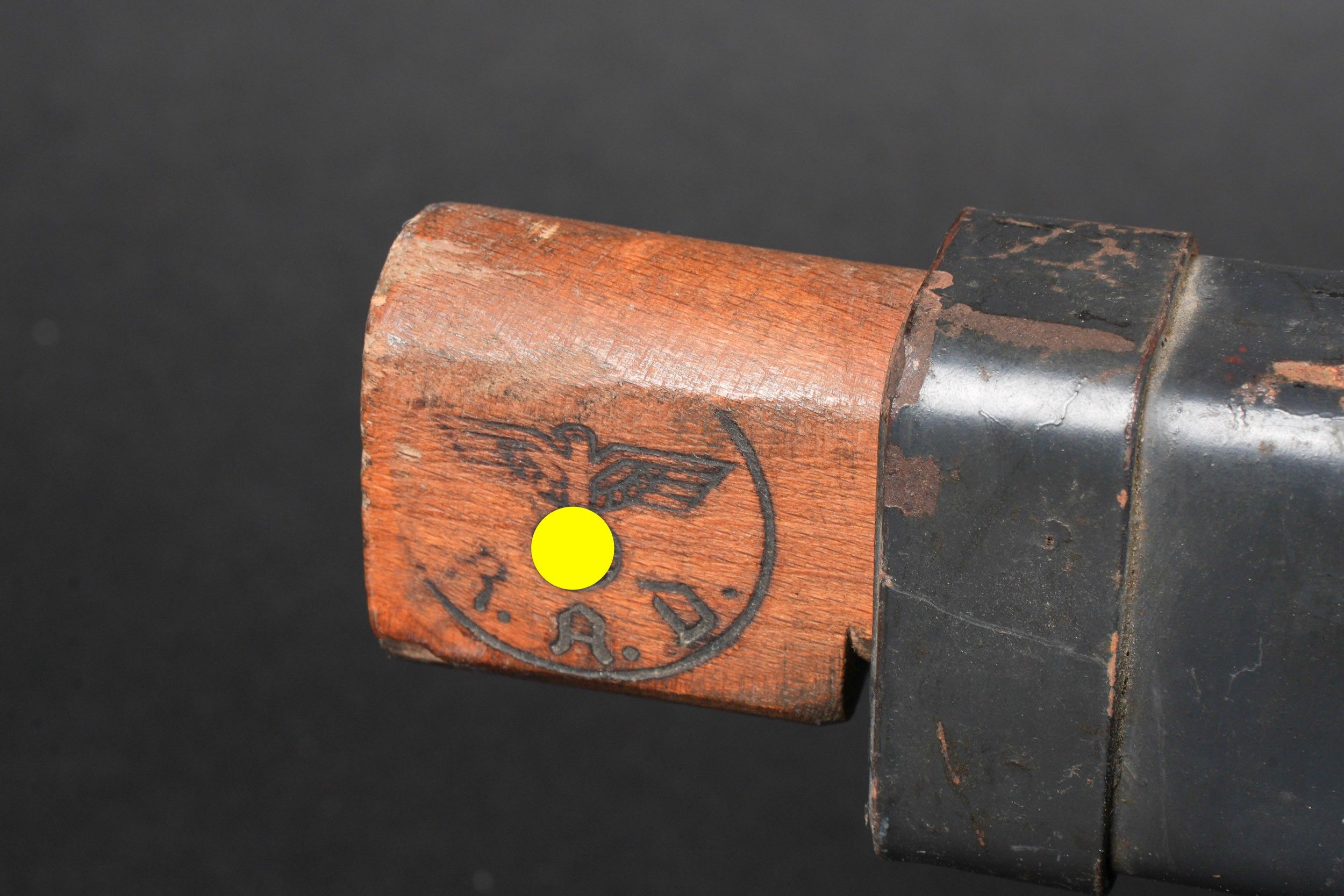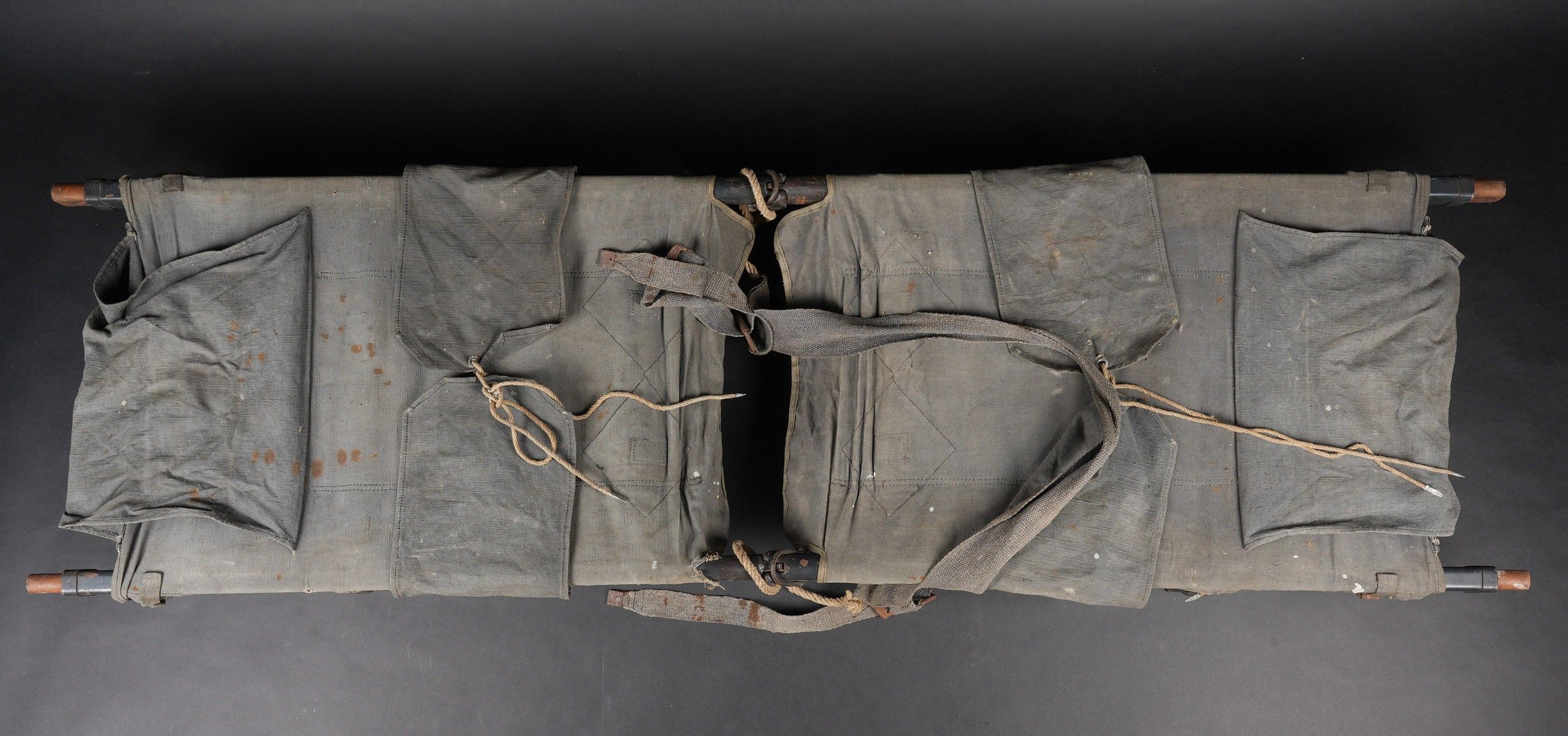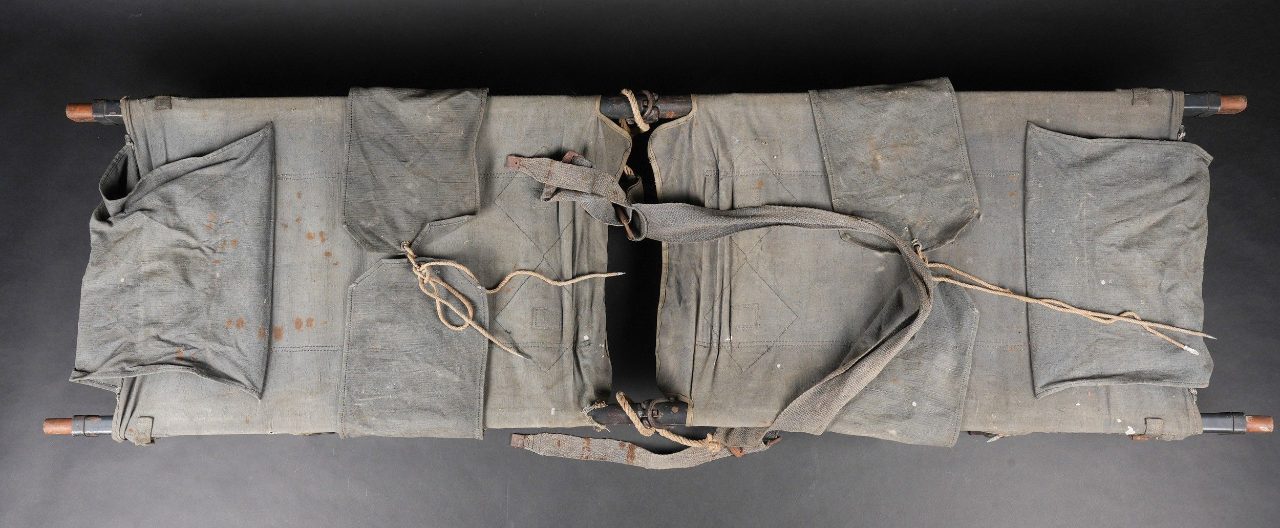 German stretcher. Metal frame, 80% original colour. Blue-grey canvas, all straps present. Made in two parts. The wooden parts have RAD markings with German eagle. These may be later. The rope braiding is complete. The wooden carrying handles are retractable. A carrying strap is complete with cord rings. There is some wear and patina to the piece, as well as stains and tears. Condition II+. German stretcher Metal frame retaining 80% of original paint. Grey-blue fabric with all straps present. Two-part construction, wooden handles marked RAD with German eagle possibly postwar markings. Complete rope weave. Wooden carrying handles retractable. Carrying strap complete with cord loops. Shows wear and patina, with stains and small tears. Condition II+.