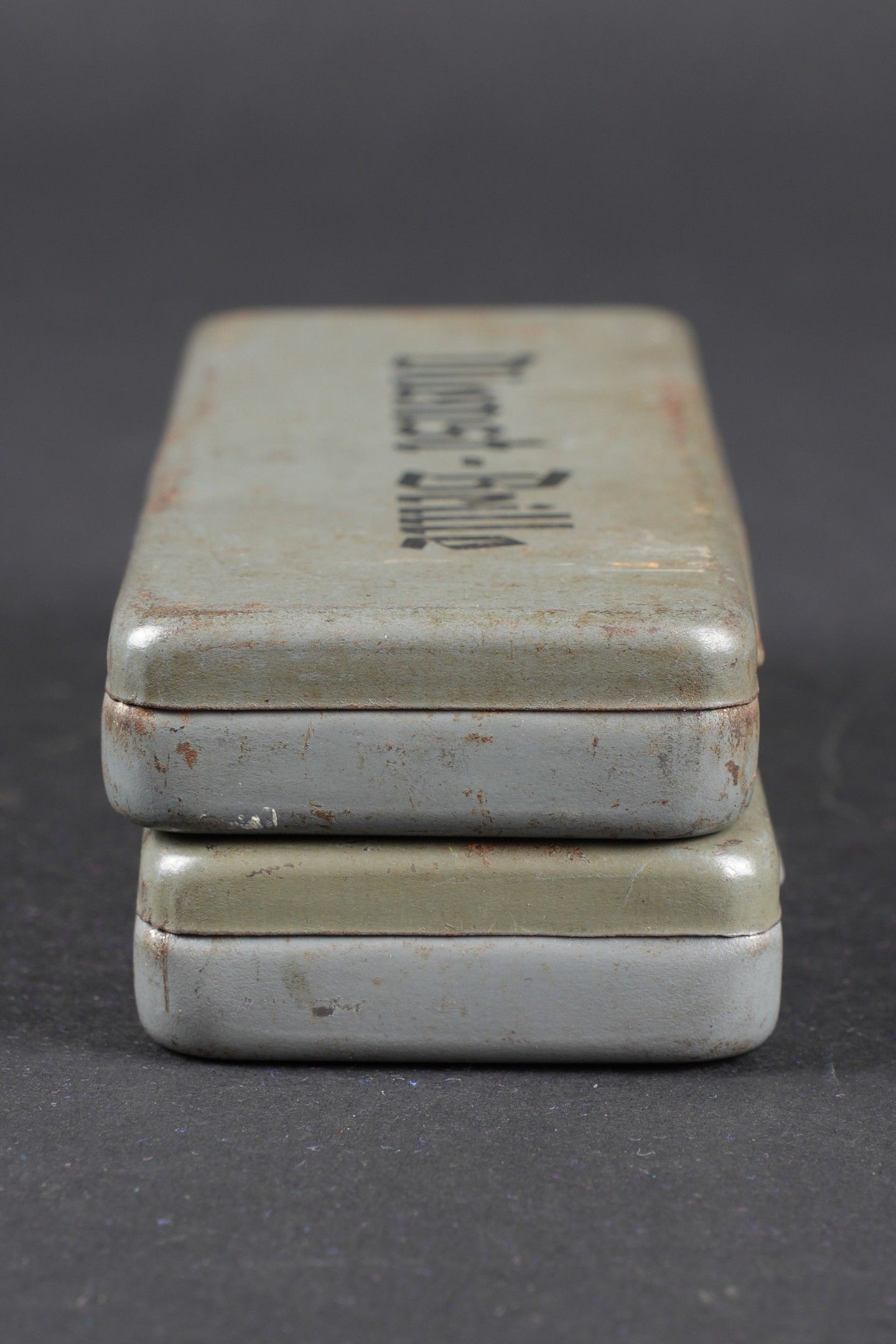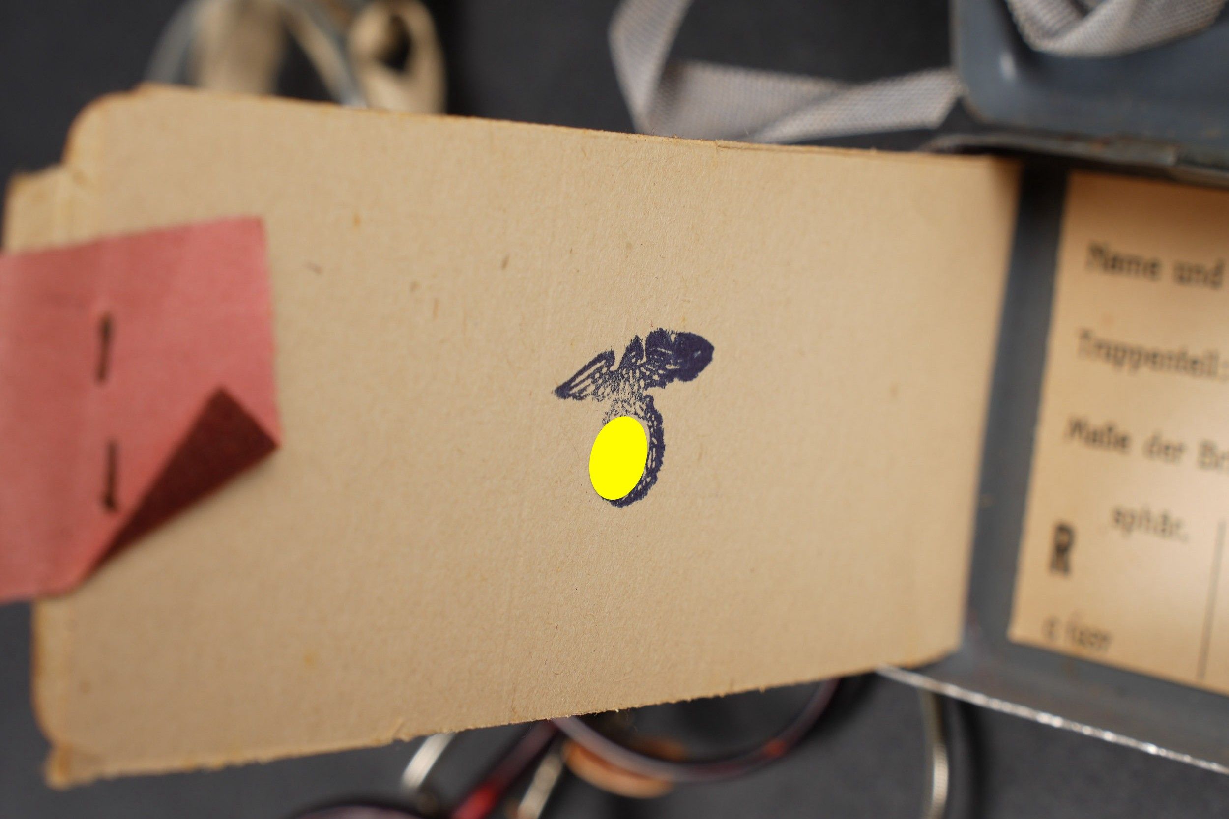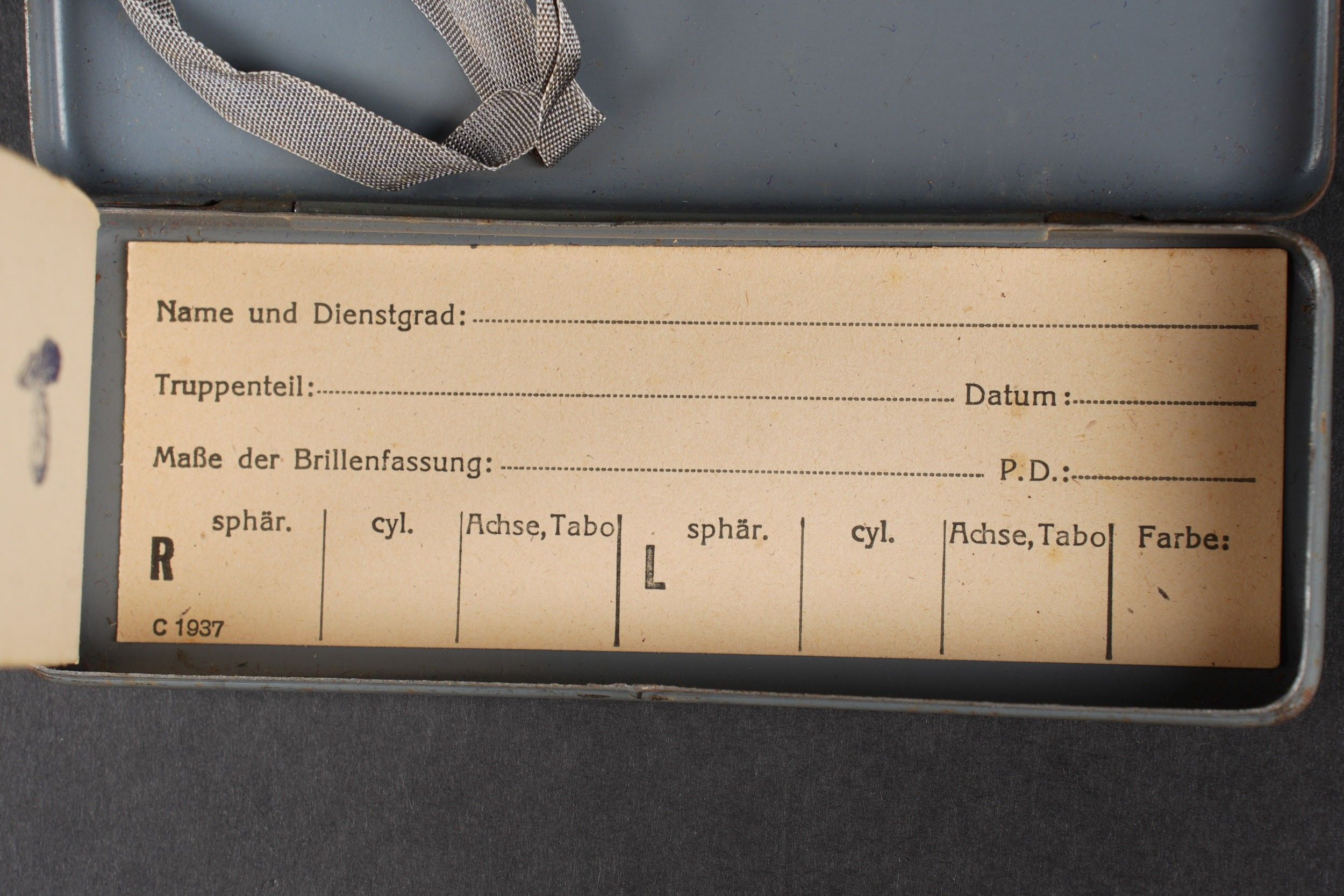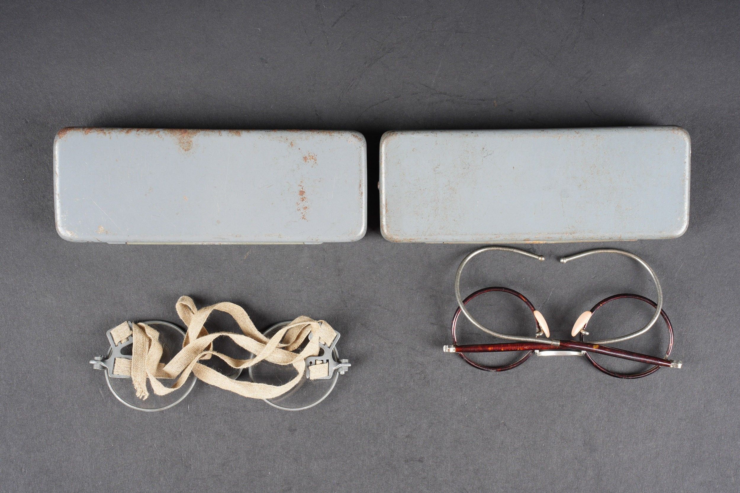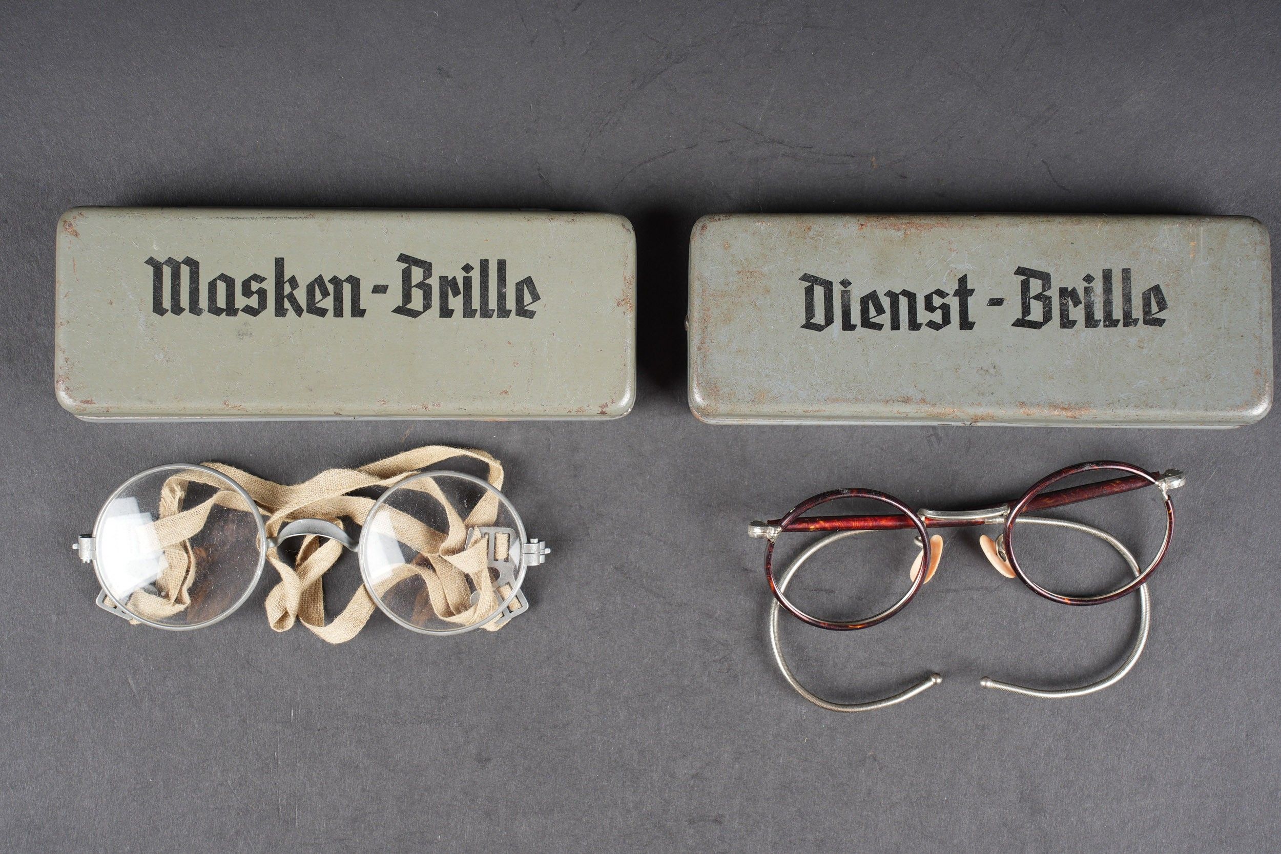 German spectacles. Comprising a metal box, marked Dienst Brille, the glasses are present, the lenses are missing, the patient label is blank. A metal box, marked Masken brille, the glasses are complete, with elastics and lenses. The patient label indicates that this is the UFFZ Heinze of 6 ERS RG Nach REG 11, dated 1943. Note some wear and patina to parts. Condition II+. German goggles Including one metal case marked Dienst Brille, goggles present, lenses missing, blank patient label. One metal case marked "Masken Brille," goggles complete with lenses and elastic straps. Patient label identifies Uffz Heinze, 6 ERS RG Nach REG 11, dated 1943. Shows some wear and patina. Condition II+.