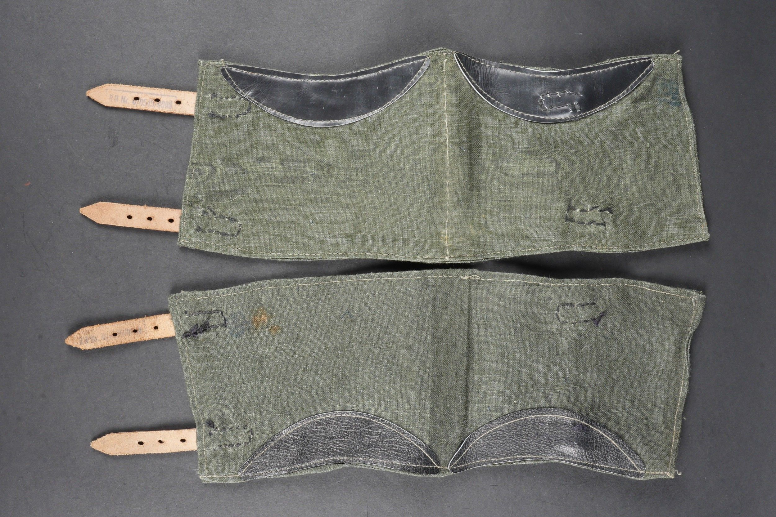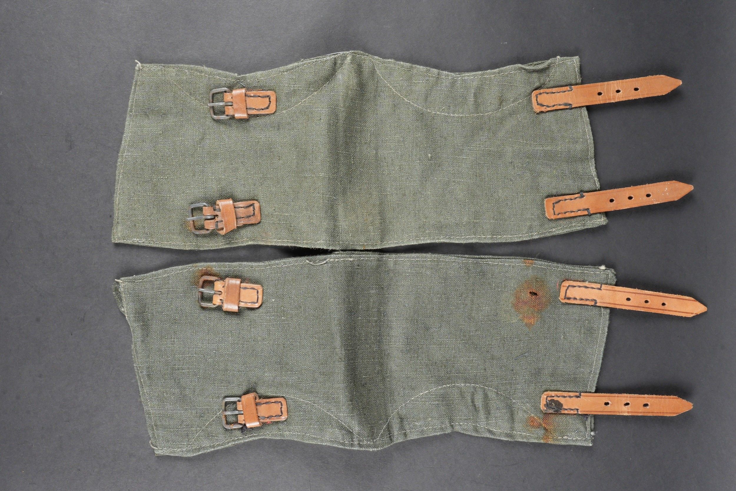 German gaiter. Non-homogeneous pair in thick Feldgrau fabric and brown leather. All straps are present. Markings are illegible. Some wear, patina and stains. Condition II+. German gaiters Mismatched pair by colour, heavy Feldgrau fabric and brown leather. All straps present. Markings illegible. Show wear and patina with some stains. Condition II+.