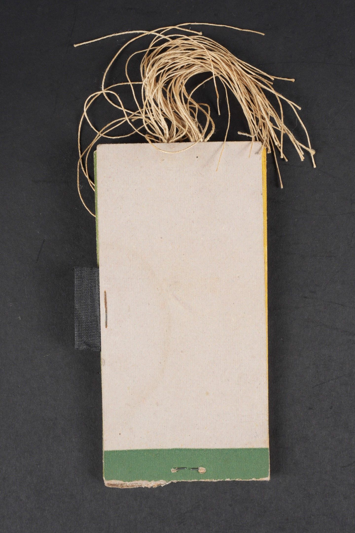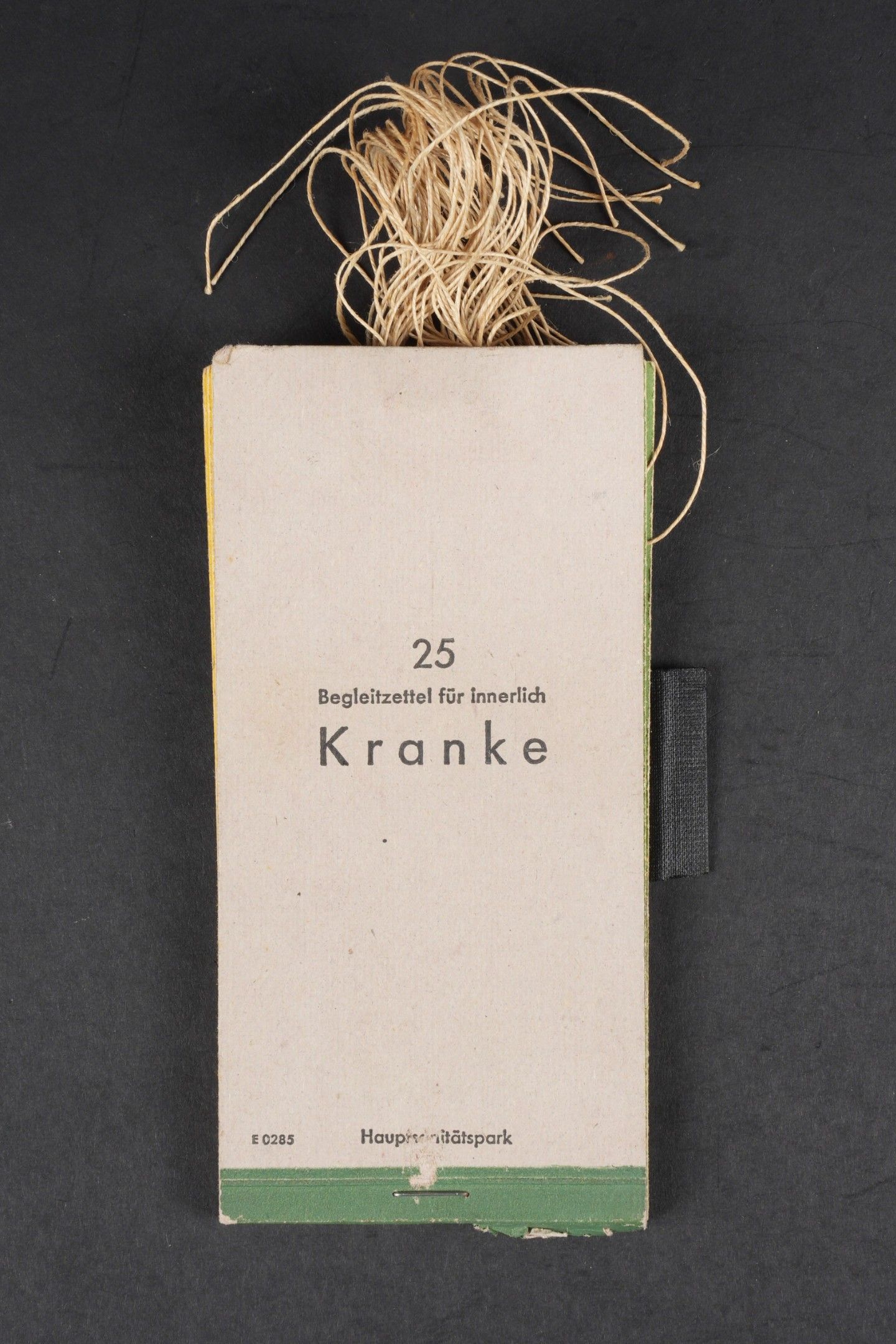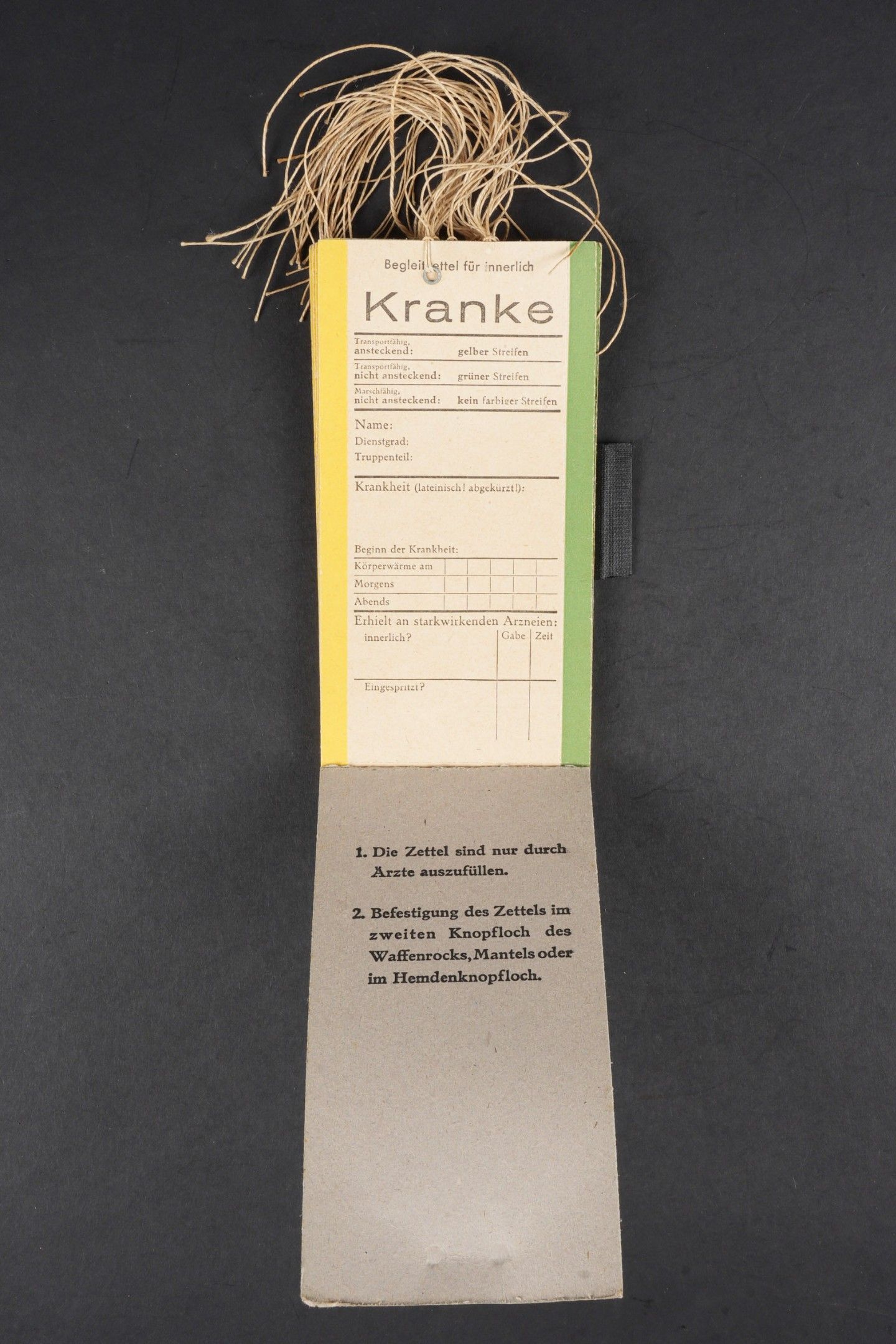 Book of labels for the wounded. Complete, all labels are blank and have their cords. Marked 25 Begleitzettel für Innerlich Kranke. E 0285 Hauptsanitätspark. The pencil is missing. Some wear and patina, as well as traces of oxidation. Condition II+. Wounded identification tag booklet Complete, all tags blank and fitted with their cords. Marked 25 Begleitzettel für Innerlich Kranke E 0285 Hauptsanitätspark. Pencil missing. Shows some wear, patina, and traces of oxidation. Condition II+.