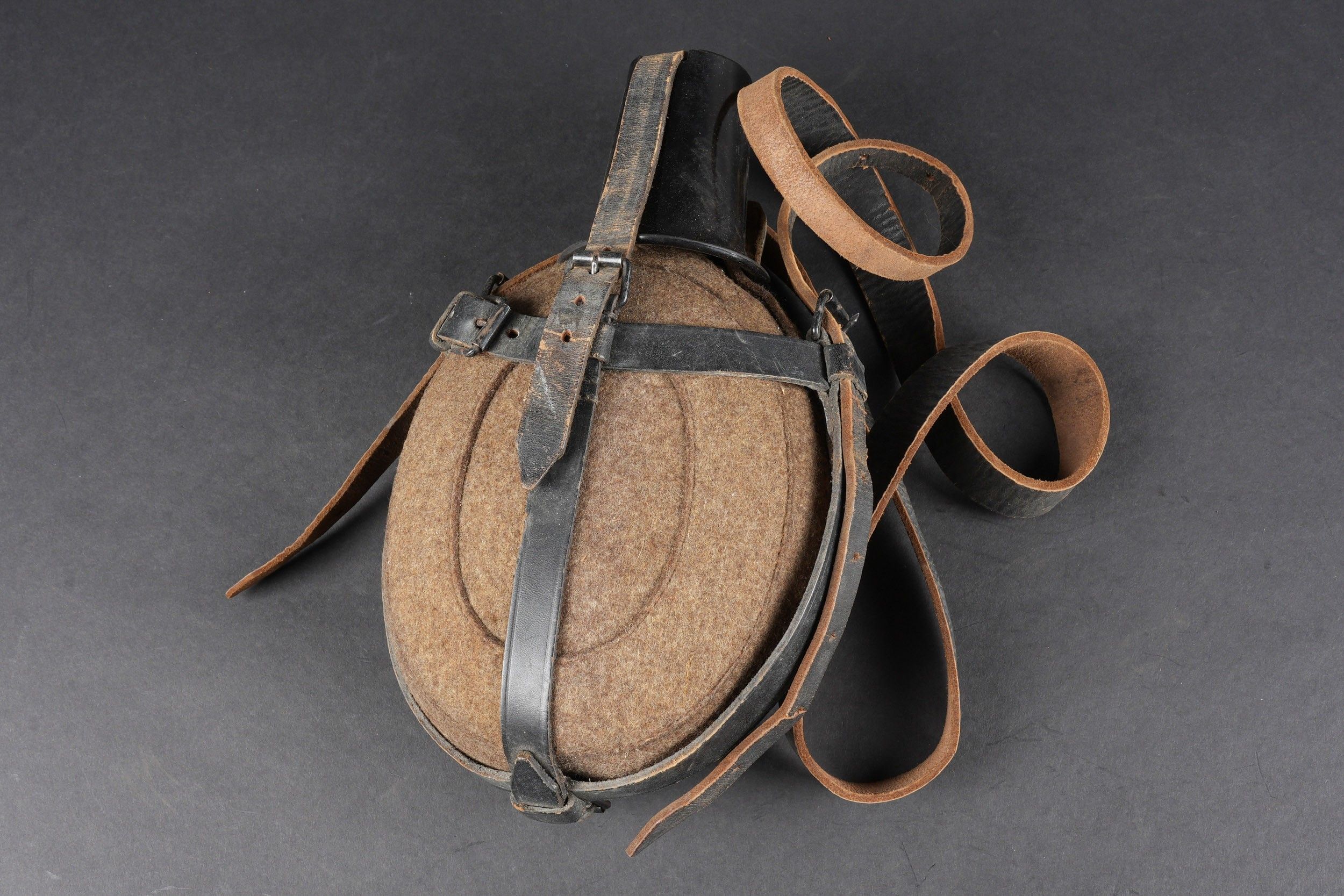 Large-capacity German water bottle. Made of aluminium, ESB 40. Complete black bakelite stopper, made by ESB 41. Cover in heavy Feldgrau canvas, with reinforcement on the back. The press studs are functional. Leather harness complete with carrying strap. Black bakelite quarter. Slight wear and patina. Condition I-. German large-capacity canteen Aluminium, maker ESB 40. Complete black Bakelite cap, maker ESB 41. Heavy Feldgrau canvas cover with rear reinforcement. Press studs functional. Complete leather harness with carrying strap. Black Bakelite cup. Shows light wear and patina. Condition I-.
