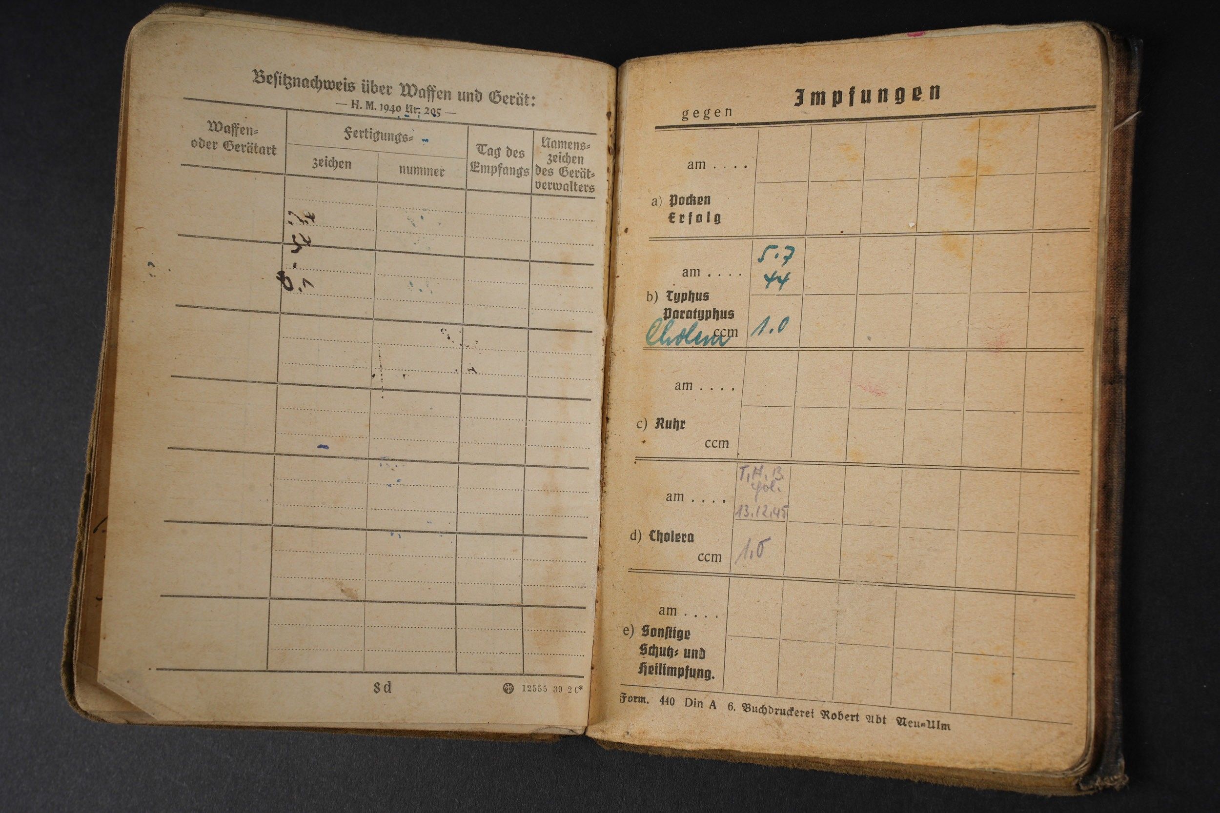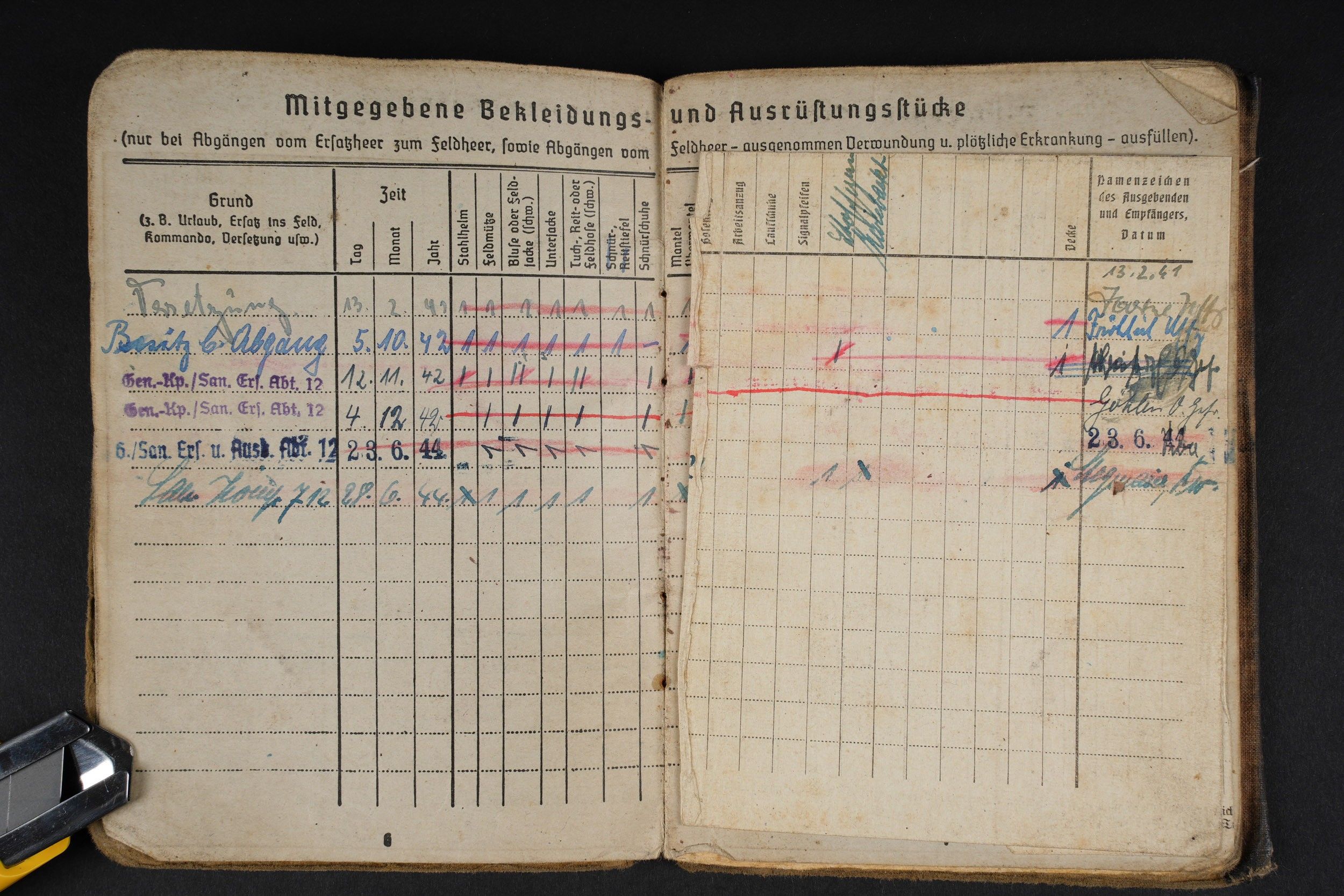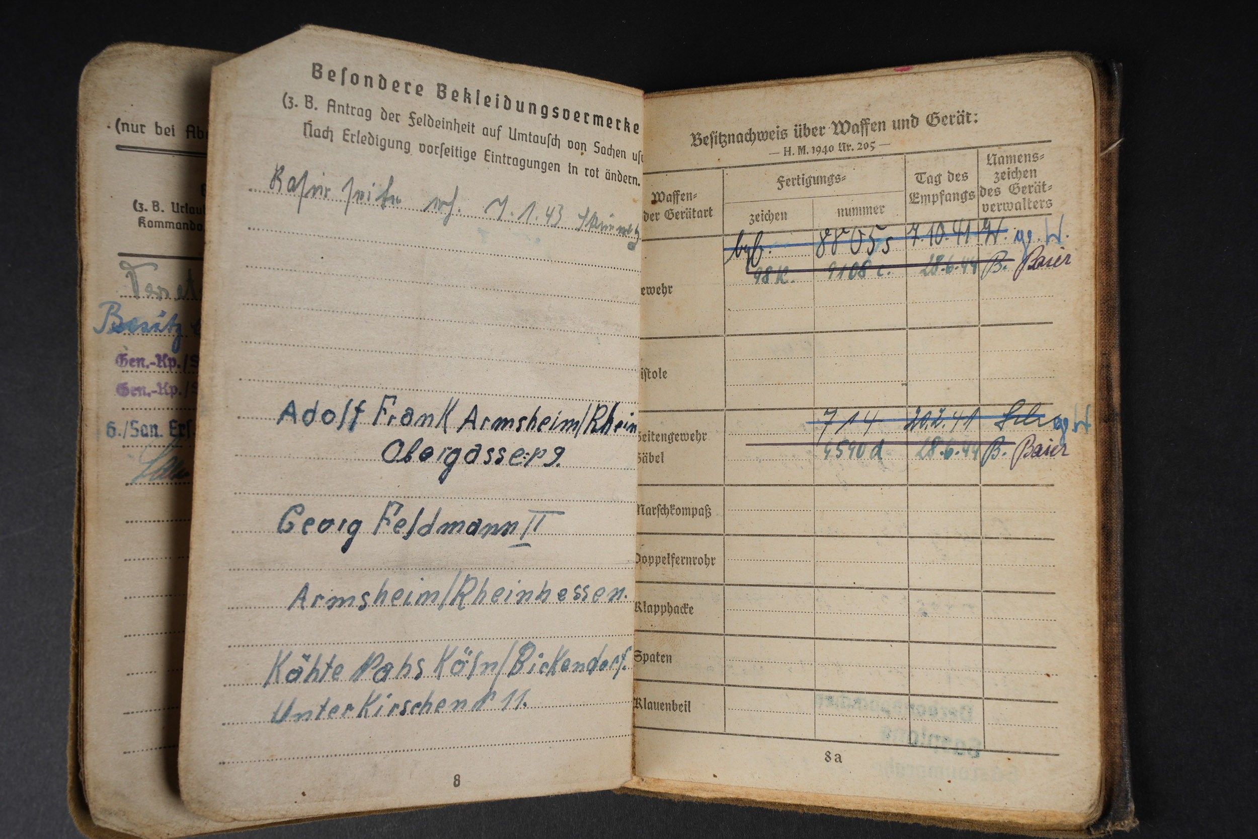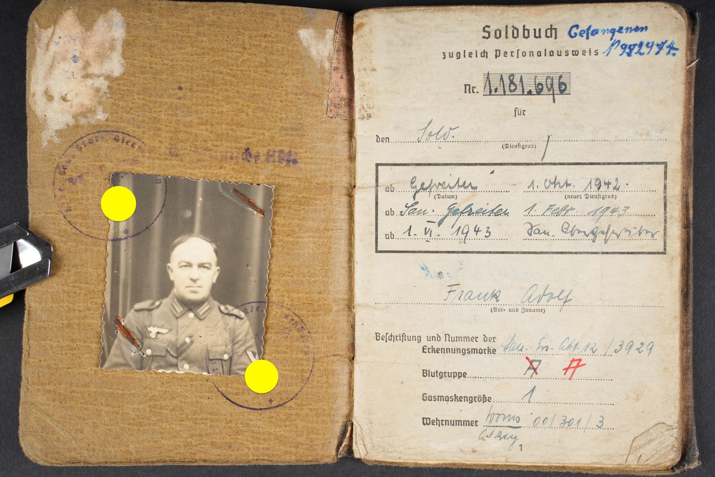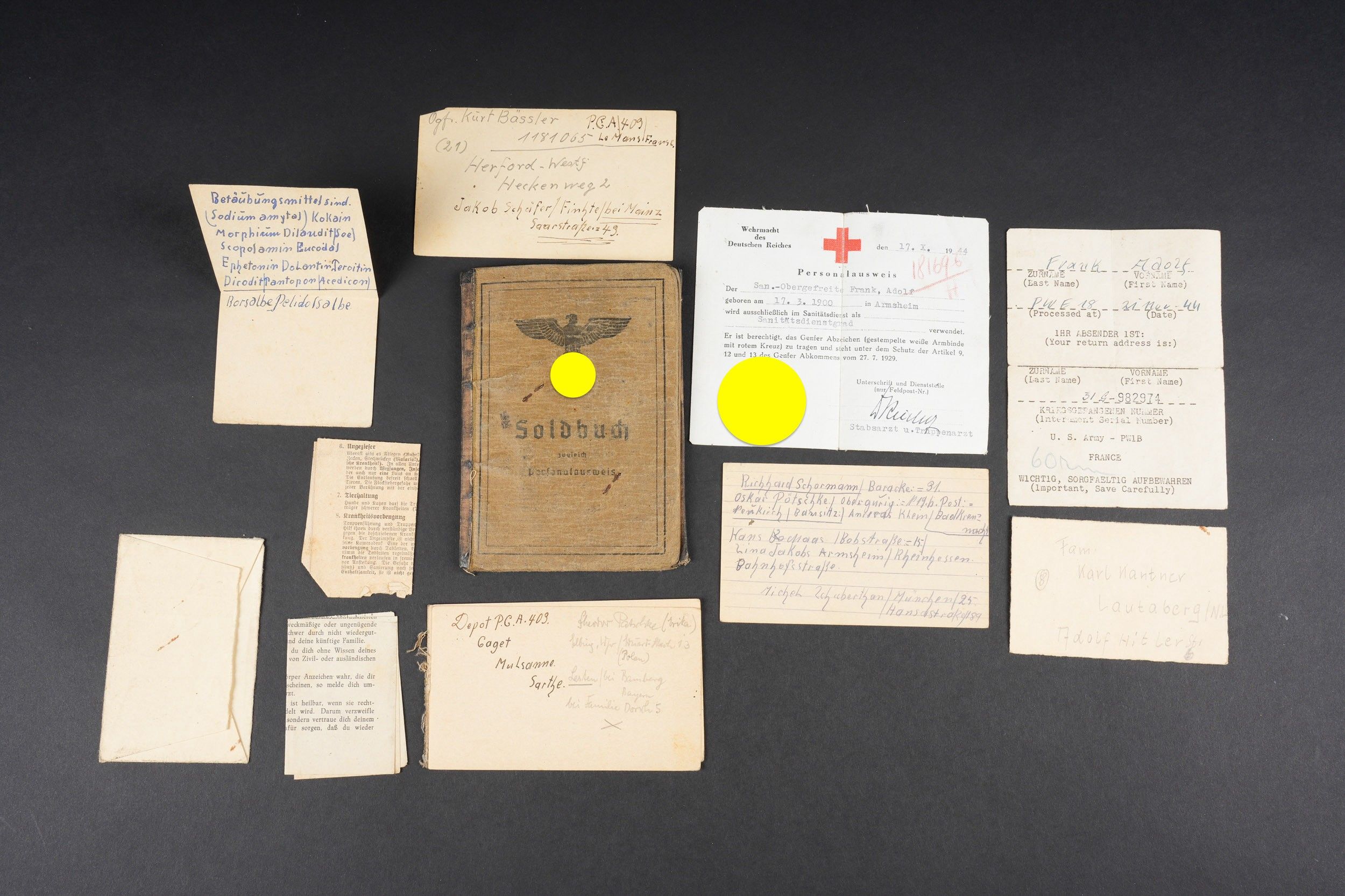 German Soldbuch. Beautiful cover with German eagle. Some tears visible. Identity photo in uniform present. Book number 1.181.696, handwritten marking Gefangenen 992974. Name inscription Adolf Frank. Opened on 5 August 1940 at 5 San Ers Abt 12. Numerous incorporations in various German medical units. Some stays in Lazarett, in particular Trier. Awarded the Eastern Front Medal on 5 August 1942. Well-filled booklet. Some addresses of soldiers in captivity with him. Prisoner of war document PWE 18 dated 21 November 1944, in a camp in France, and under US Army surveillance. A personnalausweis, dated 17 October 1944. Some wear and patina. Condition II+. German Soldbuch Nice cover with printed German eagle. Some small tears visible. Identity photo in uniform present. Book number 1.181.696, handwritten note Gefangenen 992974. Named to Adolf Frank. Opened 5 August 1940 at 5 San Ers Abt 12. Numerous entries in various German medical units and Lazarett stays, including Trier. Awarded the Eastern Front Medal on 5 August 1942. Well-filled booklet. Includes addresses of fellow POWs. Also includes a prisoner of war document from PWE 18 dated 21 November 1944 camp in France under US Army supervision and an identity card dated 17 October 1944. Shows some wear and patina. Condition II+.