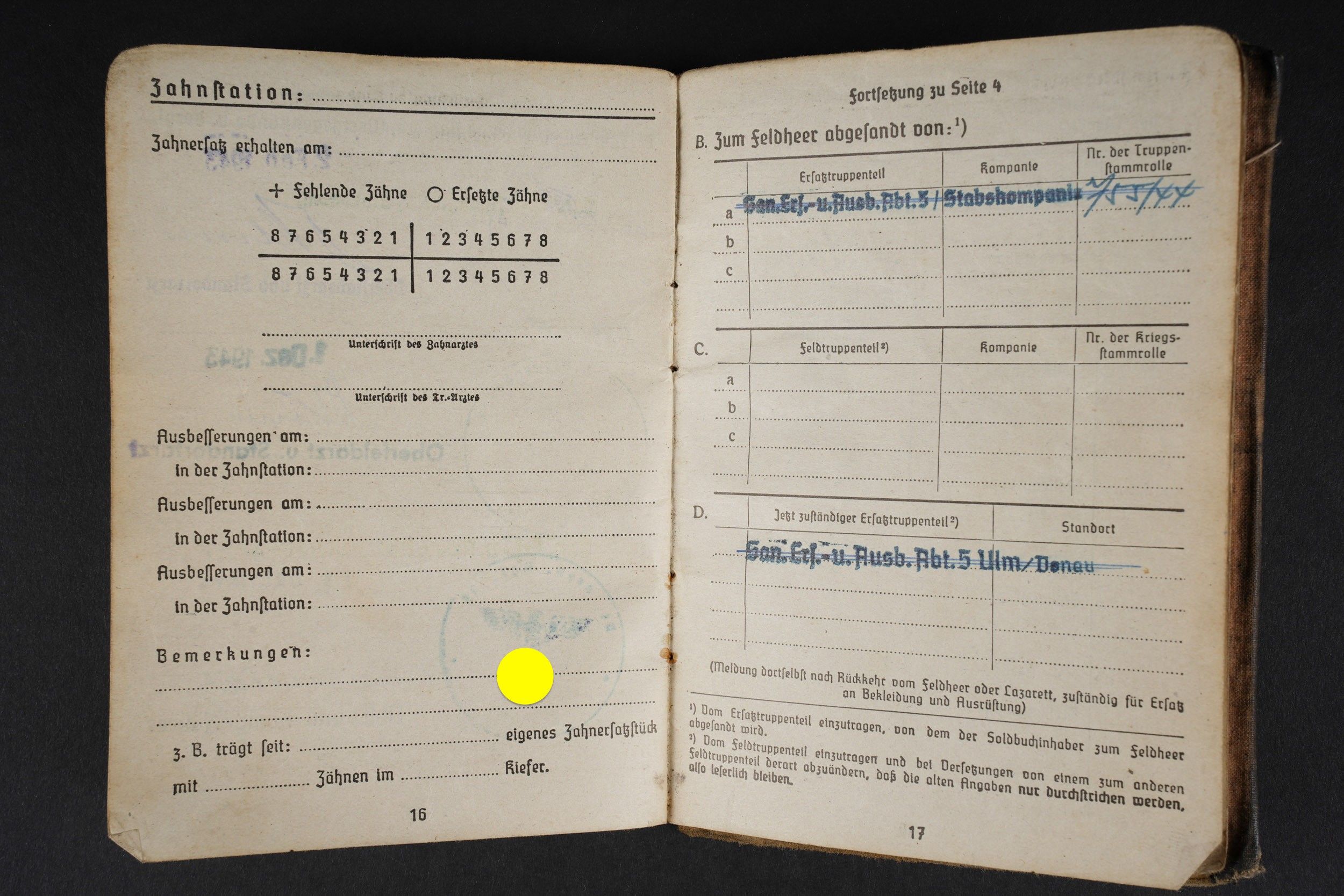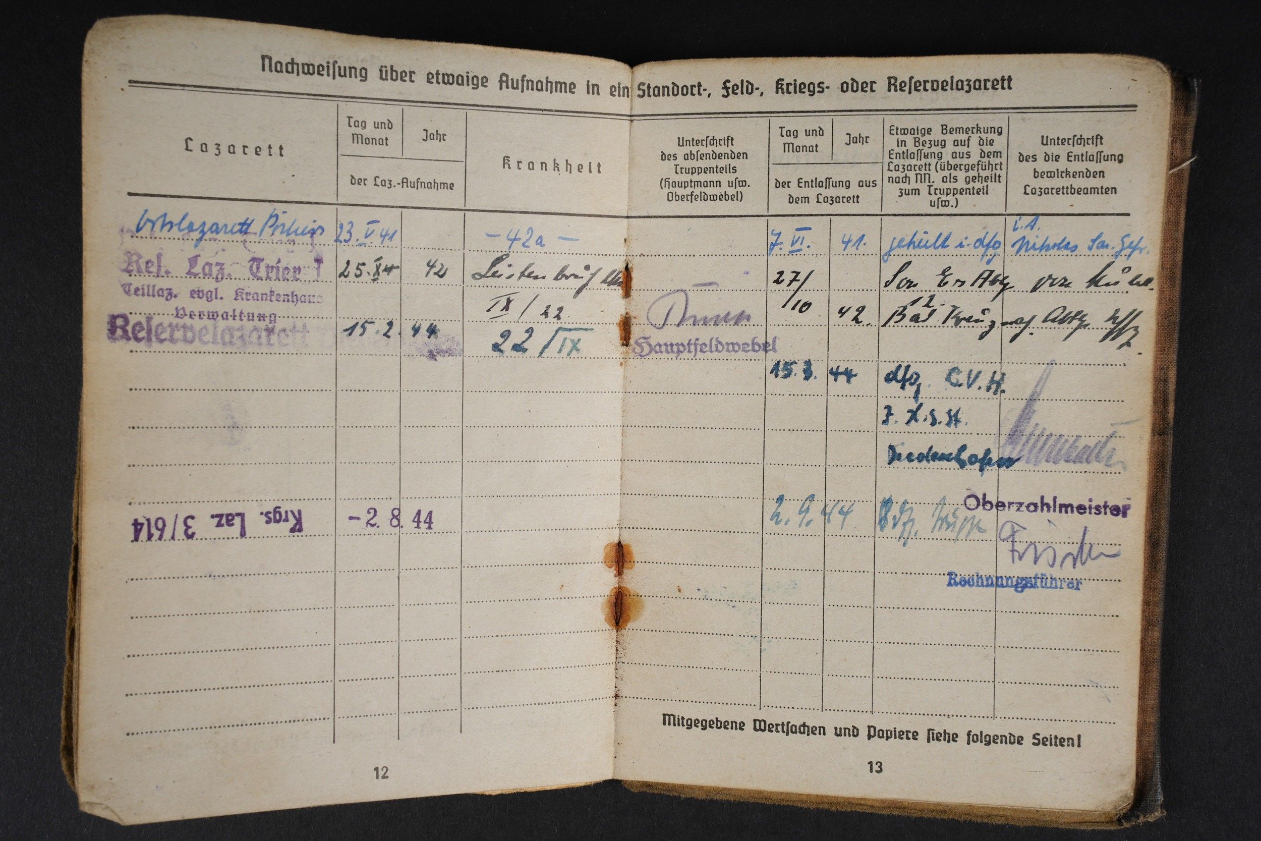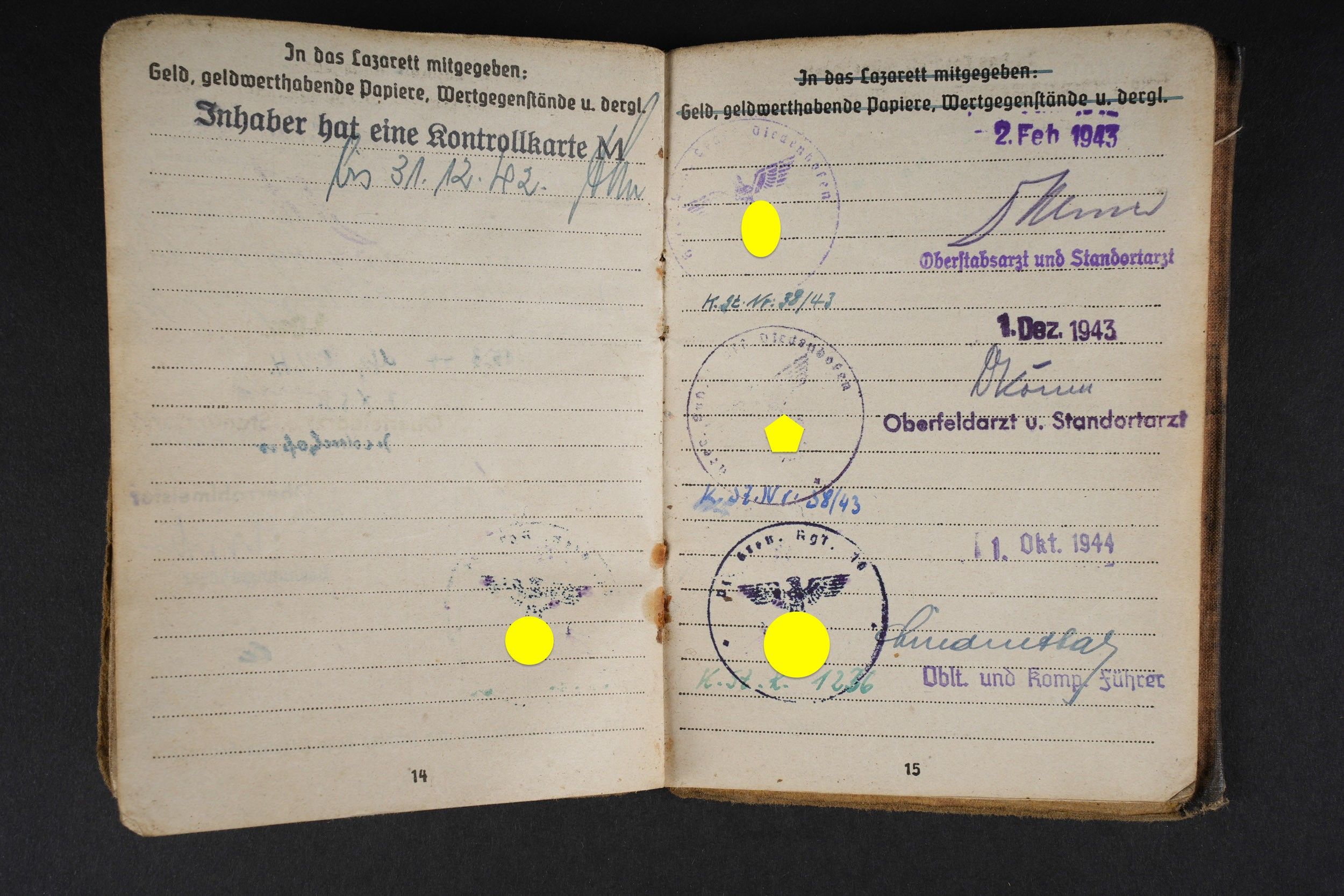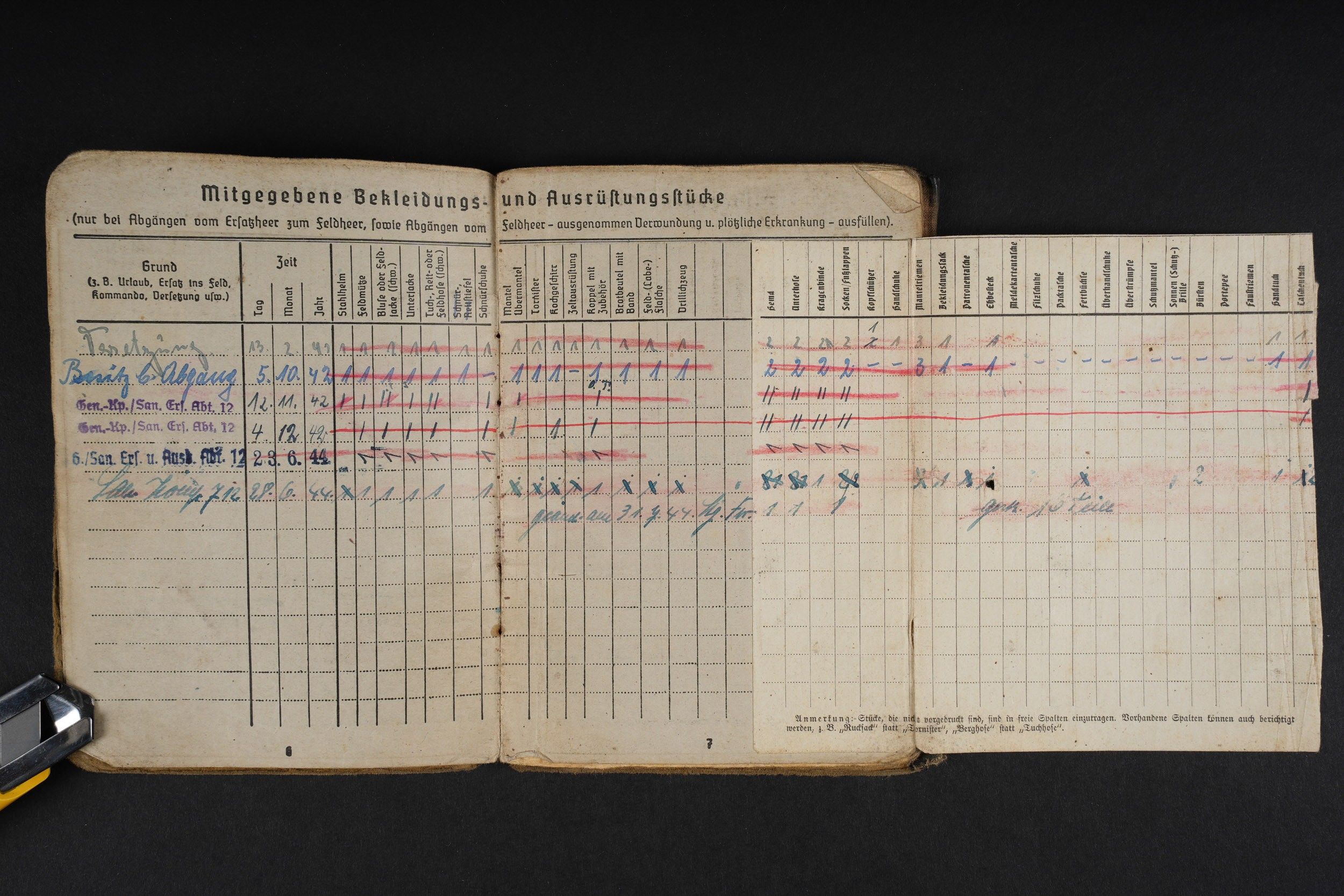 German Soldbuch. Beautiful cover with German eagle. Some tears visible. Identity photo in uniform present. Book number 1.181.696, handwritten marking Gefangenen 992974. Name inscription Adolf Frank. Opened on 5 August 1940 at 5 San Ers Abt 12. Numerous incorporations in various German medical units. Some stays in Lazarett, in particular Trier. Awarded the Eastern Front Medal on 5 August 1942. Well-filled booklet. Some addresses of soldiers in captivity with him. Prisoner of war document PWE 18 dated 21 November 1944, in a camp in France, and under US Army surveillance. A personnalausweis, dated 17 October 1944. Some wear and patina. Condition II+. German Soldbuch Nice cover with printed German eagle. Some small tears visible. Identity photo in uniform present. Book number 1.181.696, handwritten note Gefangenen 992974. Named to Adolf Frank. Opened 5 August 1940 at 5 San Ers Abt 12. Numerous entries in various German medical units and Lazarett stays, including Trier. Awarded the Eastern Front Medal on 5 August 1942. Well-filled booklet. Includes addresses of fellow POWs. Also includes a prisoner of war document from PWE 18 dated 21 November 1944 camp in France under US Army supervision and an identity card dated 17 October 1944. Shows some wear and patina. Condition II+.