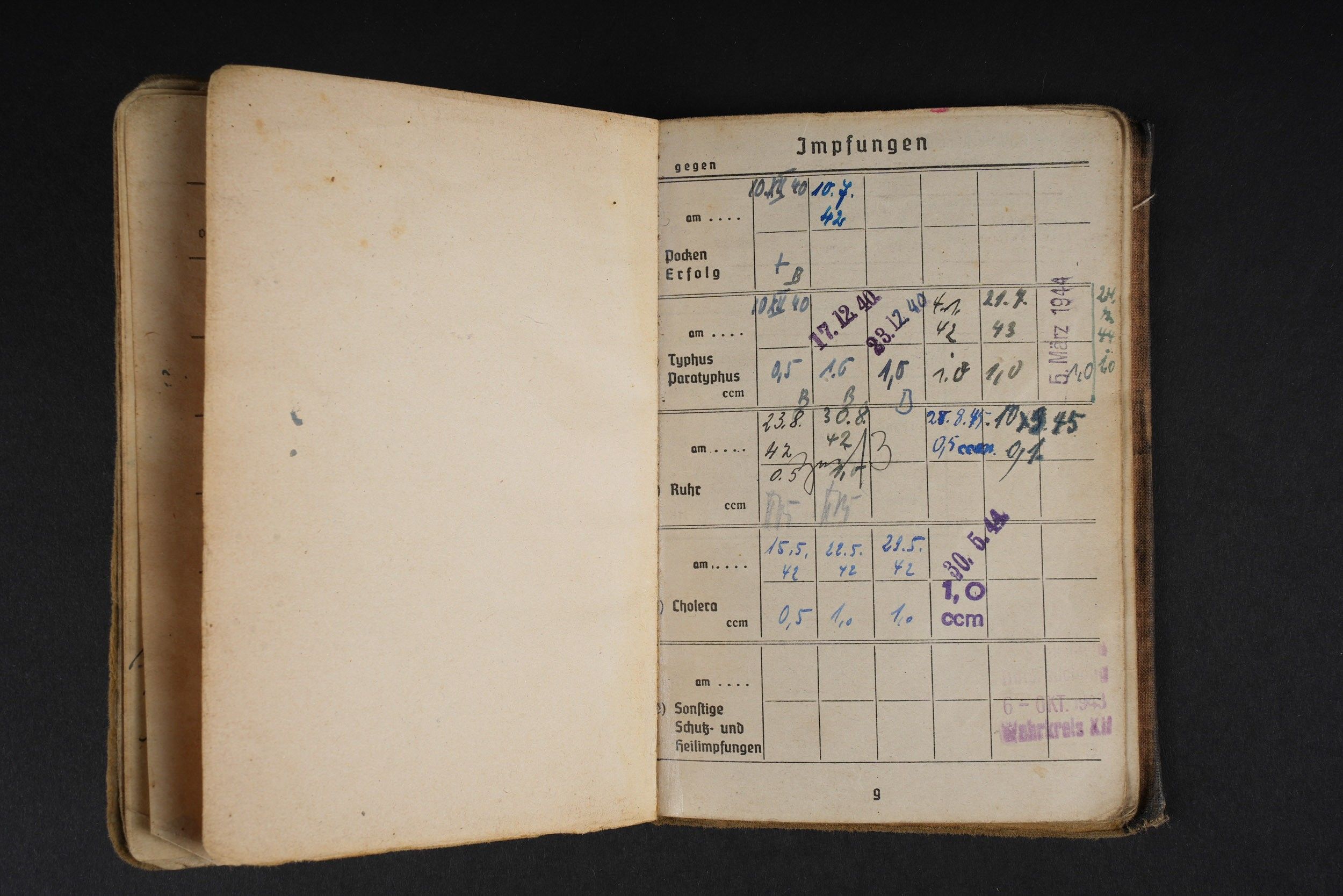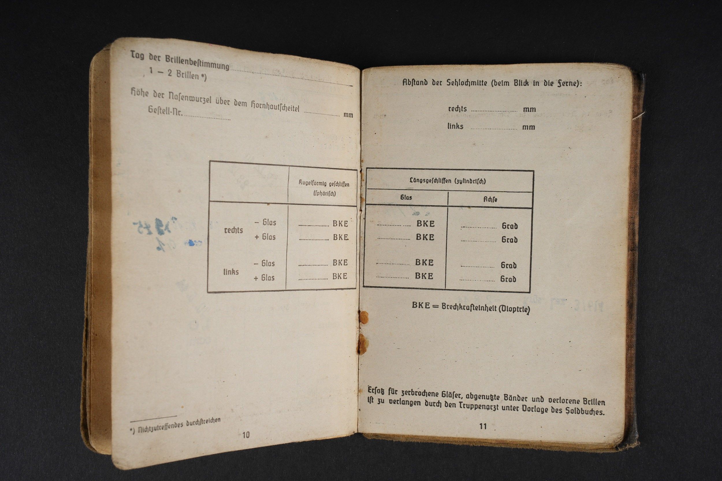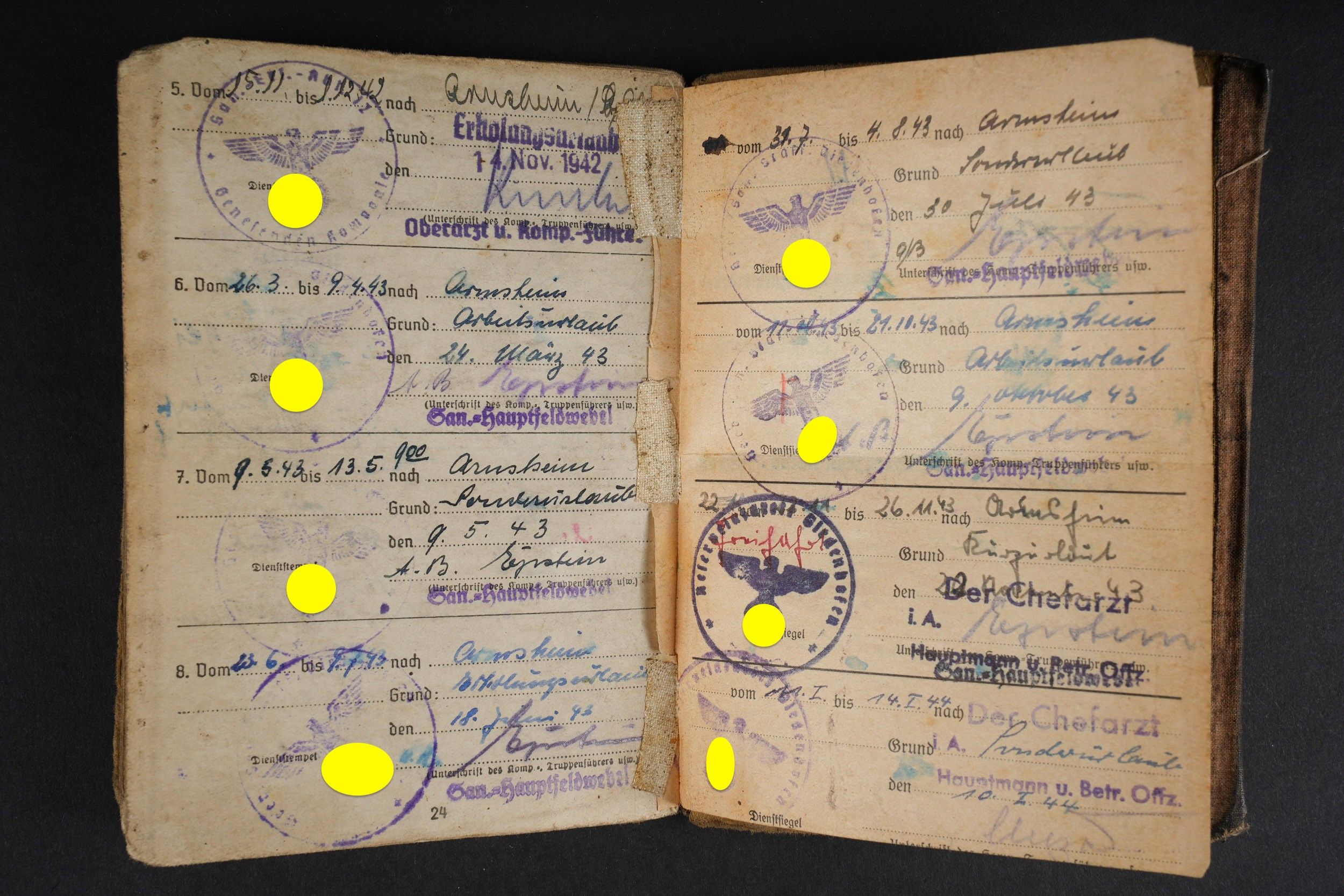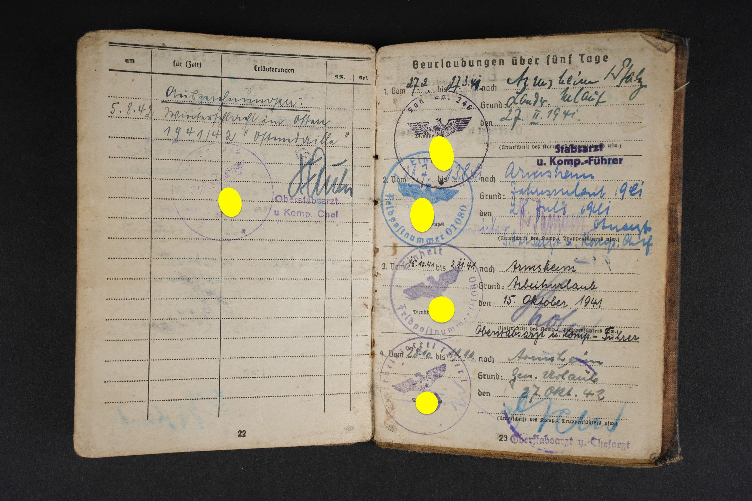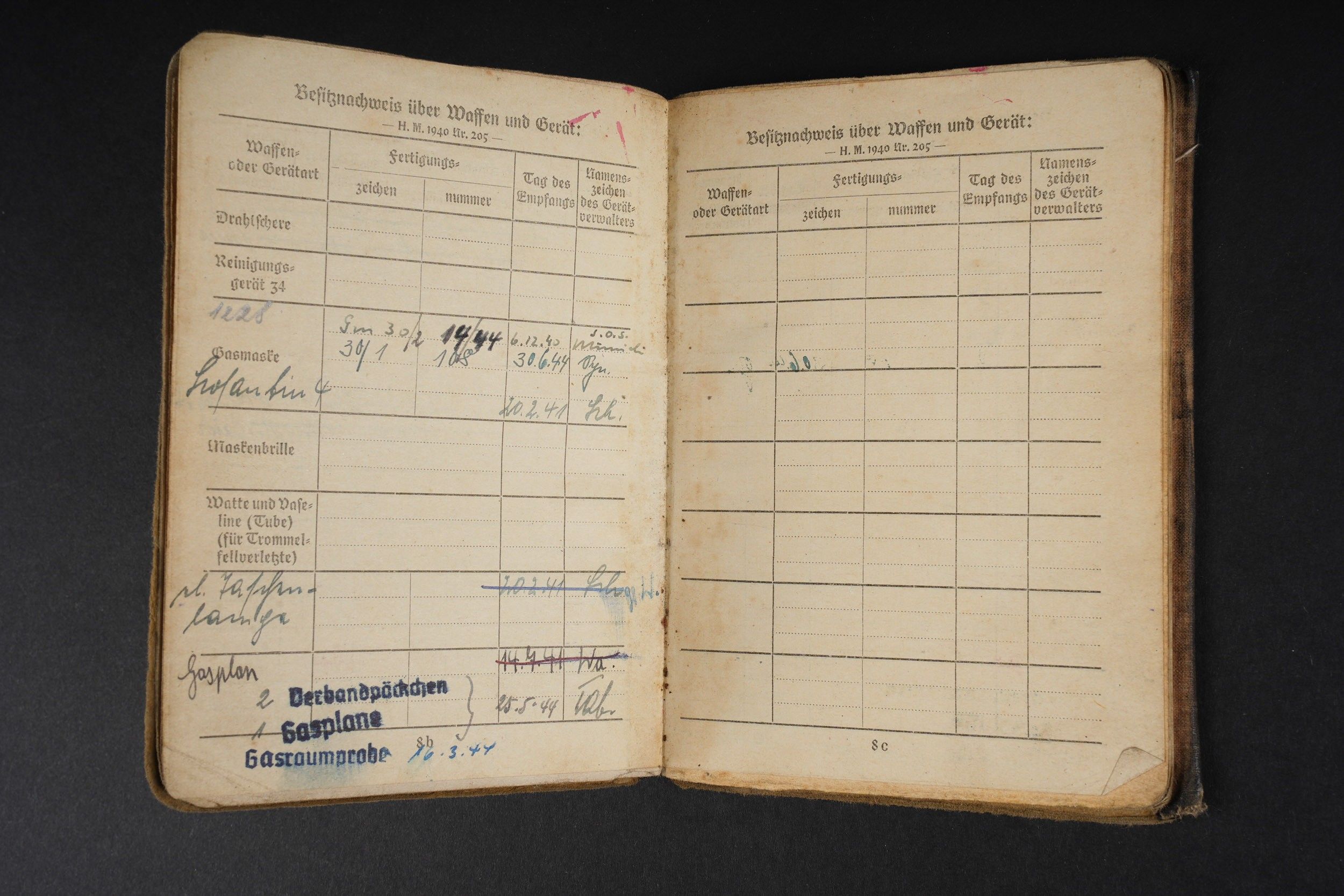 German Soldbuch. Beautiful cover with German eagle. Some tears visible. Identity photo in uniform present. Book number 1.181.696, handwritten marking Gefangenen 992974. Name inscription Adolf Frank. Opened on 5 August 1940 at 5 San Ers Abt 12. Numerous incorporations in various German medical units. Some stays in Lazarett, in particular Trier. Awarded the Eastern Front Medal on 5 August 1942. Well-filled booklet. Some addresses of soldiers in captivity with him. Prisoner of war document PWE 18 dated 21 November 1944, in a camp in France, and under US Army surveillance. A personnalausweis, dated 17 October 1944. Some wear and patina. Condition II+. German Soldbuch Nice cover with printed German eagle. Some small tears visible. Identity photo in uniform present. Book number 1.181.696, handwritten note Gefangenen 992974. Named to Adolf Frank. Opened 5 August 1940 at 5 San Ers Abt 12. Numerous entries in various German medical units and Lazarett stays, including Trier. Awarded the Eastern Front Medal on 5 August 1942. Well-filled booklet. Includes addresses of fellow POWs. Also includes a prisoner of war document from PWE 18 dated 21 November 1944 camp in France under US Army supervision and an identity card dated 17 October 1944. Shows some wear and patina. Condition II+.