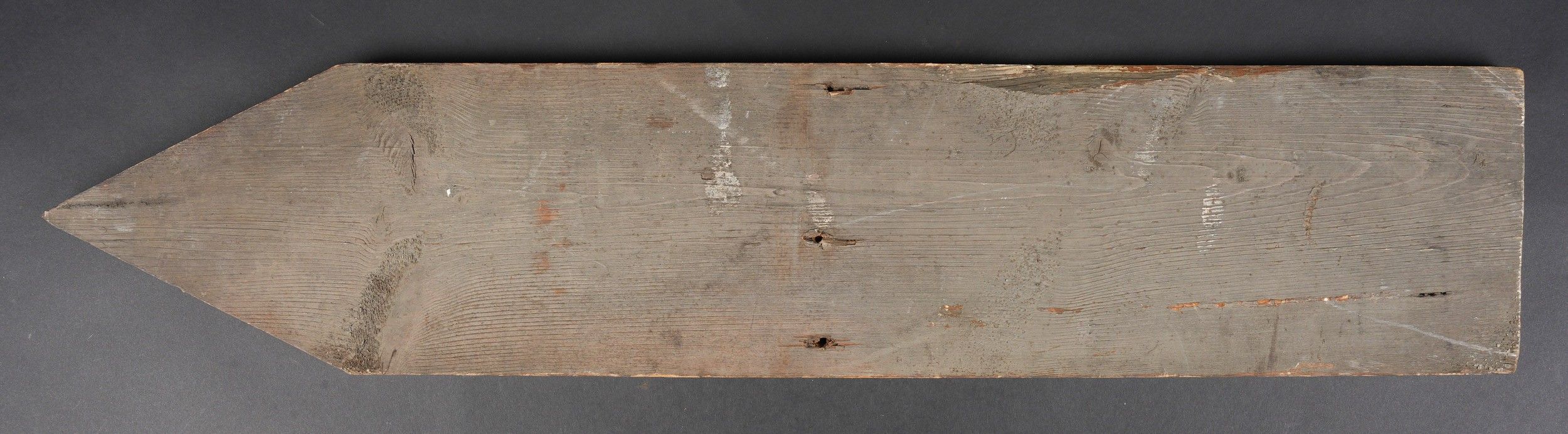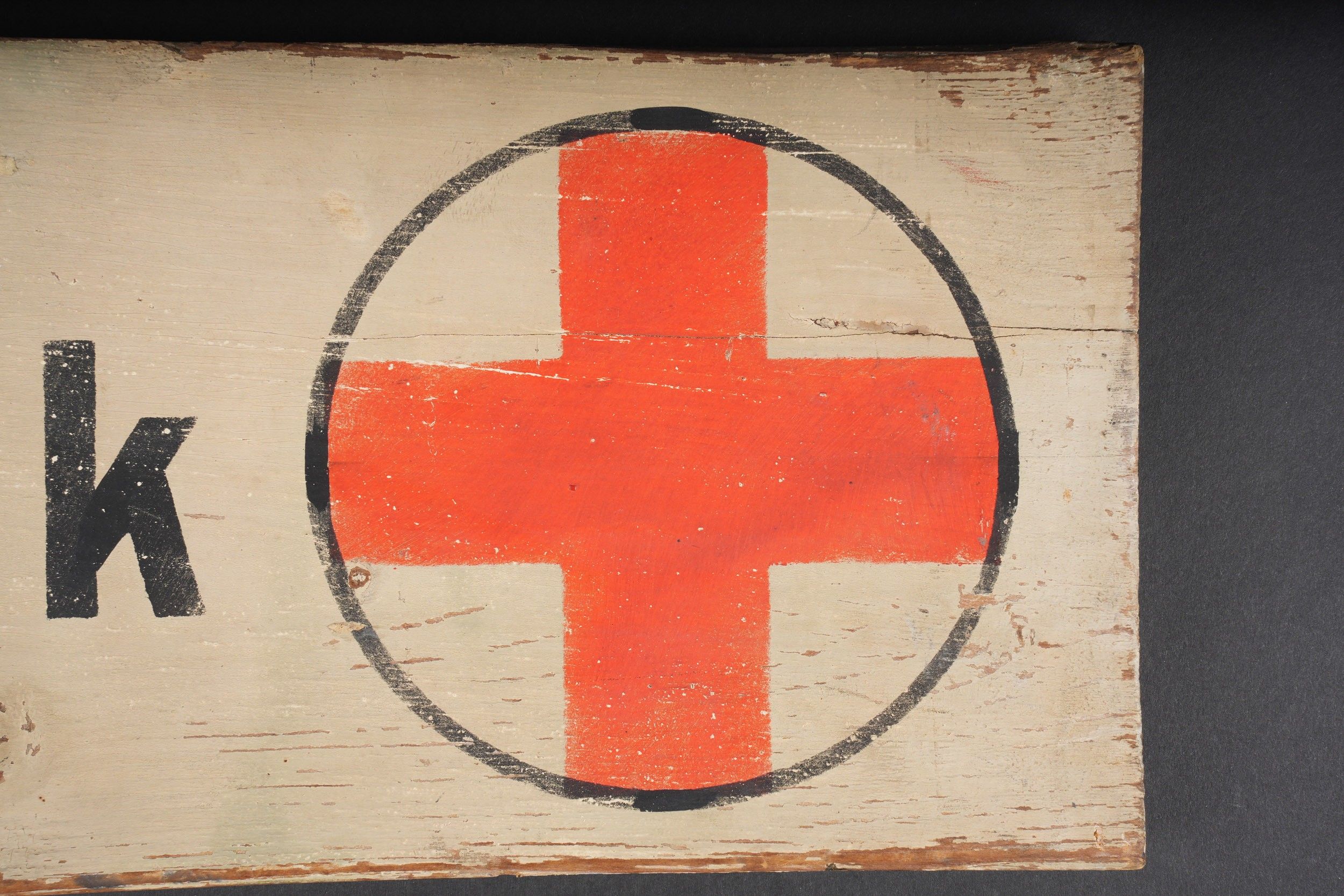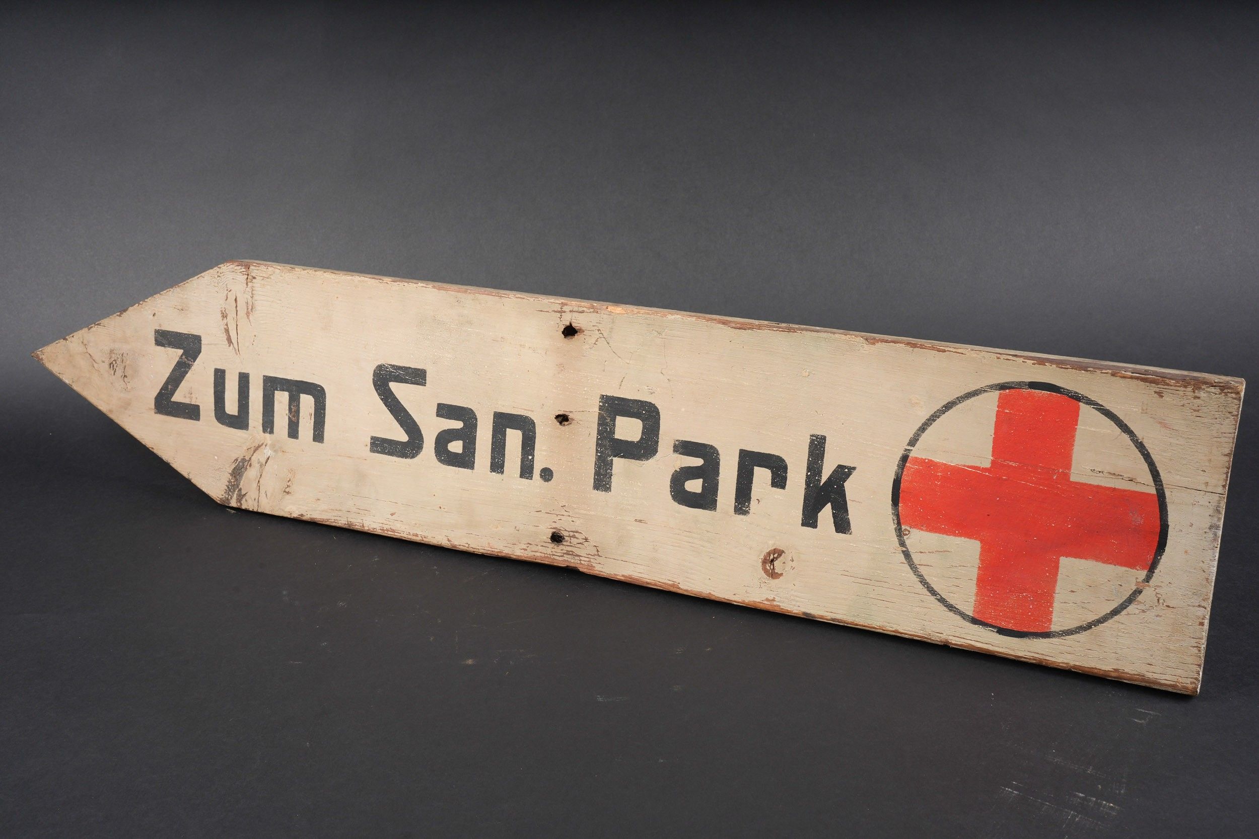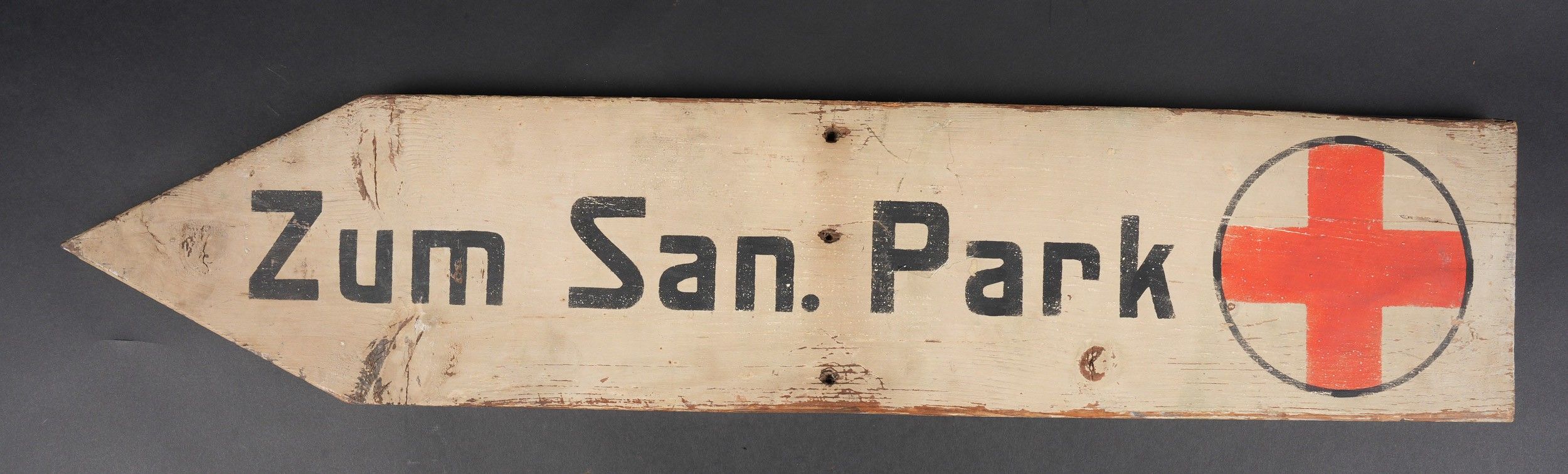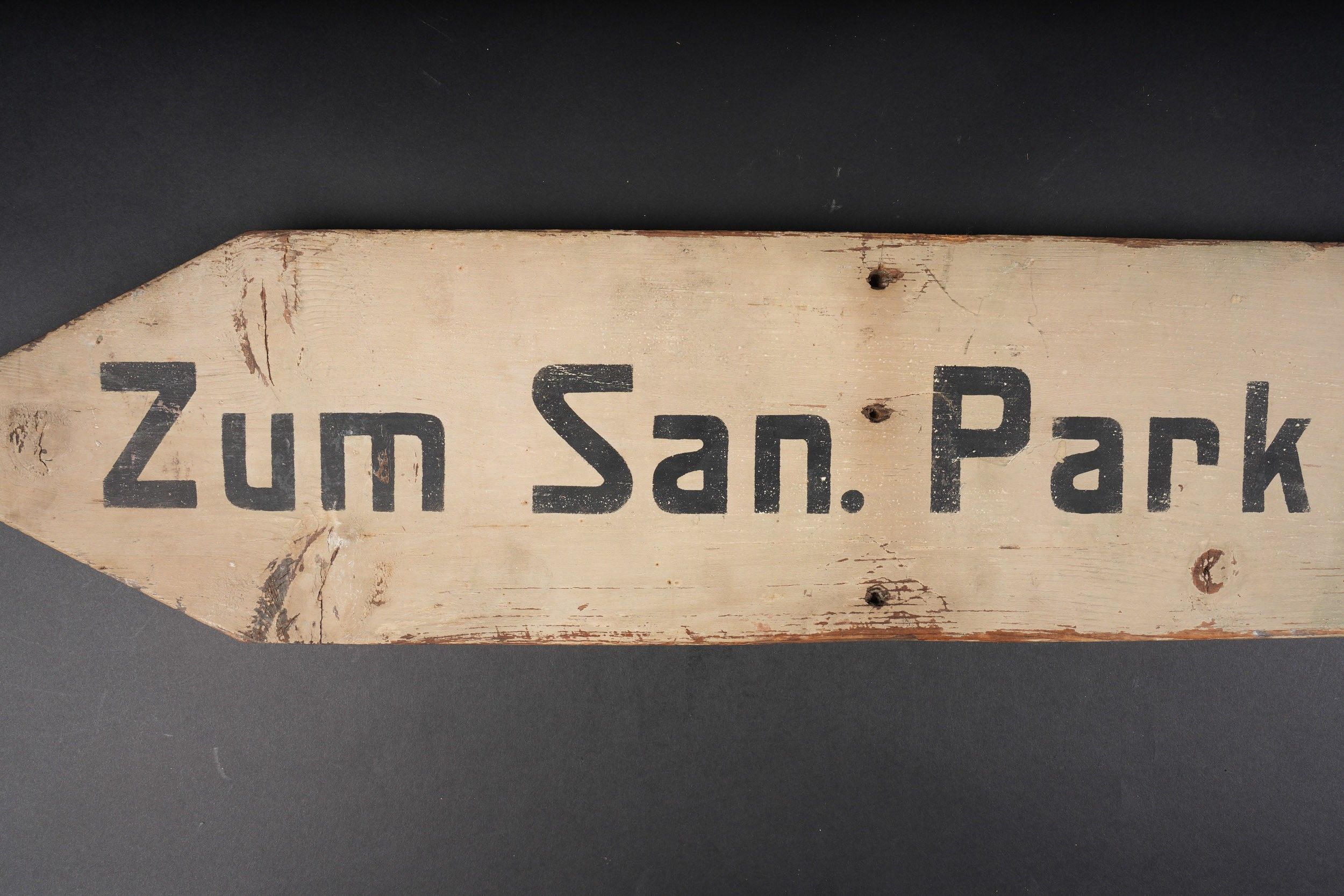 San Park sign. Made of wood. Grey painted background. Markings in black paint Zum San Park. Red cross circled in black. Size 16 x 78 cm. The authenticity of the piece is not guaranteed. Some wear and patina. Three fixing holes in the centre. Condition II+. San Park signboard Wooden sign, grey-painted background with black-painted inscription Zum San Park. Red cross outlined in black. Dimensions 16 × 78 cm. Authenticity not guaranteed. Shows some wear and patina, with three mounting holes at the centre. Condition II+.