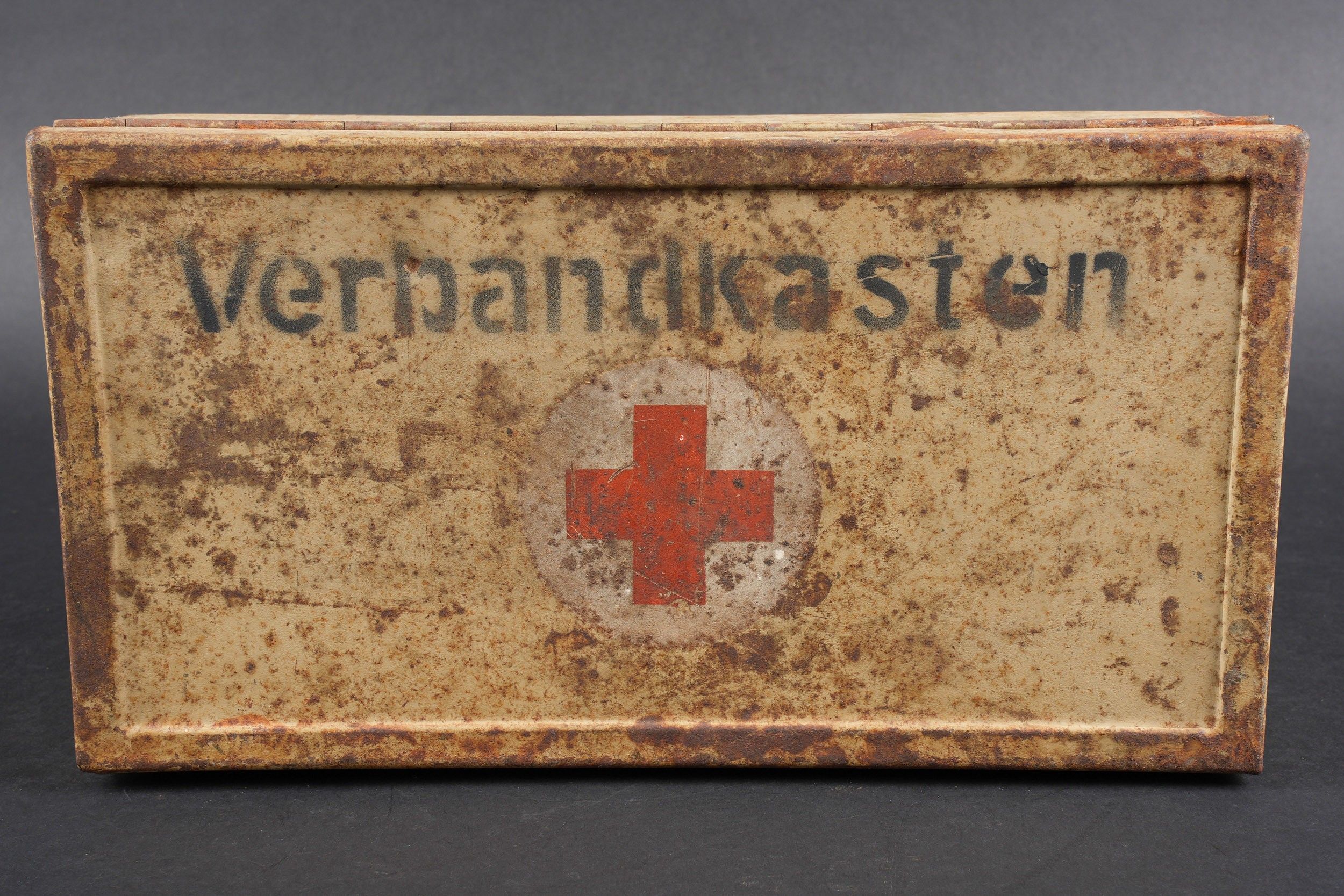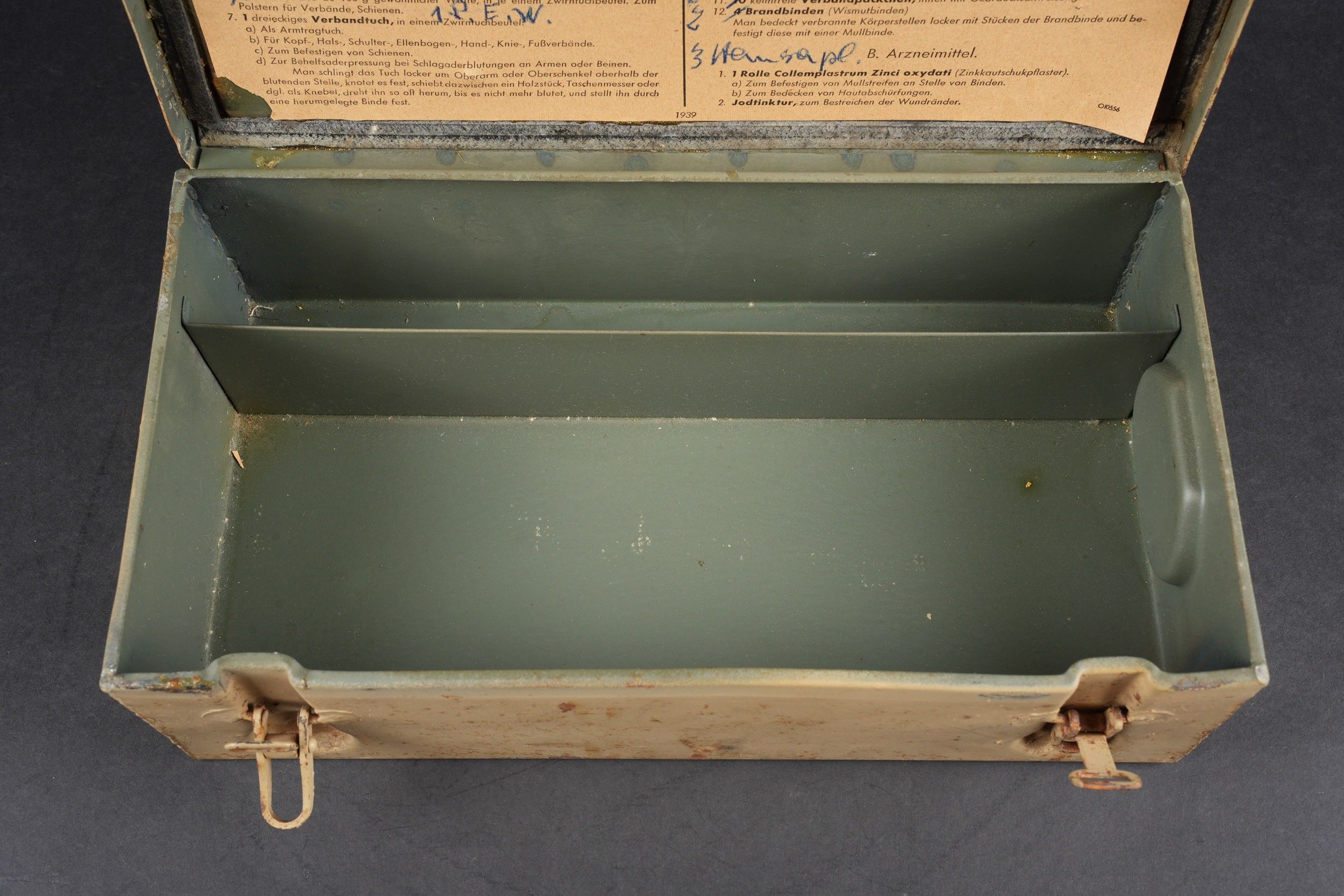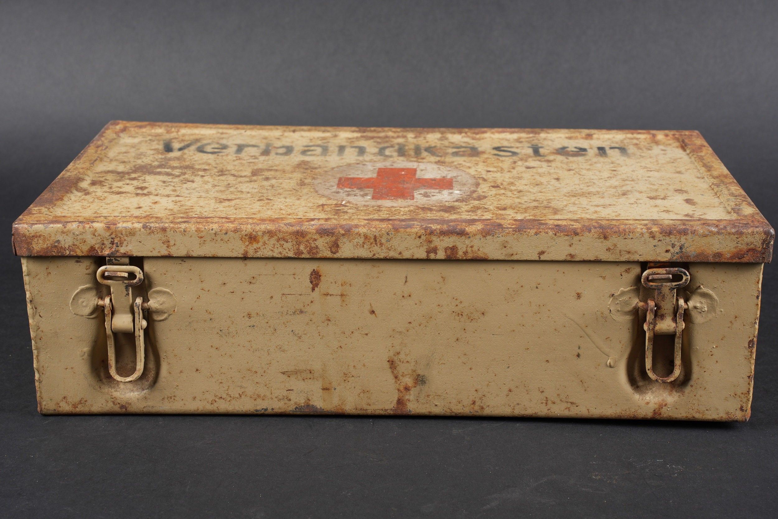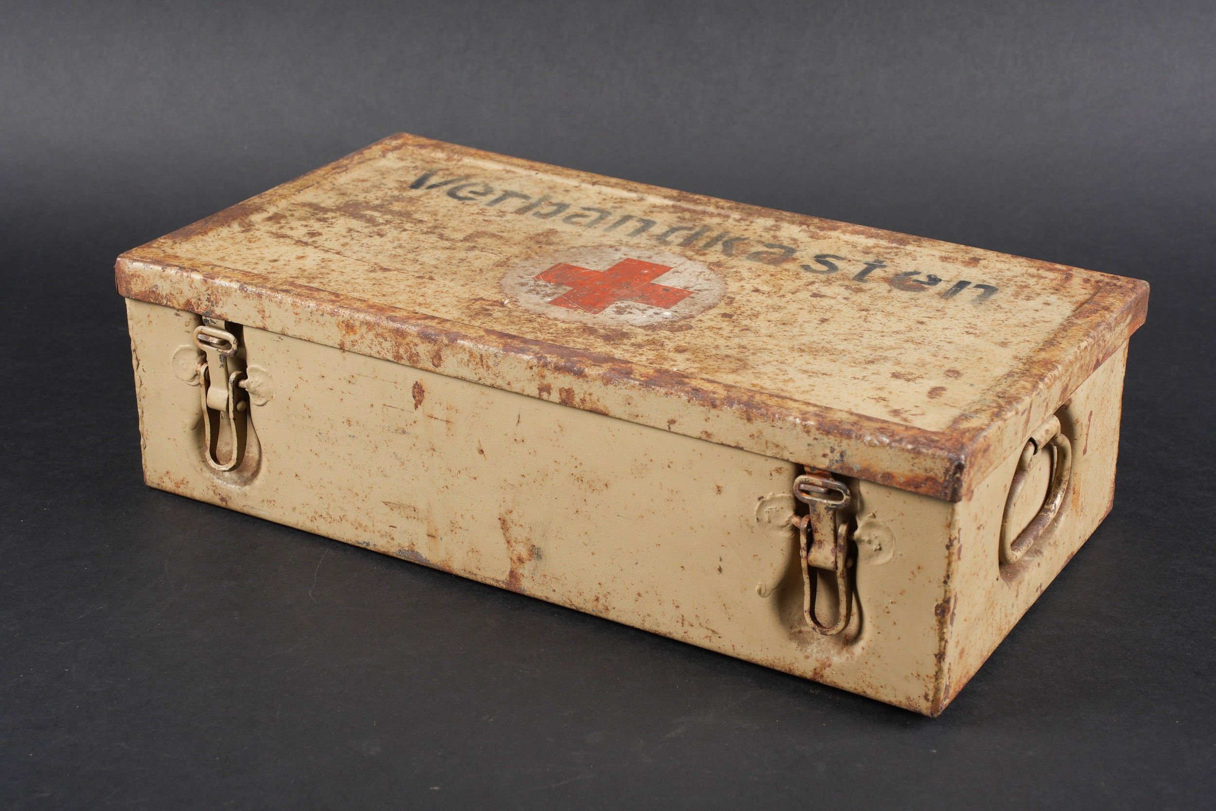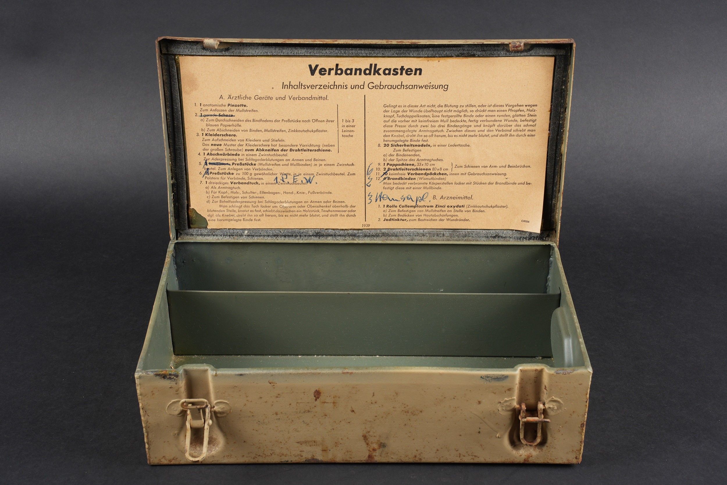 Verbandkasten. Made of metal. Colour 70% sand yellow. The closing hooks are complete. Lid marked Verbandkasten with a red cross. The carrying handle is complete. Empty. The internal racks are present. Inventory label dated 1939, numerous annotations in pencil. Some wear and patina. Condition II+. Verbandkasten Metal box in sand-yellow colour retaining 70% paint. Closure hooks complete. Lid marked Verbandkasten with red cross. Carrying handle complete. Empty. Internal racks present. Inventory label dated 1939 with many pencil annotations. Shows some wear and patina. Condition II+.