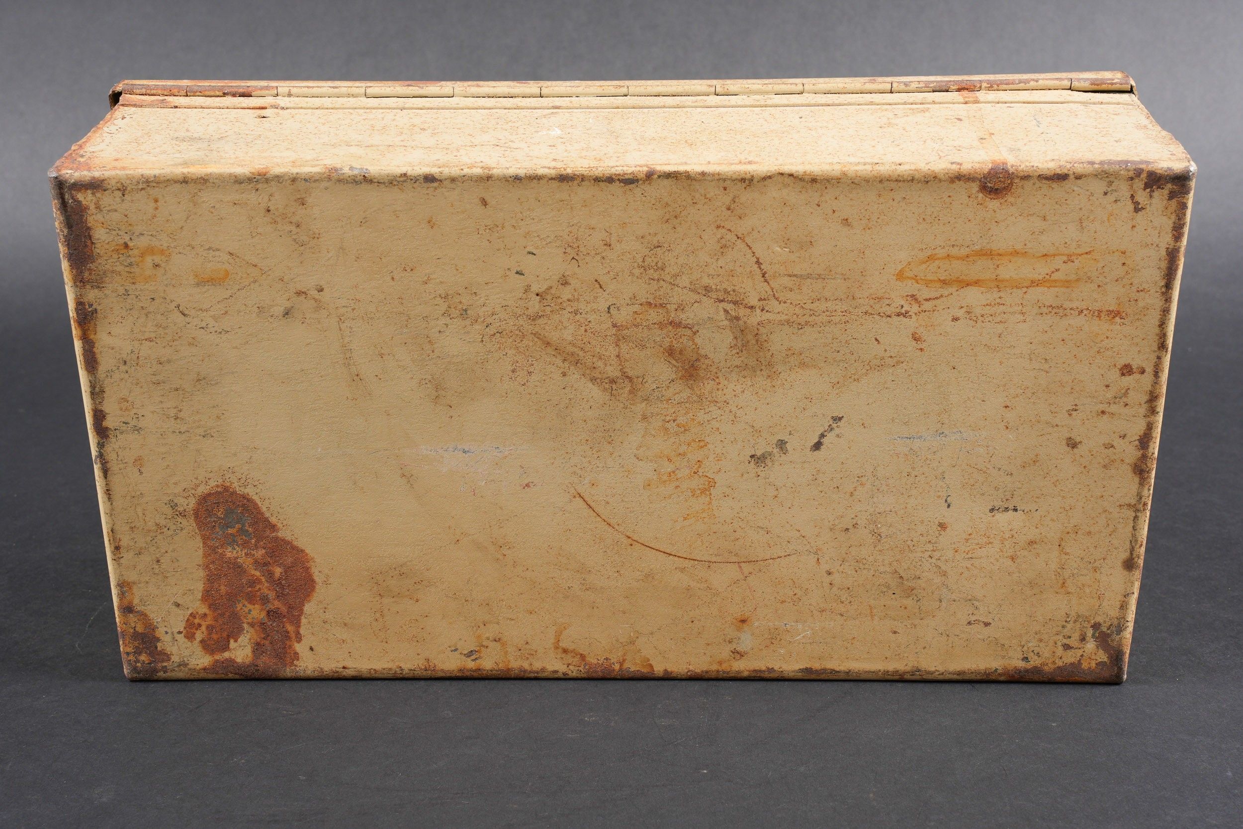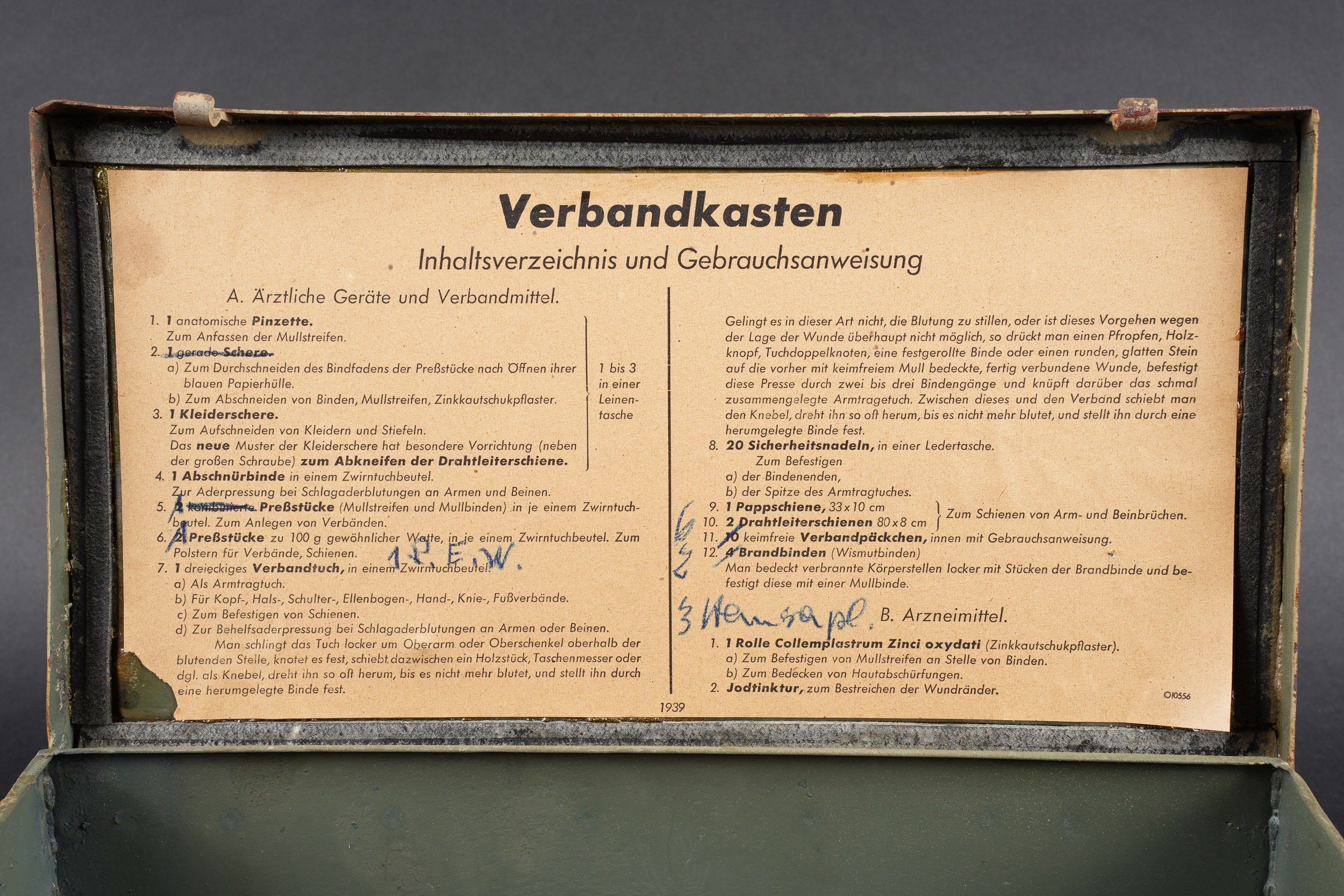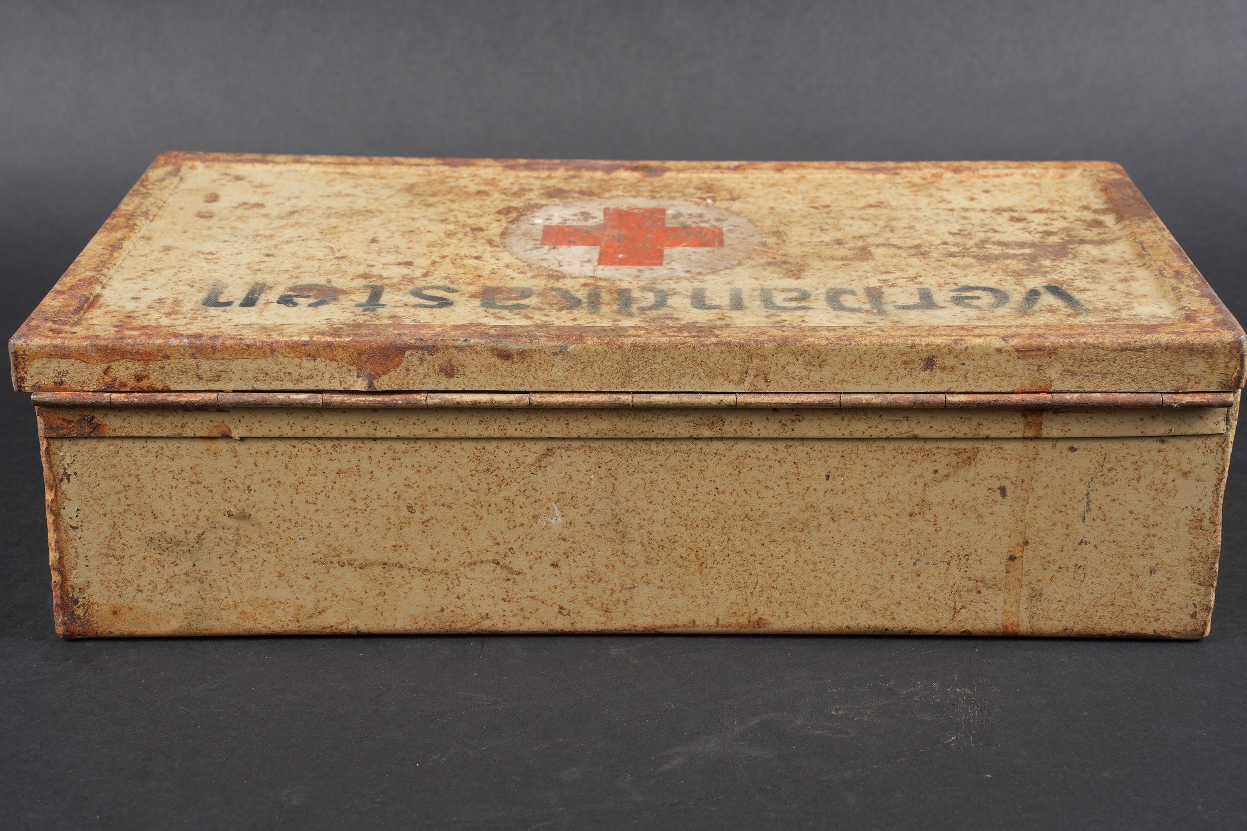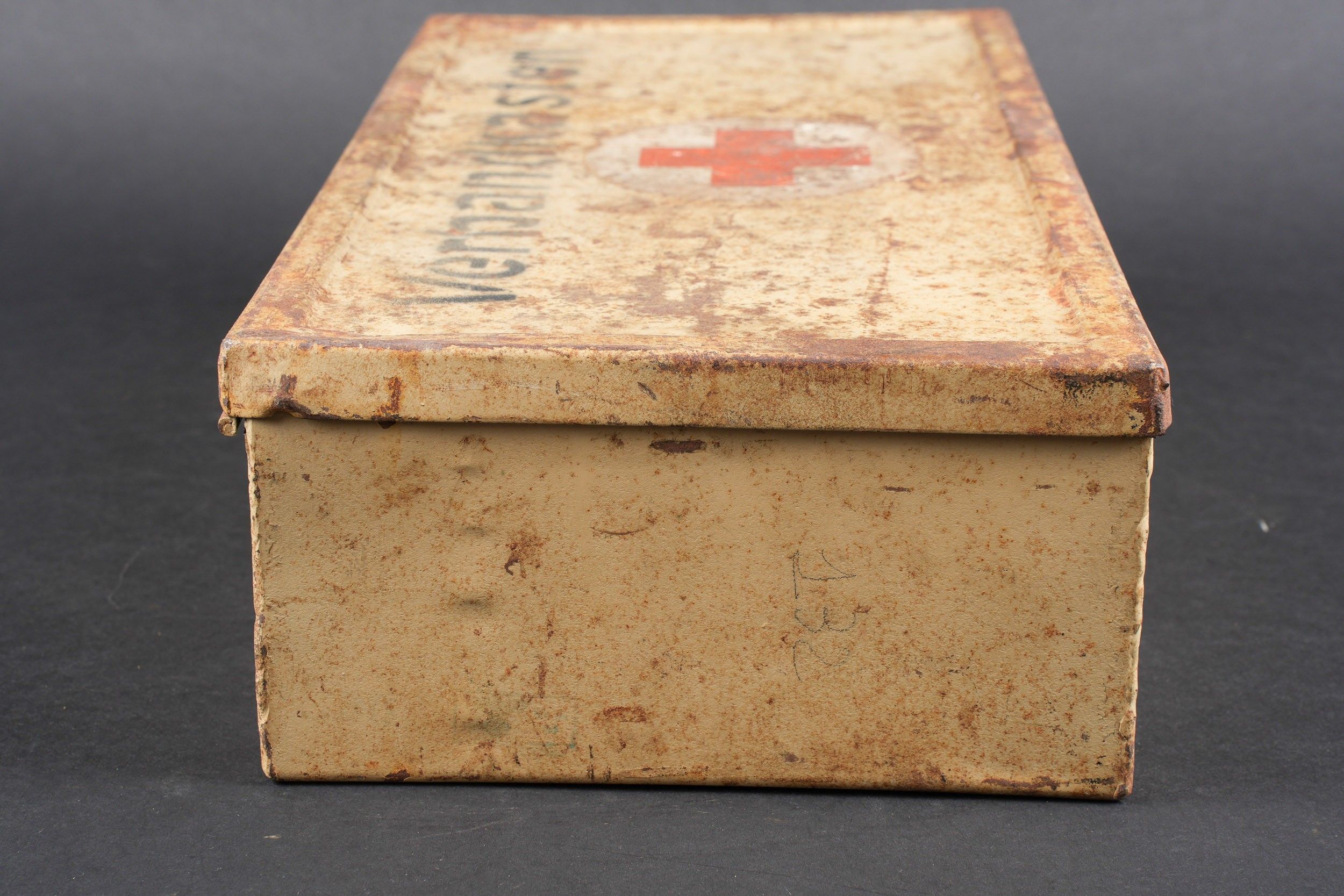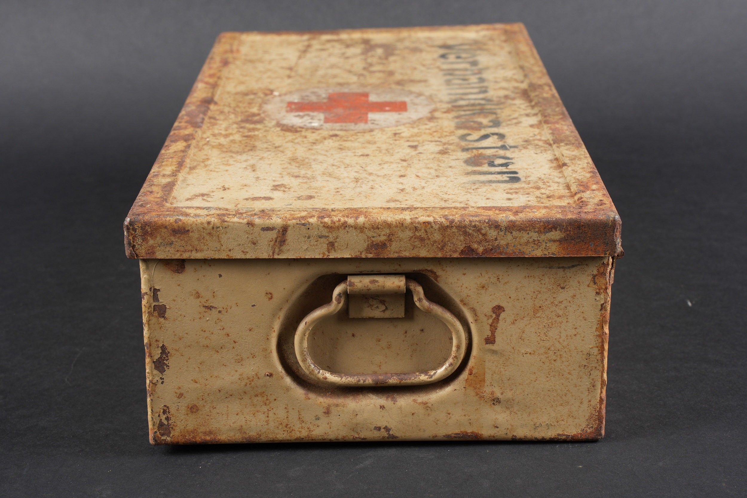 Verbandkasten. Made of metal. Colour 70% sand yellow. The closing hooks are complete. Lid marked Verbandkasten with a red cross. The carrying handle is complete. Empty. The internal racks are present. Inventory label dated 1939, numerous annotations in pencil. Some wear and patina. Condition II+. Verbandkasten Metal box in sand-yellow colour retaining 70% paint. Closure hooks complete. Lid marked Verbandkasten with red cross. Carrying handle complete. Empty. Internal racks present. Inventory label dated 1939 with many pencil annotations. Shows some wear and patina. Condition II+.