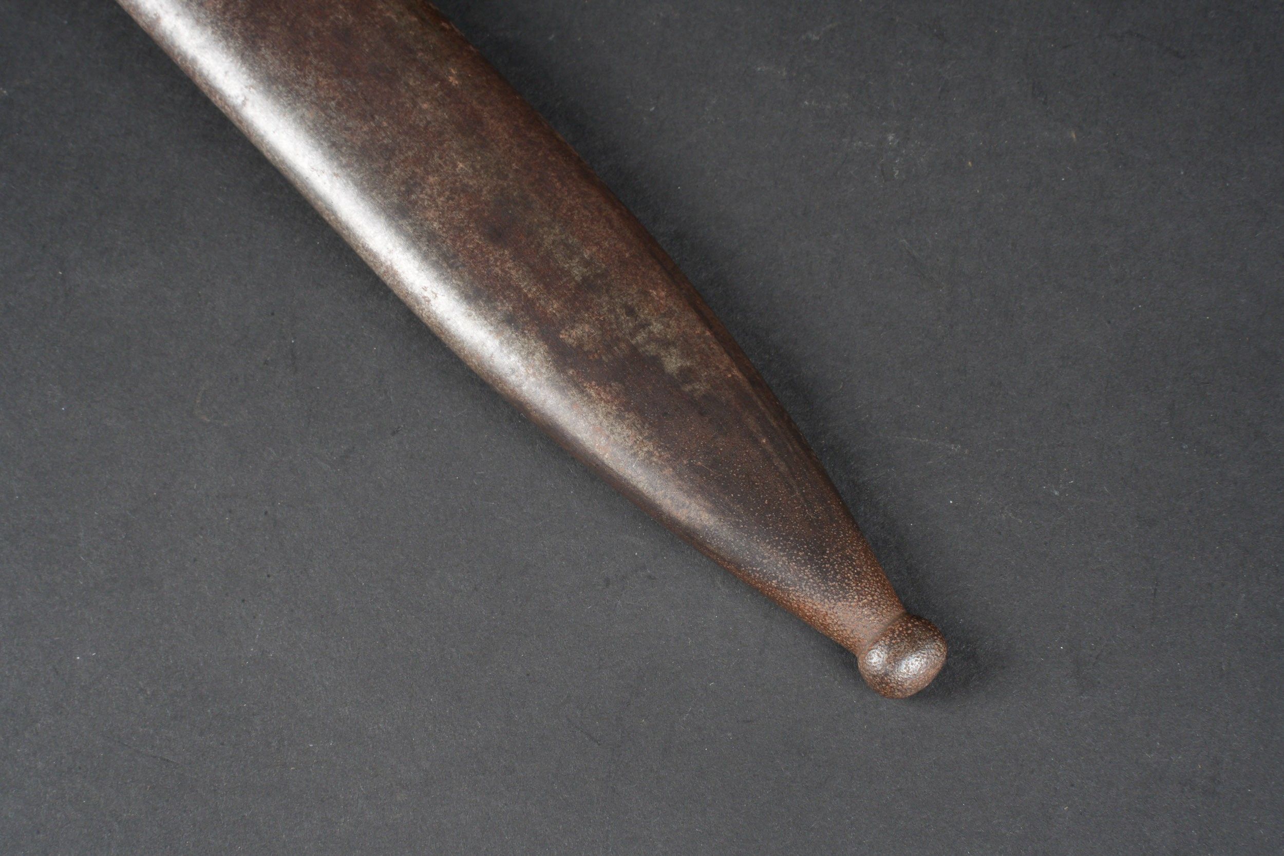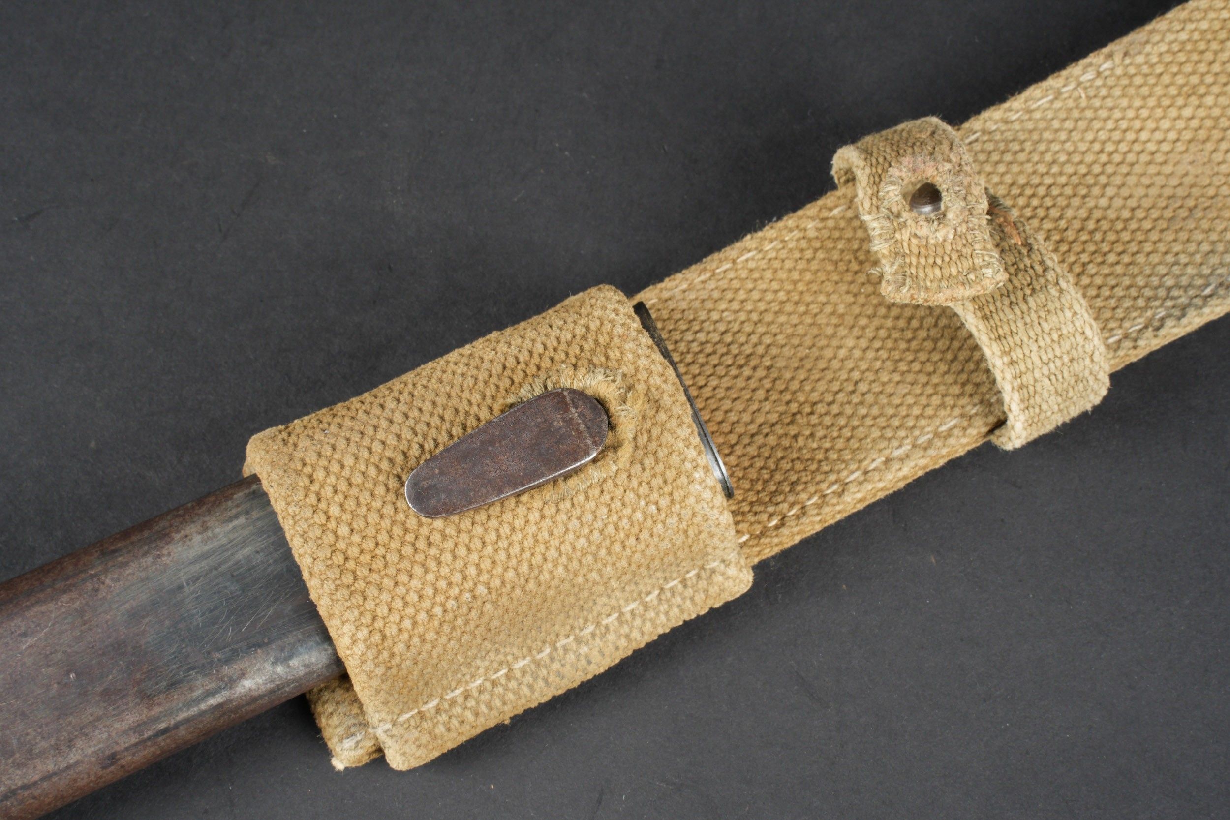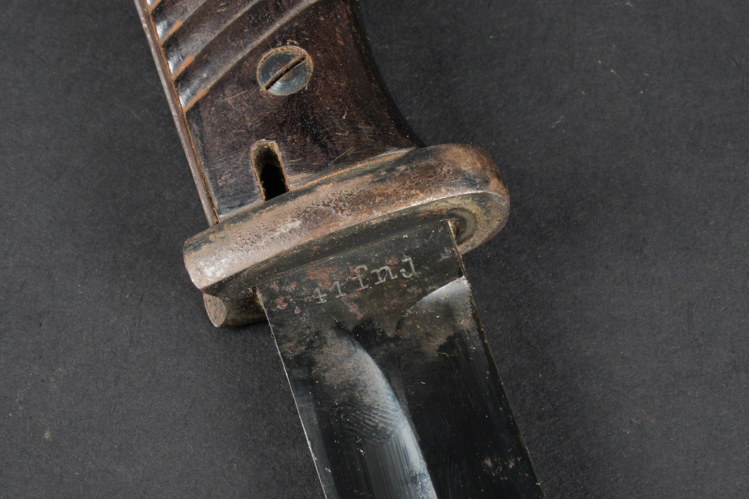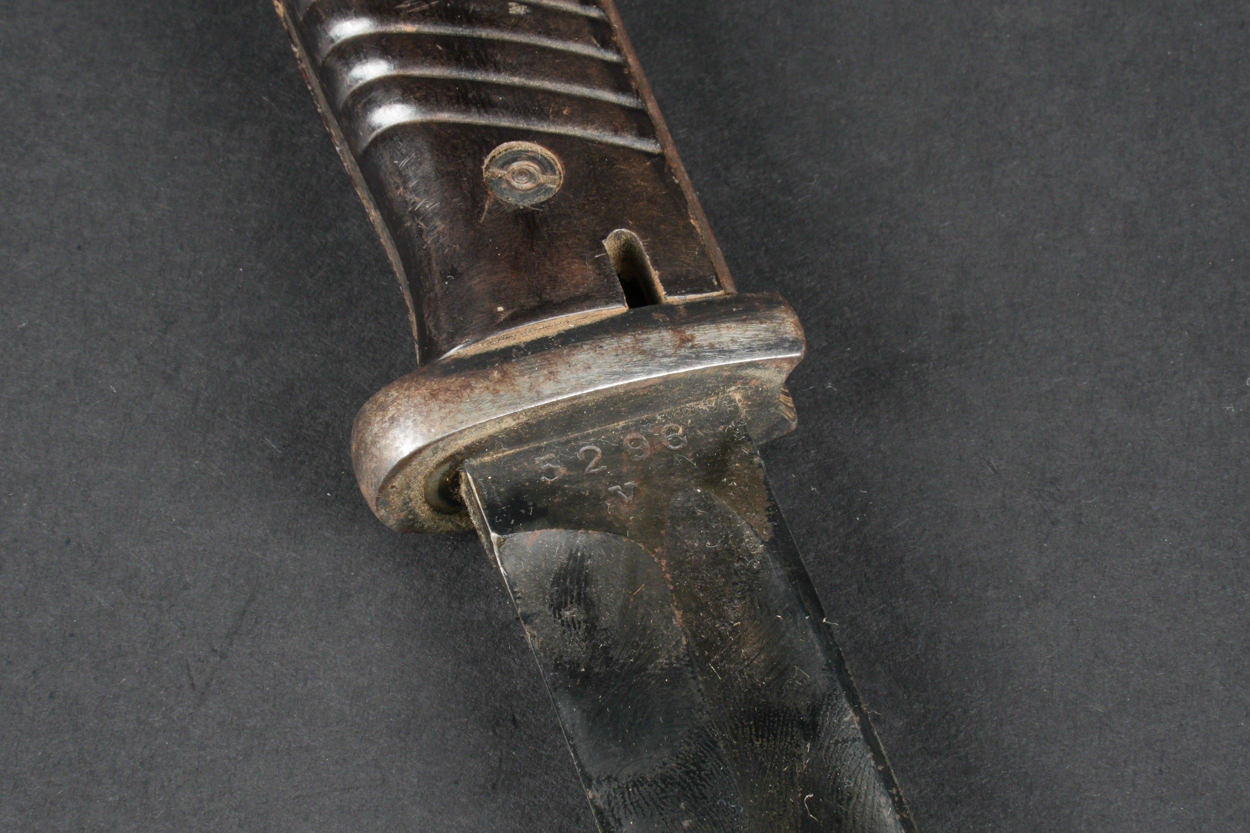 Mauser 98K bayonet. Metal trim, 50% original tanning. Full bakelite plates. Very nice blade in its original colour at 85%. Manufacture 41FNJ , number 5296V. Metal scabbard, original colour at 30%. Manufacture illegible, number 5296V. Gun with the same number. Some dents on the scabbard. Complete canvas gusset, no visible markings. Some wear and patina. Condition II+. Mauser 98K bayonet Metal fittings with 50% original blued finish. Complete Bakelite grips. Fine blade retaining 85% original finish. Maker 41FNJ, serial number 5296V. Metal scabbard with 30% original finish, same serial number 5296V. Matching numbers. Some teeth on the scabbard. Complete canvas frog, no visible markings. Shows wear and patina. Condition II+.