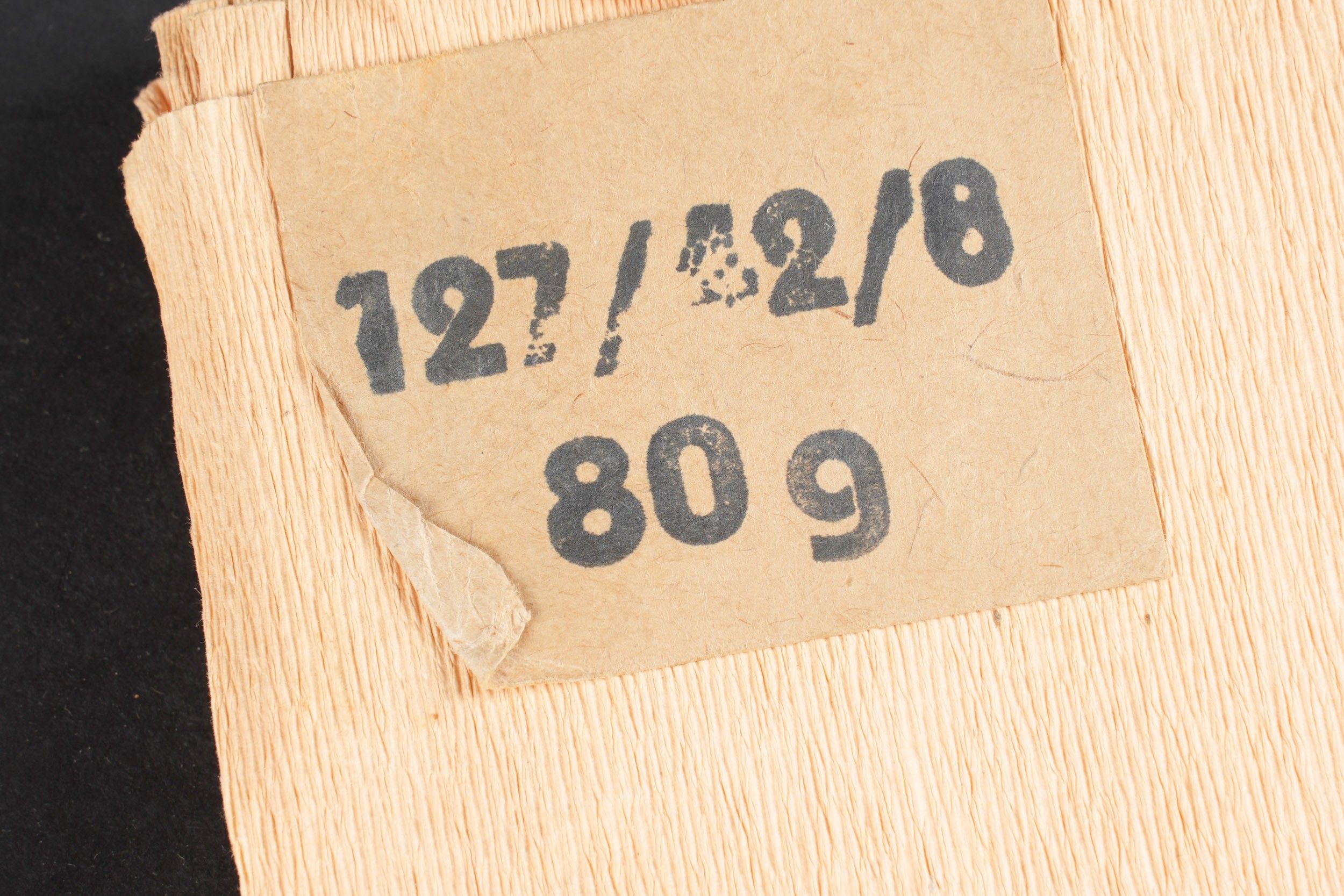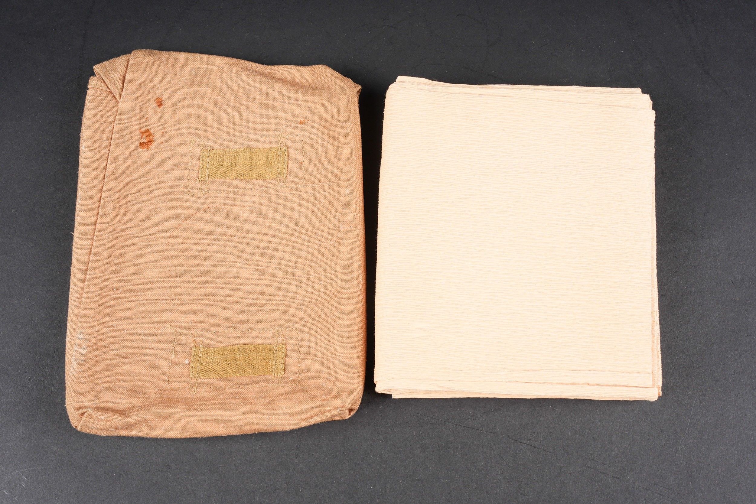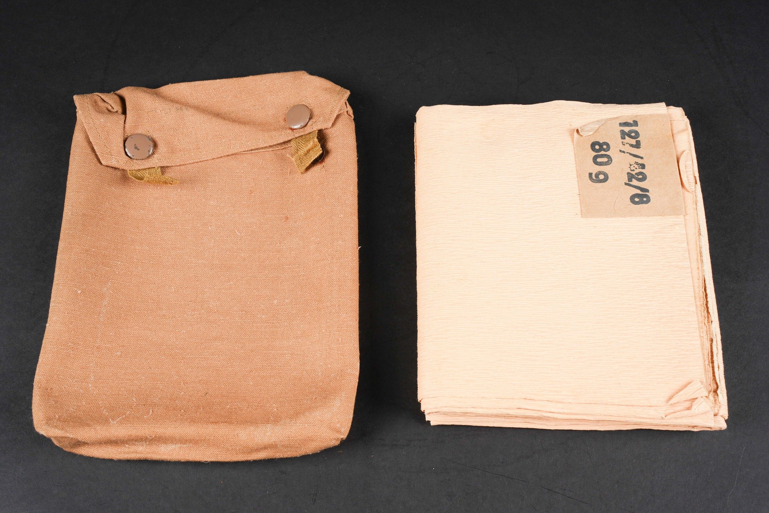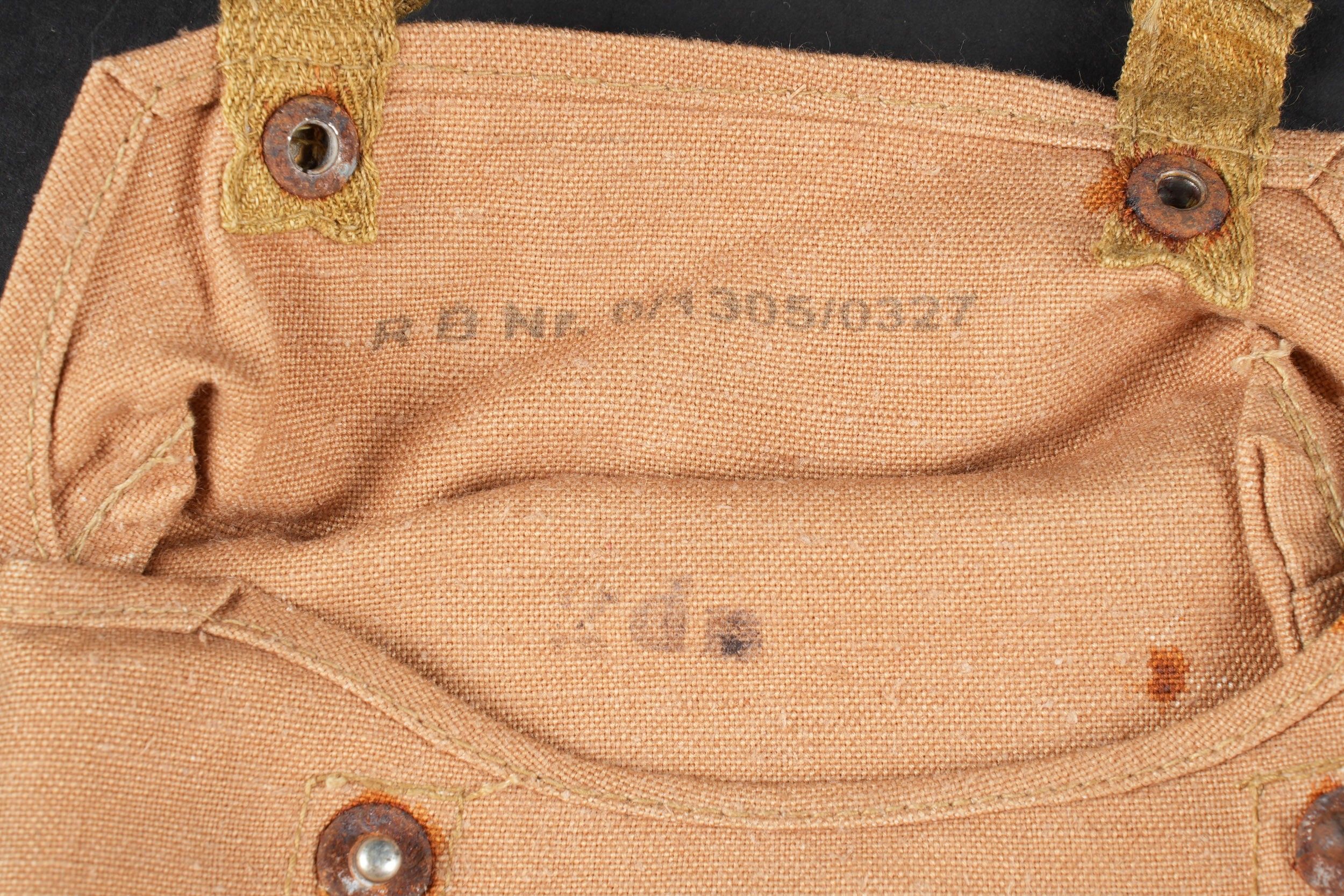 German gasplane. Cover in strong sandy yellow canvas. The press studs are functional but oxidised. Markings under the flap RBNr 013050327. Sand-yellow gasplane, marked on label 127428 80g. Some wear and patina. Condition II+. German gasplane Heavy sand-coloured canvas cover, functional but oxidized press studs. Marked under the flap RBNr 013050327. Sand-coloured gasplane marked on label 127428 80g. Shows some wear and patina. Condition II+.