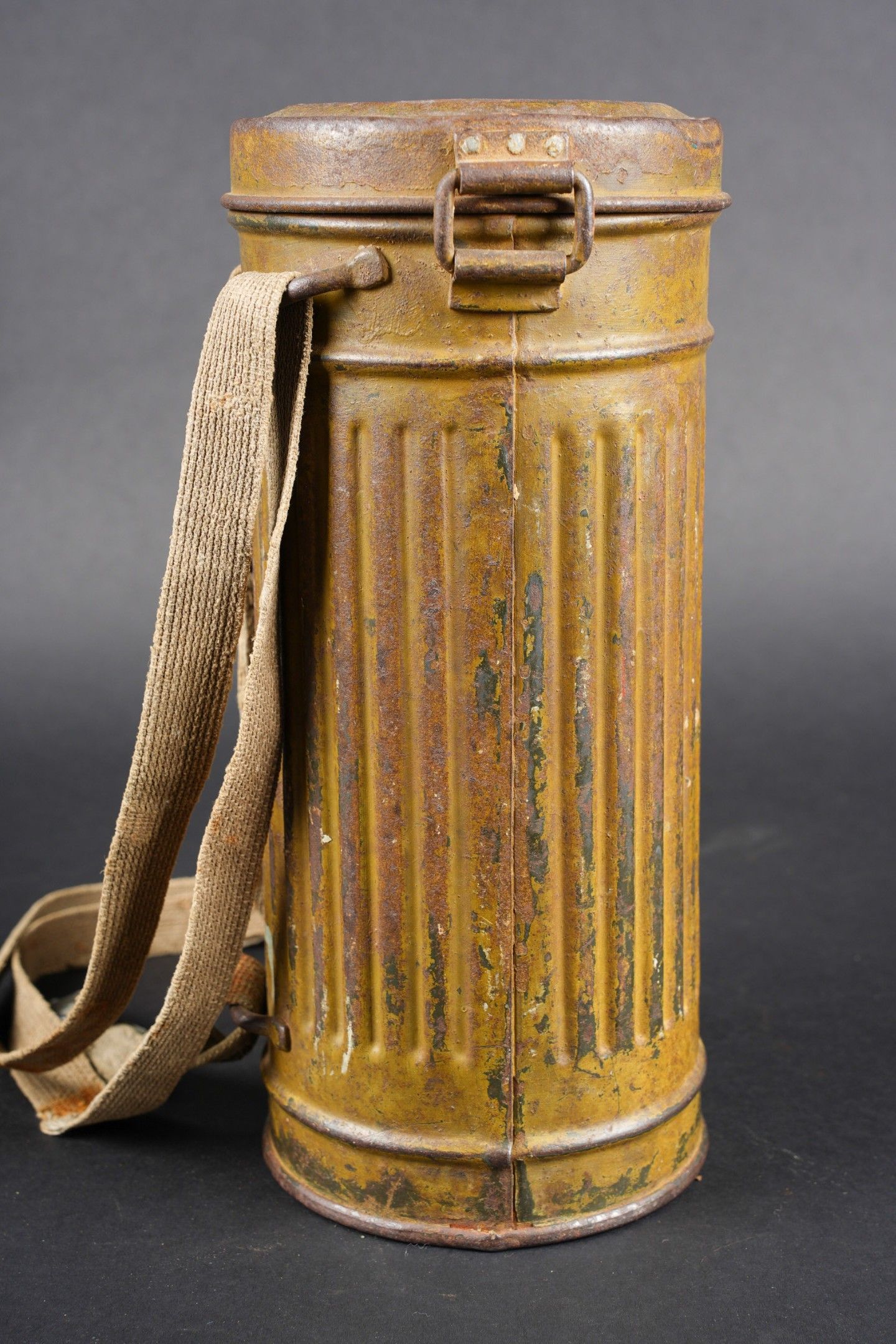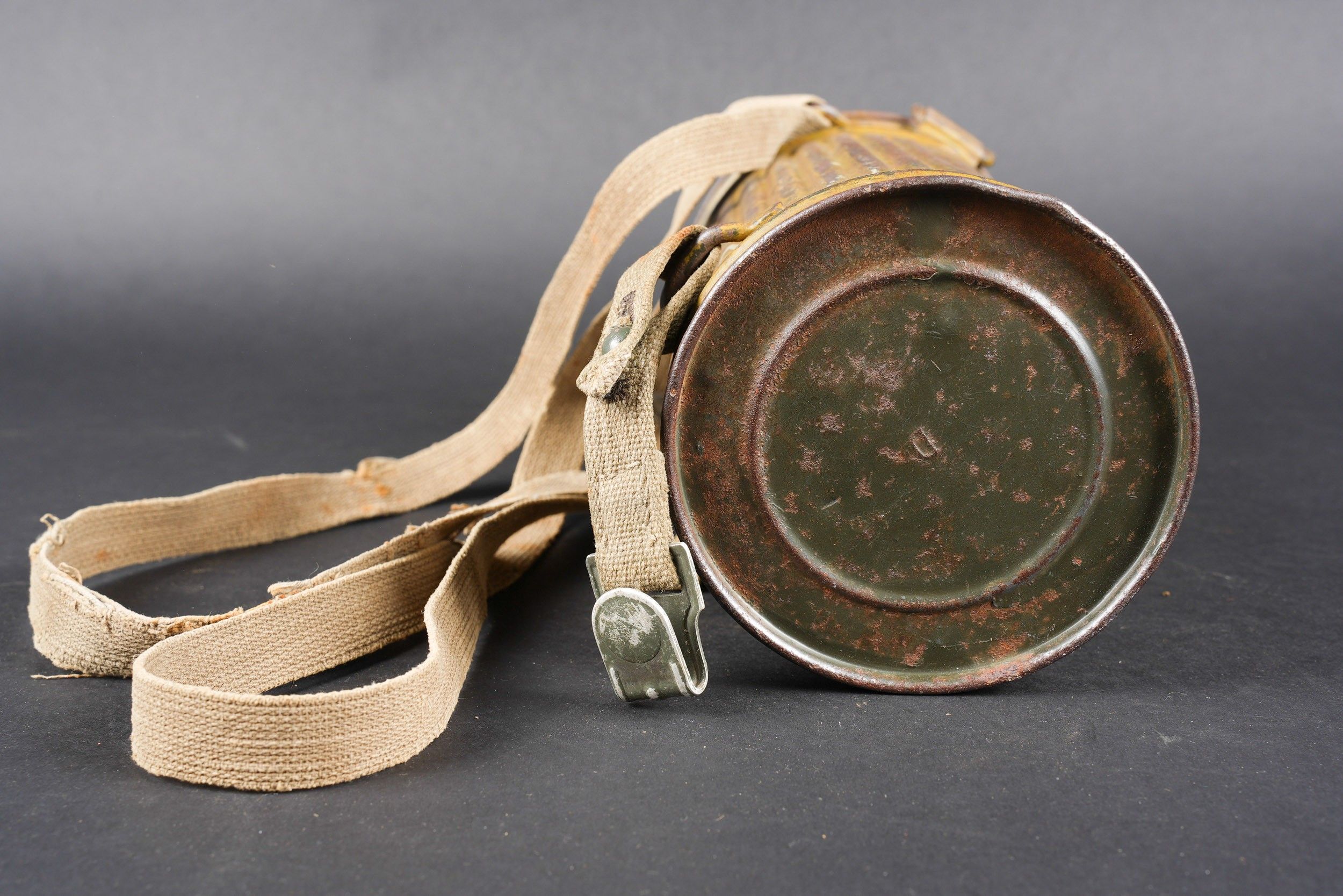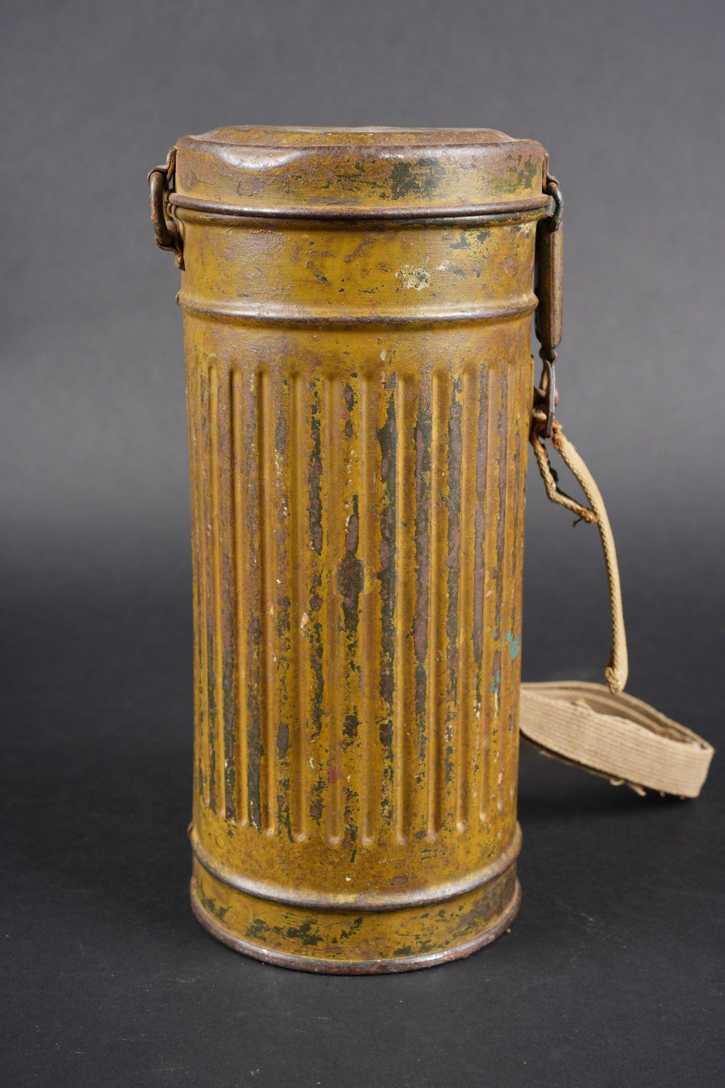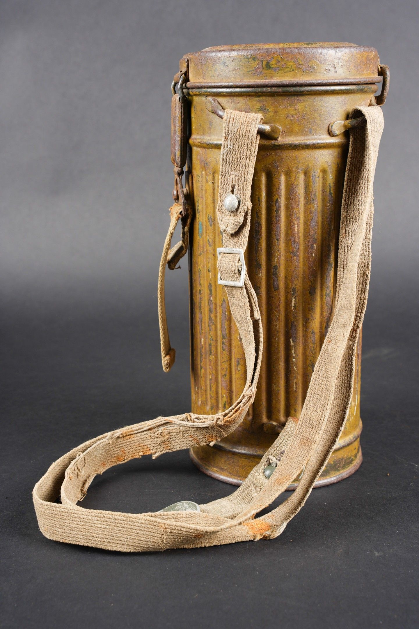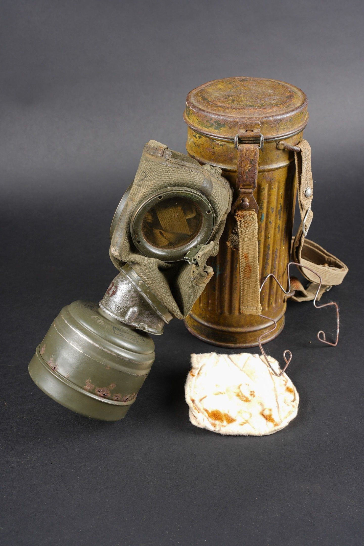Camouflaged anti-gas mask. Long metal case. 70% sand yellow paint. All straps are present, but different models. A few visible dents throughout the case. The canvas zip has been period shortened. Illegible number painted under the lid. The spare lenses are present, as are the spider and the cloth. Canvas mask, size 2, all straps present. Nice FE 37 filter. A visible perforation on the side of the filter. Some wear and patina. Condition II+. Camouflaged gas mask Long metal canister with 70% sand-yellow paint remaining. All straps present but of mixed models. Some dents visible throughout. Pull strap shortened period-style. Number illegible, painted under the lid. Spare lenses, spider, and cleaning cloth present. Canvas mask, size 2, all straps intact. Fine FE 37 filter with one visible perforation on the side. Shows some wear and patina. Condition II+.