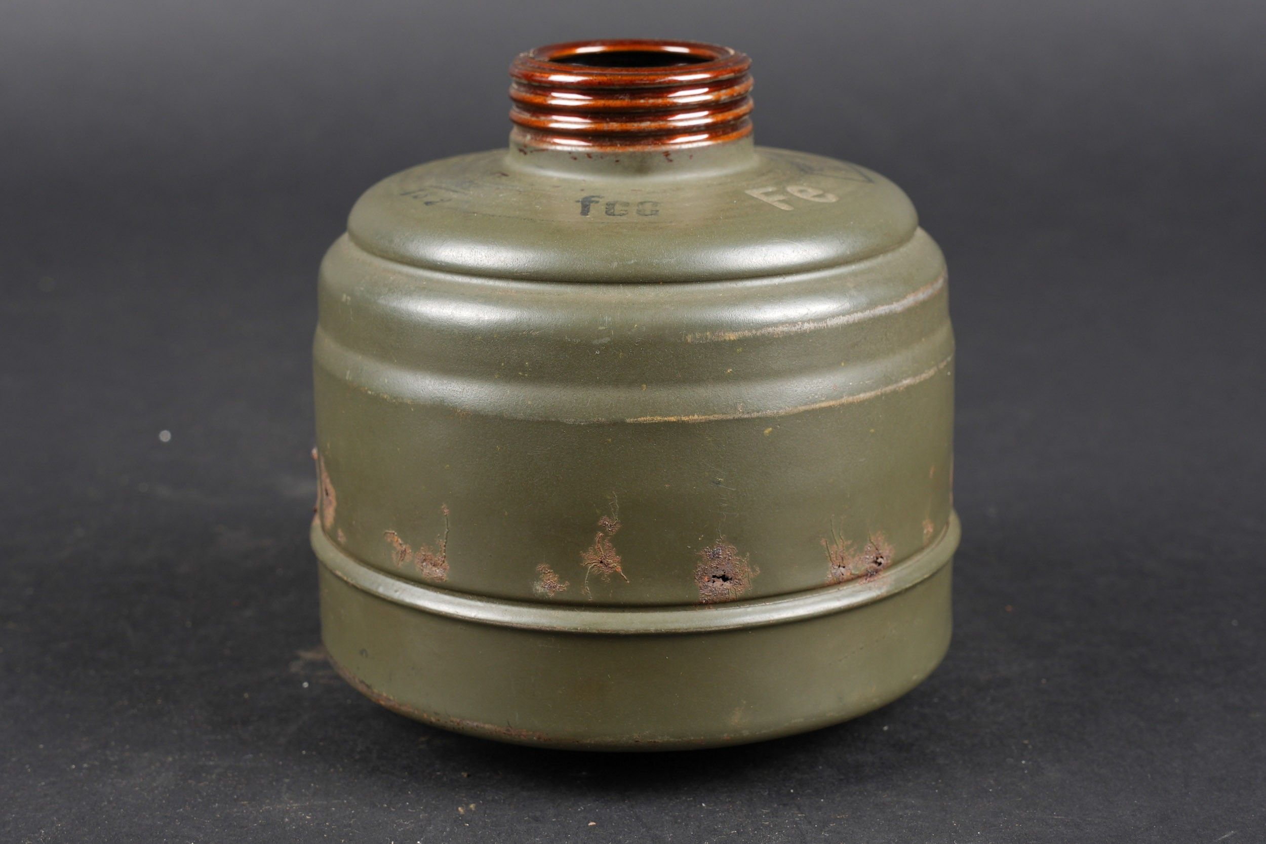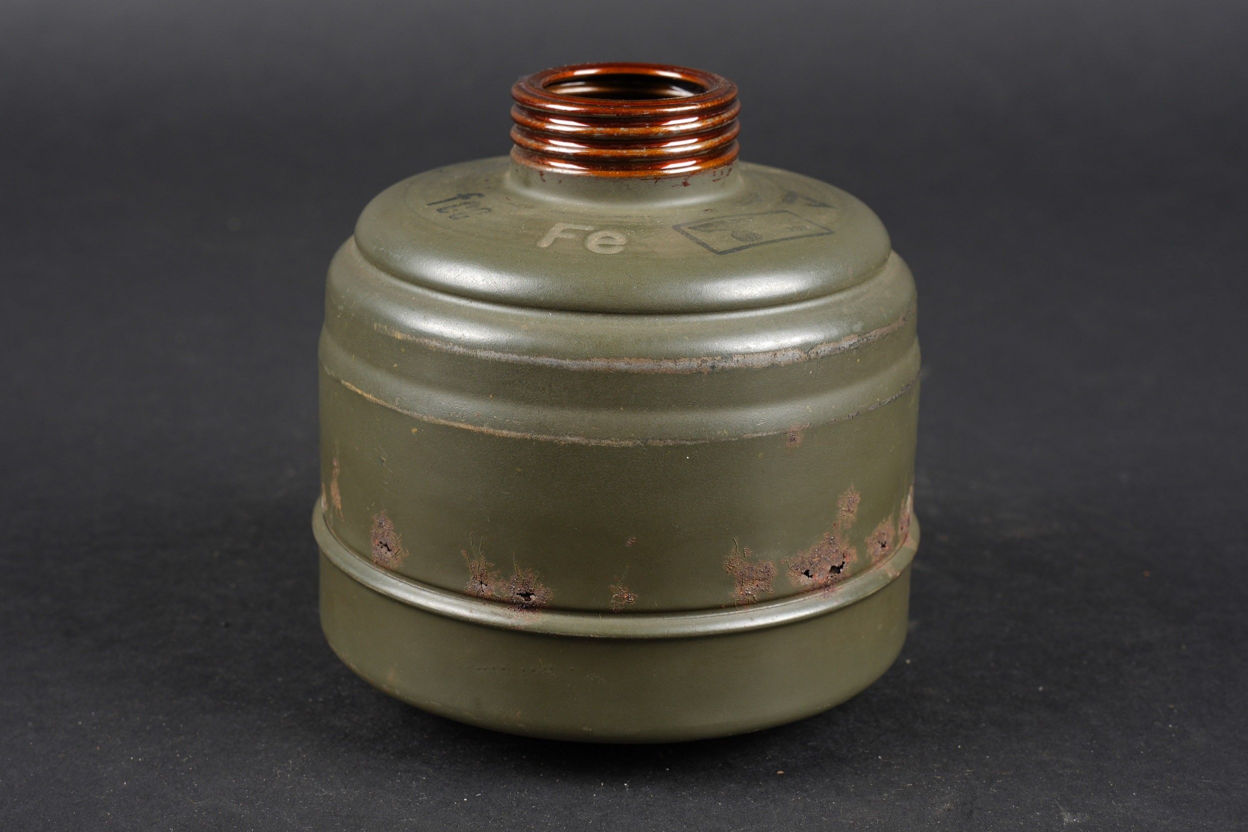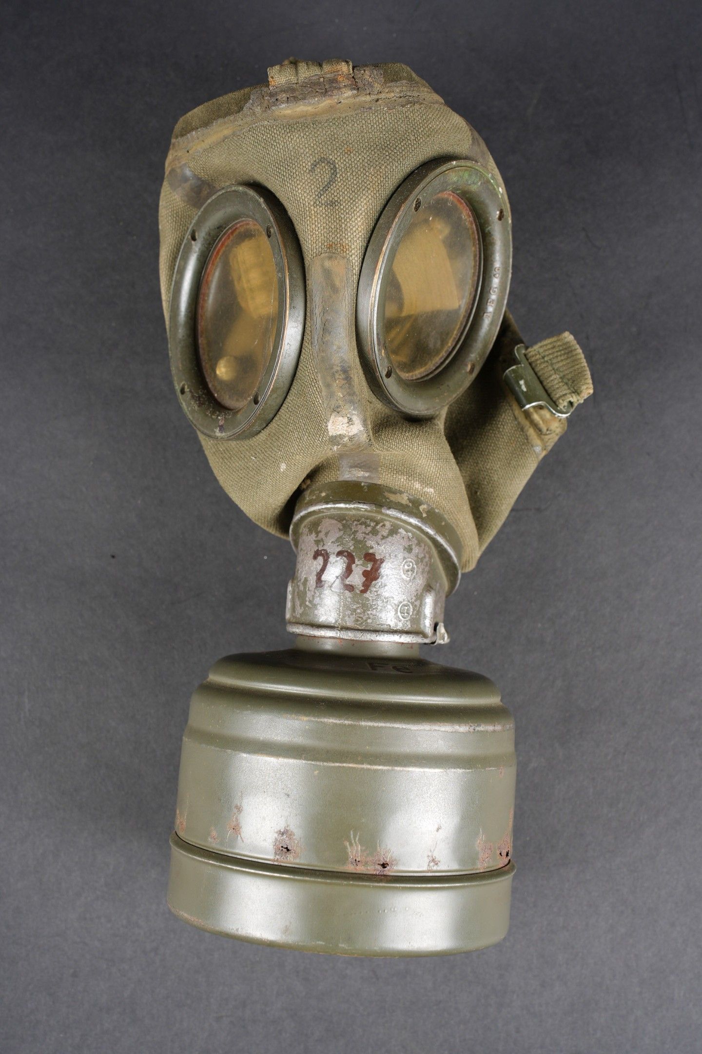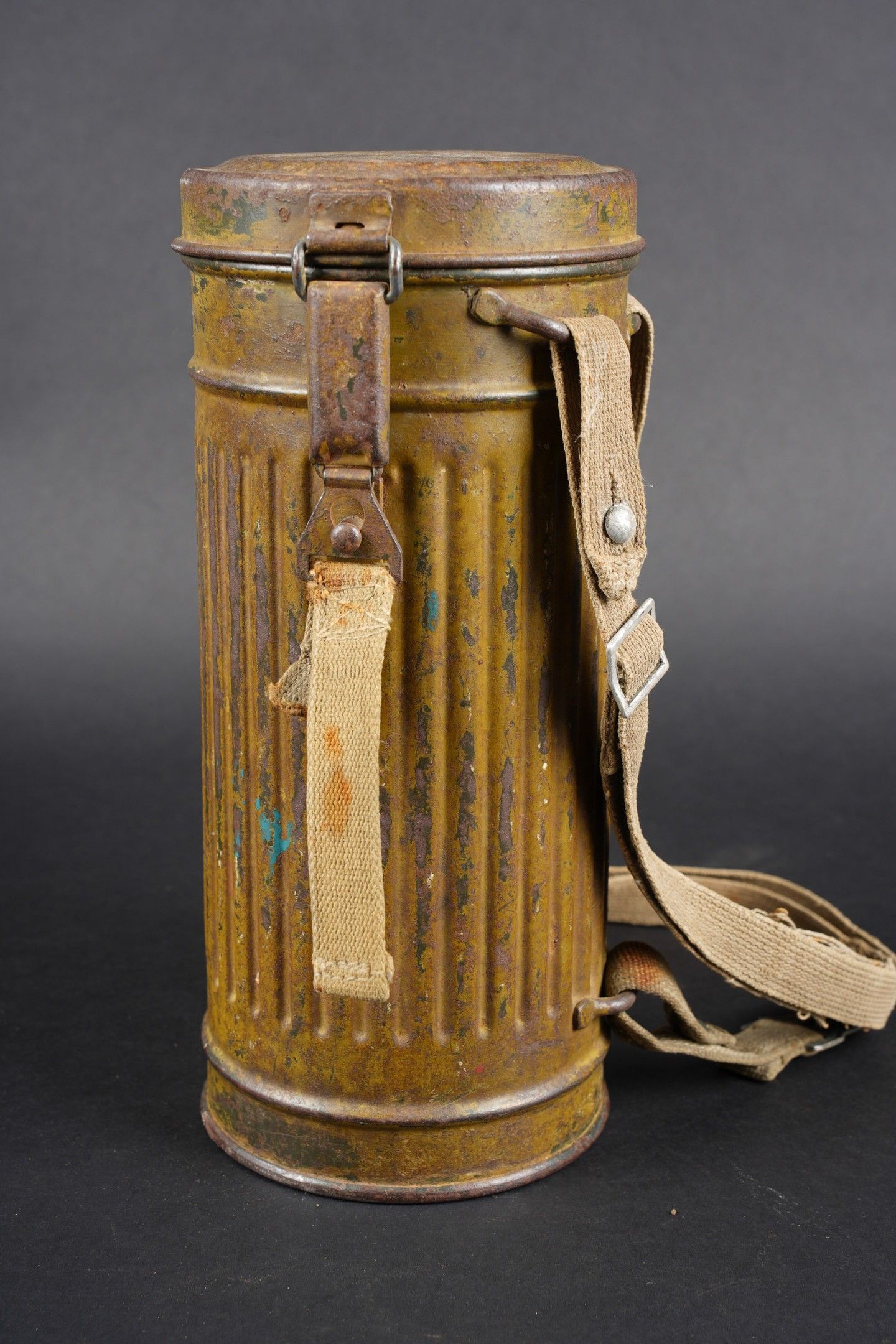 Camouflaged anti-gas mask. Long metal case. 70% sand yellow paint. All straps are present, but different models. A few visible dents throughout the case. The canvas zip has been period shortened. Illegible number painted under the lid. The spare lenses are present, as are the spider and the cloth. Canvas mask, size 2, all straps present. Nice FE 37 filter. A visible perforation on the side of the filter. Some wear and patina. Condition II+. Camouflaged gas mask Long metal canister with 70% sand-yellow paint remaining. All straps present but of mixed models. Some dents visible throughout. Pull strap shortened period-style. Number illegible, painted under the lid. Spare lenses, spider, and cleaning cloth present. Canvas mask, size 2, all straps intact. Fine FE 37 filter with one visible perforation on the side. Shows some wear and patina. Condition II+.