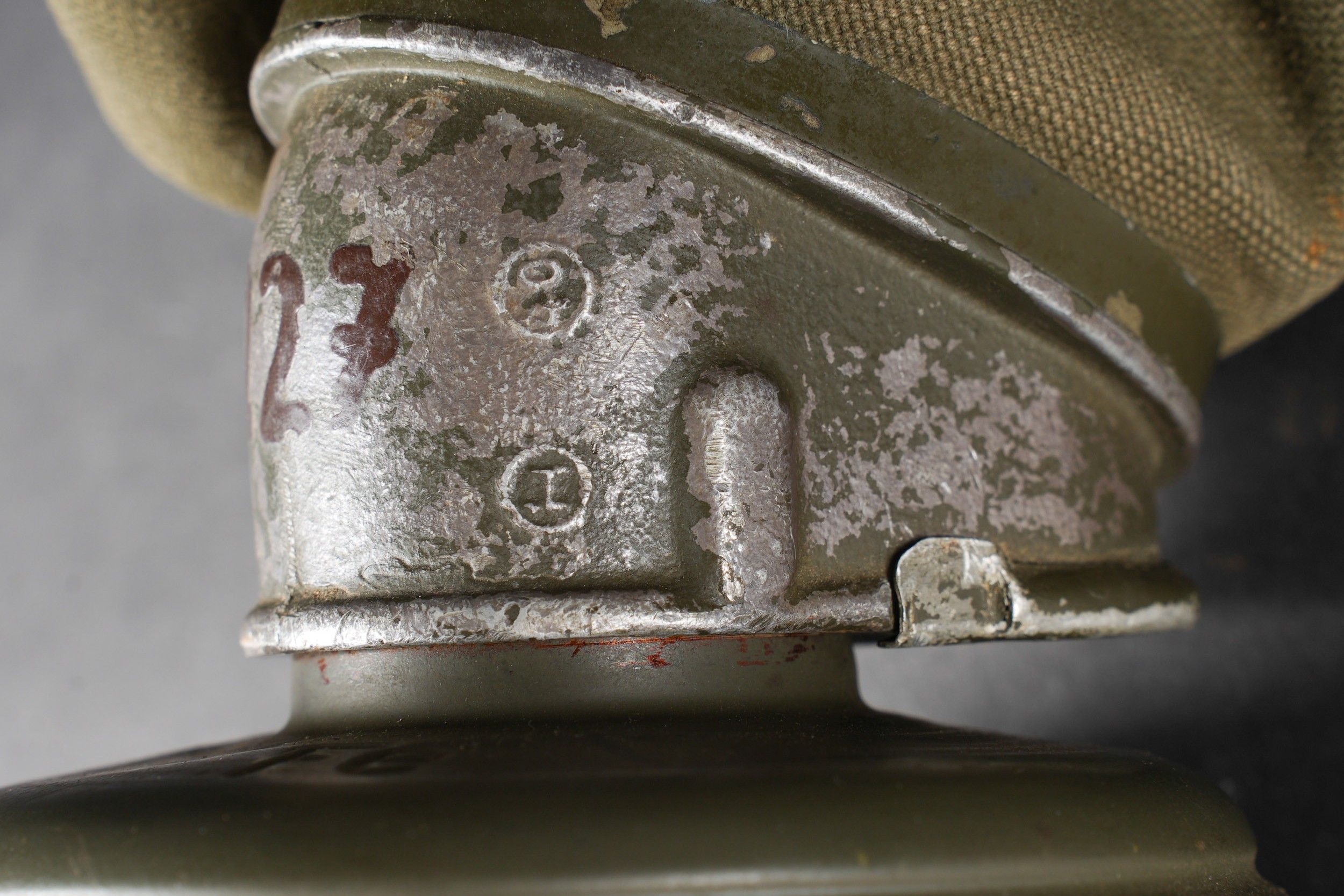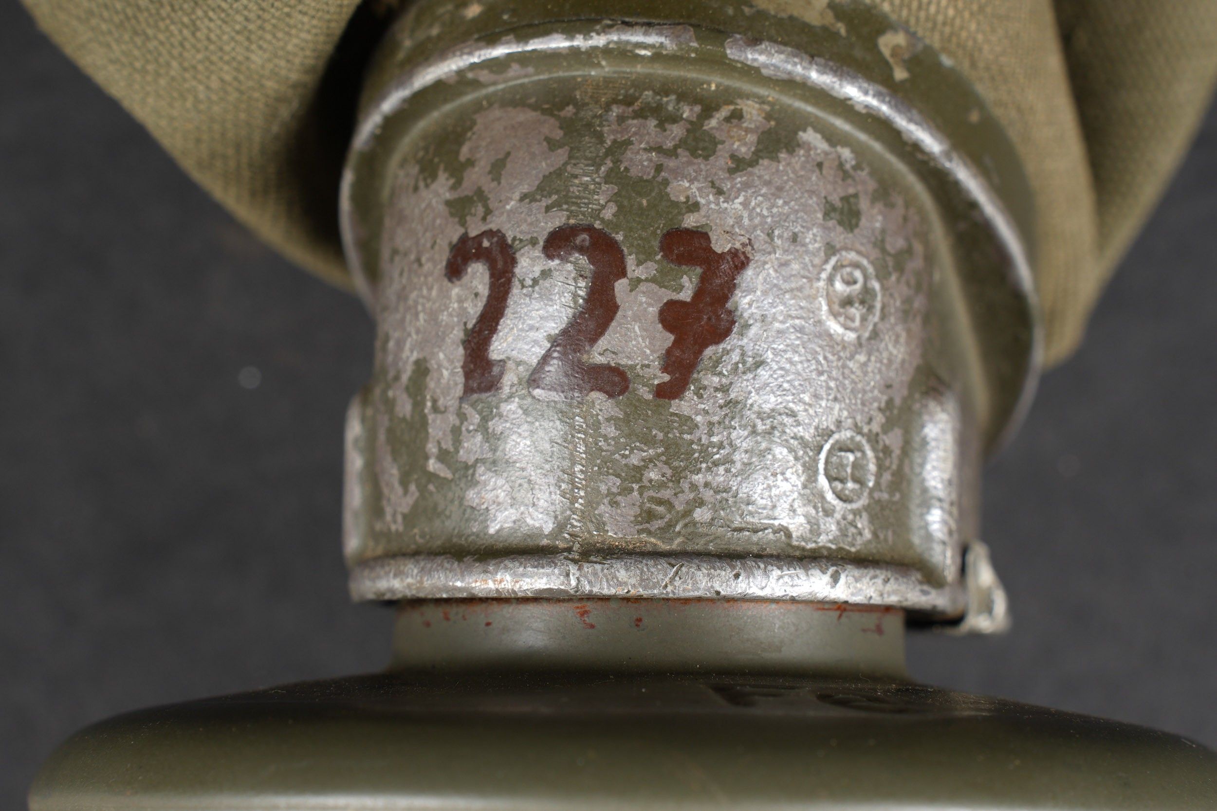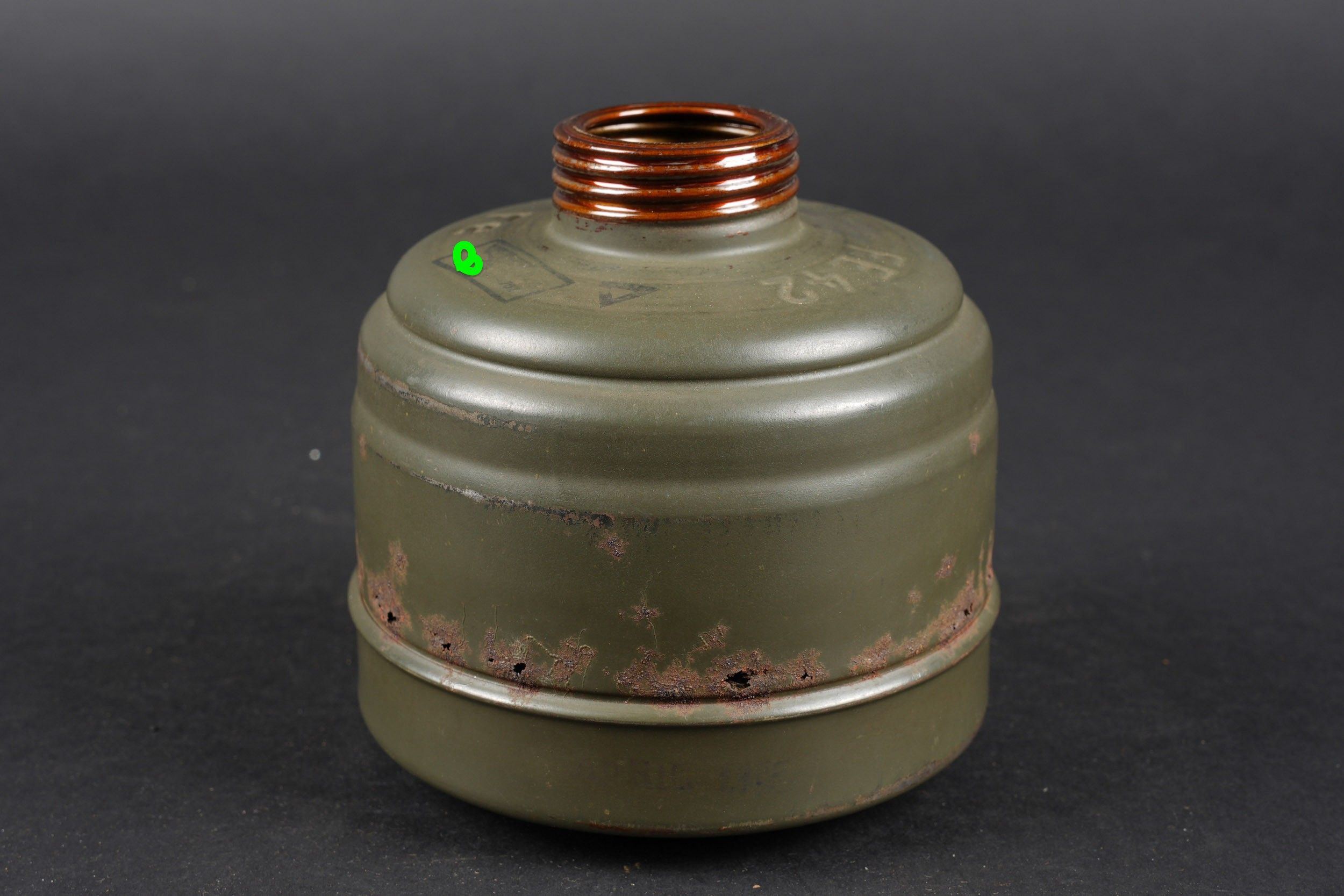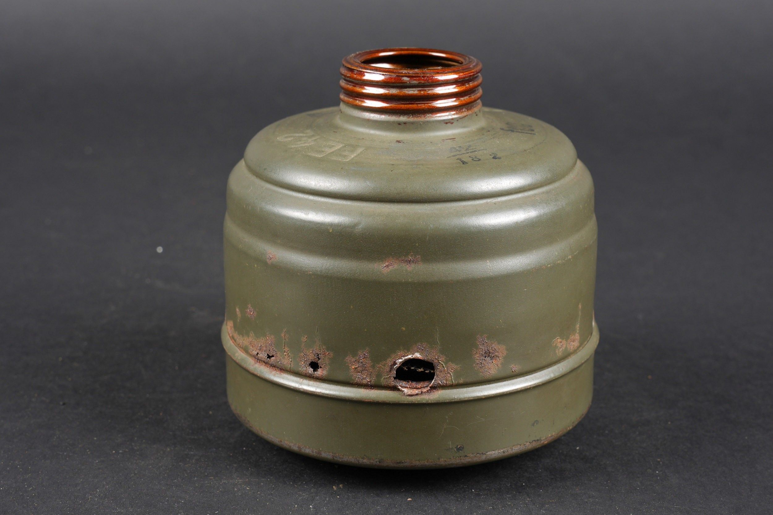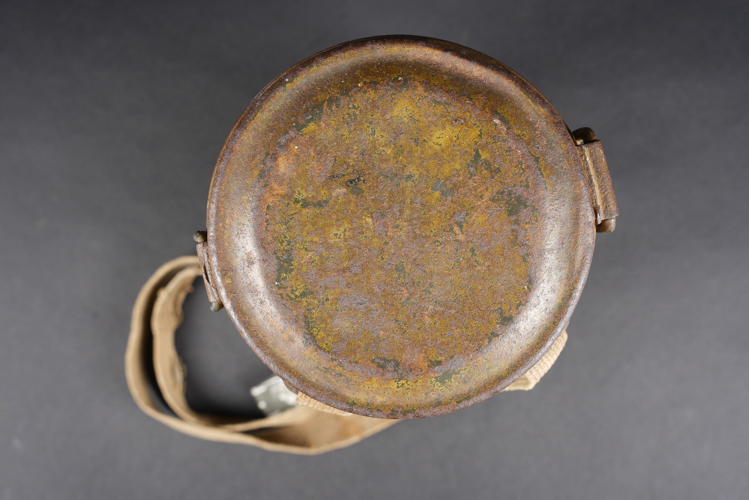 Camouflaged anti-gas mask. Long metal case. 70% sand yellow paint. All straps are present, but different models. A few visible dents throughout the case. The canvas zip has been period shortened. Illegible number painted under the lid. The spare lenses are present, as are the spider and the cloth. Canvas mask, size 2, all straps present. Nice FE 37 filter. A visible perforation on the side of the filter. Some wear and patina. Condition II+. Camouflaged gas mask Long metal canister with 70% sand-yellow paint remaining. All straps present but of mixed models. Some dents visible throughout. Pull strap shortened period-style. Number illegible, painted under the lid. Spare lenses, spider, and cleaning cloth present. Canvas mask, size 2, all straps intact. Fine FE 37 filter with one visible perforation on the side. Shows some wear and patina. Condition II+.