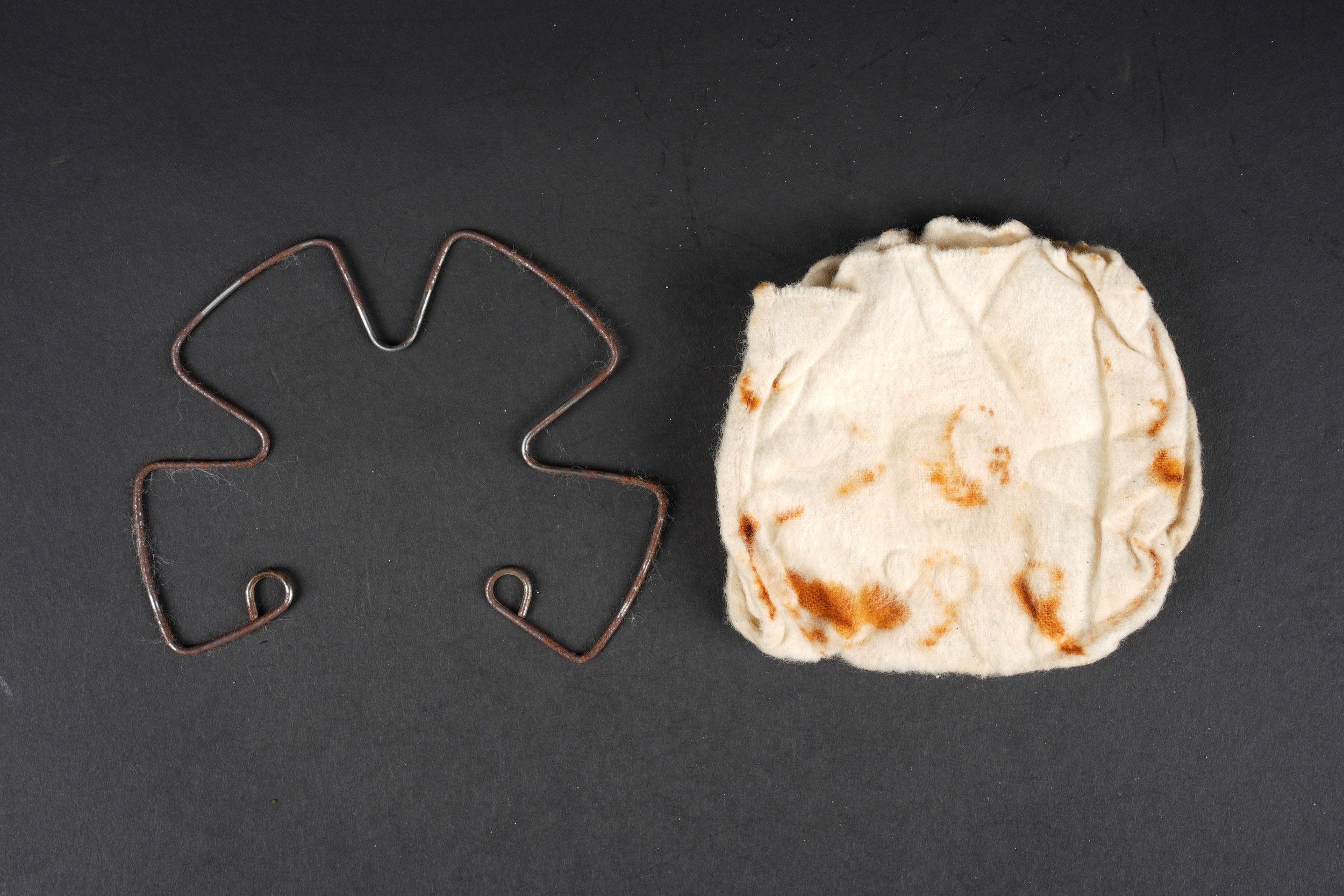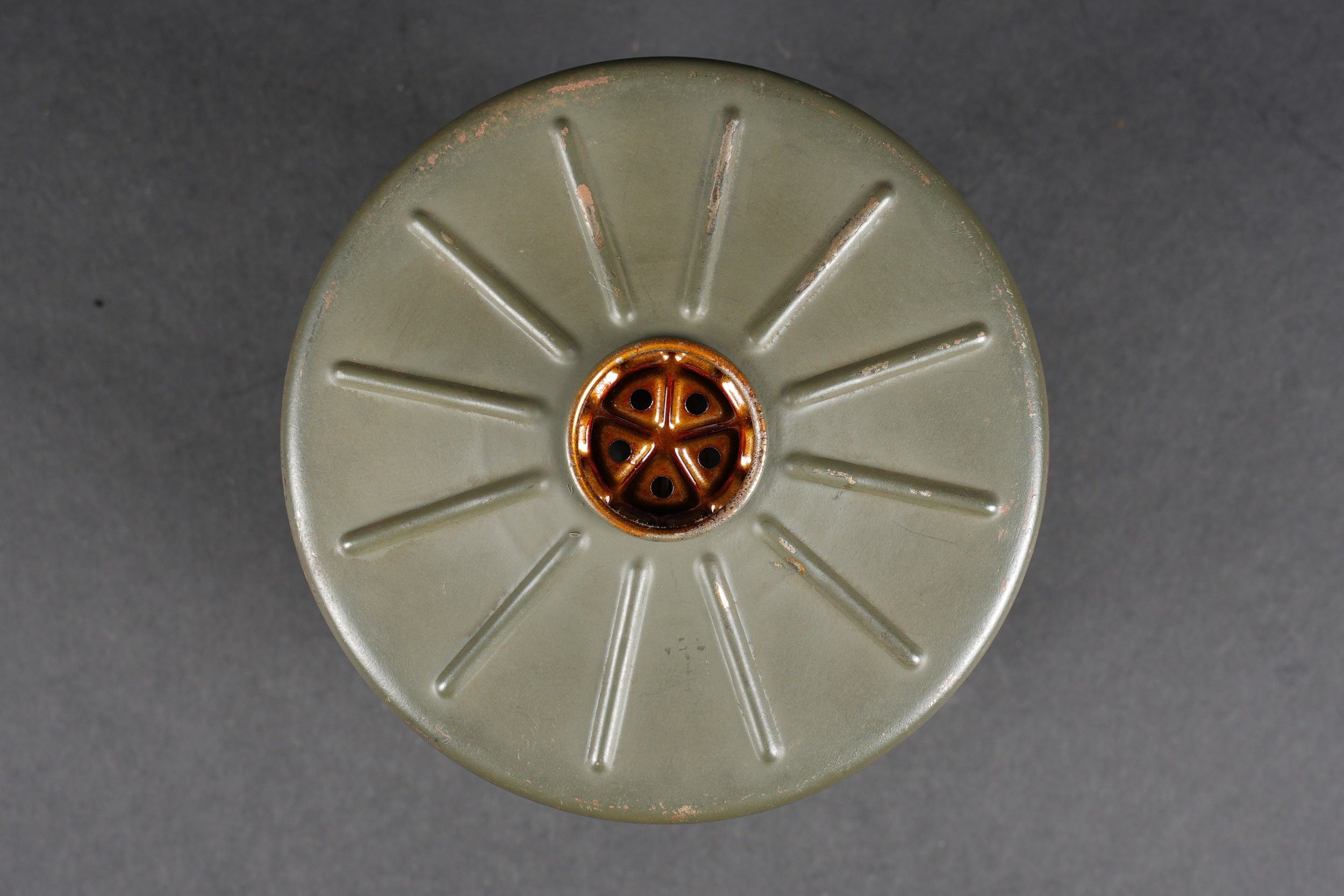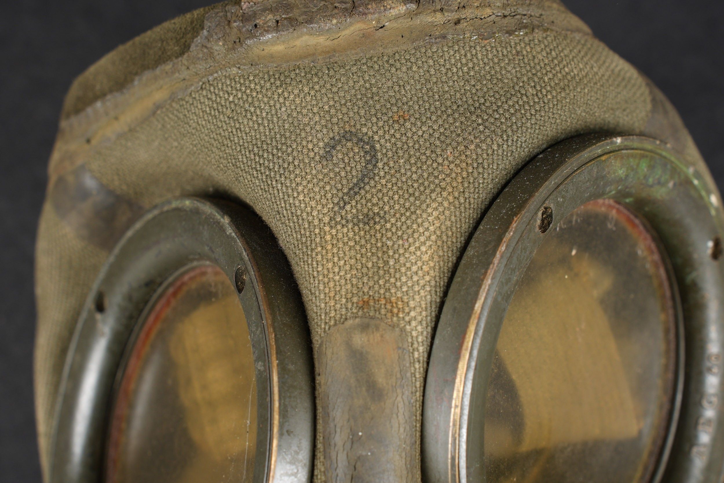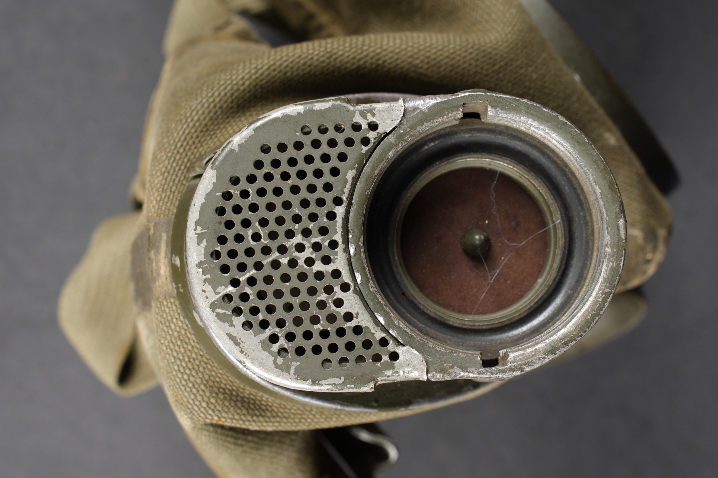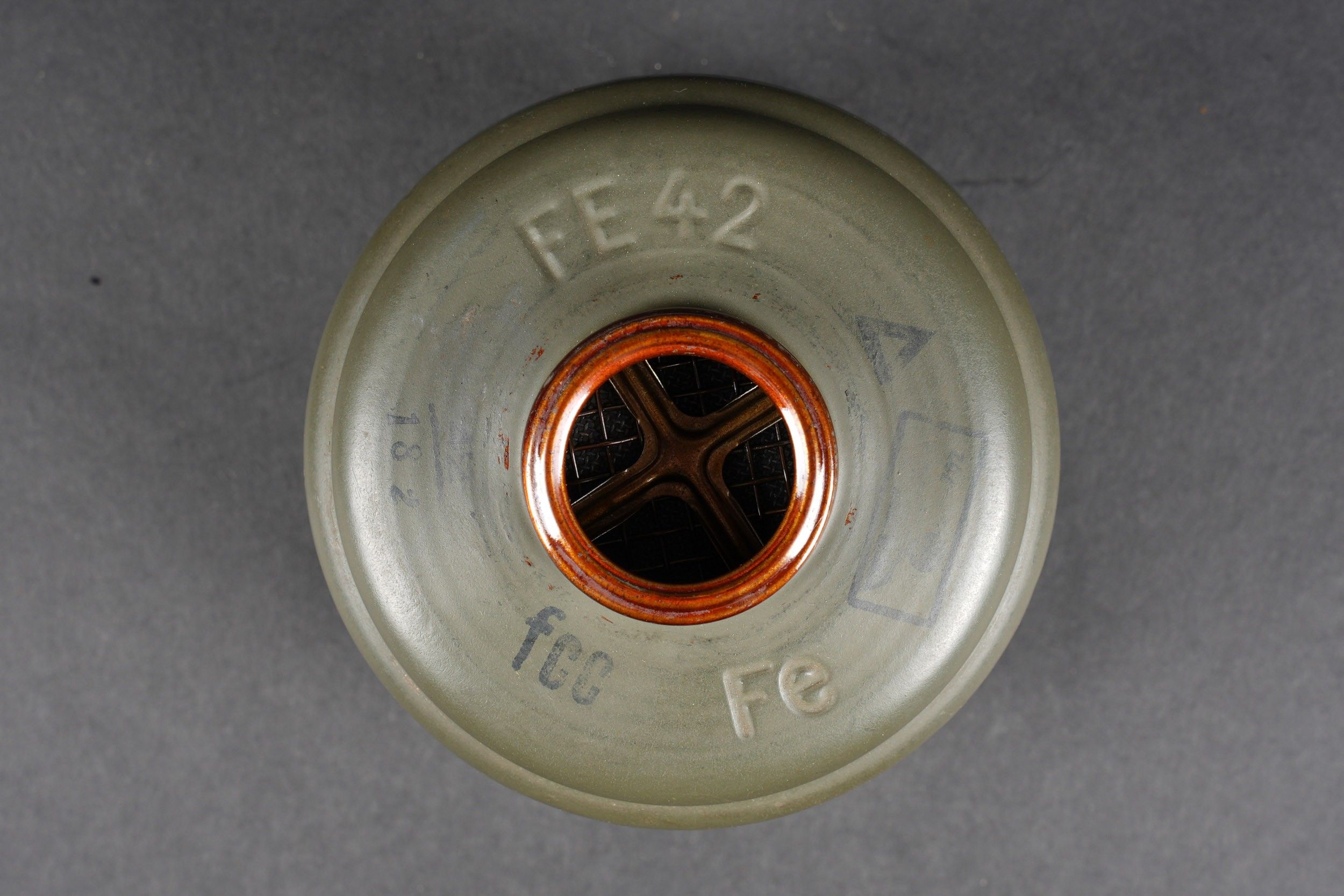 Camouflaged anti-gas mask. Long metal case. 70% sand yellow paint. All straps are present, but different models. A few visible dents throughout the case. The canvas zip has been period shortened. Illegible number painted under the lid. The spare lenses are present, as are the spider and the cloth. Canvas mask, size 2, all straps present. Nice FE 37 filter. A visible perforation on the side of the filter. Some wear and patina. Condition II+. Camouflaged gas mask Long metal canister with 70% sand-yellow paint remaining. All straps present but of mixed models. Some dents visible throughout. Pull strap shortened period-style. Number illegible, painted under the lid. Spare lenses, spider, and cleaning cloth present. Canvas mask, size 2, all straps intact. Fine FE 37 filter with one visible perforation on the side. Shows some wear and patina. Condition II+.