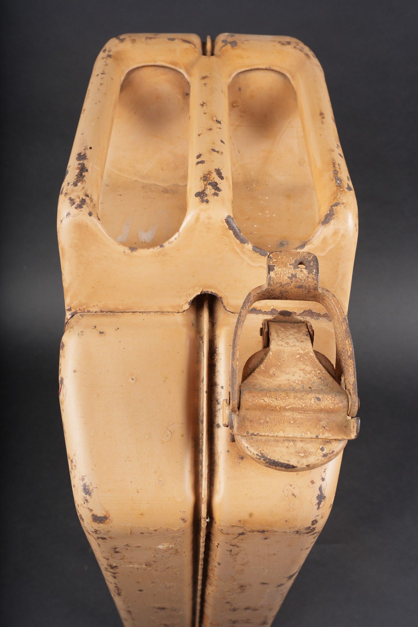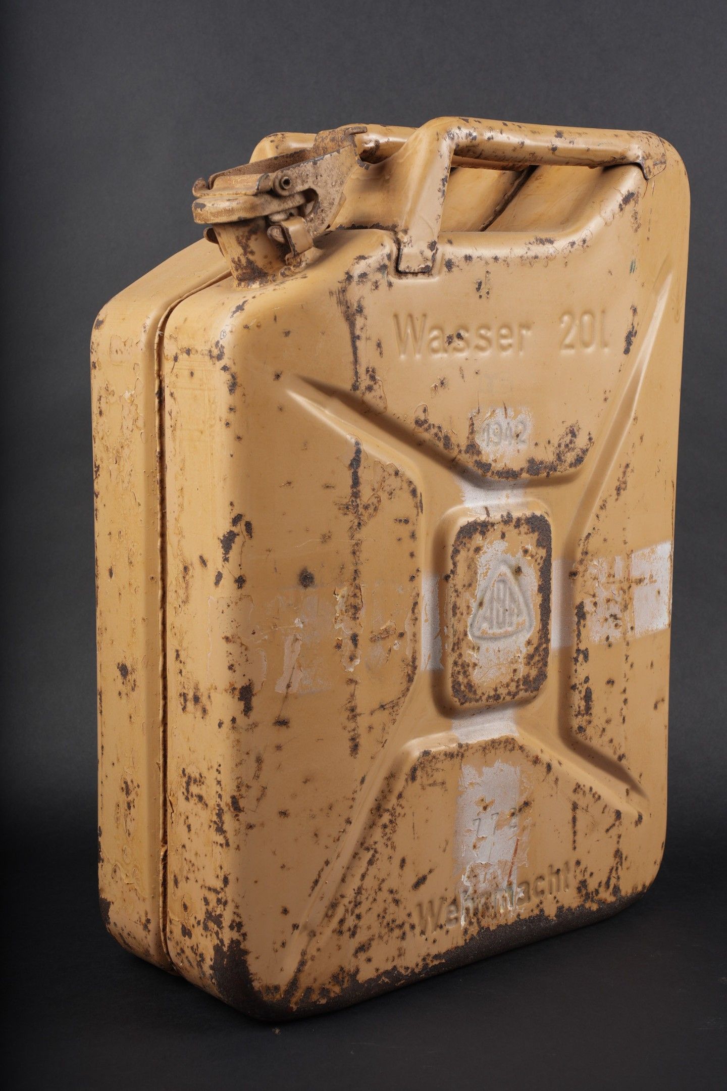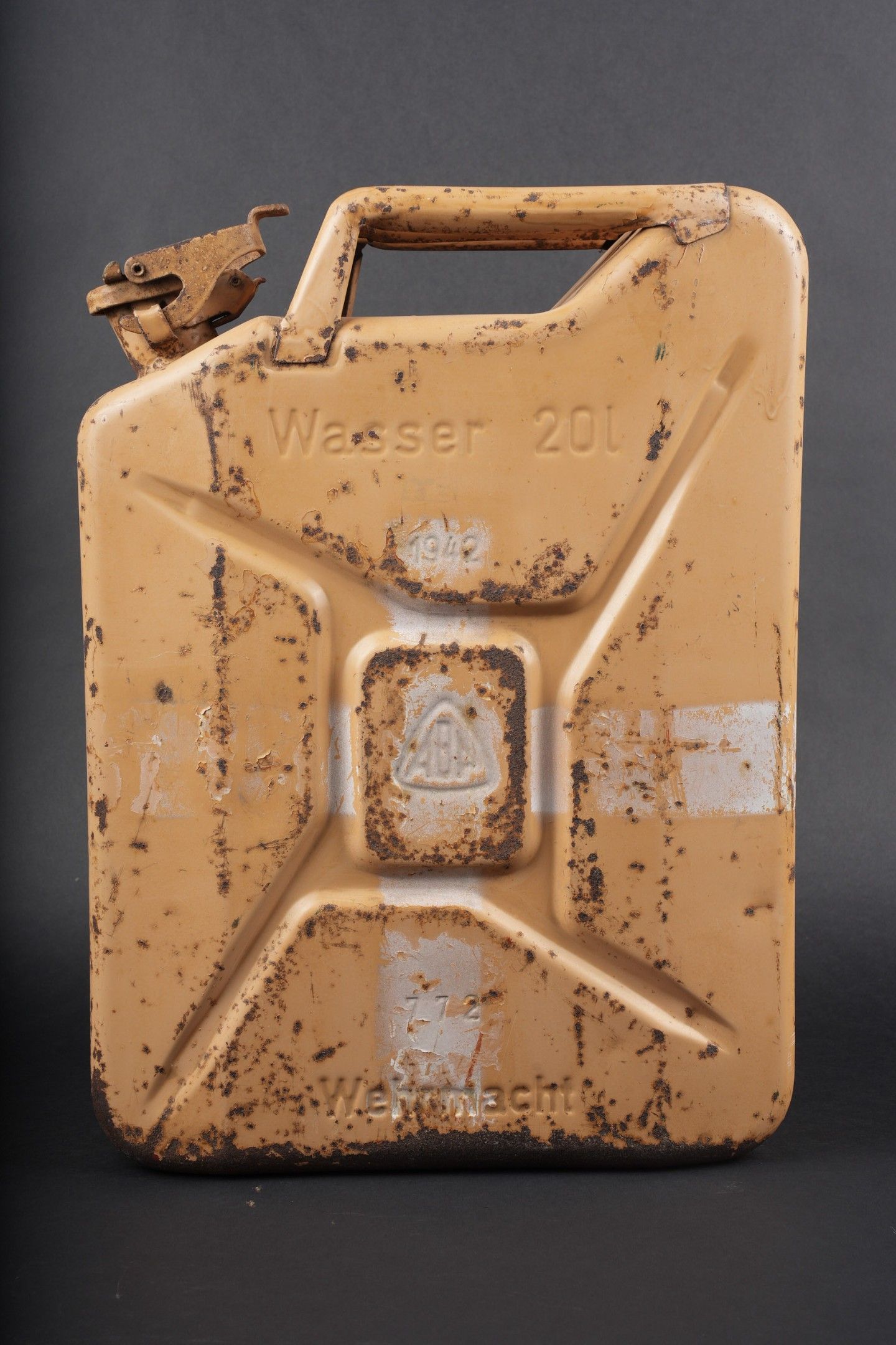 Jerrycan Wasser. Made of metal. 80% sandy yellow paint. Beautiful white cross on both sides of the jerrycan. Complete and functional cap. Markings Wasser 20L 1942 ABA 772 Wehrmacht. Some wear and oxidation. Condition II+. Jerrycan Wasser Metal body with 80% sand-yellow paint remaining. White cross painted on both sides. Cap complete and functional. Marked Wasser 20L 1942 ABA 772 Wehrmacht. Shows wear and oxidation. Condition II+.