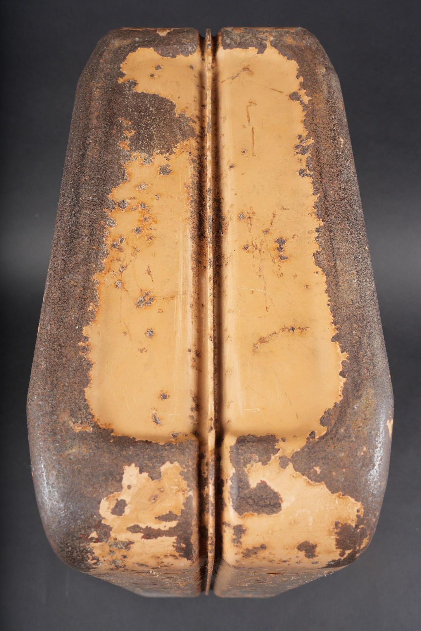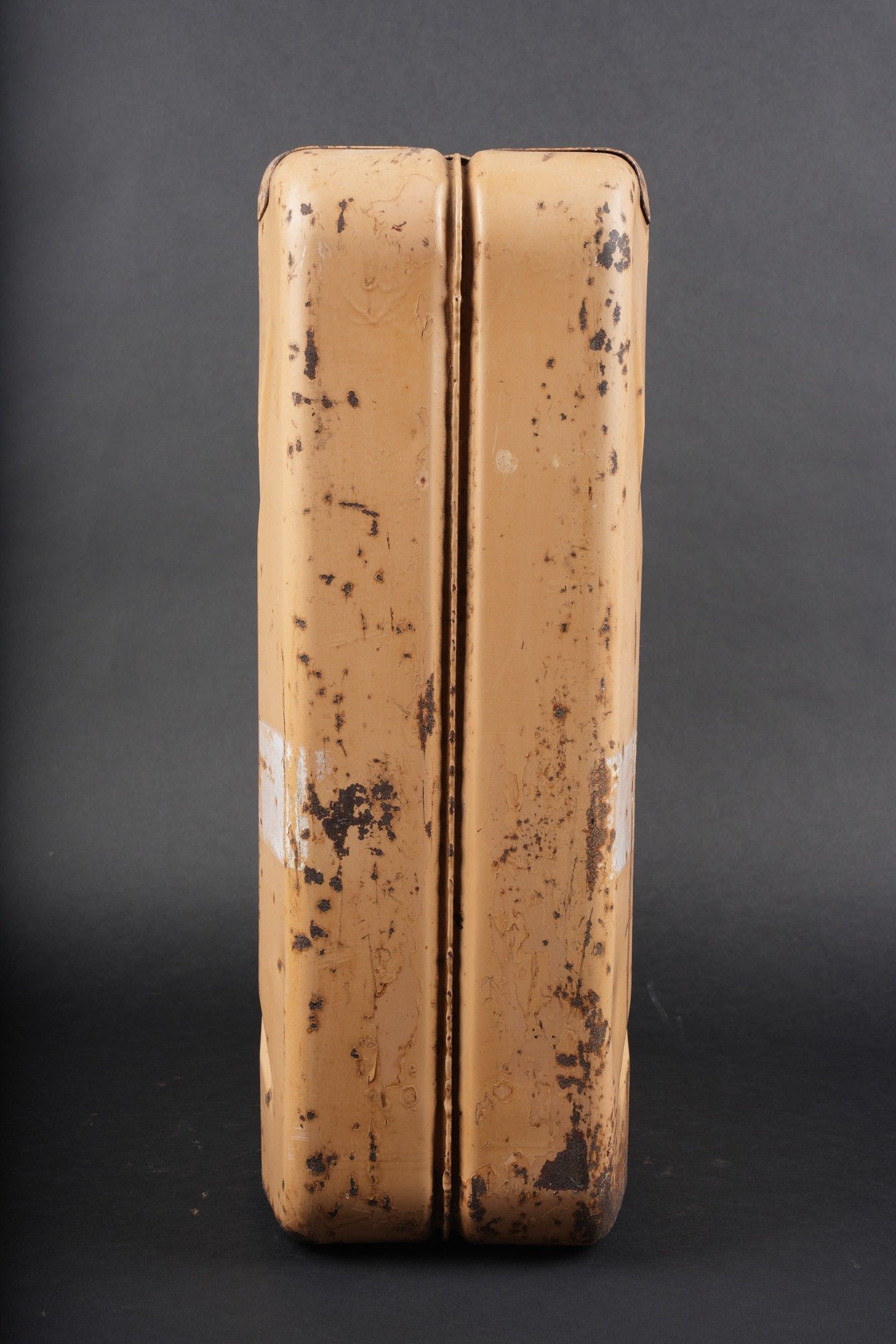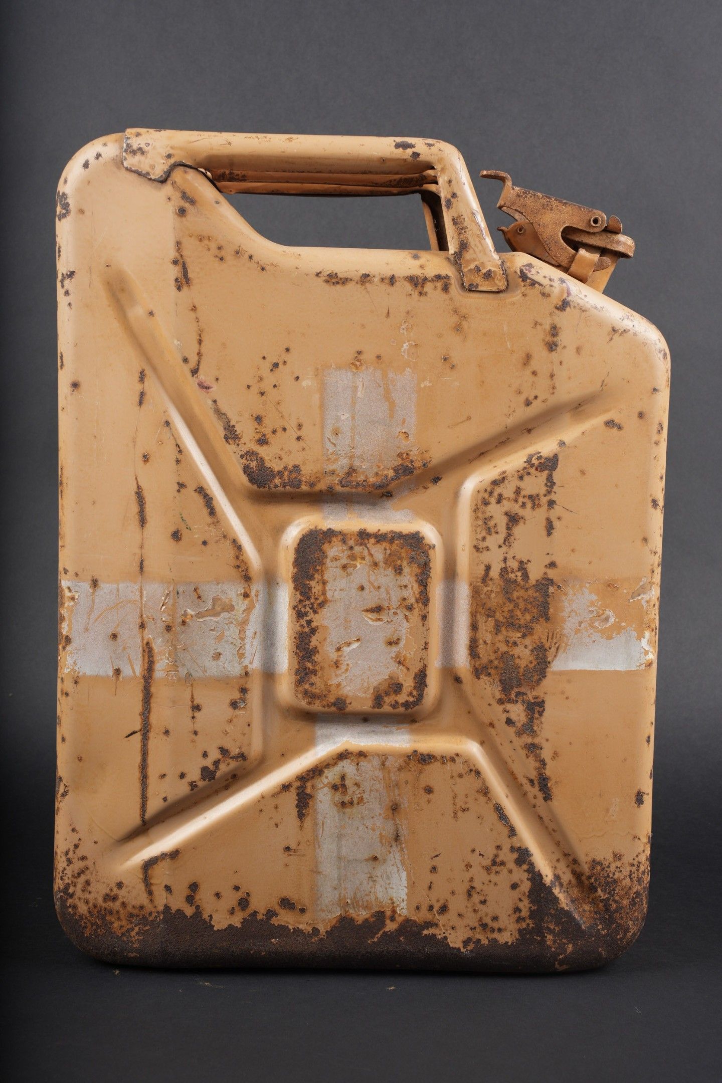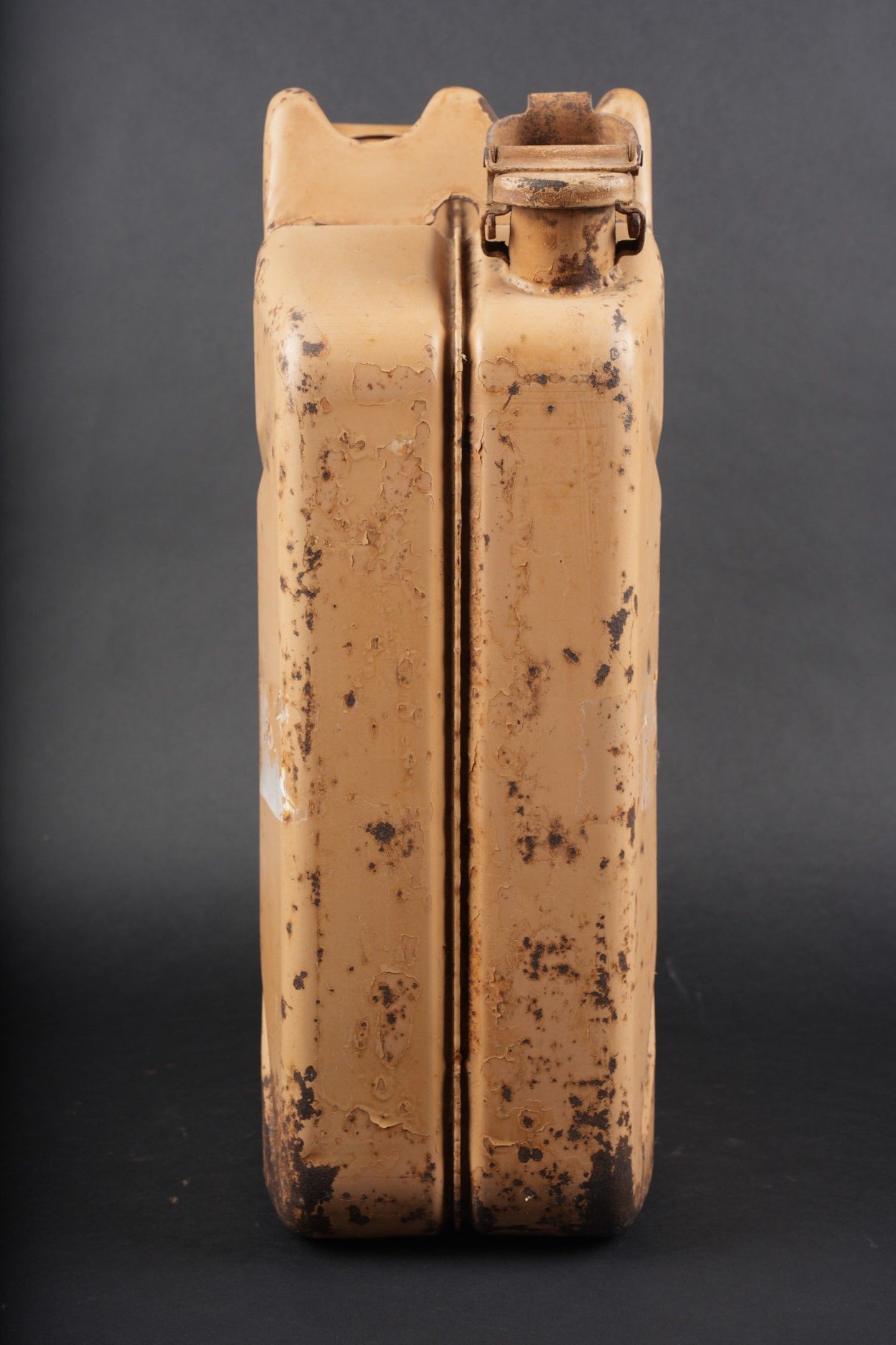 Jerrycan Wasser. Made of metal. 80% sandy yellow paint. Beautiful white cross on both sides of the jerrycan. Complete and functional cap. Markings Wasser 20L 1942 ABA 772 Wehrmacht. Some wear and oxidation. Condition II+. Jerrycan Wasser Metal body with 80% sand-yellow paint remaining. White cross painted on both sides. Cap complete and functional. Marked Wasser 20L 1942 ABA 772 Wehrmacht. Shows wear and oxidation. Condition II+.