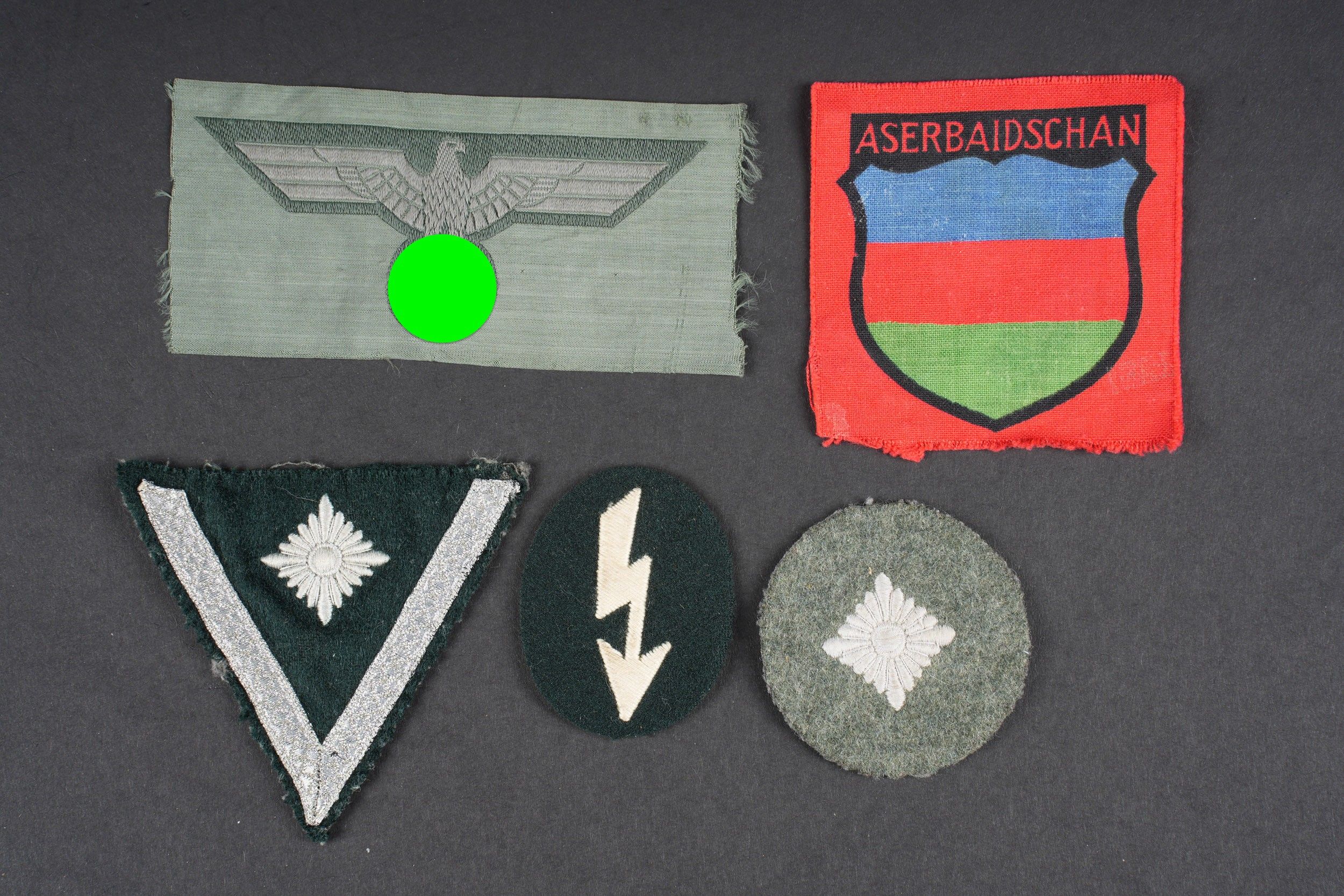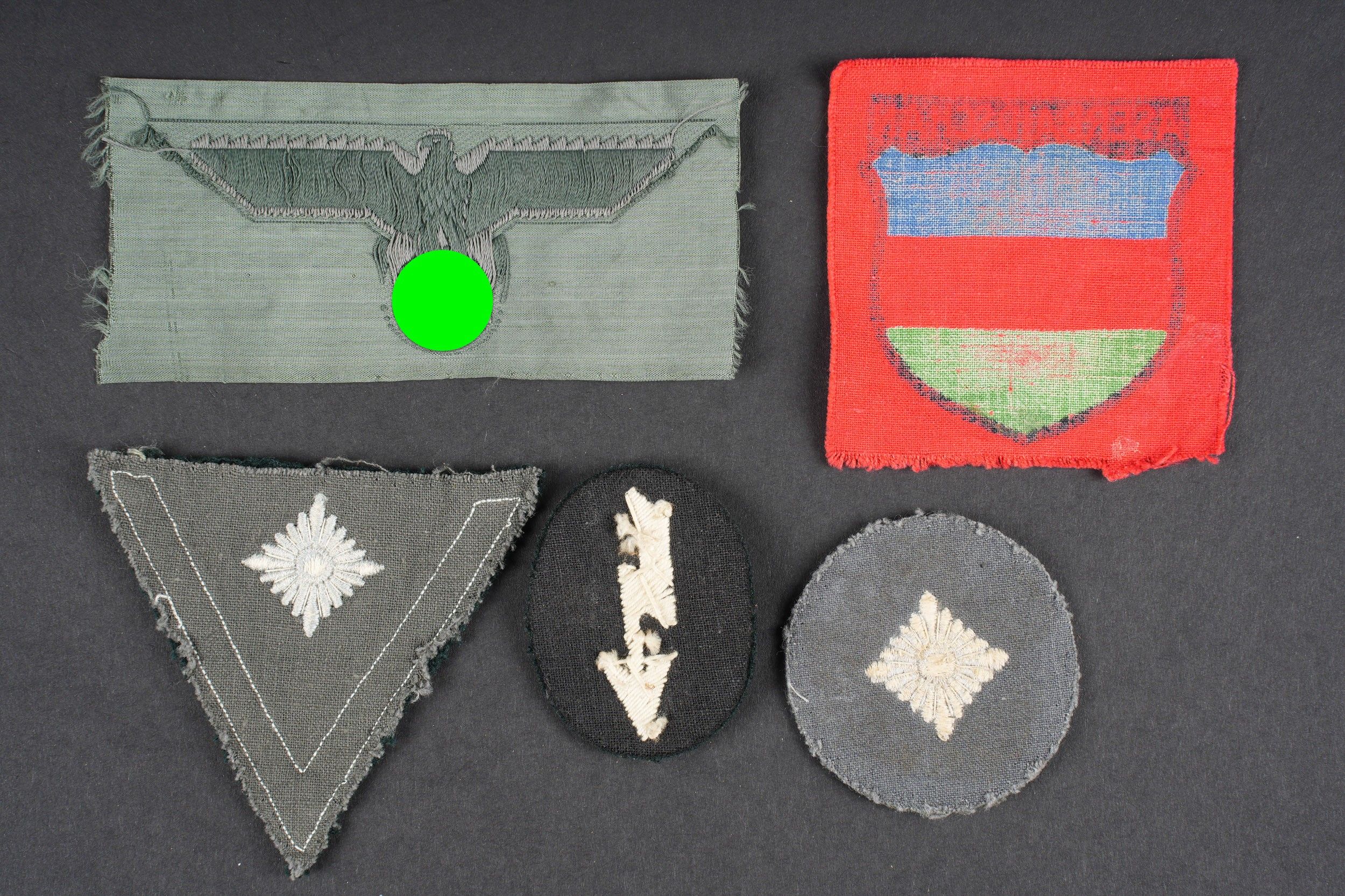 German insignia. Comprising an Aserbaidschan sleeve badge, printed, never mounted. A Bevo chest eagle, never mounted. An Obersoldat sleeve rank, on a Feldgrau background. An infantry radio communications speciality badge. A Gefreiter sleeve rank with 6 months service, visibly removed from a jacket. Some wear and patina to parts. Condition II+. German insignia. Set including an embroidered Azerbaijan sleeve shield, never mounted, one Bevo-woven breast eagle, never mounted, one Obersoldat rank chevron on Feldgrau backing, one infantry radio operator specialty patch, and one Gefreiter rank chevron for six months' service, apparently removed from a tunic. Showing light wear and patina. Condition II+.