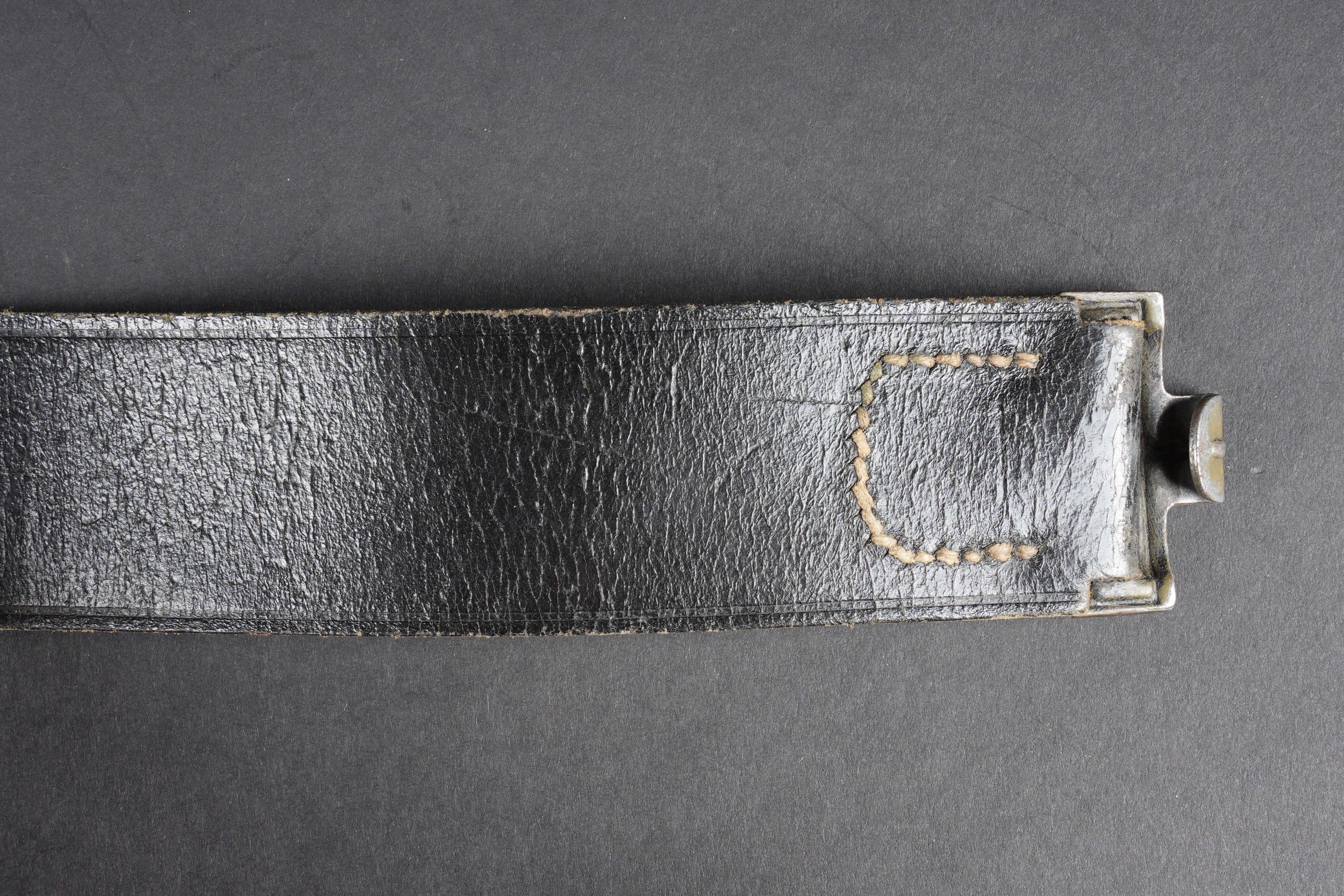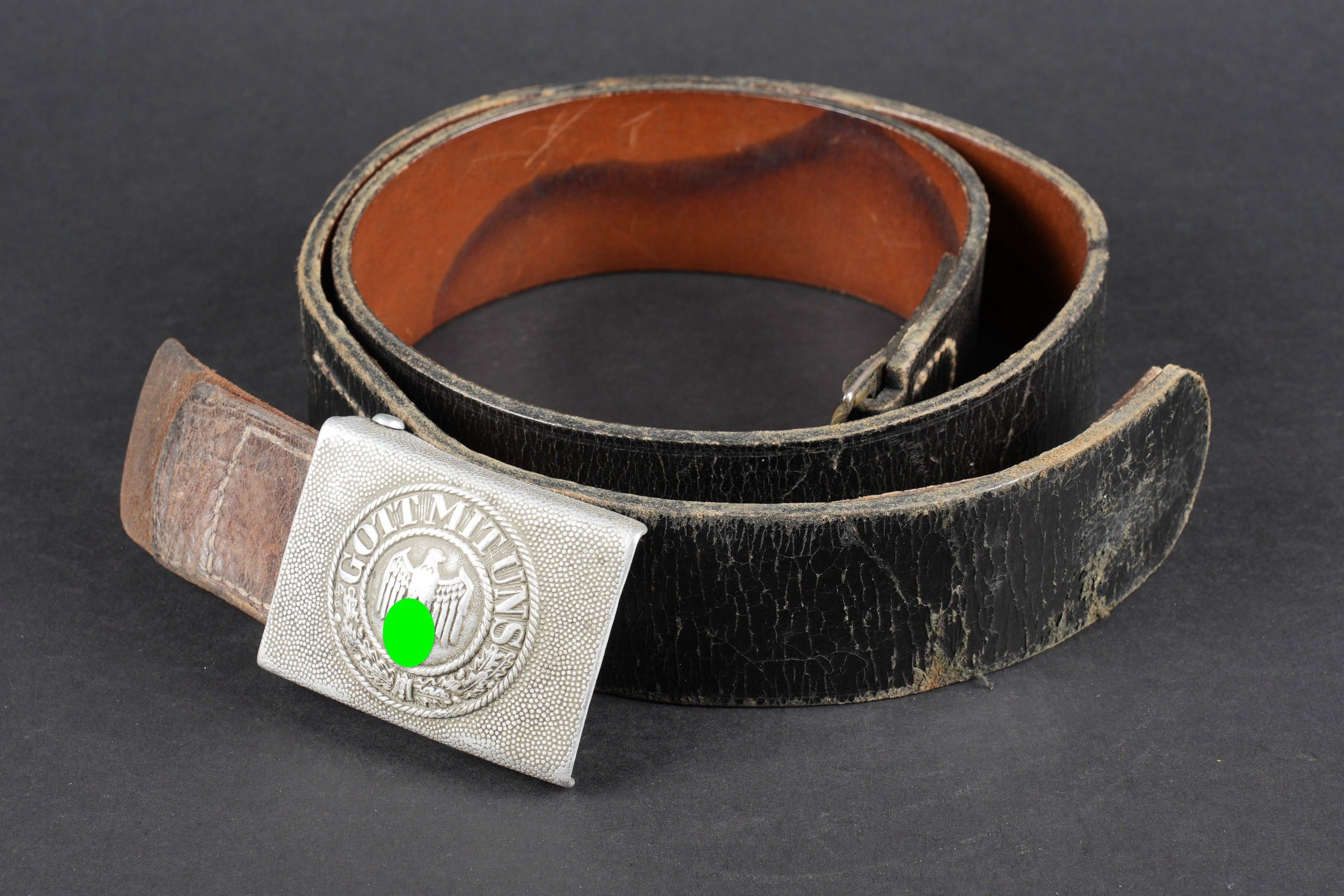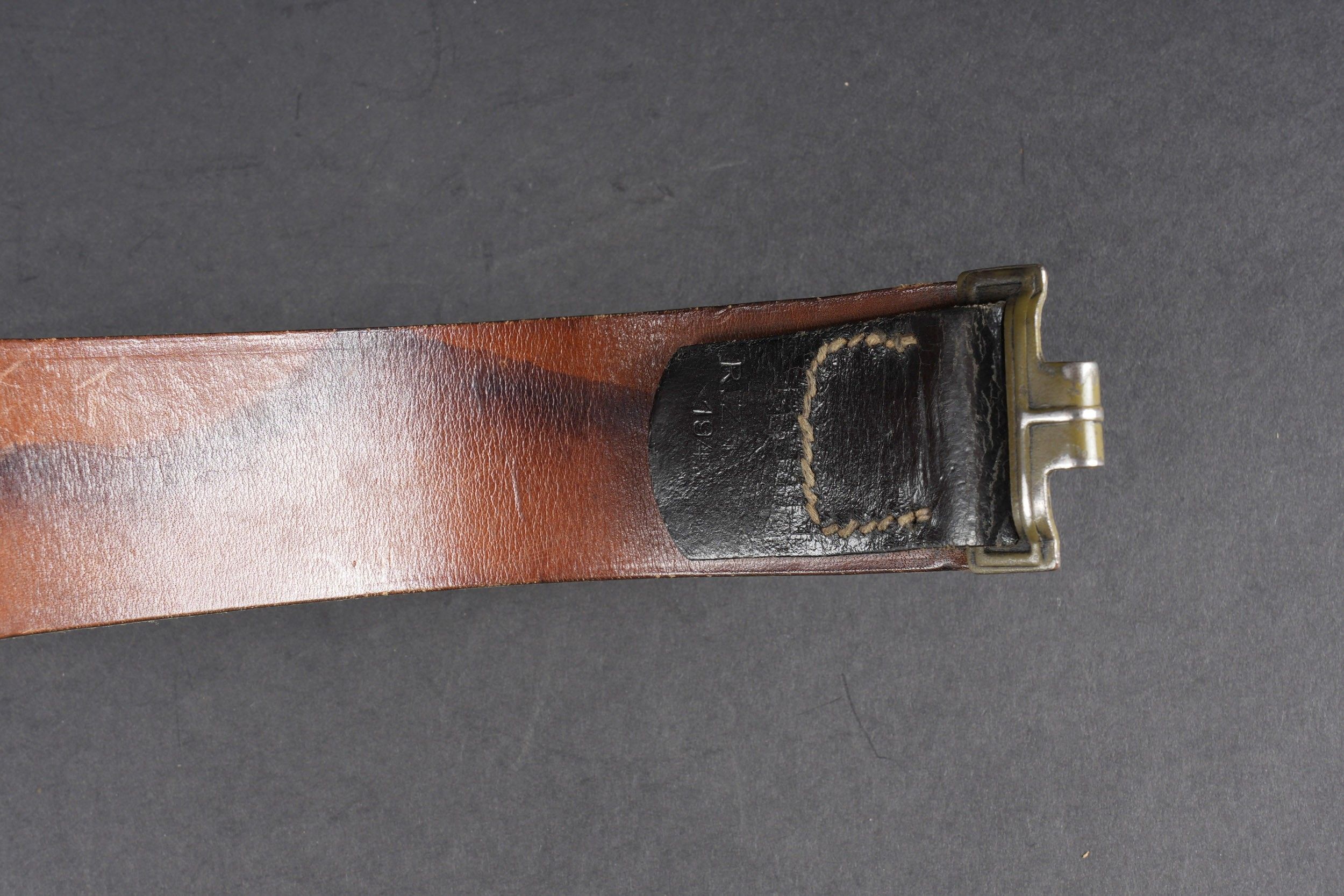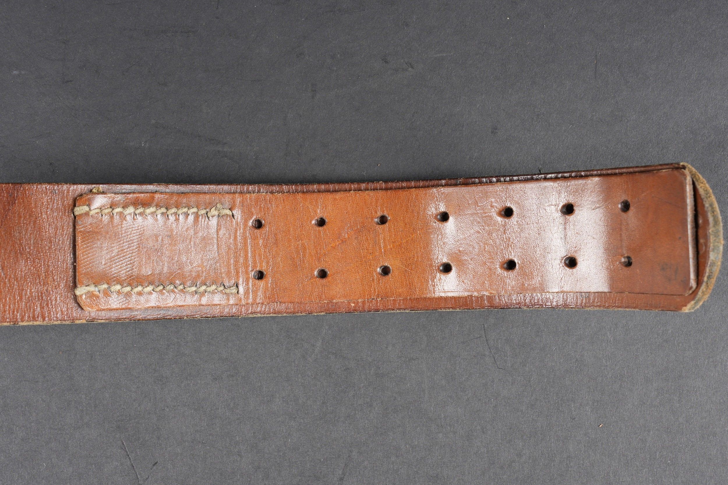 Heer belt. Black leather belt. Metal buckle in its original colour (70%). Made by RZ 1942. Size 85. The adjustment tab is complete. Belt buckle in grained aluminium, 20% Feldgrau paint residue. No visible markings. Leather strap dated 1939. Some wear and patina. Condition II+. Heer belt. Black leather belt with metal buckle retaining about 70% of original finish. Maker marked RZ 1942. Size 85. Adjustment tab complete. Aluminum pebbled buckle with traces of Feldgrau paint 20%, unmarked. Leather tab dated 1939. Showing moderate wear and patina. Condition II+.