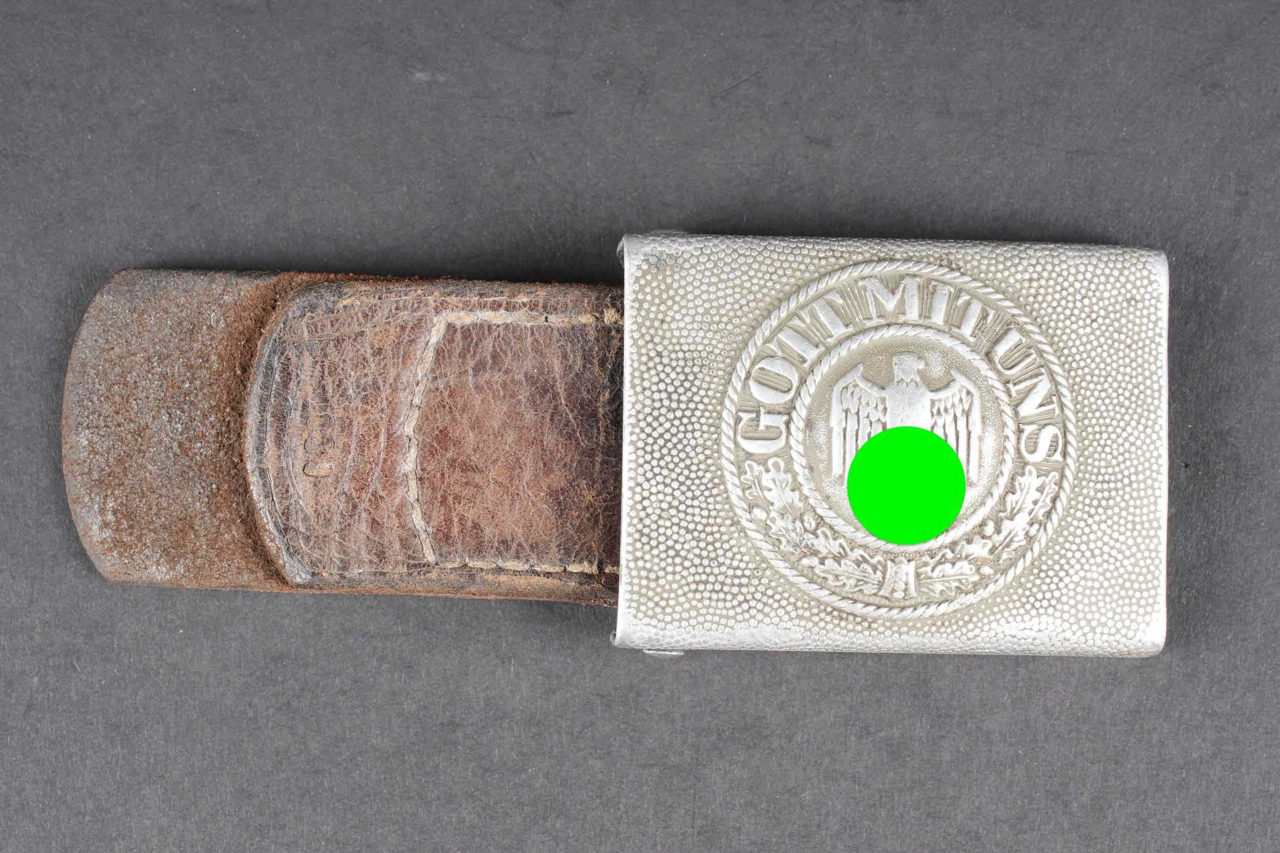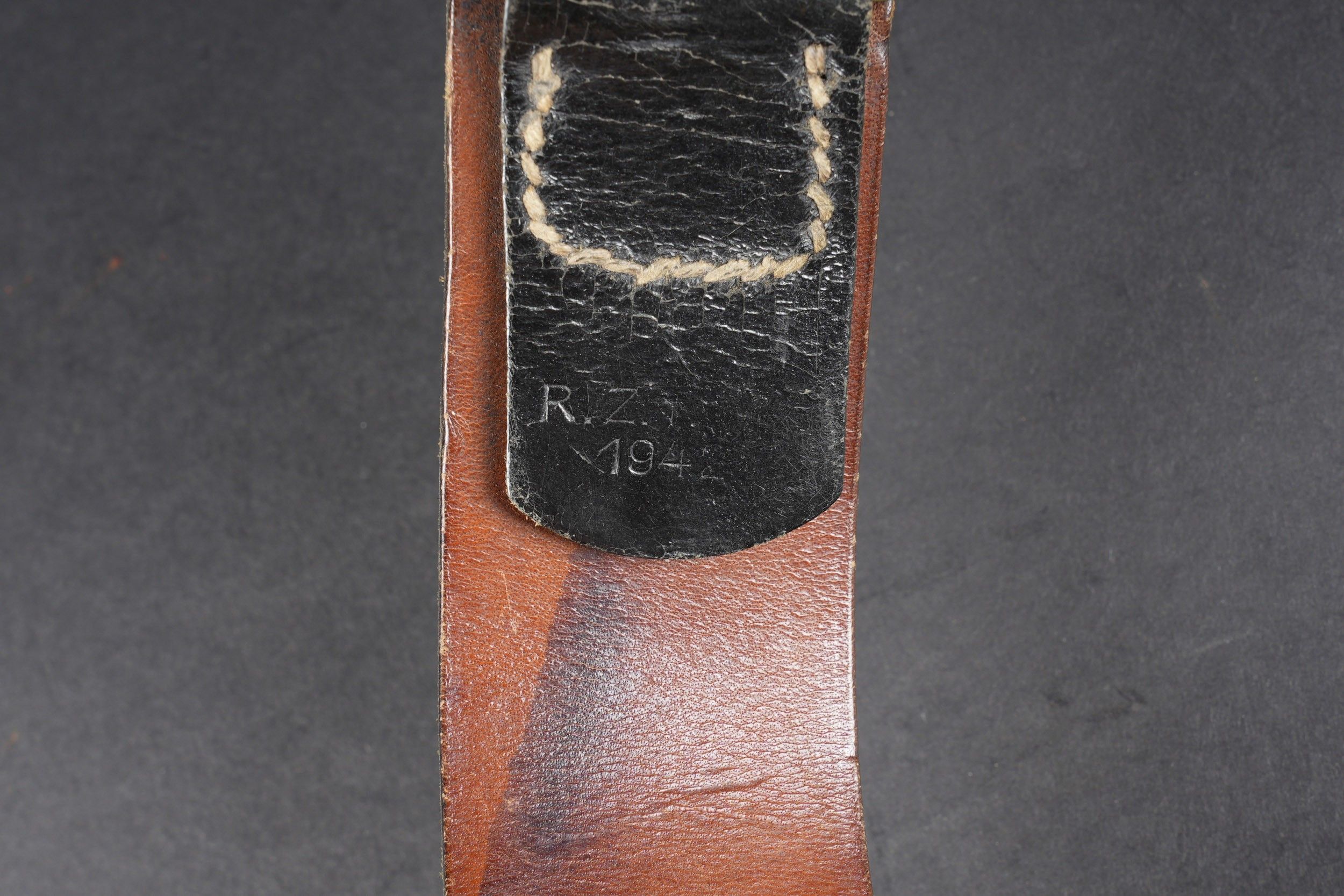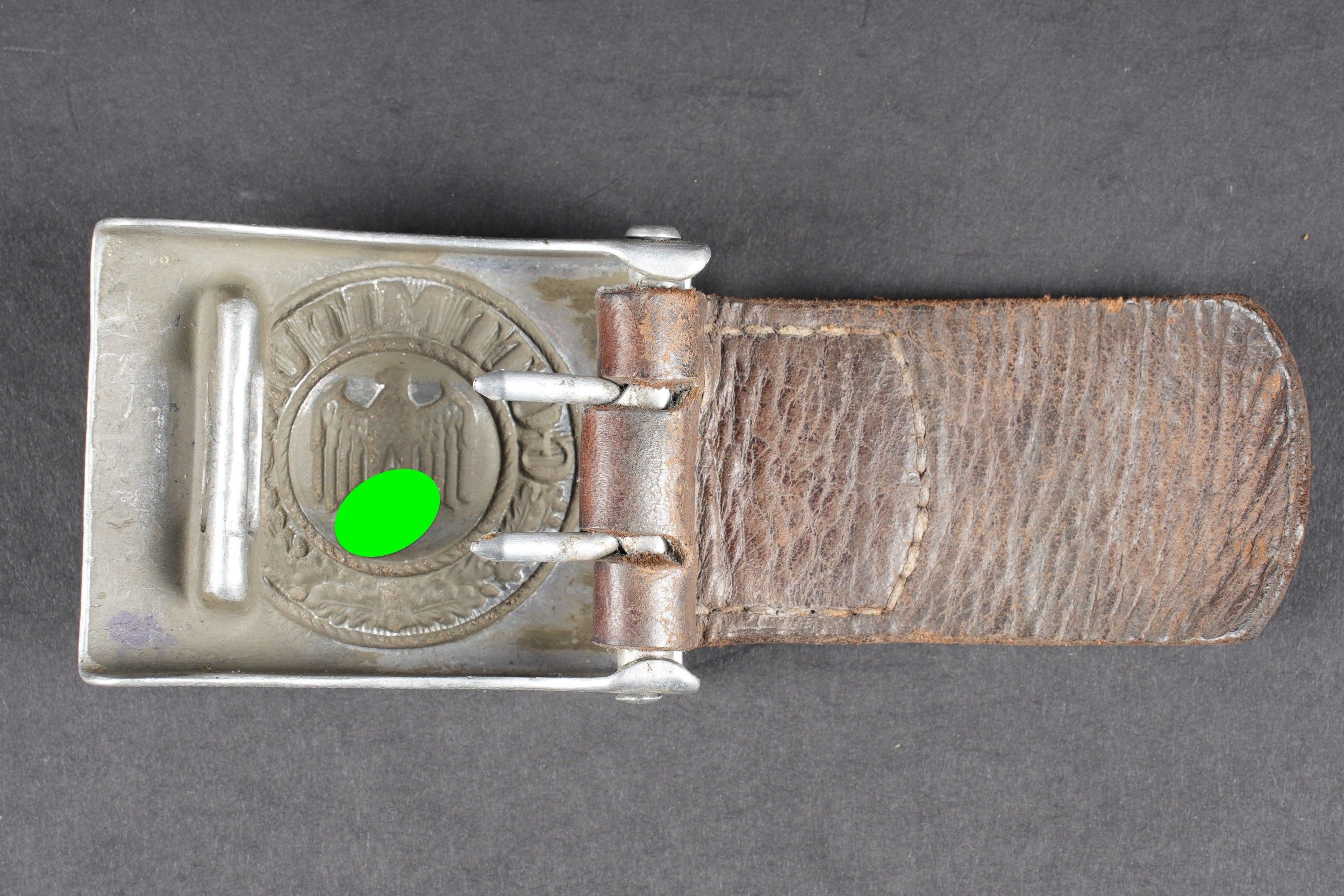 Heer belt. Black leather belt. Metal buckle in its original colour (70%). Made by RZ 1942. Size 85. The adjustment tab is complete. Belt buckle in grained aluminium, 20% Feldgrau paint residue. No visible markings. Leather strap dated 1939. Some wear and patina. Condition II+. Heer belt. Black leather belt with metal buckle retaining about 70% of original finish. Maker marked RZ 1942. Size 85. Adjustment tab complete. Aluminum pebbled buckle with traces of Feldgrau paint 20%, unmarked. Leather tab dated 1939. Showing moderate wear and patina. Condition II+.