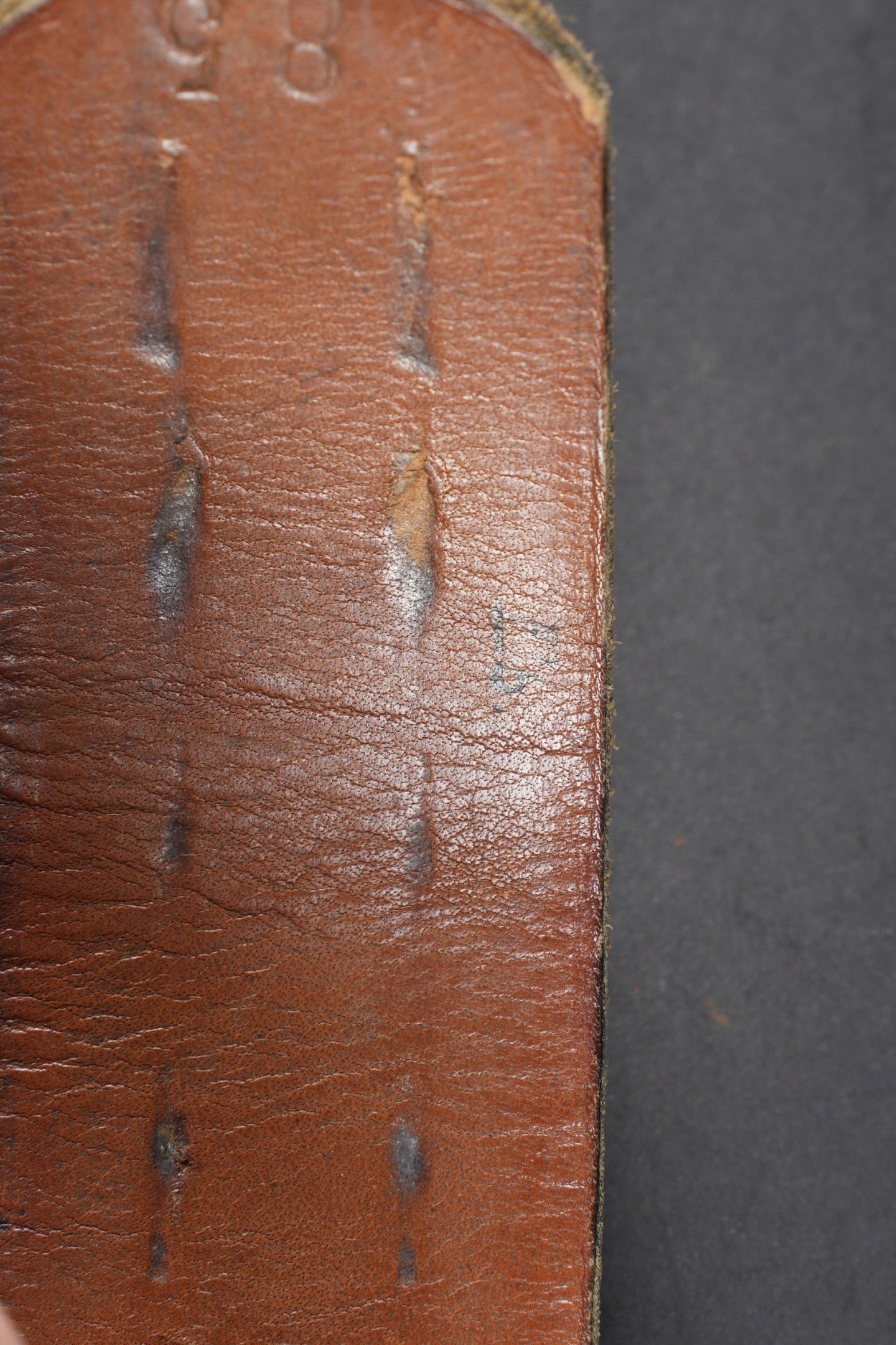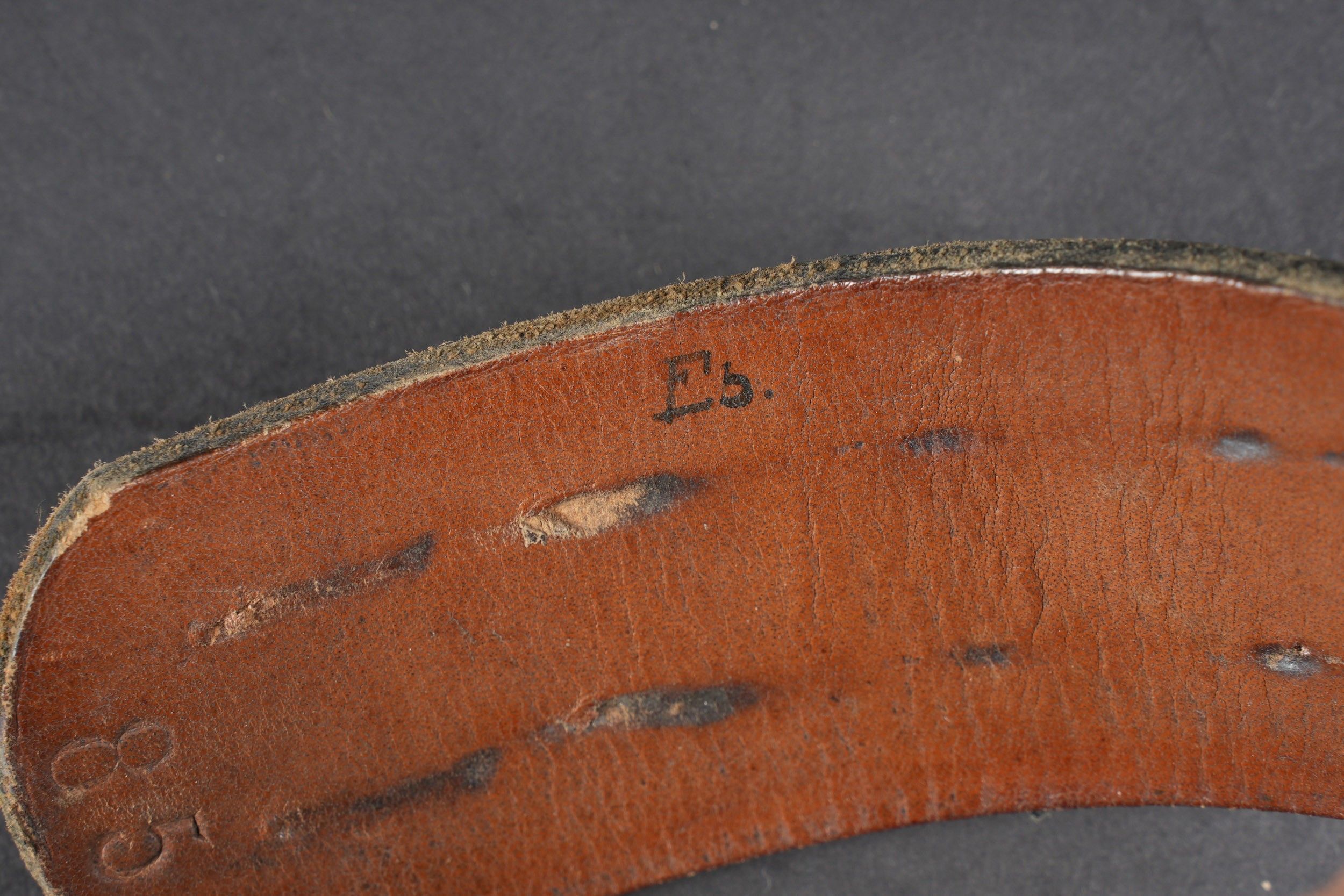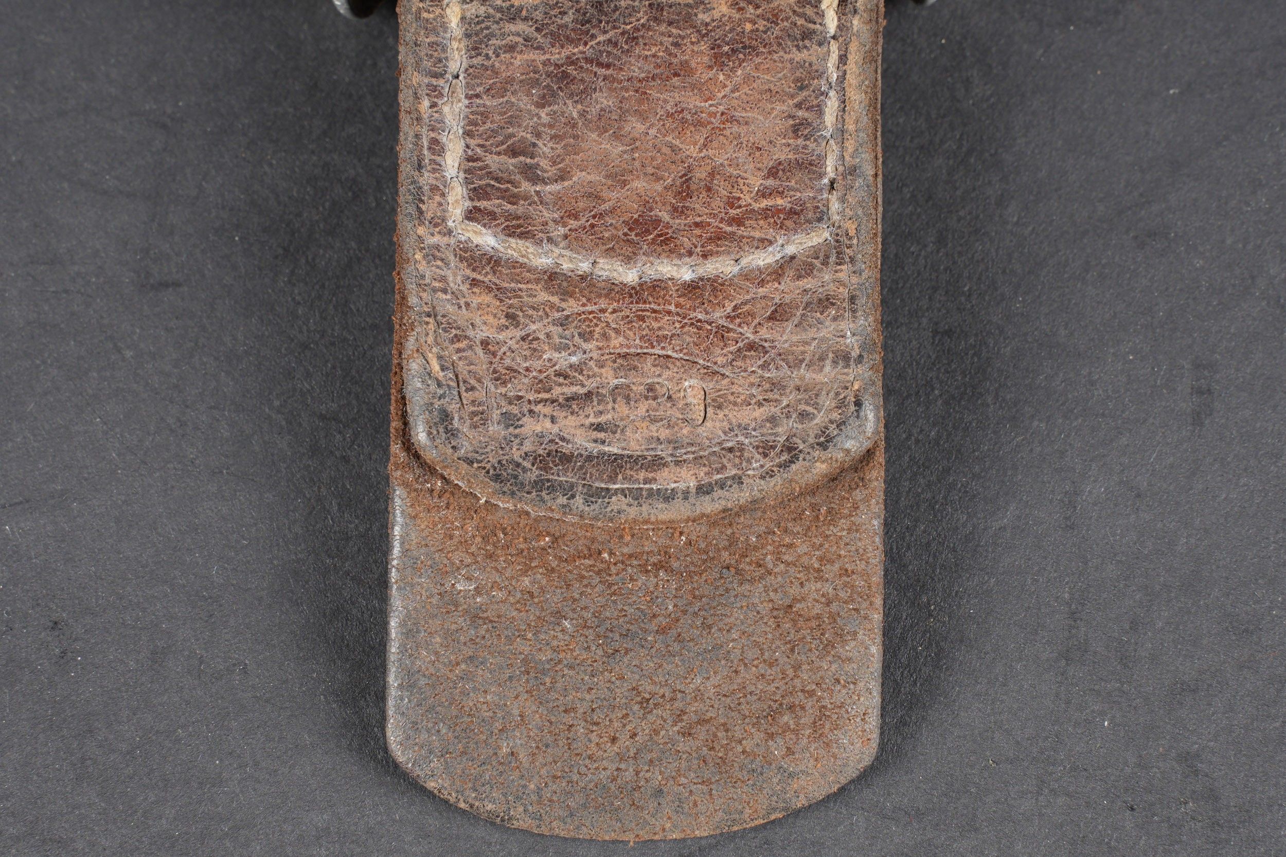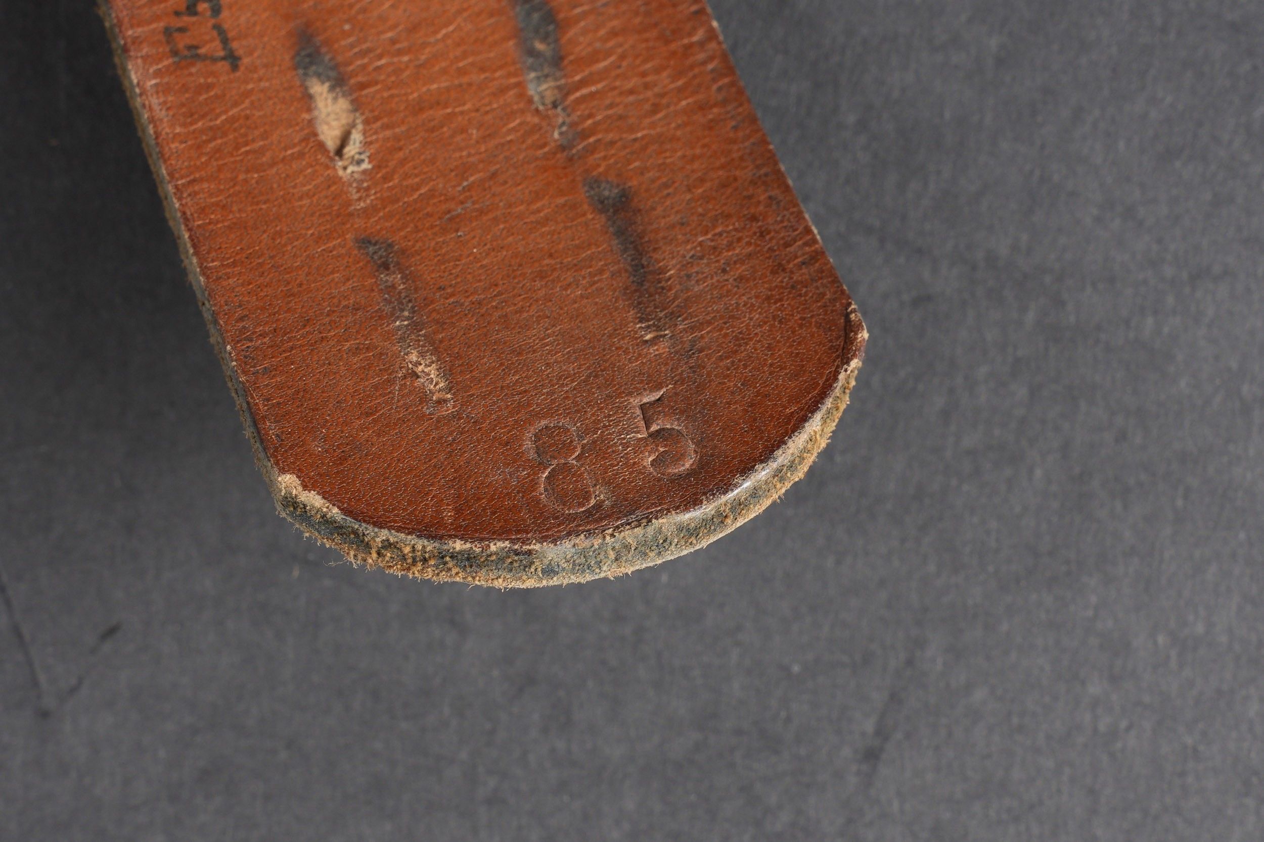 Heer belt. Black leather belt. Metal buckle in its original colour (70%). Made by RZ 1942. Size 85. The adjustment tab is complete. Belt buckle in grained aluminium, 20% Feldgrau paint residue. No visible markings. Leather strap dated 1939. Some wear and patina. Condition II+. Heer belt. Black leather belt with metal buckle retaining about 70% of original finish. Maker marked RZ 1942. Size 85. Adjustment tab complete. Aluminum pebbled buckle with traces of Feldgrau paint 20%, unmarked. Leather tab dated 1939. Showing moderate wear and patina. Condition II+.