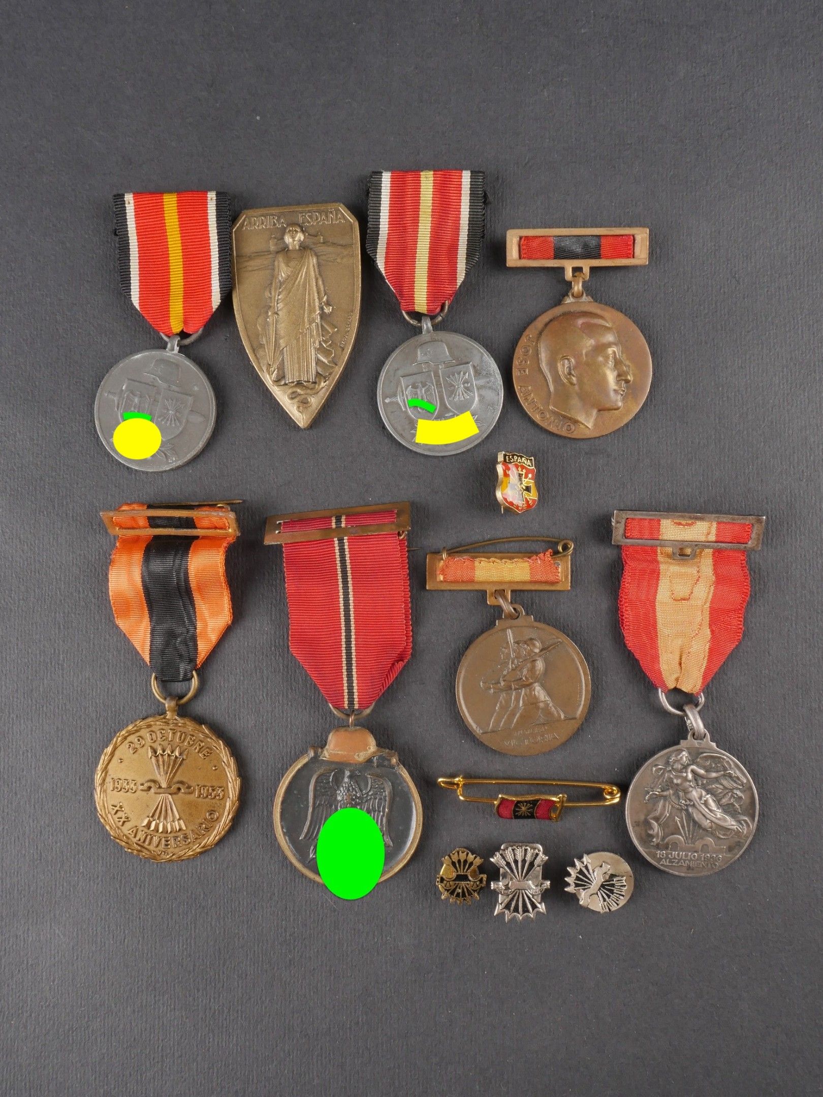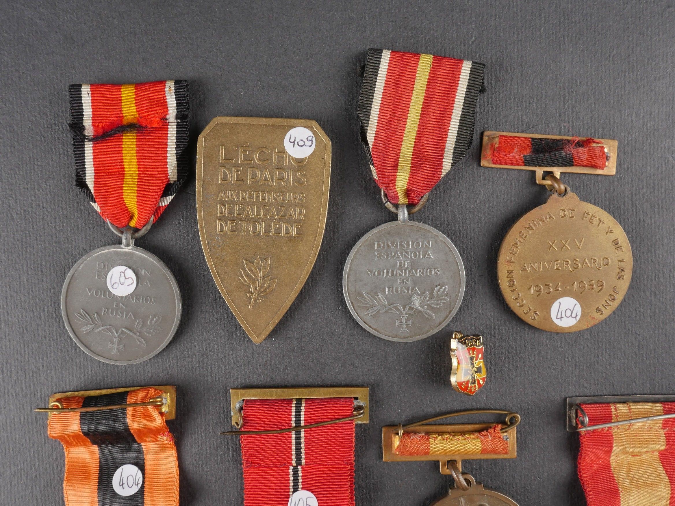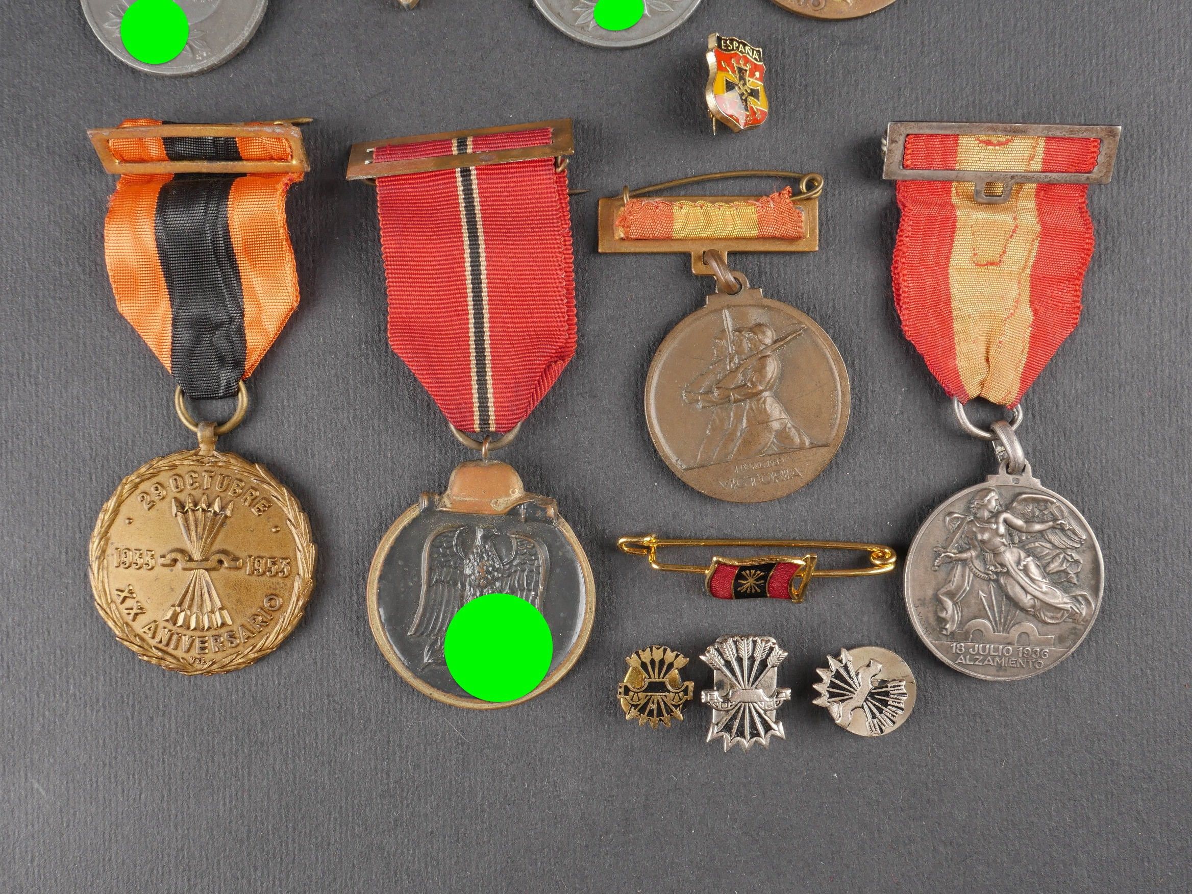 Spanish decorations. Comprising a medal with ribbon, marked 18 julio 1936 Alzamiento. A Spanish phalanx lapel badge. A medal with ribbon Victoria. A medal with ribbon, XX Aniversario. A plaque marked L'echo de paris aux defenseurs de l'alcazar de tolède. A small enamelled metal phalanx badge. A small enamelled metal badge for Spanish volunteers in the Wehrmacht. A Phalange button badge. A medal with ribbon Division Espanoia di Voluntarios in Rusia. A medal with ribbon Jose Antonio XXV Anniversario. A phalanx tie pin. An Eastern Front medal with ribbon. A Division Espanoia di Voluntarios in Rusia medal with ribbon. Some wear and patina to be noted. Condition II+. Spanish decorations. Set including a medal with ribbon marked 18 Julio 1936 Alzamiento, a Phalange lapel badge, a Victoria medal with ribbon, a XX Aniversario medal with ribbon, and a plaque marked L'Echo de Paris aux Défenseurs de l'Alcazar de Tolède." Also includes a small enamel Phalange badge, a small enamel badge of Spanish volunteers in the Wehrmacht, another Phalange lapel pin, a Division Española de Voluntarios en Rusia medal with ribbon, a José Antonio XXV Aniversario medal with ribbon, a Phalange tie pin, and an Eastern Front Medal with ribbon. Showing moderate wear and patina. Condition II+.