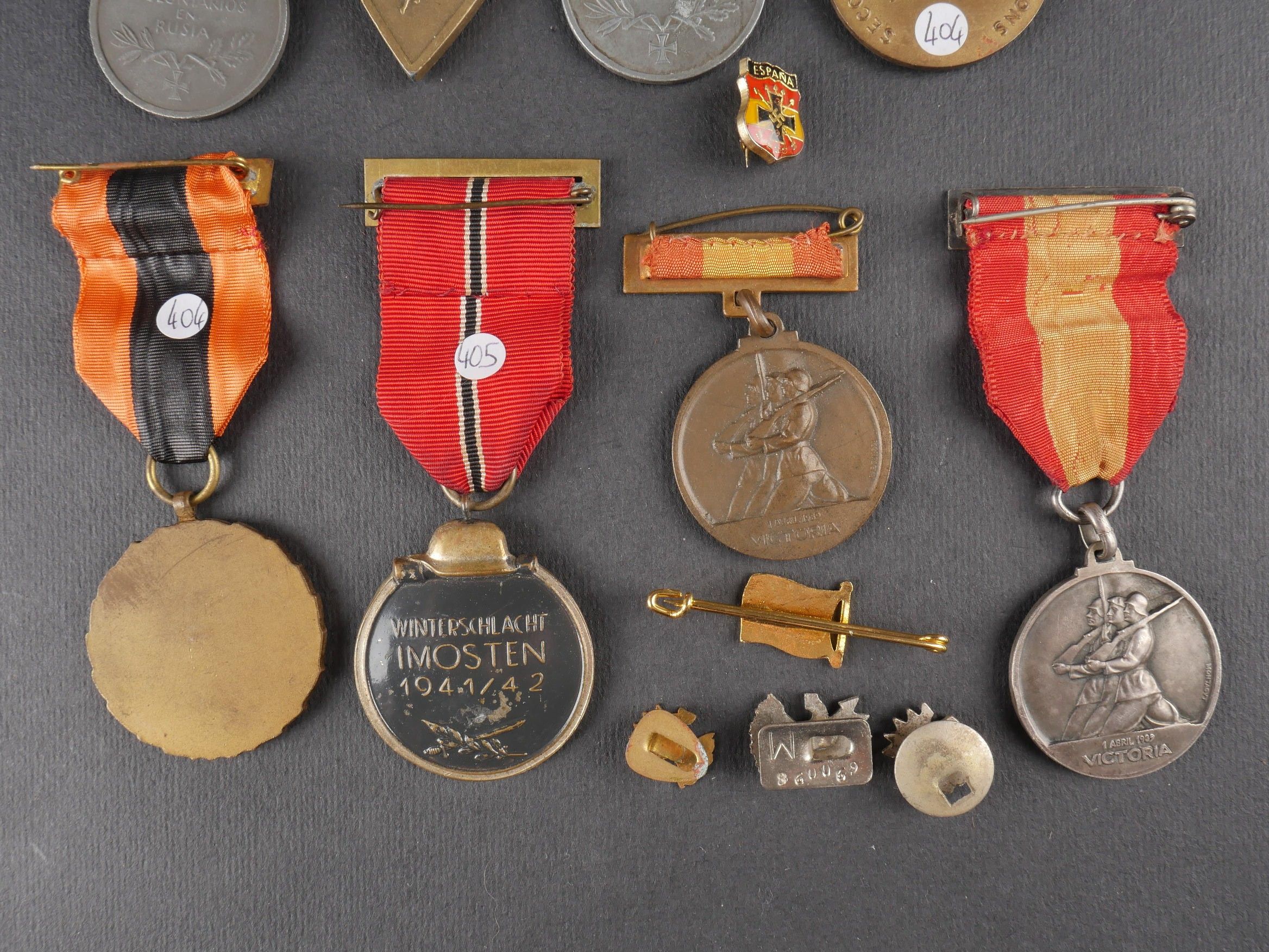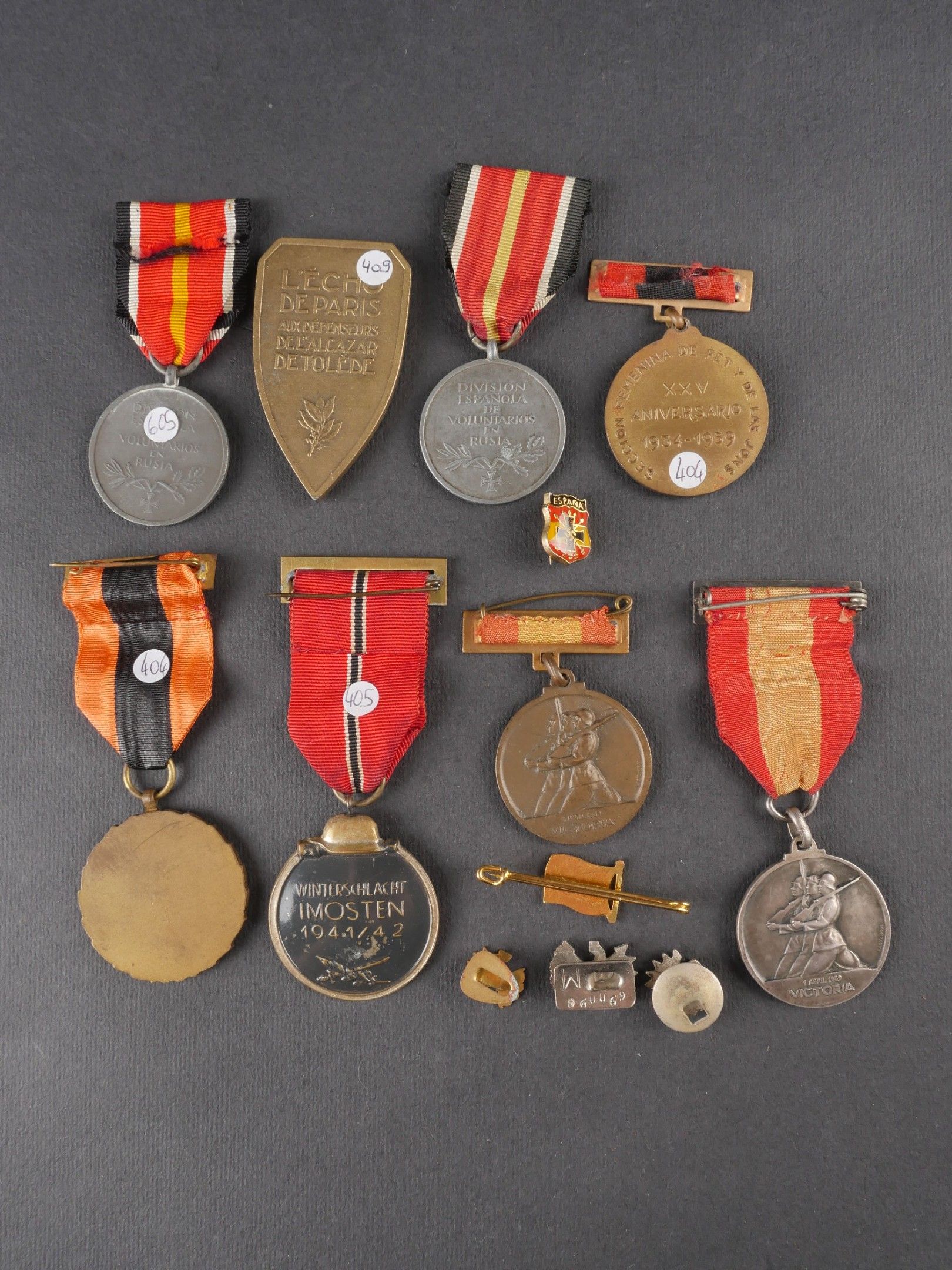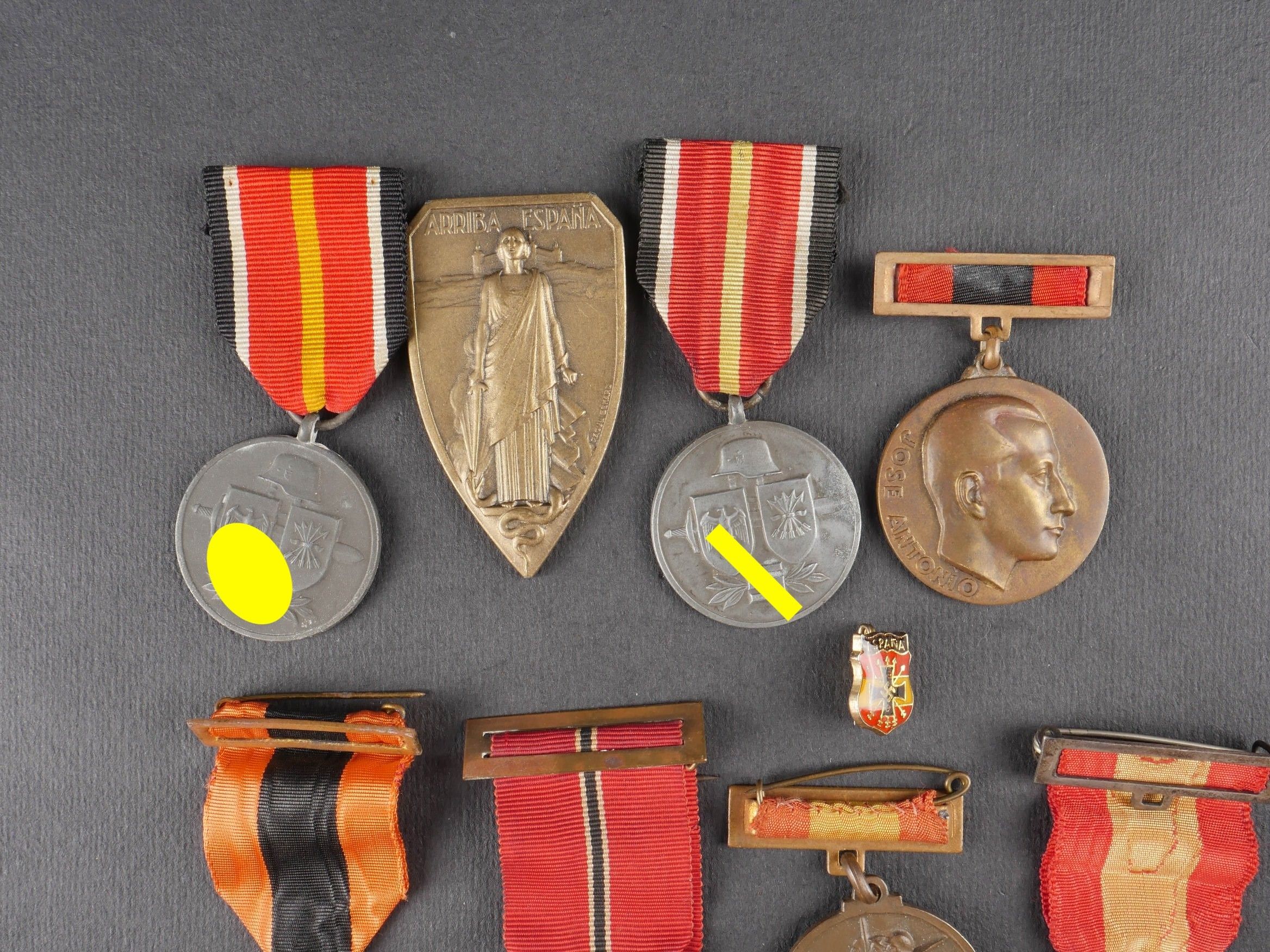 Spanish decorations. Comprising a medal with ribbon, marked 18 julio 1936 Alzamiento. A Spanish phalanx lapel badge. A medal with ribbon Victoria. A medal with ribbon, XX Aniversario. A plaque marked L'echo de paris aux defenseurs de l'alcazar de tolède. A small enamelled metal phalanx badge. A small enamelled metal badge for Spanish volunteers in the Wehrmacht. A Phalange button badge. A medal with ribbon Division Espanoia di Voluntarios in Rusia. A medal with ribbon Jose Antonio XXV Anniversario. A phalanx tie pin. An Eastern Front medal with ribbon. A Division Espanoia di Voluntarios in Rusia medal with ribbon. Some wear and patina to be noted. Condition II+. Spanish decorations. Set including a medal with ribbon marked 18 Julio 1936 Alzamiento, a Phalange lapel badge, a Victoria medal with ribbon, a XX Aniversario medal with ribbon, and a plaque marked L'Echo de Paris aux Défenseurs de l'Alcazar de Tolède." Also includes a small enamel Phalange badge, a small enamel badge of Spanish volunteers in the Wehrmacht, another Phalange lapel pin, a Division Española de Voluntarios en Rusia medal with ribbon, a José Antonio XXV Aniversario medal with ribbon, a Phalange tie pin, and an Eastern Front Medal with ribbon. Showing moderate wear and patina. Condition II+.