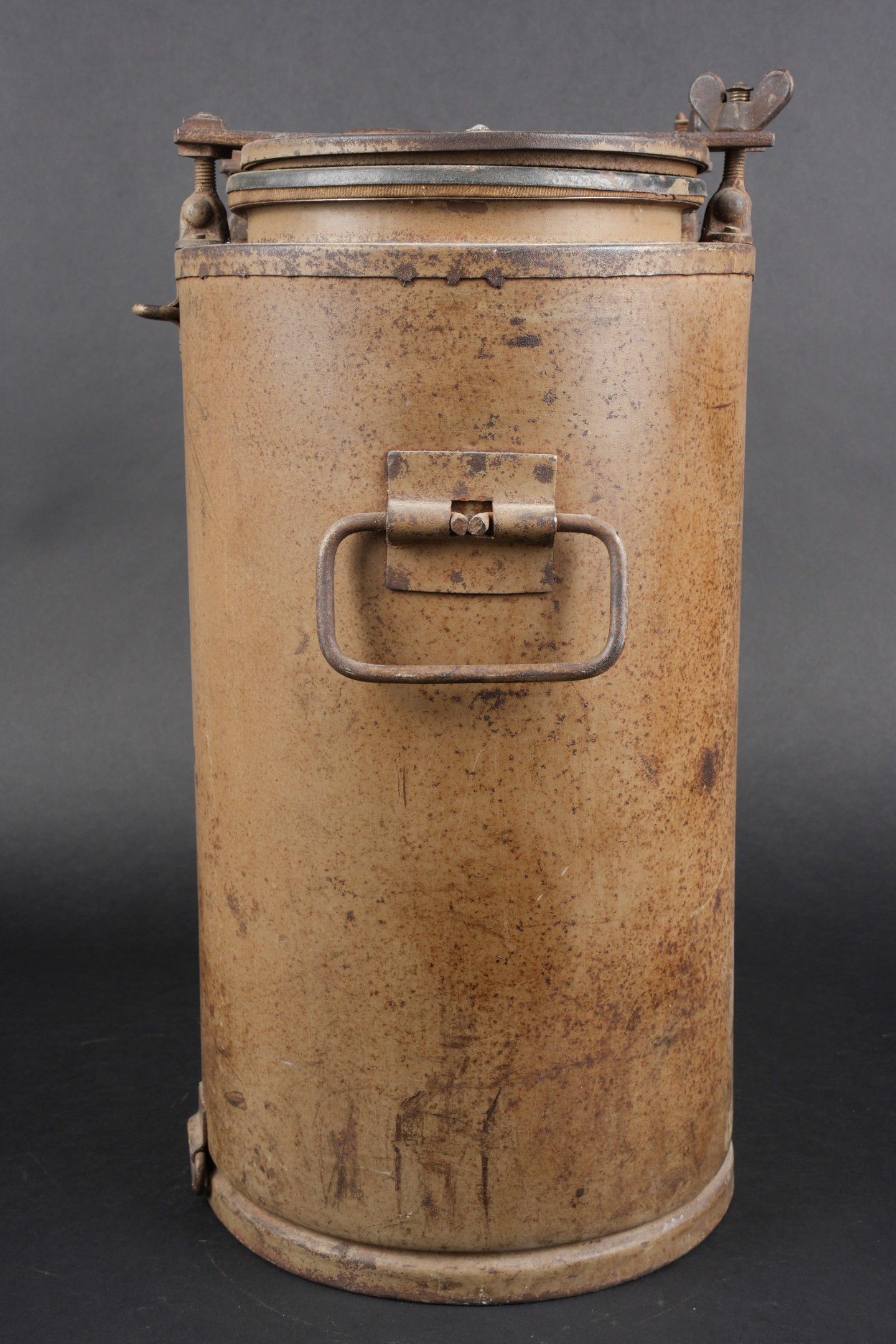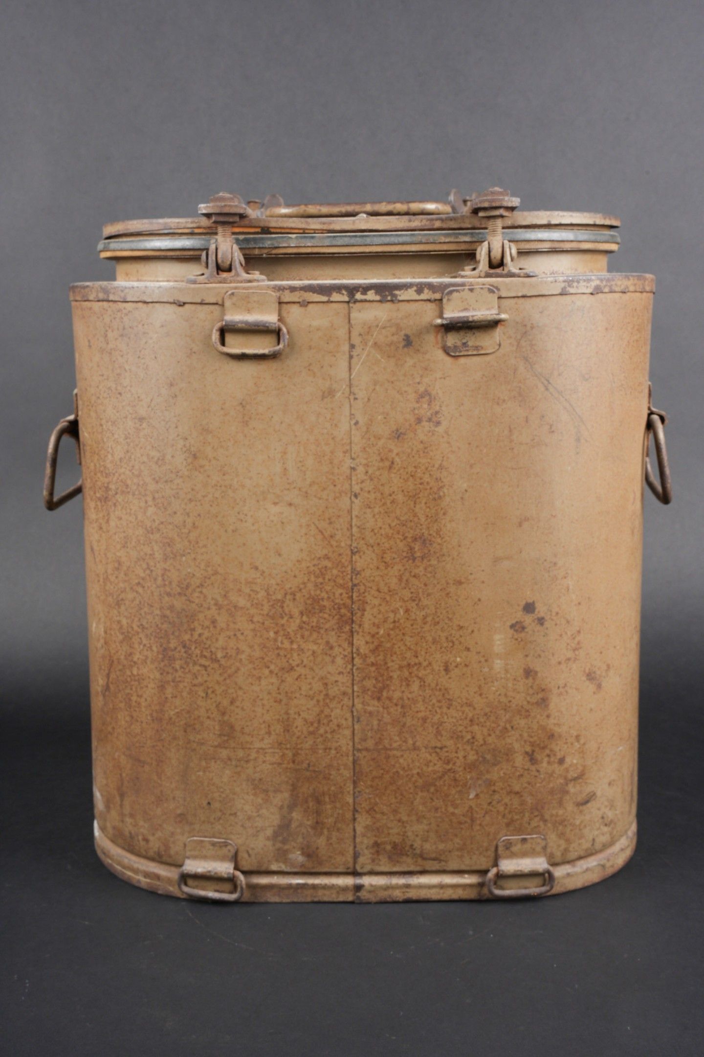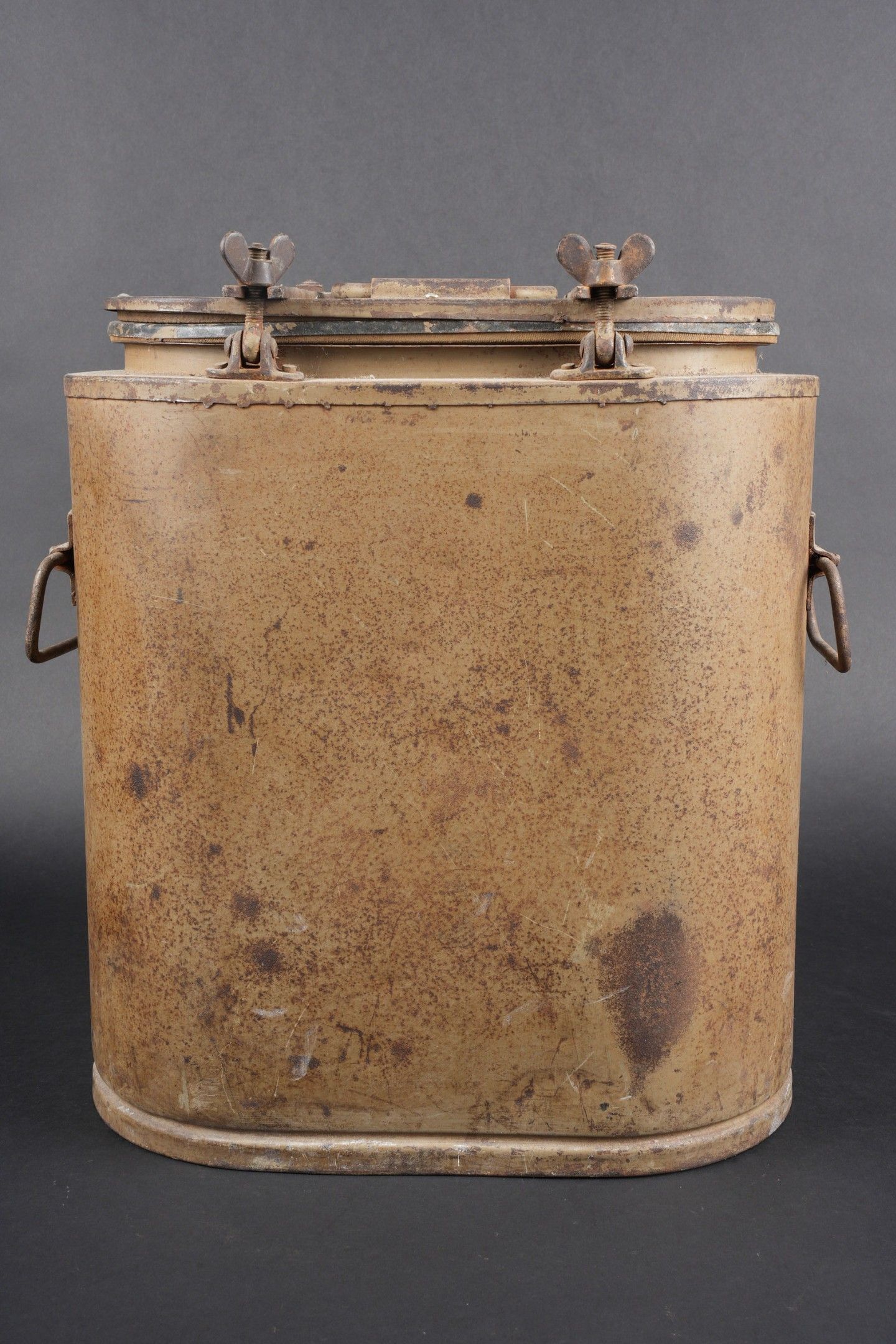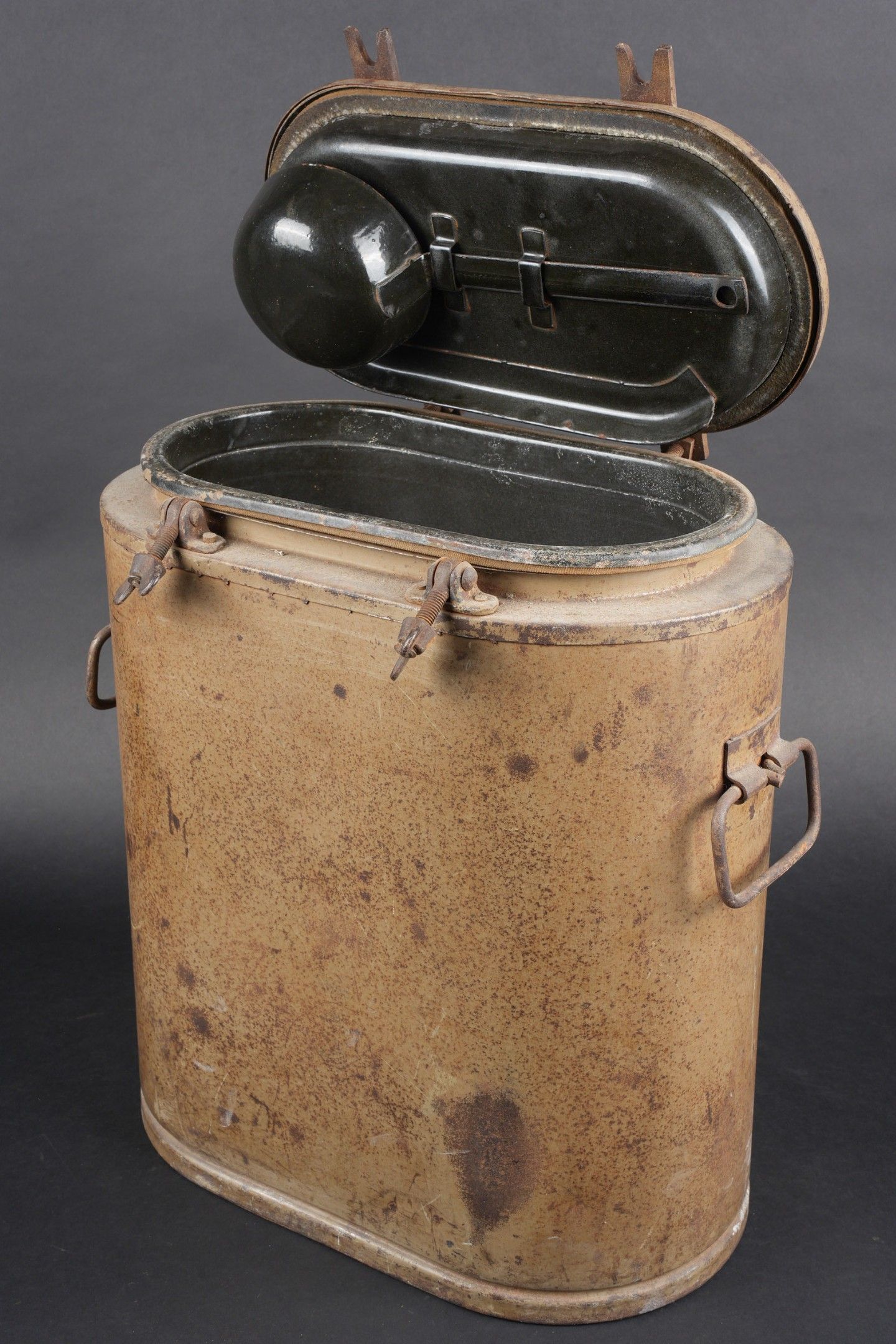 German Norwegian. Metal, 70% sand yellow paint. The carrying handles are complete. Functional closures. Interior lined with black enamelled metal, the ladle is present. HFW 43 manufacture. Some wear and patina. Condition II+. German Norwegian canteen. Metal construction retaining about 70% of its original sand-yellow paint. Carrying handles complete and functional. Closures in working order. Interior lined with black enamelled metal. The ladle is present. Maker marked HFW 43. Showing moderate wear and patina. Condition II+.