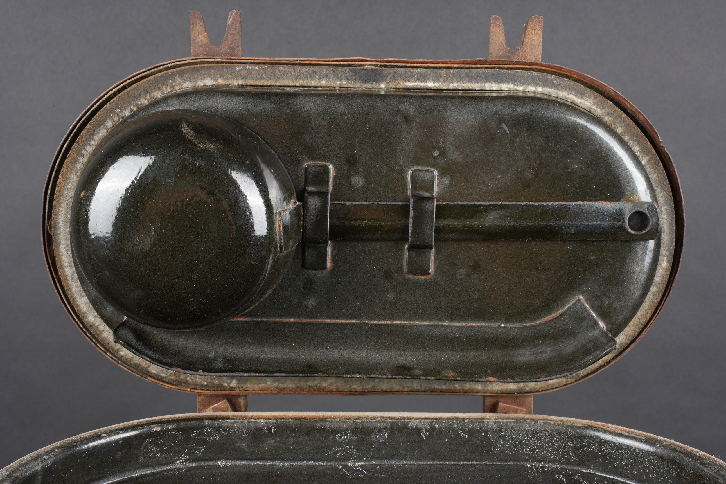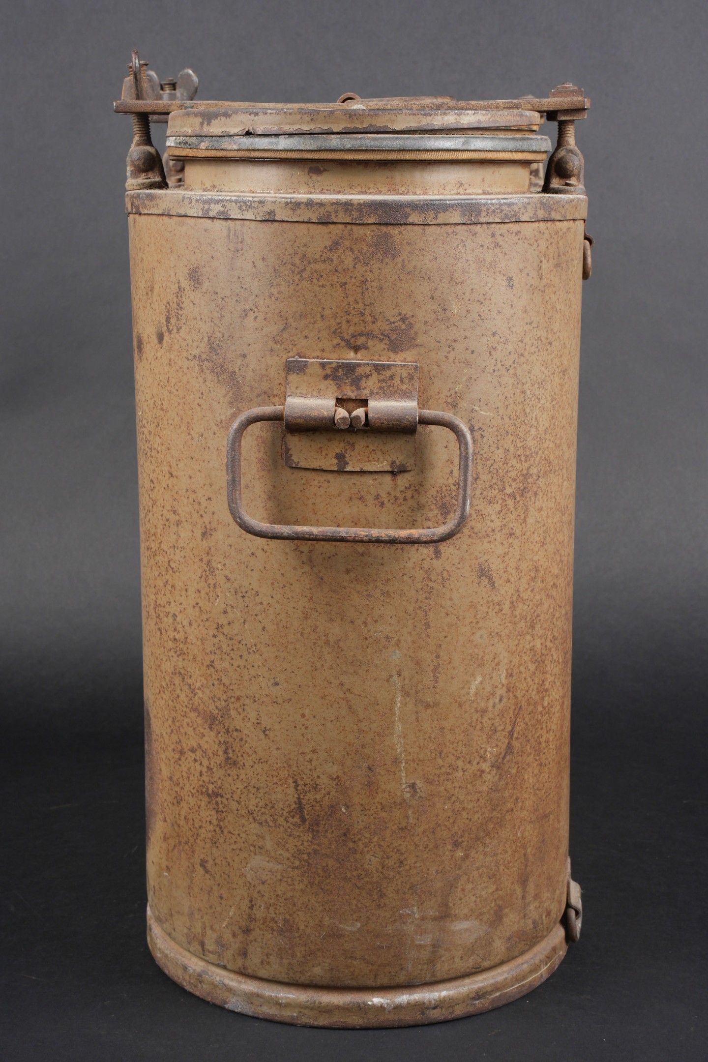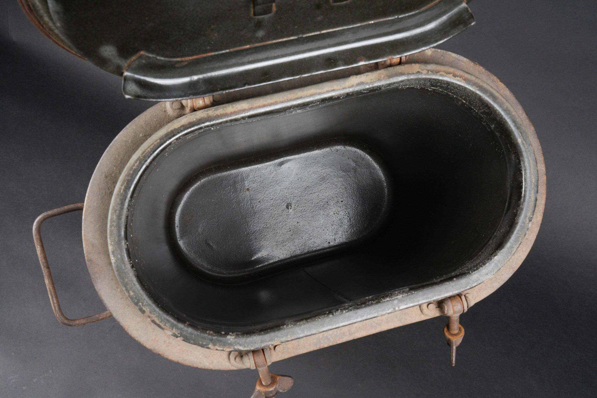 German Norwegian. Metal, 70% sand yellow paint. The carrying handles are complete. Functional closures. Interior lined with black enamelled metal, the ladle is present. HFW 43 manufacture. Some wear and patina. Condition II+. German Norwegian canteen. Metal construction retaining about 70% of its original sand-yellow paint. Carrying handles complete and functional. Closures in working order. Interior lined with black enamelled metal. The ladle is present. Maker marked HFW 43. Showing moderate wear and patina. Condition II+.