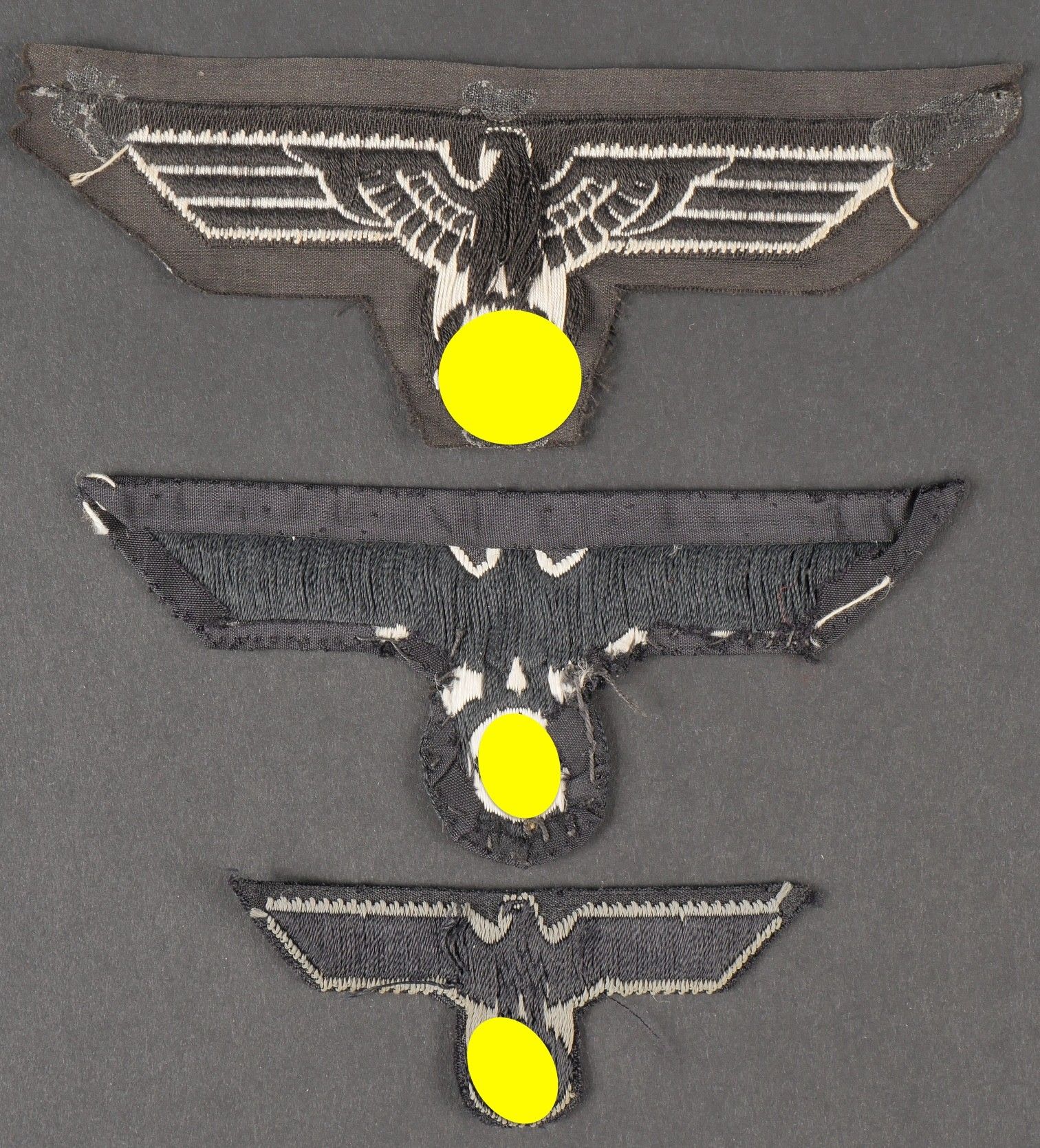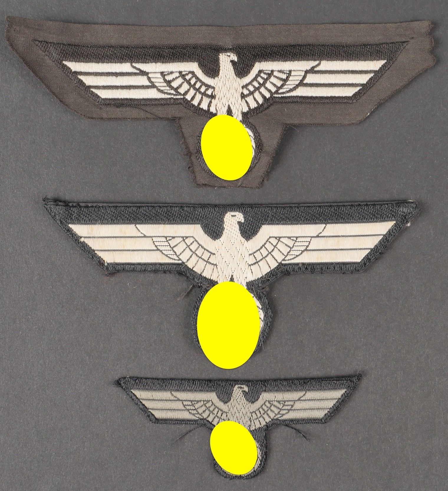 Panzer badges. Comprising a Bevo headdress eagle, the borders are perfectly cut, never mounted. A Bevo chest eagle, the borders have never been folded back, but partially cut out, never mounted. A vintage Bevo chest eagle, the borders have been folded, probably removed from a jacket. Some wear and patina to parts. Condition II+. Panzer insignia. Set including a Bevo-woven cap eagle with perfectly cut edges, never mounted, a Bevo-woven breast eagle with edges unturned, partially trimmed, never mounted, and another Bevo breast eagle with period-folded edges, probably removed from a tunic. Showing slight wear and patina. Condition II+.