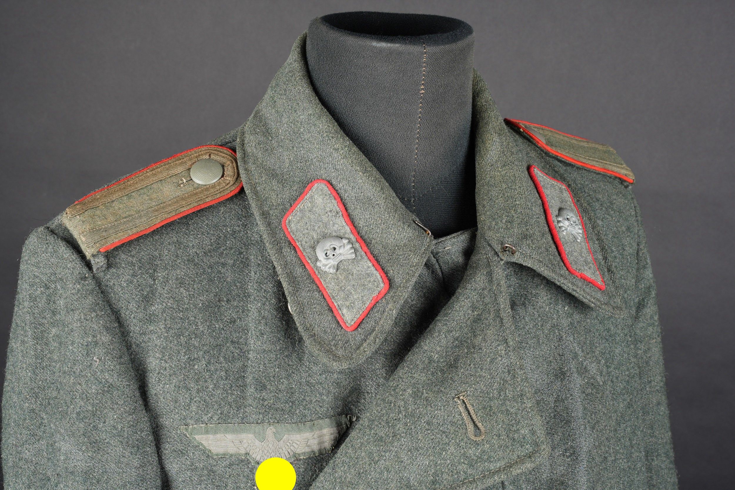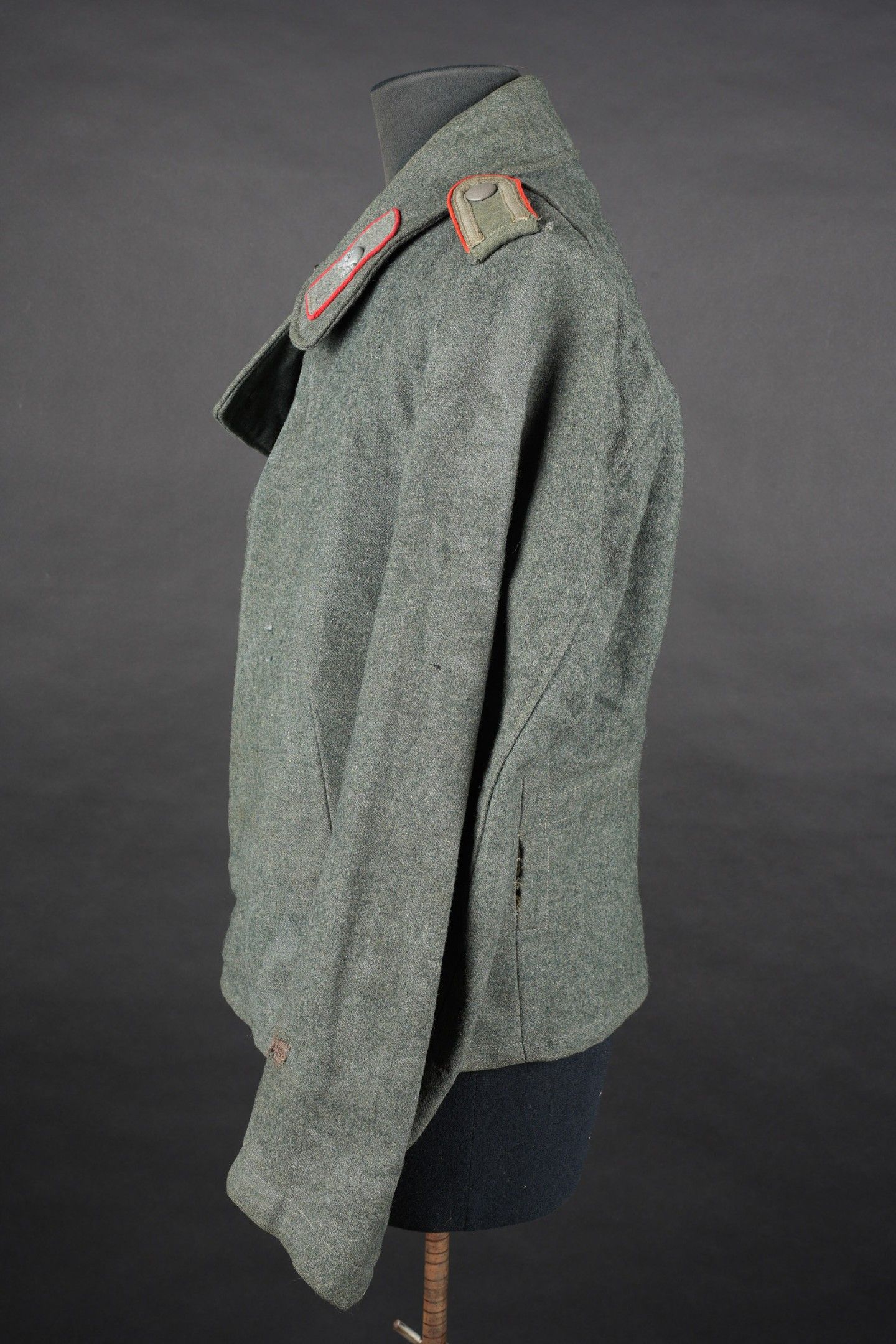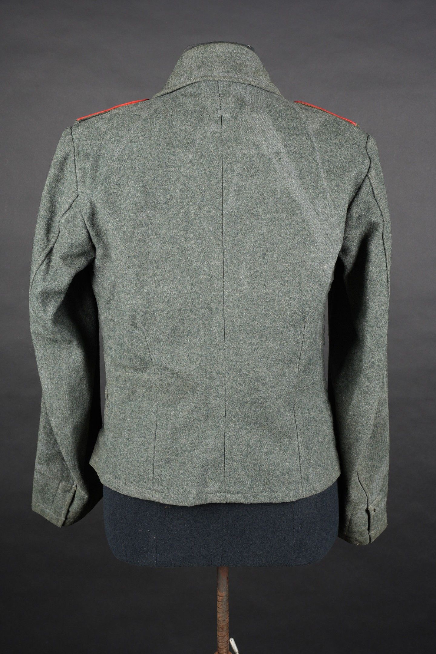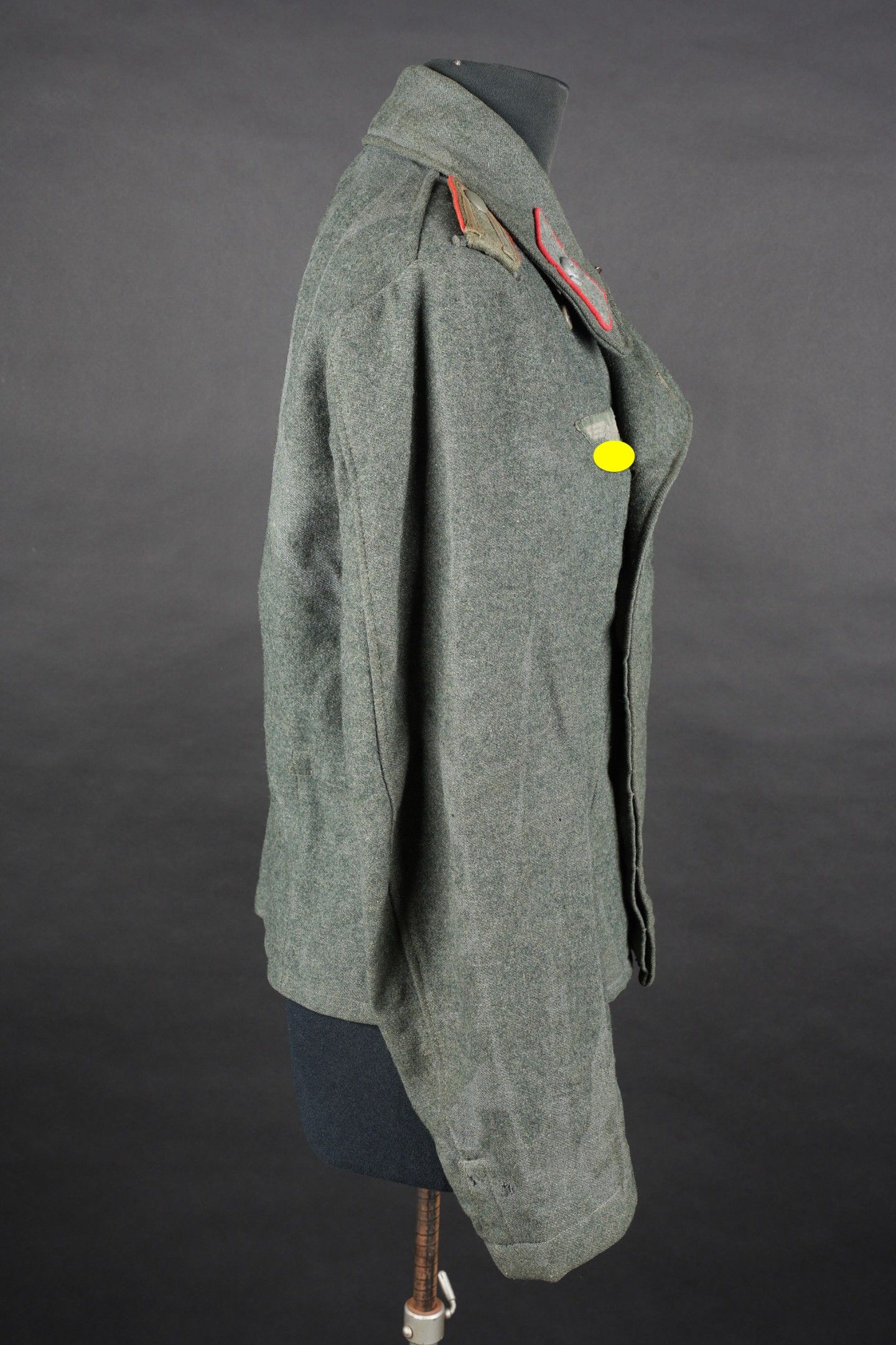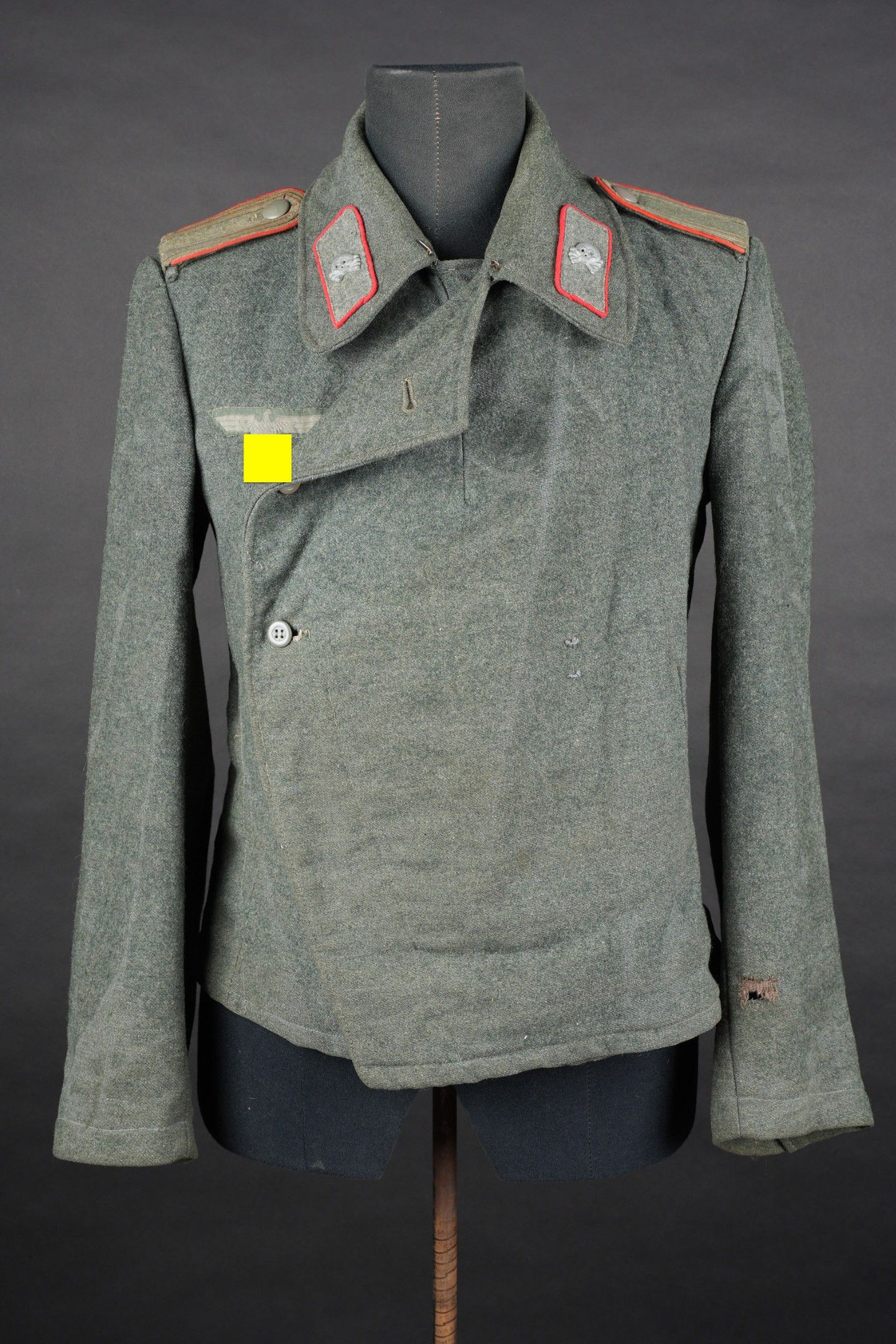 Sturmgeschutz jacket. Double-breasted model in Feldgrau cloth. All buttons are present. A decorative strap on the left breast. Collar insignia on Feldgrau background, red artillery piping, metal skulls. Bevo chest eagle. Artillery Unteroffizier shoulder tabs. All insignia reassembled. Significant repair to bottom left sleeve. Interior lined in brown cotton fabric. RBNr markings partially illegible. Size indications 180 188 45 45 88 87 M44. The drawstring at the waist is present. There is some wear and patina to the piece, as well as numerous moth holes, partially hidden by the various flaps. Condition II+. Sturmgeschütz jacket. Double-breasted model in Feldgrau wool. All buttons present. Decoration loop on the left chest. Collar tabs on Feldgrau background with red piping for artillery units and metal skulls. Bevo breast eagle present. Unteroffizier artillery shoulder straps. All insignia have been replaced. Large period repair on the lower left sleeve. Brown cotton lining. RBNr markings partly illegible. Size markings 180 188 45 45 88 87 M44. Internal drawstring at the waist. Showing wear and patina with multiple moth holes partially hidden under the flaps. Condition II+.