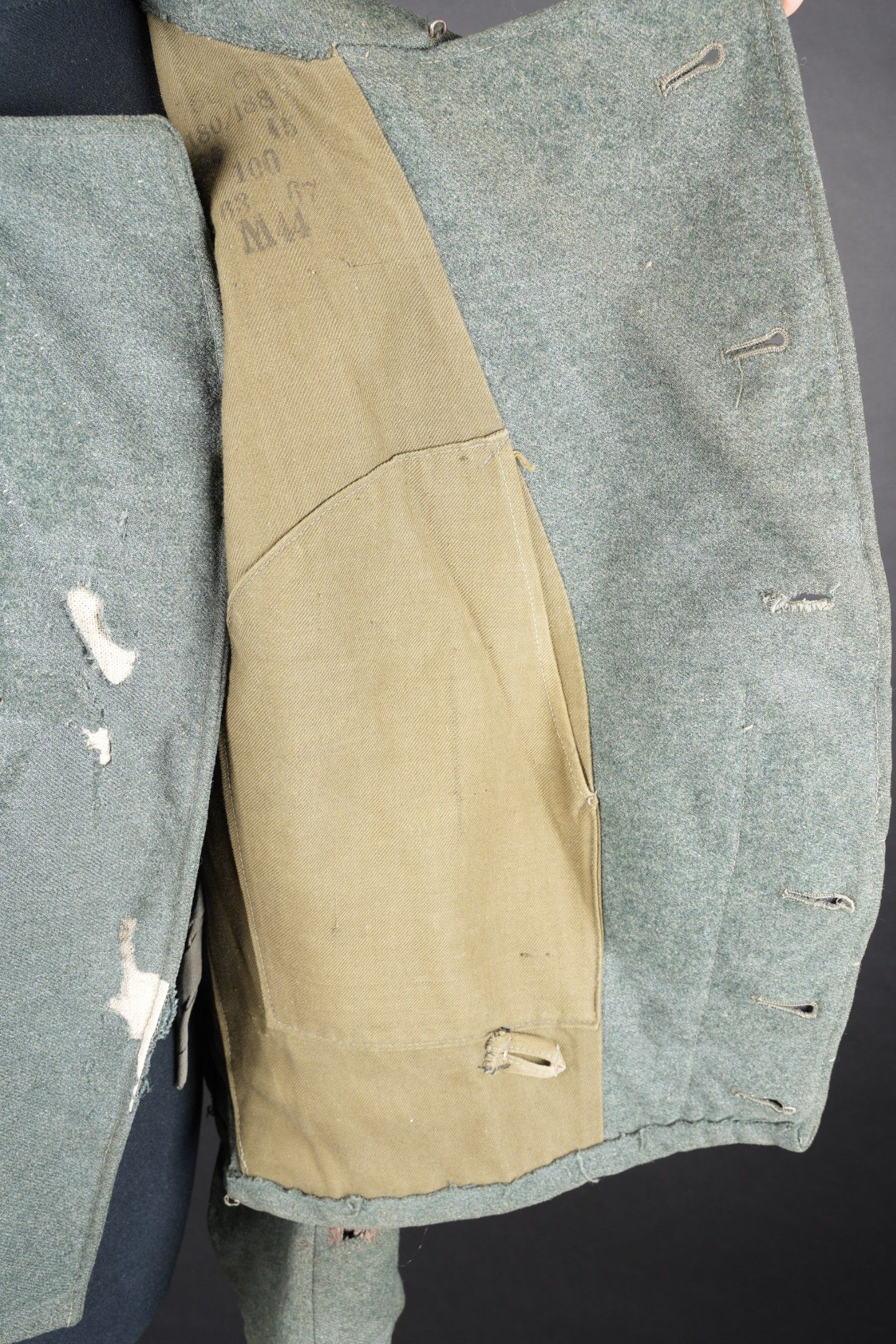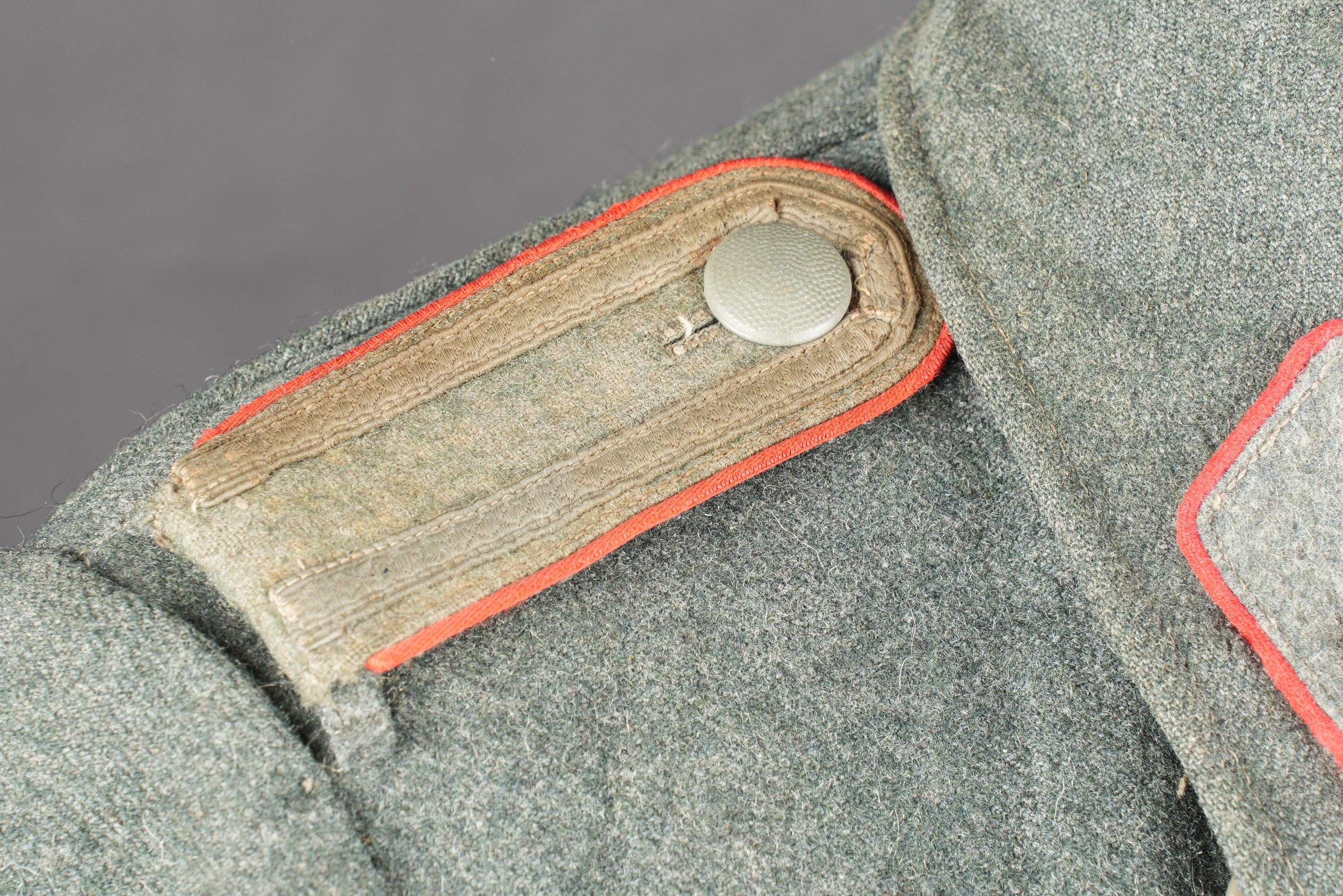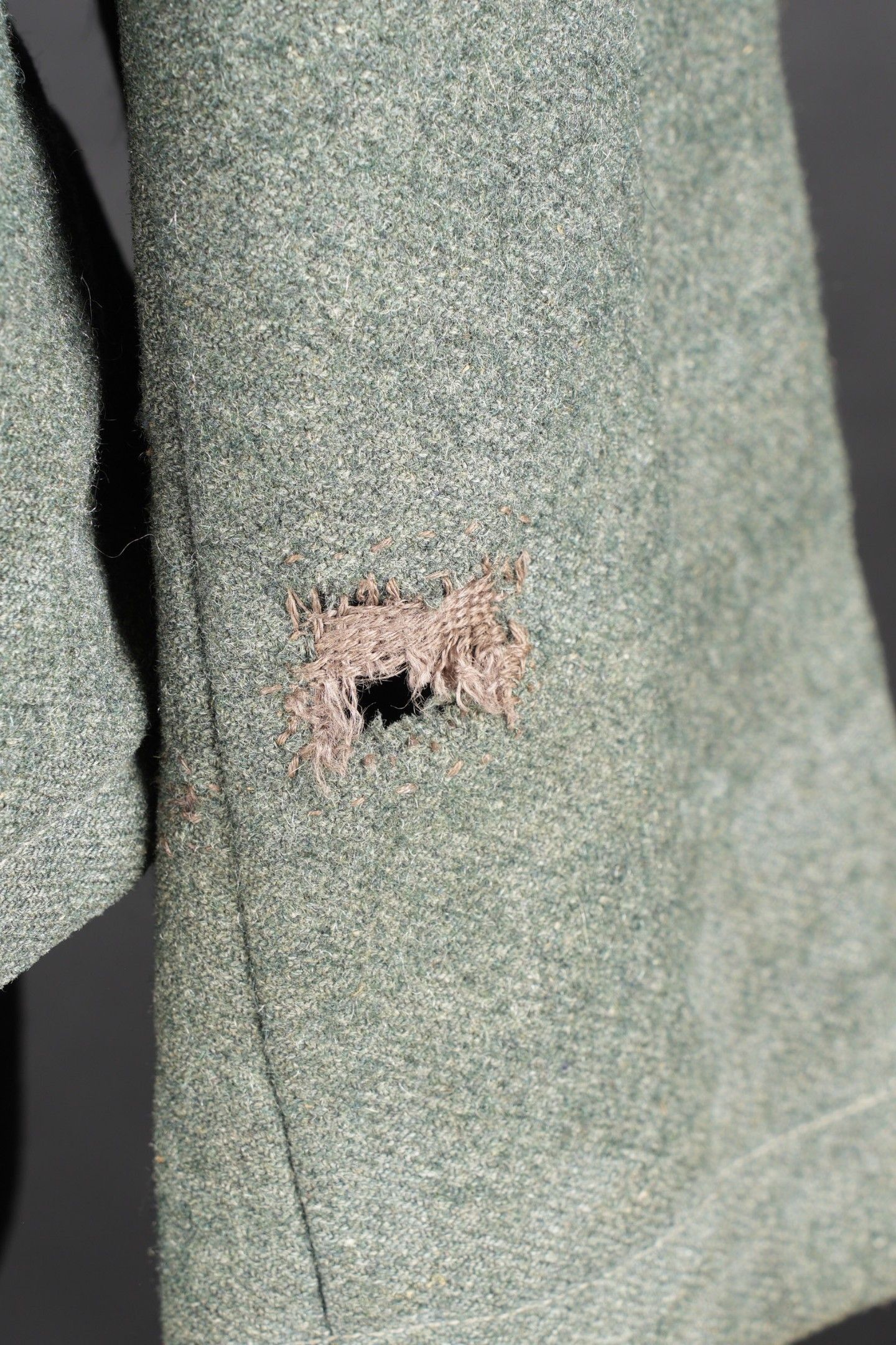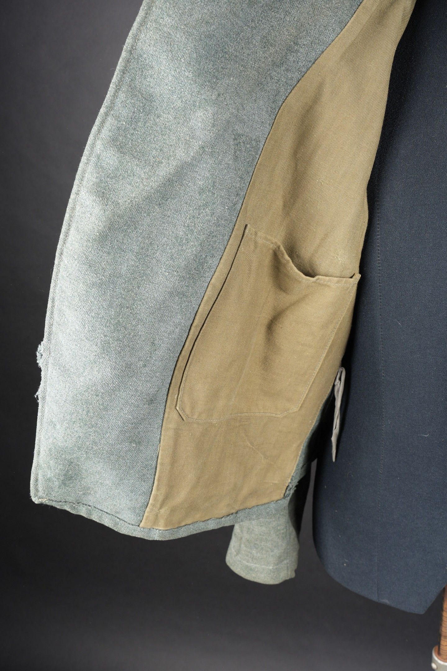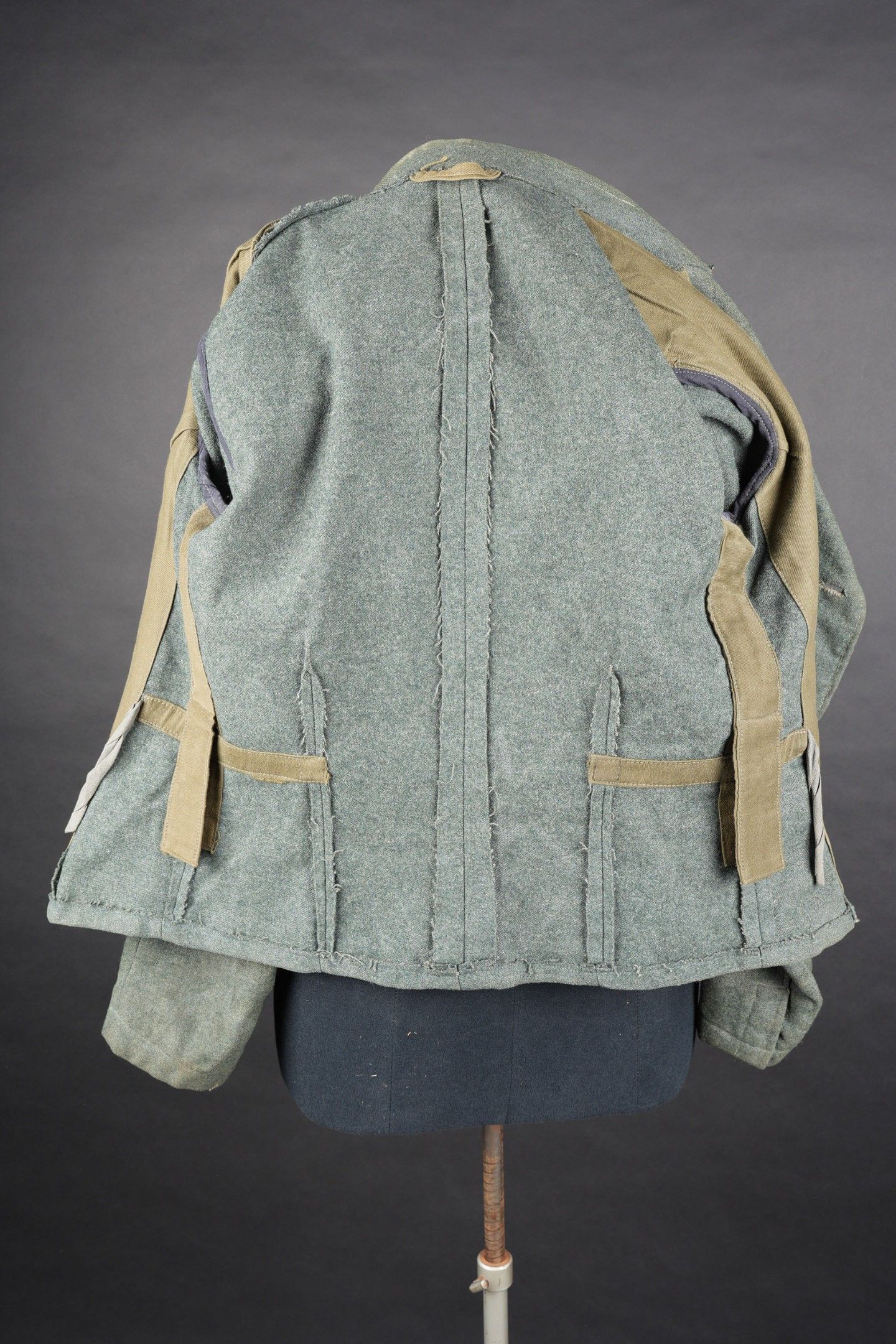 Sturmgeschutz jacket. Double-breasted model in Feldgrau cloth. All buttons are present. A decorative strap on the left breast. Collar insignia on Feldgrau background, red artillery piping, metal skulls. Bevo chest eagle. Artillery Unteroffizier shoulder tabs. All insignia reassembled. Significant repair to bottom left sleeve. Interior lined in brown cotton fabric. RBNr markings partially illegible. Size indications 180 188 45 45 88 87 M44. The drawstring at the waist is present. There is some wear and patina to the piece, as well as numerous moth holes, partially hidden by the various flaps. Condition II+. Sturmgeschütz jacket. Double-breasted model in Feldgrau wool. All buttons present. Decoration loop on the left chest. Collar tabs on Feldgrau background with red piping for artillery units and metal skulls. Bevo breast eagle present. Unteroffizier artillery shoulder straps. All insignia have been replaced. Large period repair on the lower left sleeve. Brown cotton lining. RBNr markings partly illegible. Size markings 180 188 45 45 88 87 M44. Internal drawstring at the waist. Showing wear and patina with multiple moth holes partially hidden under the flaps. Condition II+.