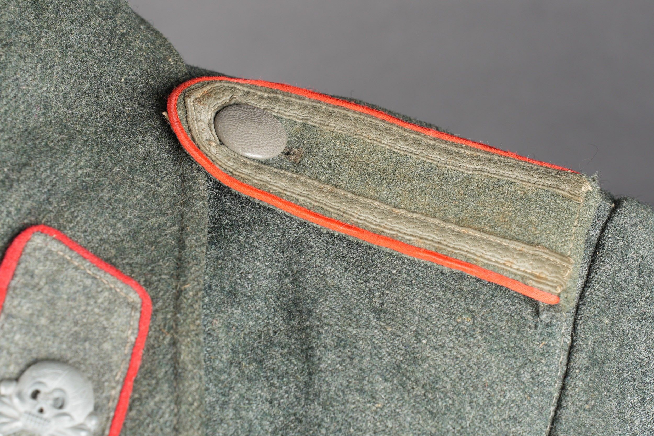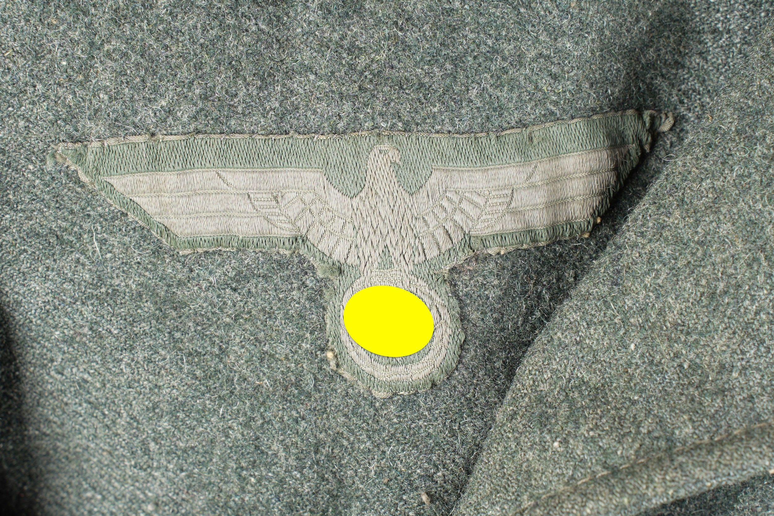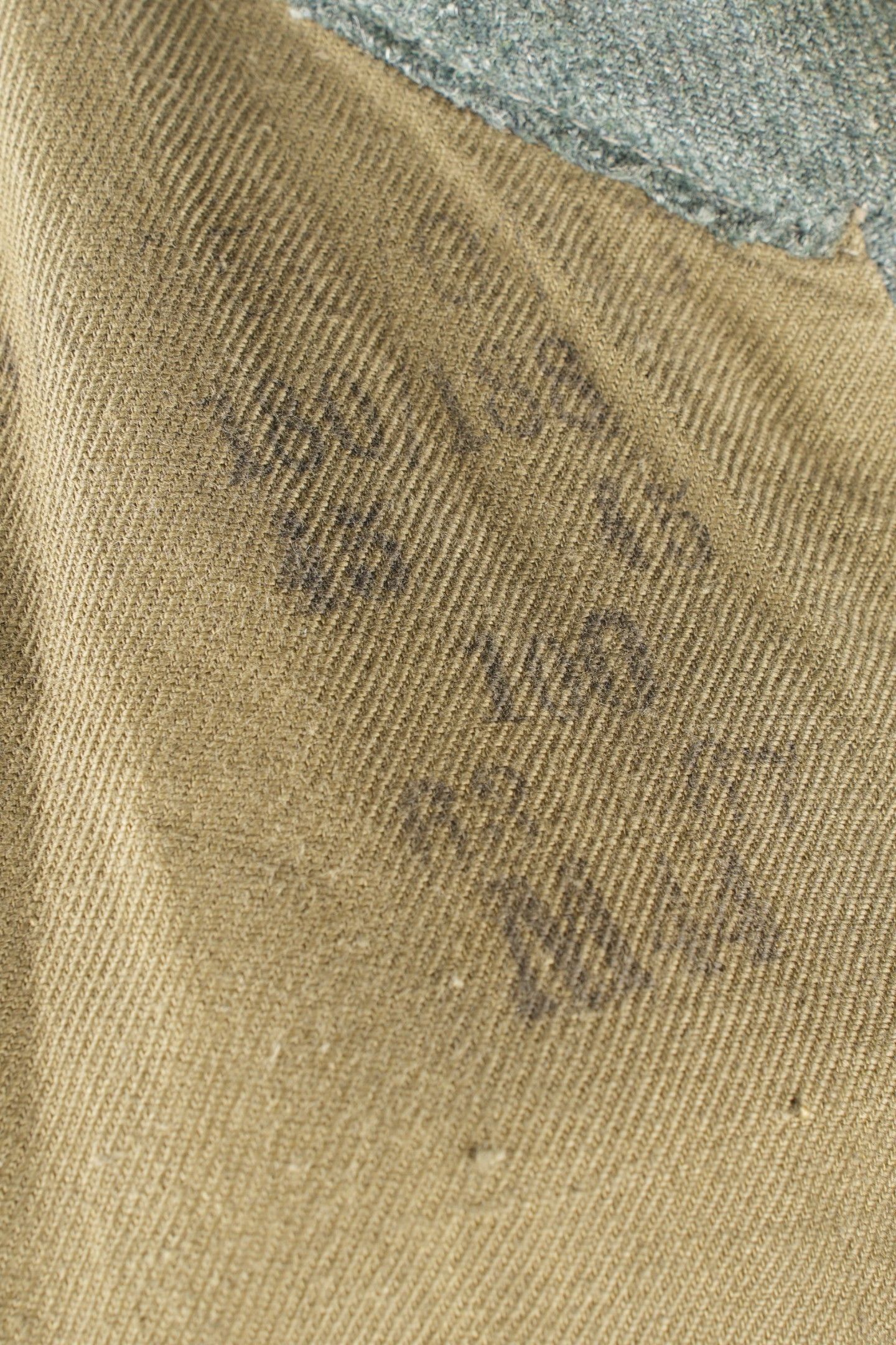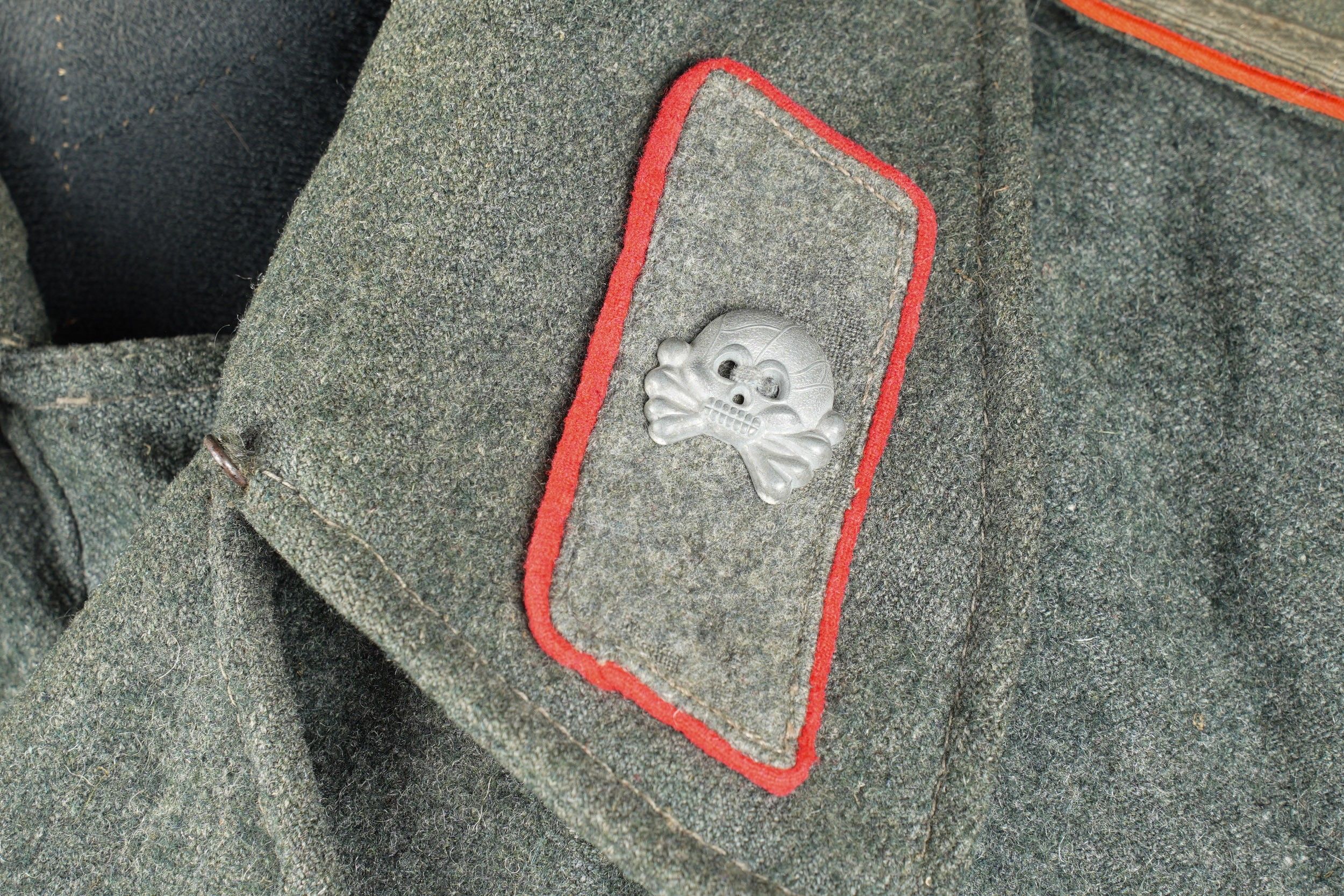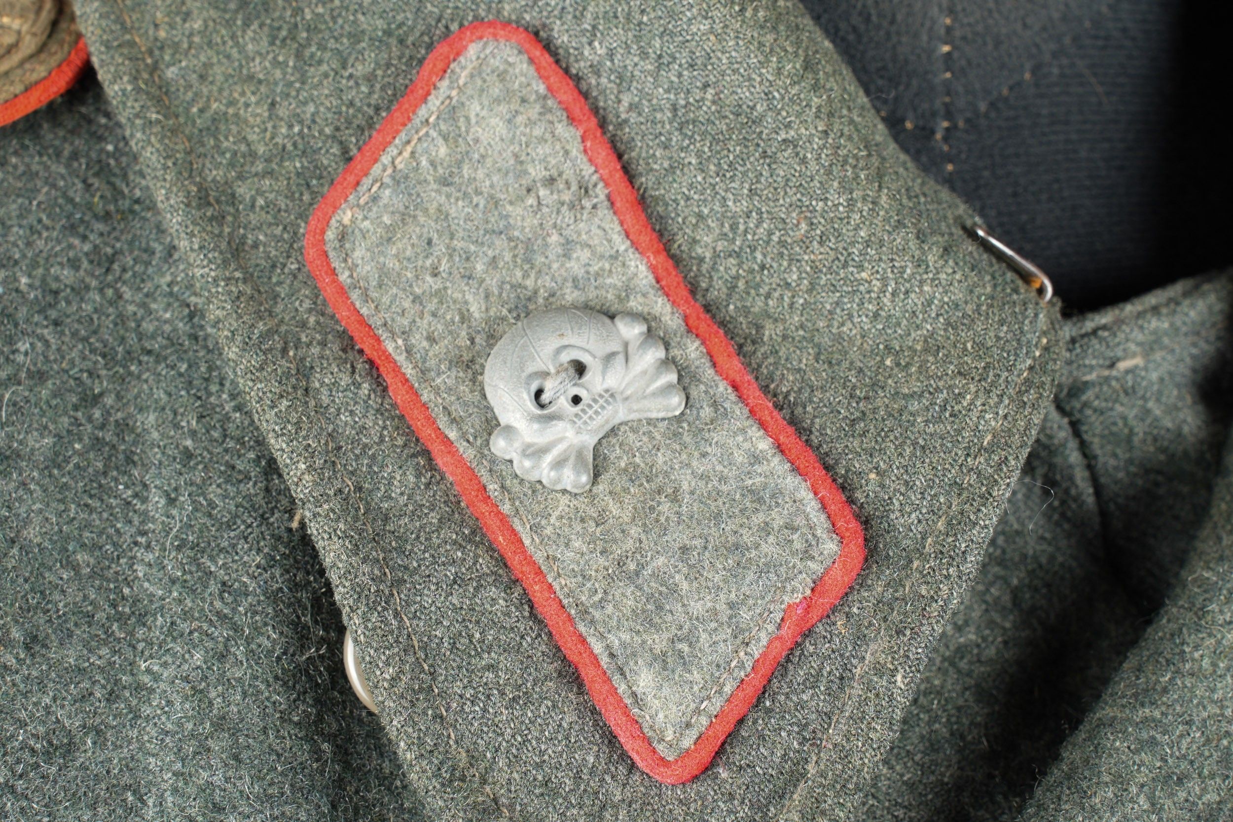 Sturmgeschutz jacket. Double-breasted model in Feldgrau cloth. All buttons are present. A decorative strap on the left breast. Collar insignia on Feldgrau background, red artillery piping, metal skulls. Bevo chest eagle. Artillery Unteroffizier shoulder tabs. All insignia reassembled. Significant repair to bottom left sleeve. Interior lined in brown cotton fabric. RBNr markings partially illegible. Size indications 180 188 45 45 88 87 M44. The drawstring at the waist is present. There is some wear and patina to the piece, as well as numerous moth holes, partially hidden by the various flaps. Condition II+. Sturmgeschütz jacket. Double-breasted model in Feldgrau wool. All buttons present. Decoration loop on the left chest. Collar tabs on Feldgrau background with red piping for artillery units and metal skulls. Bevo breast eagle present. Unteroffizier artillery shoulder straps. All insignia have been replaced. Large period repair on the lower left sleeve. Brown cotton lining. RBNr markings partly illegible. Size markings 180 188 45 45 88 87 M44. Internal drawstring at the waist. Showing wear and patina with multiple moth holes partially hidden under the flaps. Condition II+.