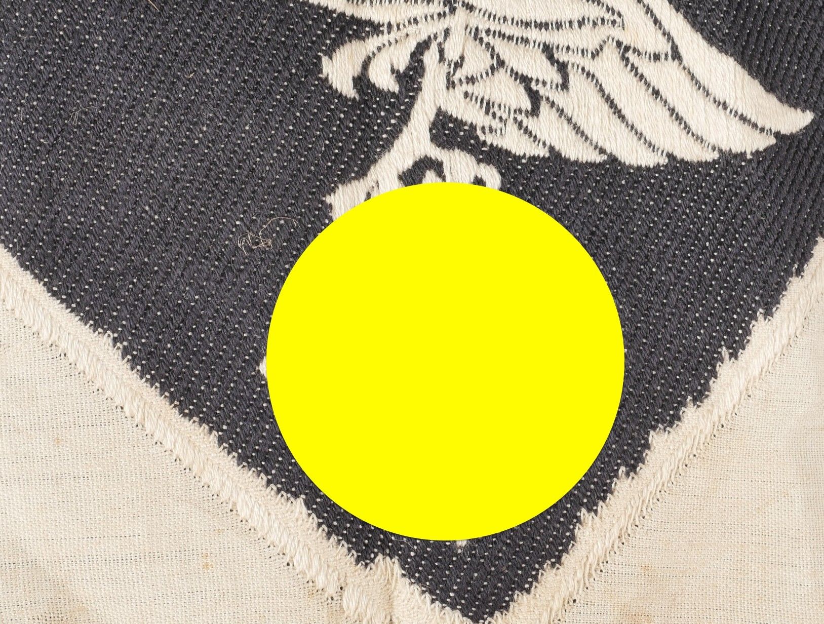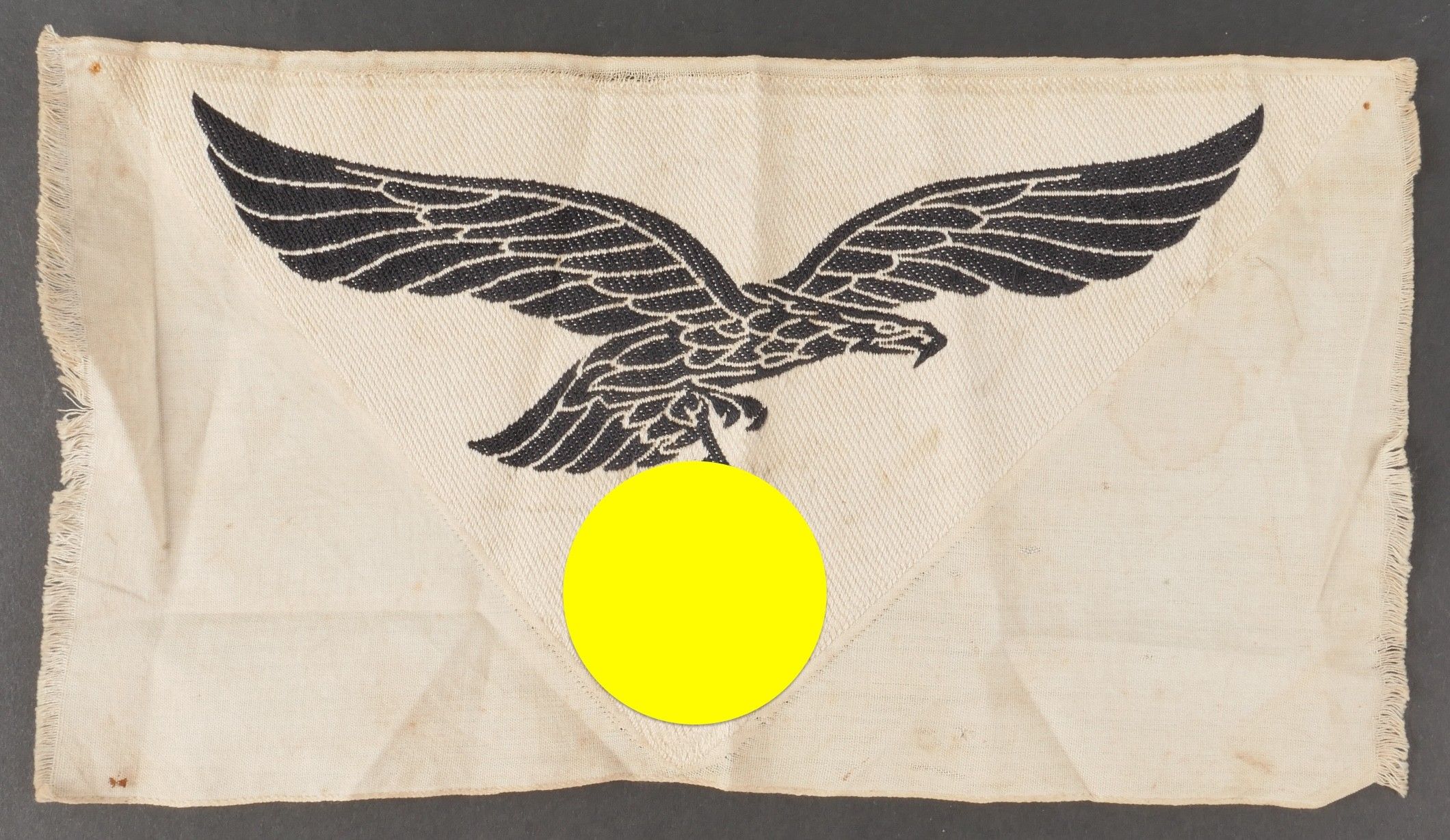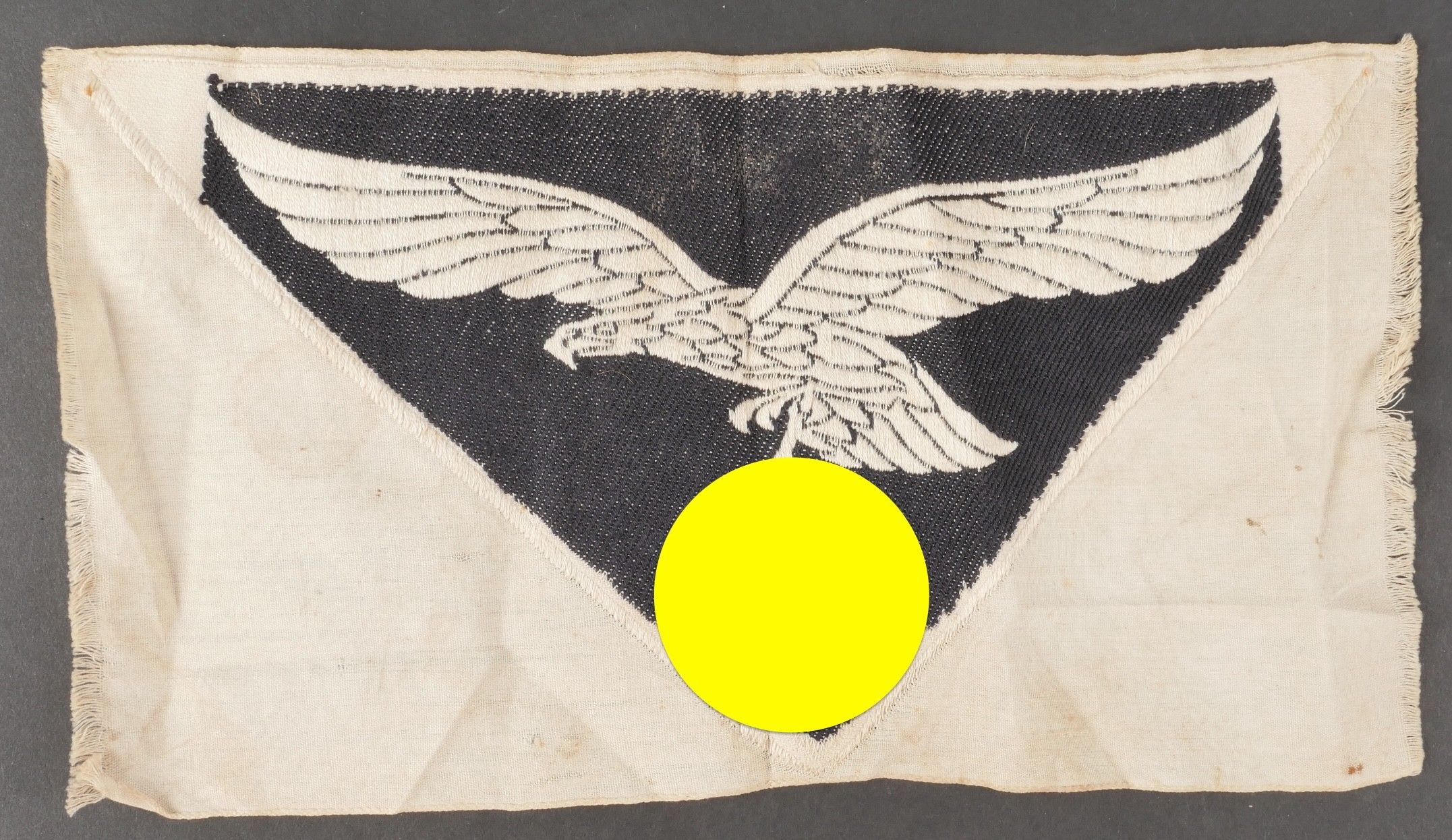 Luftwaffe sports shirt badge. White cotton fabric, never mounted. Nice Luftwaffe eagle of the second type embroidered in black. Some wear and patina, as well as a few stains. The edges are frayed. Condition II+. Luftwaffe sports shirt insignia. Made of white cotton, never mounted. Fine black-embroidered Luftwaffe second-type eagle. Shows some wear, patina, and minor staining. Frayed edges. Condition II+.