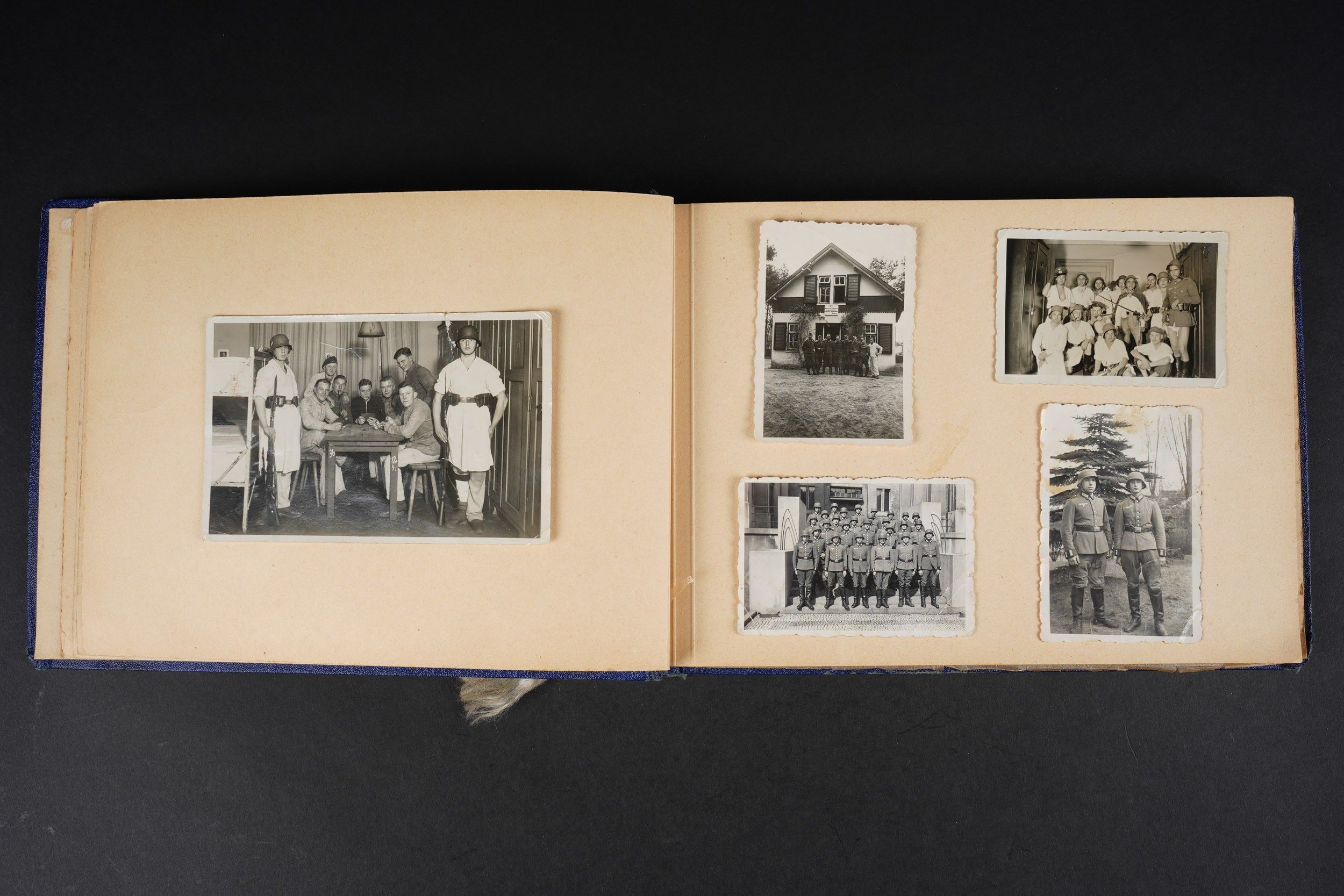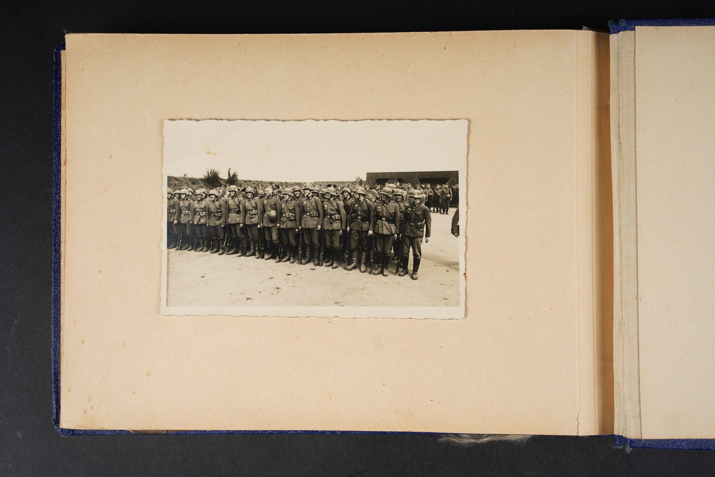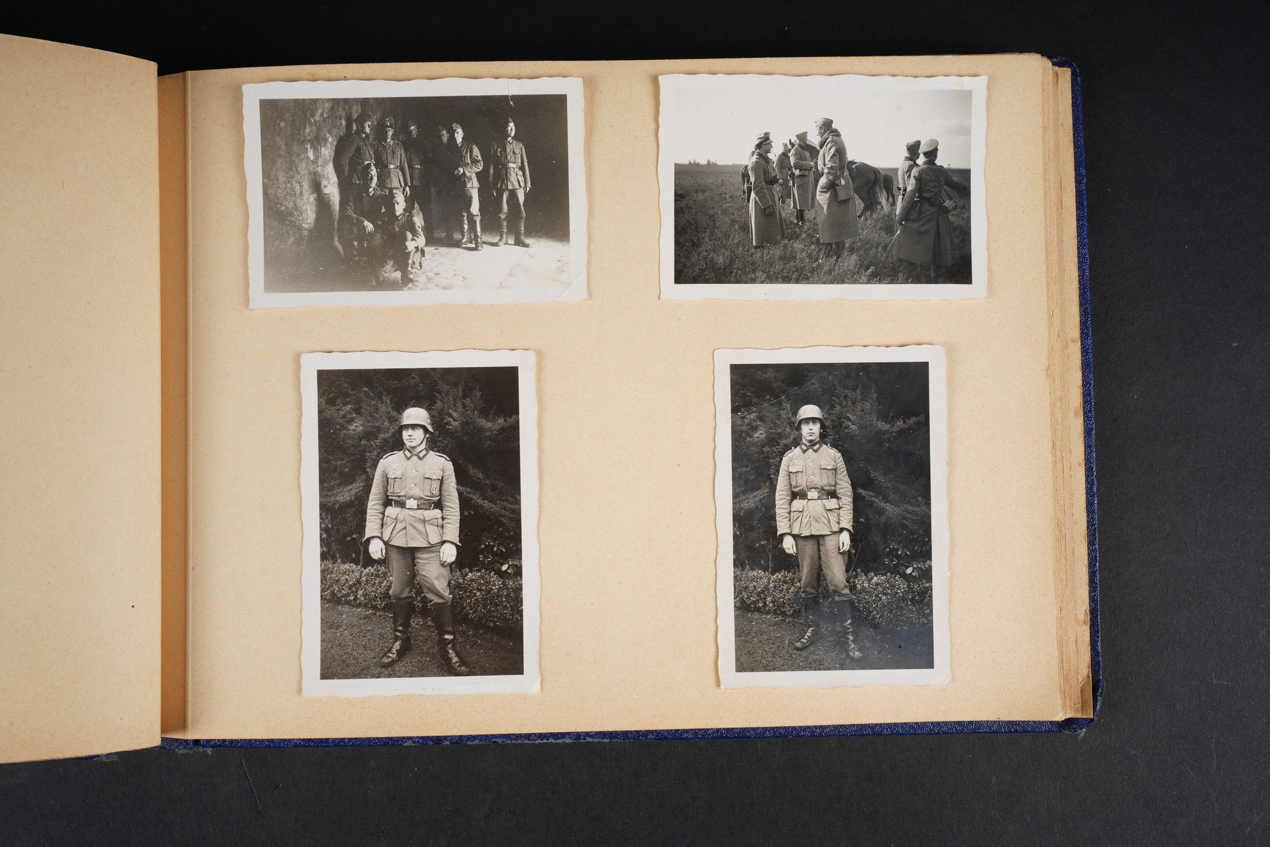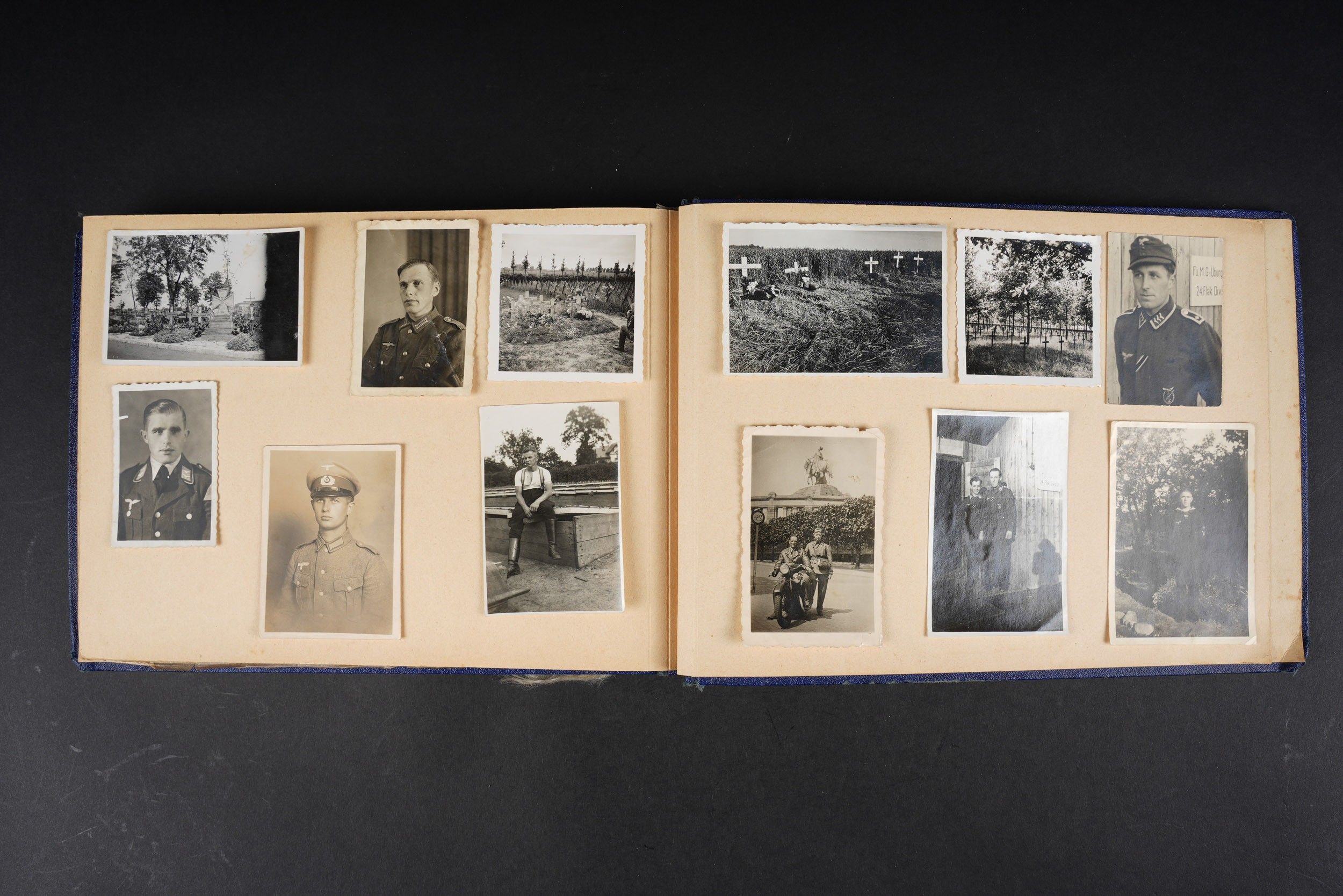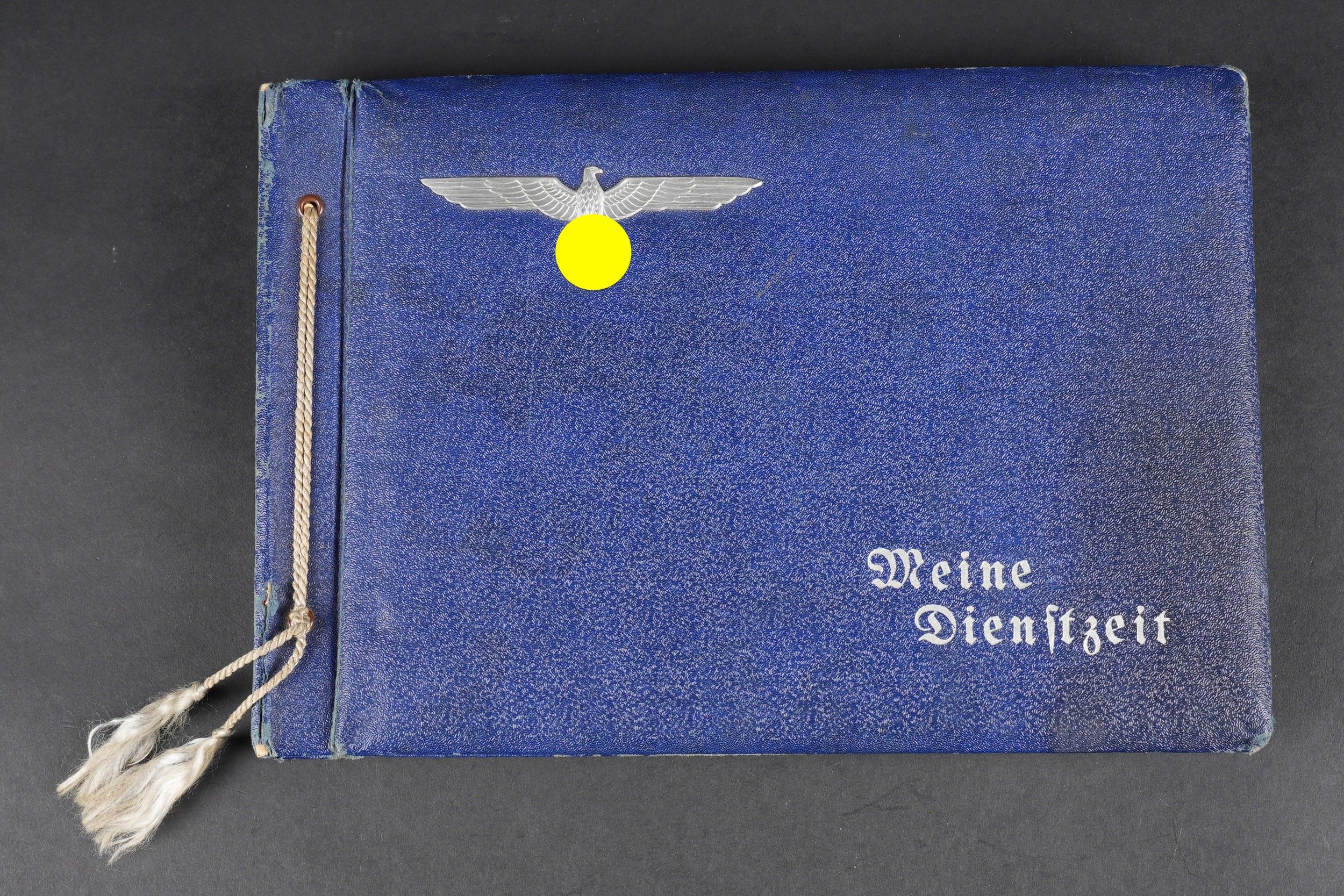 Luftwaffe and Heer photo album. Cover in blue imitation leather. Nice metal Heer eagle, officer model, mention Meine Dienstzeit. The string holding the pages is present, but frayed. Contains approximately 91 photographs. Numerous views in barracks, but also during campaigns. Some photos of an officer on horseback, but also in the company of his men. Some views of vehicles. Typical album of the French campaign, we can distinguish signposts such as Senlis and Paris. The Luftwaffe photos are of the 24th Flak Division. Some photos of musicians and orchestras. A photo of Valencienne station. A photo with a sign of the Fliegerhorst Kommandantur Oldenburg. Some wear and patina to be noted. Condition II+. Luftwaffe and Heer photo album. Blue imitation-leather cover with metal Heer officer's eagle and the title Meine Dienstzeit. Binding cord present but frayed. Contains approximately 91 photographs, including barracks life, field scenes, officers on horseback, soldiers, and vehicles. Typical France campaign album with road signs for Senlis and Paris. Luftwaffe photos relate to the 24th Flak Division. Includes musicians, orchestra scenes, Valenciennes railway station, and a sign Fliegerhorst Kommandantur Oldenburg. Shows wear and patina. Condition II+.