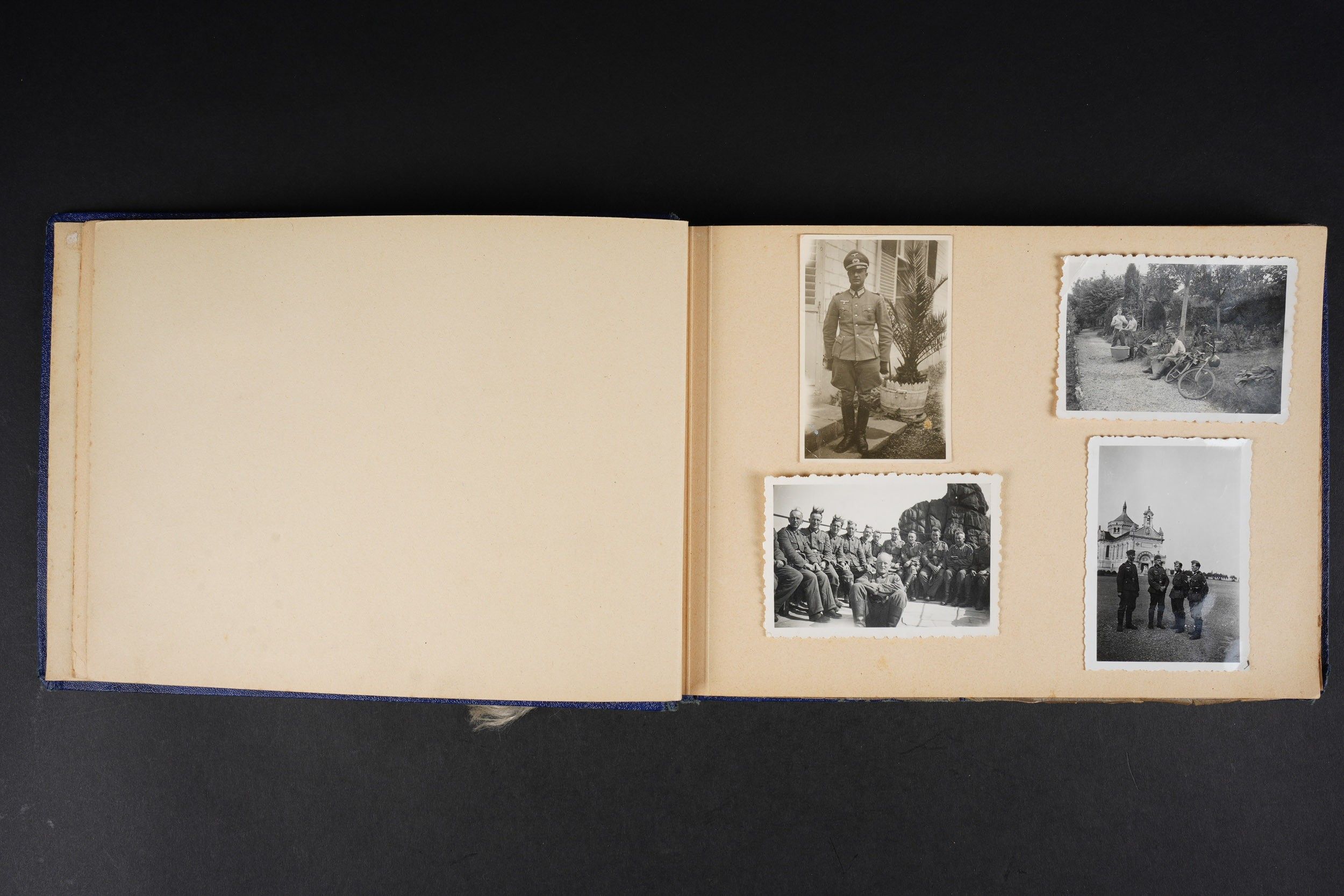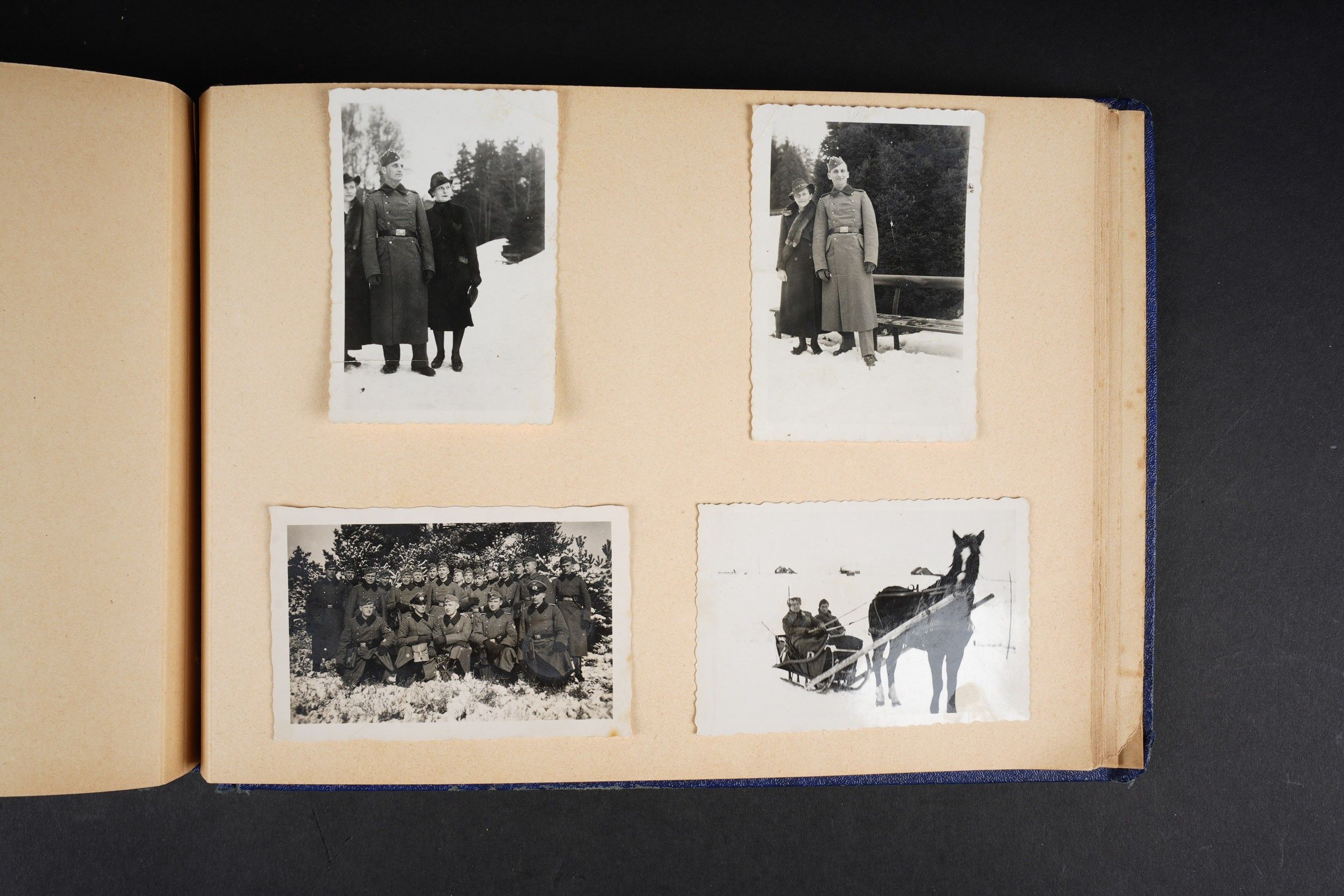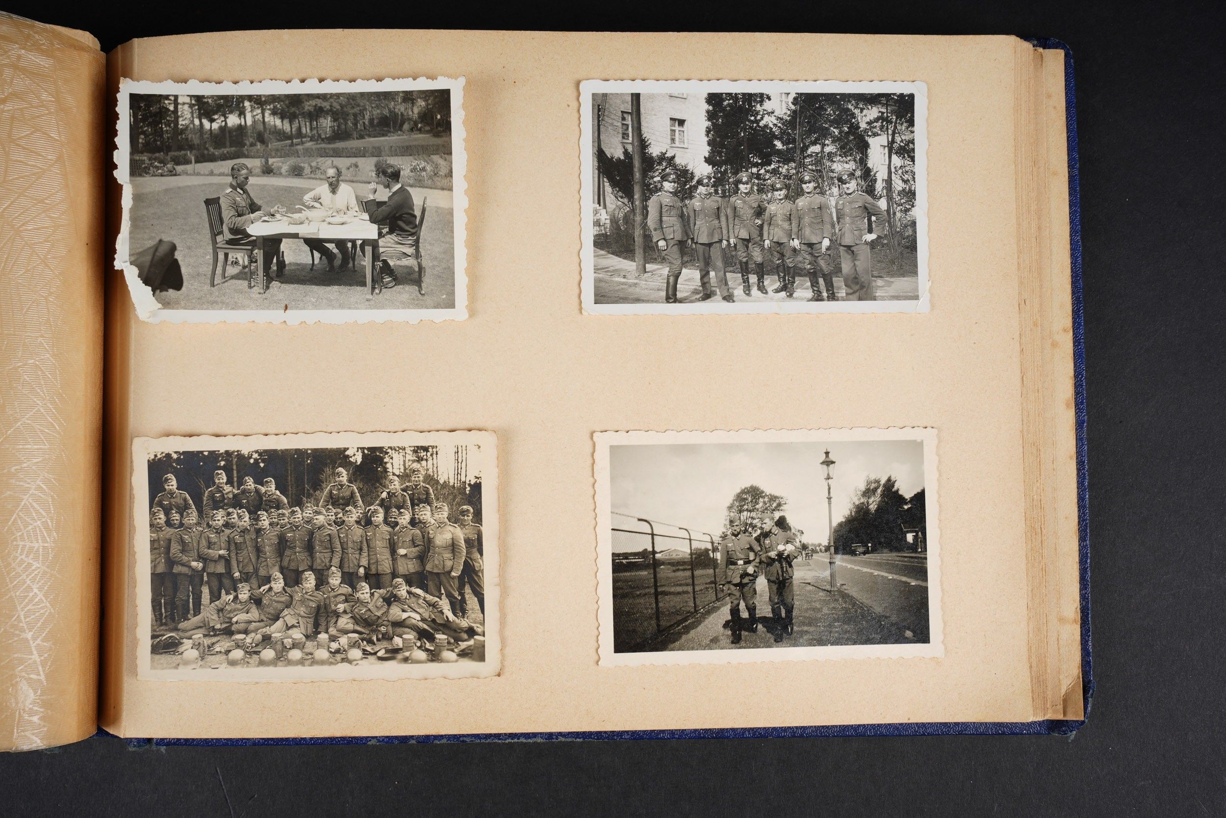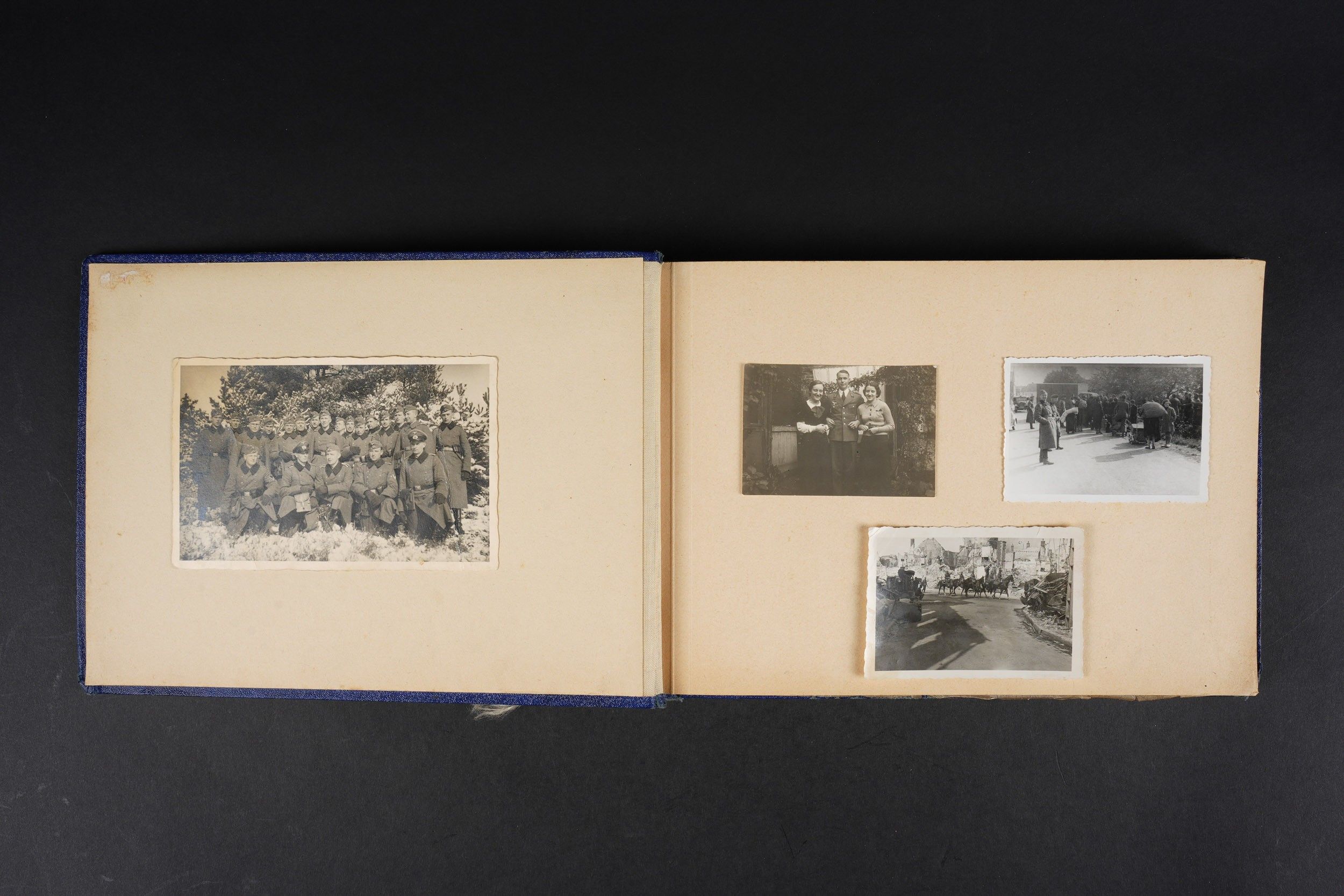 Luftwaffe and Heer photo album. Cover in blue imitation leather. Nice metal Heer eagle, officer model, mention Meine Dienstzeit. The string holding the pages is present, but frayed. Contains approximately 91 photographs. Numerous views in barracks, but also during campaigns. Some photos of an officer on horseback, but also in the company of his men. Some views of vehicles. Typical album of the French campaign, we can distinguish signposts such as Senlis and Paris. The Luftwaffe photos are of the 24th Flak Division. Some photos of musicians and orchestras. A photo of Valencienne station. A photo with a sign of the Fliegerhorst Kommandantur Oldenburg. Some wear and patina to be noted. Condition II+. Luftwaffe and Heer photo album. Blue imitation-leather cover with metal Heer officer's eagle and the title Meine Dienstzeit. Binding cord present but frayed. Contains approximately 91 photographs, including barracks life, field scenes, officers on horseback, soldiers, and vehicles. Typical France campaign album with road signs for Senlis and Paris. Luftwaffe photos relate to the 24th Flak Division. Includes musicians, orchestra scenes, Valenciennes railway station, and a sign Fliegerhorst Kommandantur Oldenburg. Shows wear and patina. Condition II+.