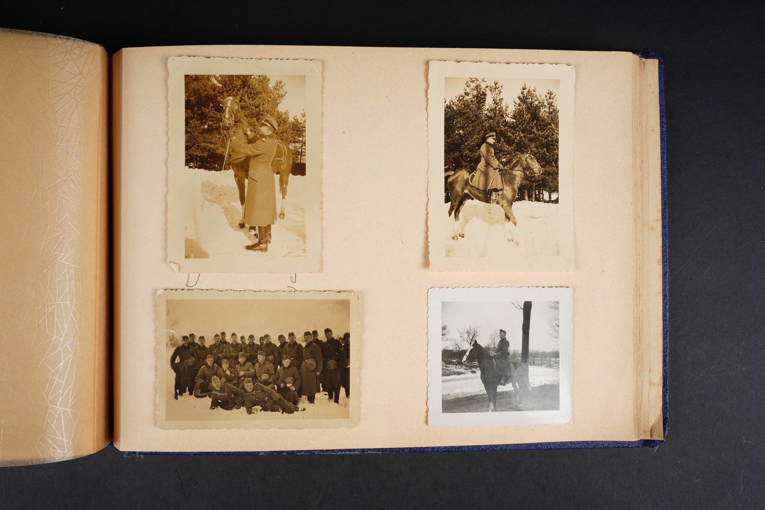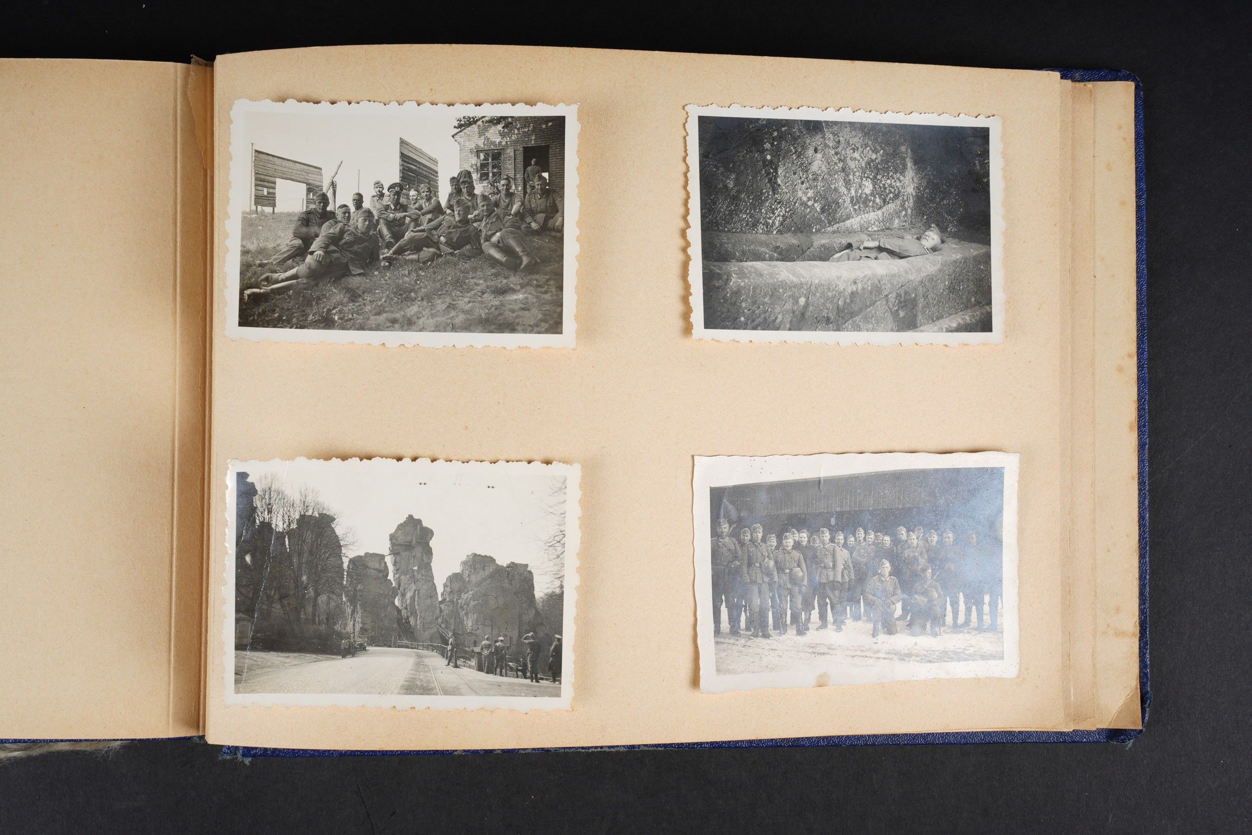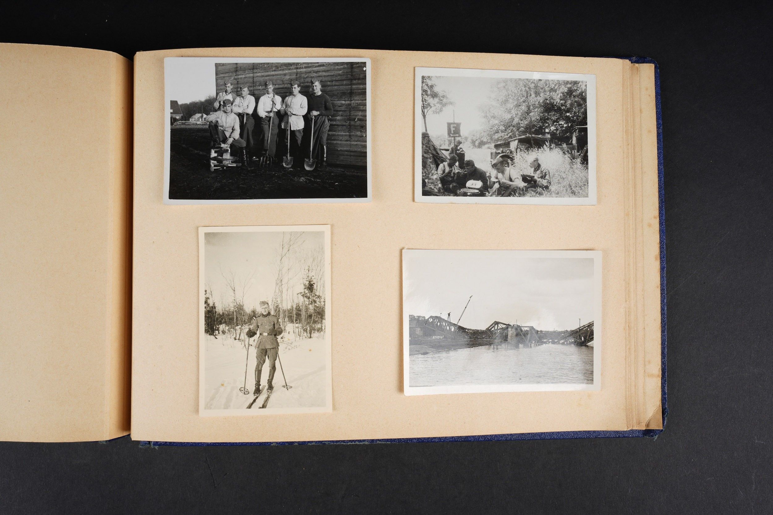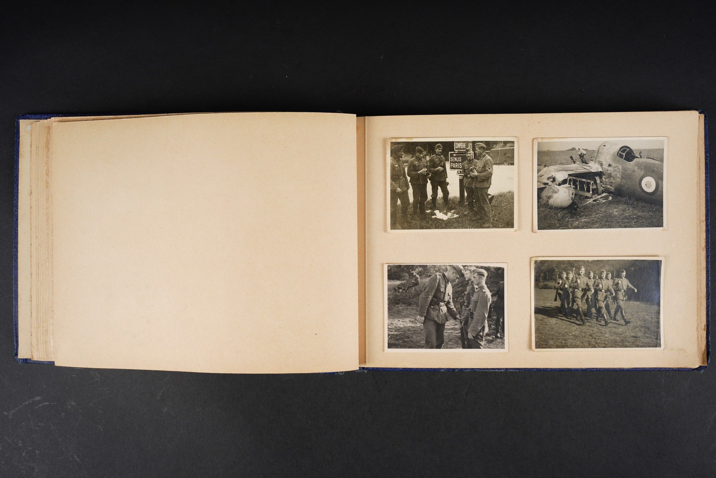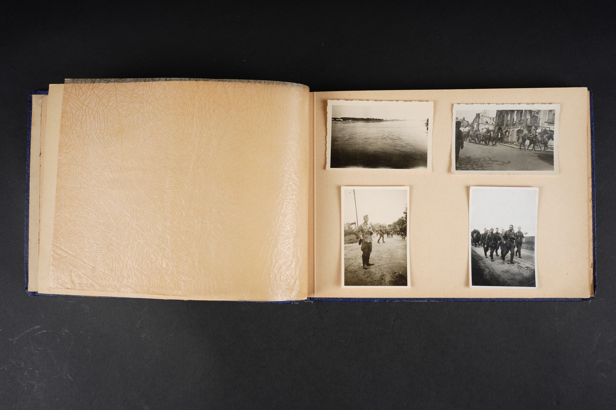 Luftwaffe and Heer photo album. Cover in blue imitation leather. Nice metal Heer eagle, officer model, mention Meine Dienstzeit. The string holding the pages is present, but frayed. Contains approximately 91 photographs. Numerous views in barracks, but also during campaigns. Some photos of an officer on horseback, but also in the company of his men. Some views of vehicles. Typical album of the French campaign, we can distinguish signposts such as Senlis and Paris. The Luftwaffe photos are of the 24th Flak Division. Some photos of musicians and orchestras. A photo of Valencienne station. A photo with a sign of the Fliegerhorst Kommandantur Oldenburg. Some wear and patina to be noted. Condition II+. Luftwaffe and Heer photo album. Blue imitation-leather cover with metal Heer officer's eagle and the title Meine Dienstzeit. Binding cord present but frayed. Contains approximately 91 photographs, including barracks life, field scenes, officers on horseback, soldiers, and vehicles. Typical France campaign album with road signs for Senlis and Paris. Luftwaffe photos relate to the 24th Flak Division. Includes musicians, orchestra scenes, Valenciennes railway station, and a sign Fliegerhorst Kommandantur Oldenburg. Shows wear and patina. Condition II+.