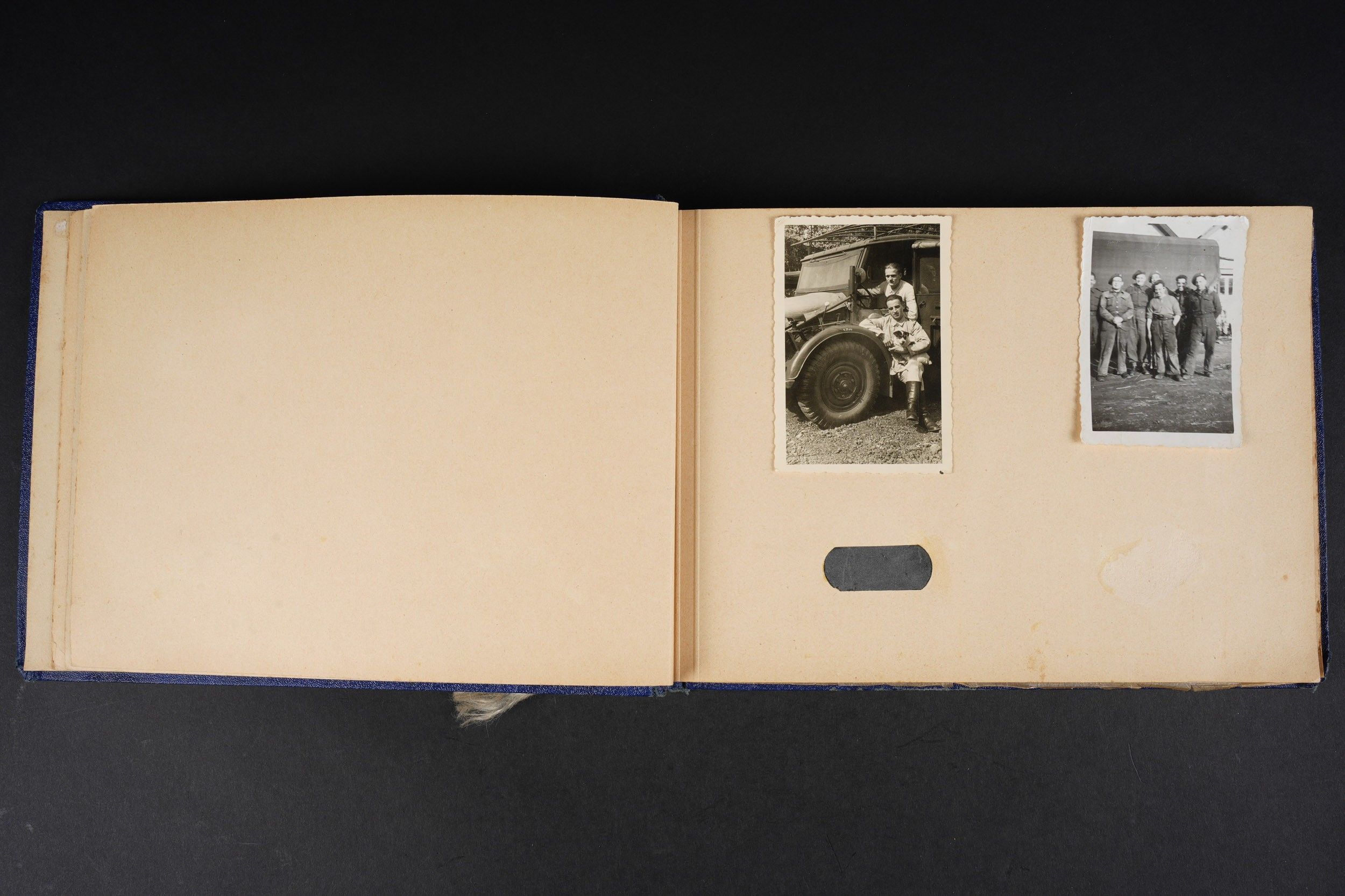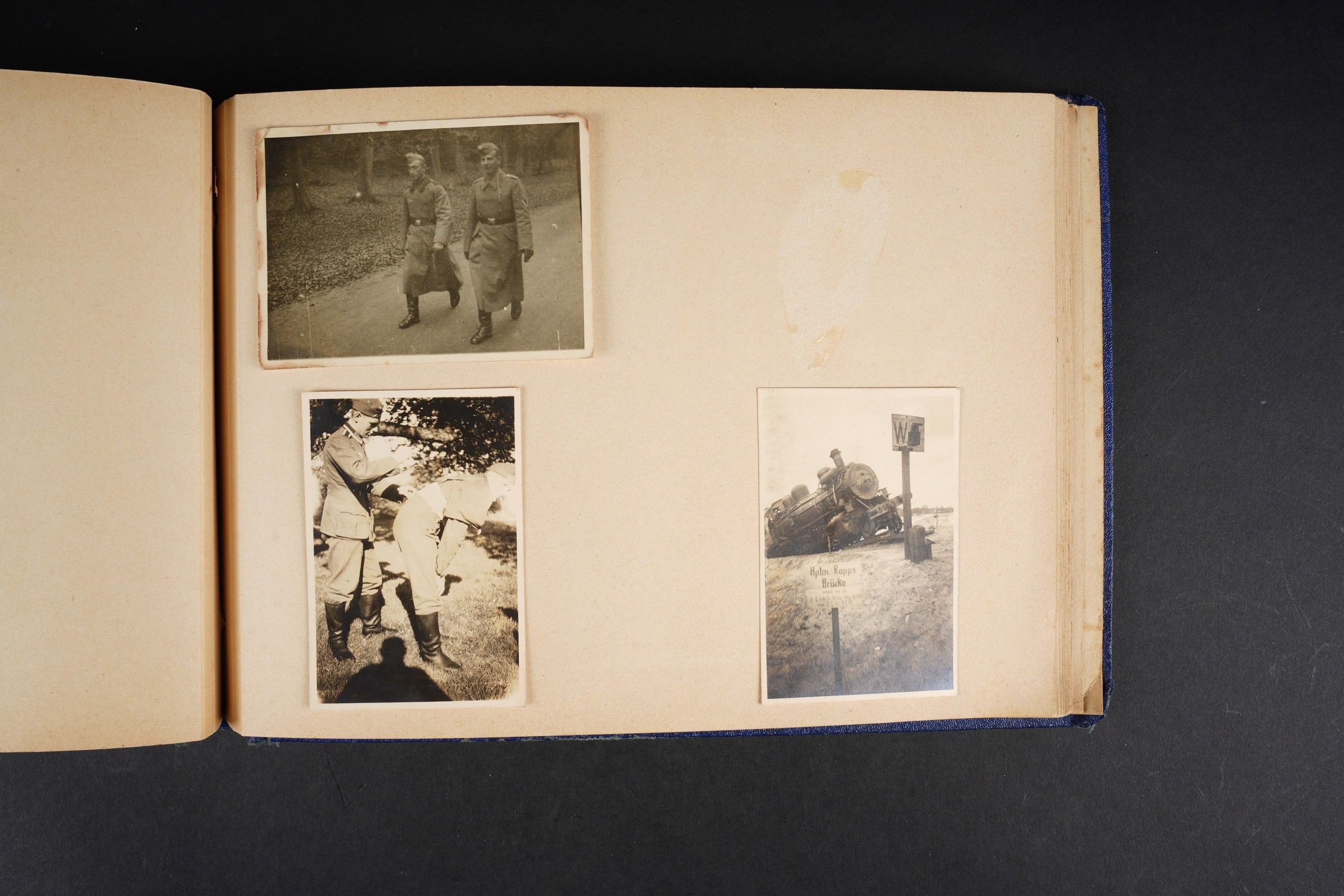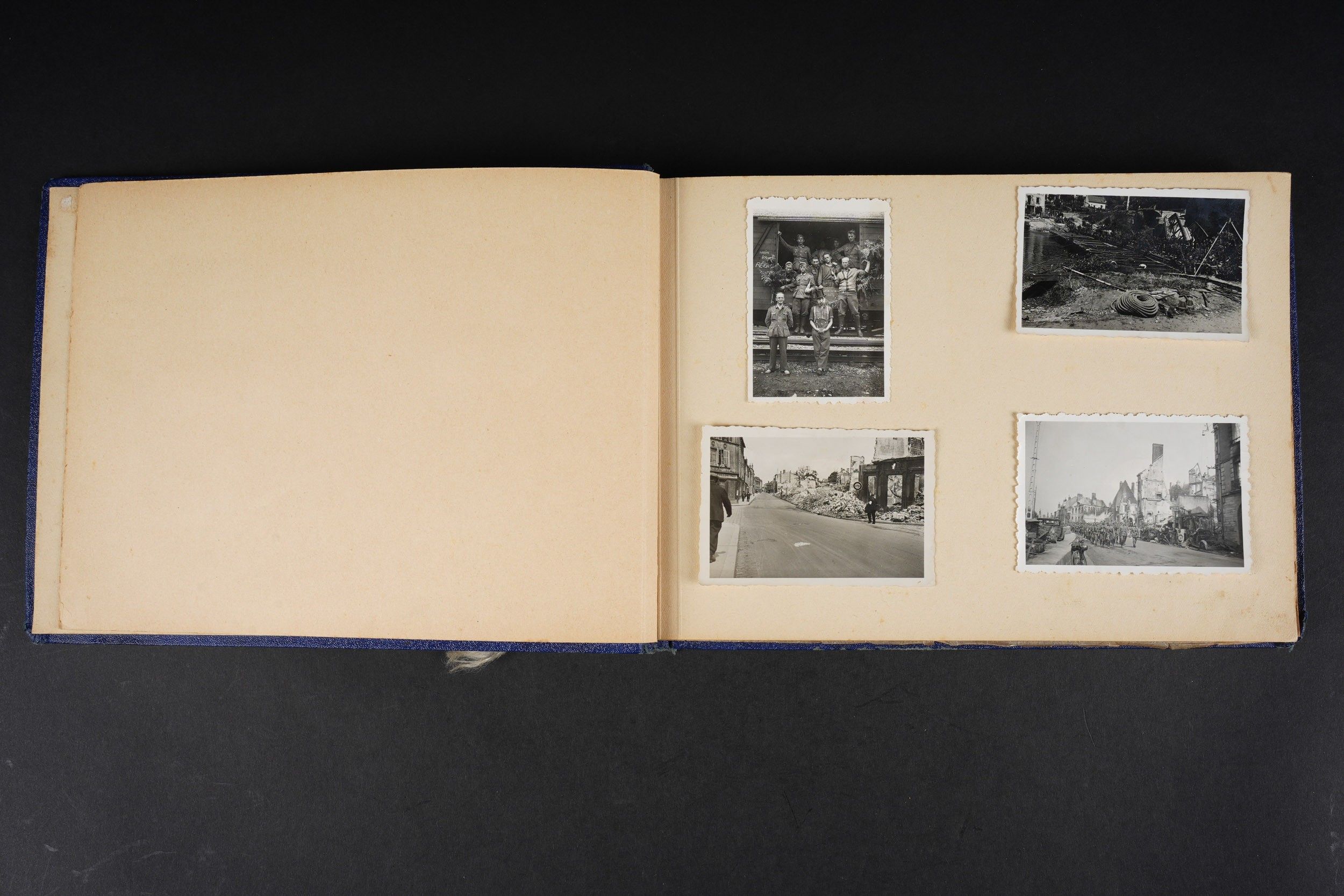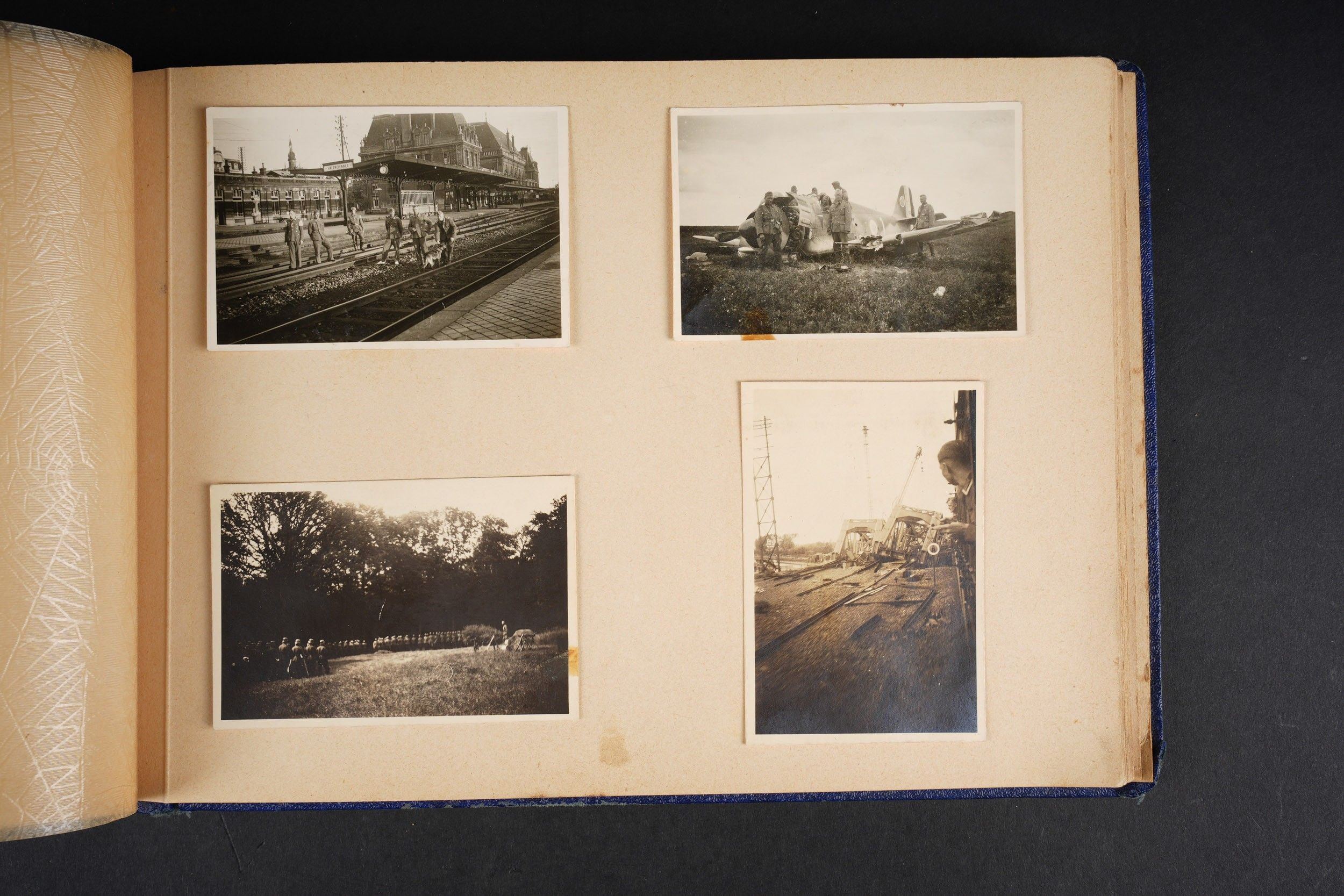 Luftwaffe and Heer photo album. Cover in blue imitation leather. Nice metal Heer eagle, officer model, mention Meine Dienstzeit. The string holding the pages is present, but frayed. Contains approximately 91 photographs. Numerous views in barracks, but also during campaigns. Some photos of an officer on horseback, but also in the company of his men. Some views of vehicles. Typical album of the French campaign, we can distinguish signposts such as Senlis and Paris. The Luftwaffe photos are of the 24th Flak Division. Some photos of musicians and orchestras. A photo of Valencienne station. A photo with a sign of the Fliegerhorst Kommandantur Oldenburg. Some wear and patina to be noted. Condition II+. Luftwaffe and Heer photo album. Blue imitation-leather cover with metal Heer officer's eagle and the title Meine Dienstzeit. Binding cord present but frayed. Contains approximately 91 photographs, including barracks life, field scenes, officers on horseback, soldiers, and vehicles. Typical France campaign album with road signs for Senlis and Paris. Luftwaffe photos relate to the 24th Flak Division. Includes musicians, orchestra scenes, Valenciennes railway station, and a sign Fliegerhorst Kommandantur Oldenburg. Shows wear and patina. Condition II+.