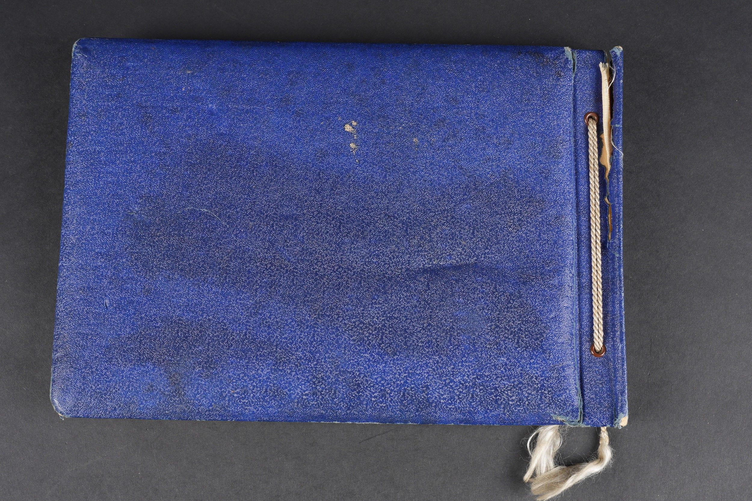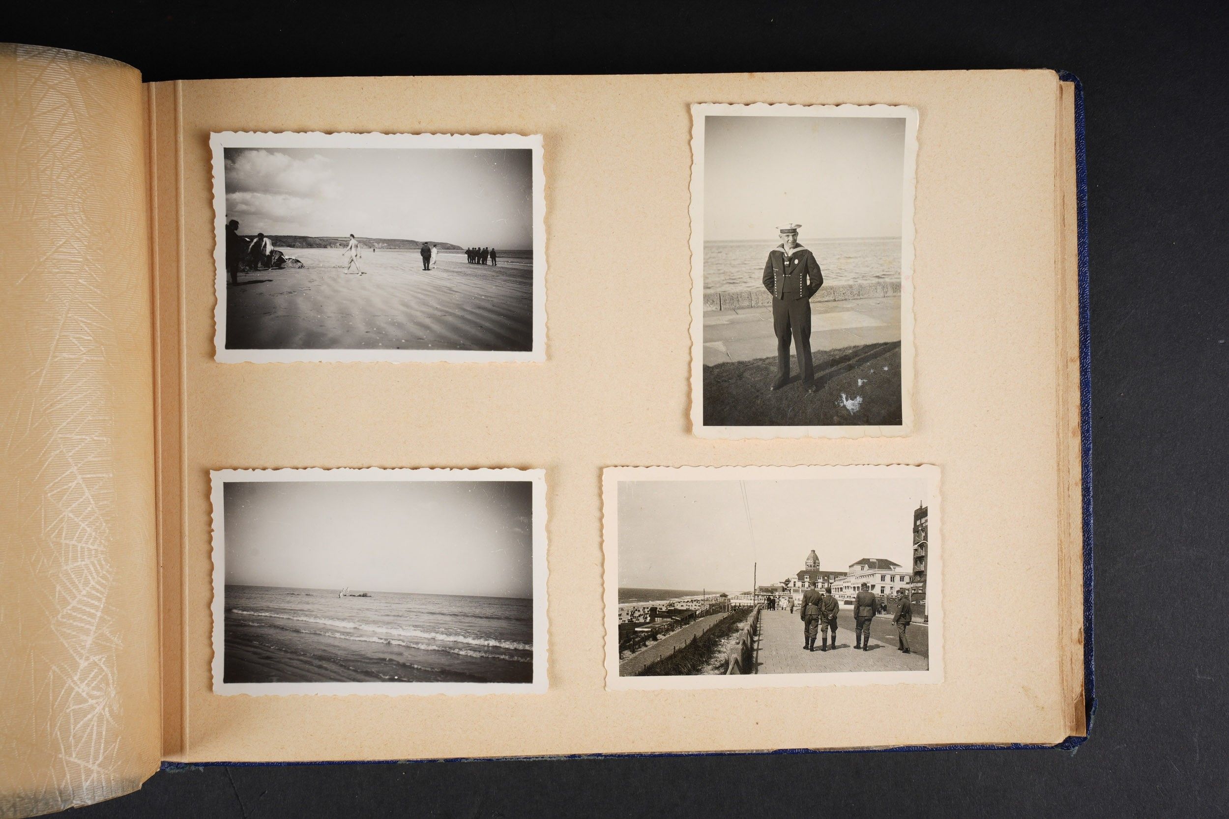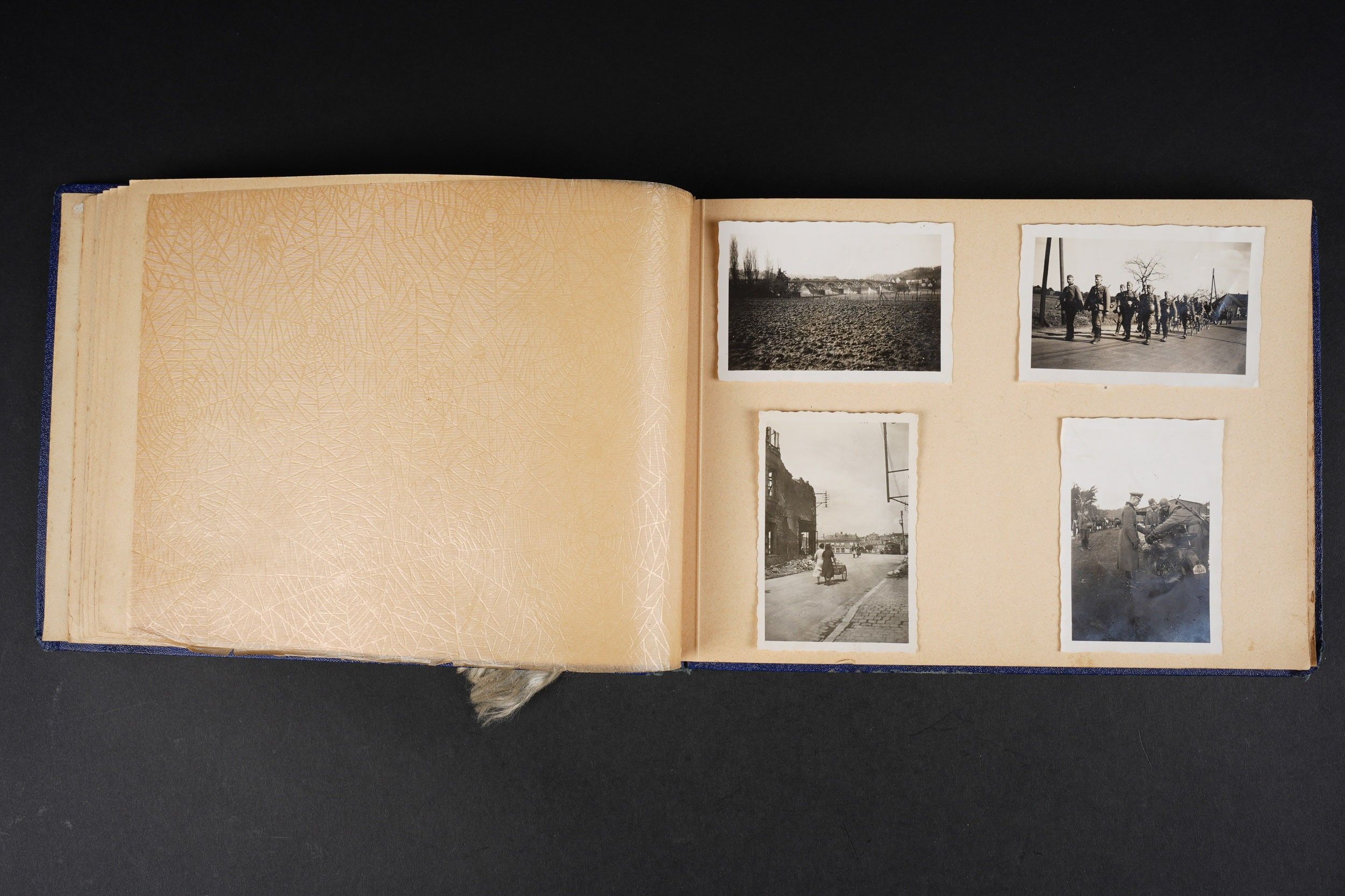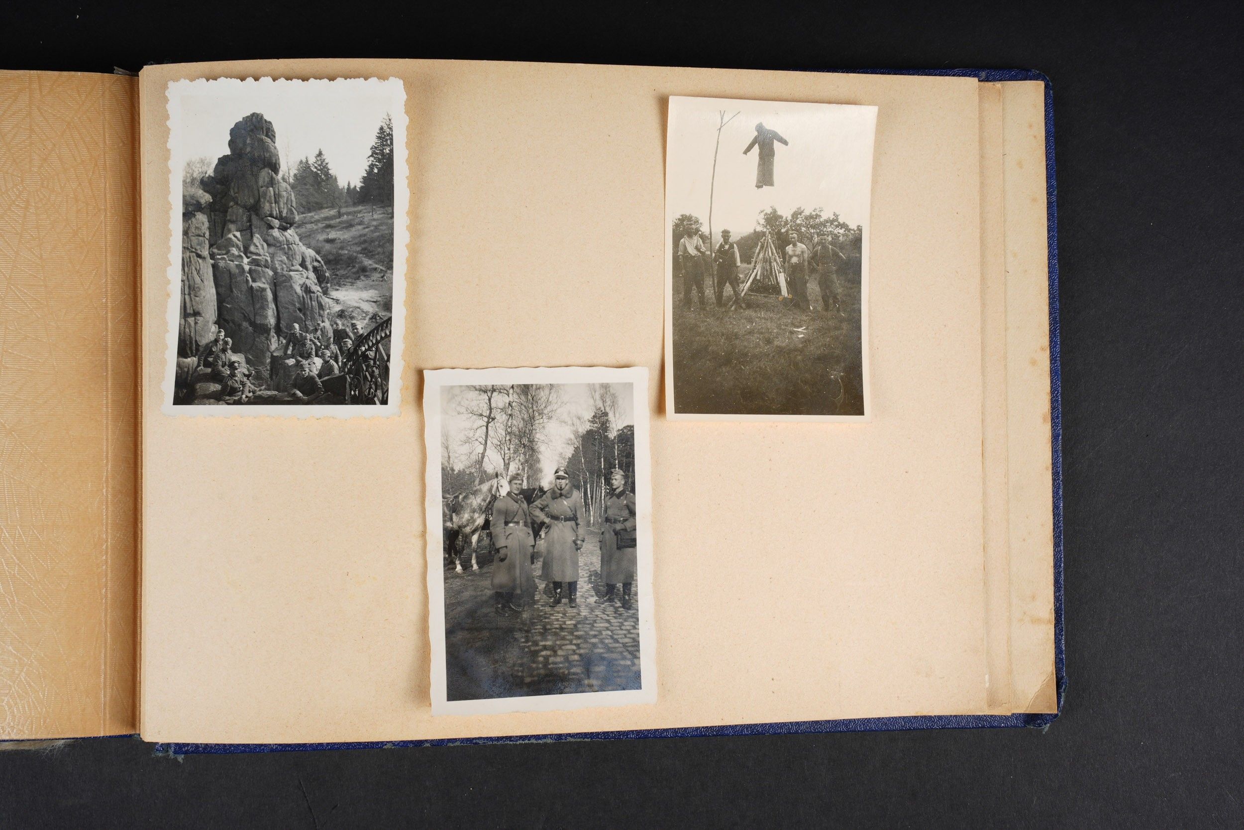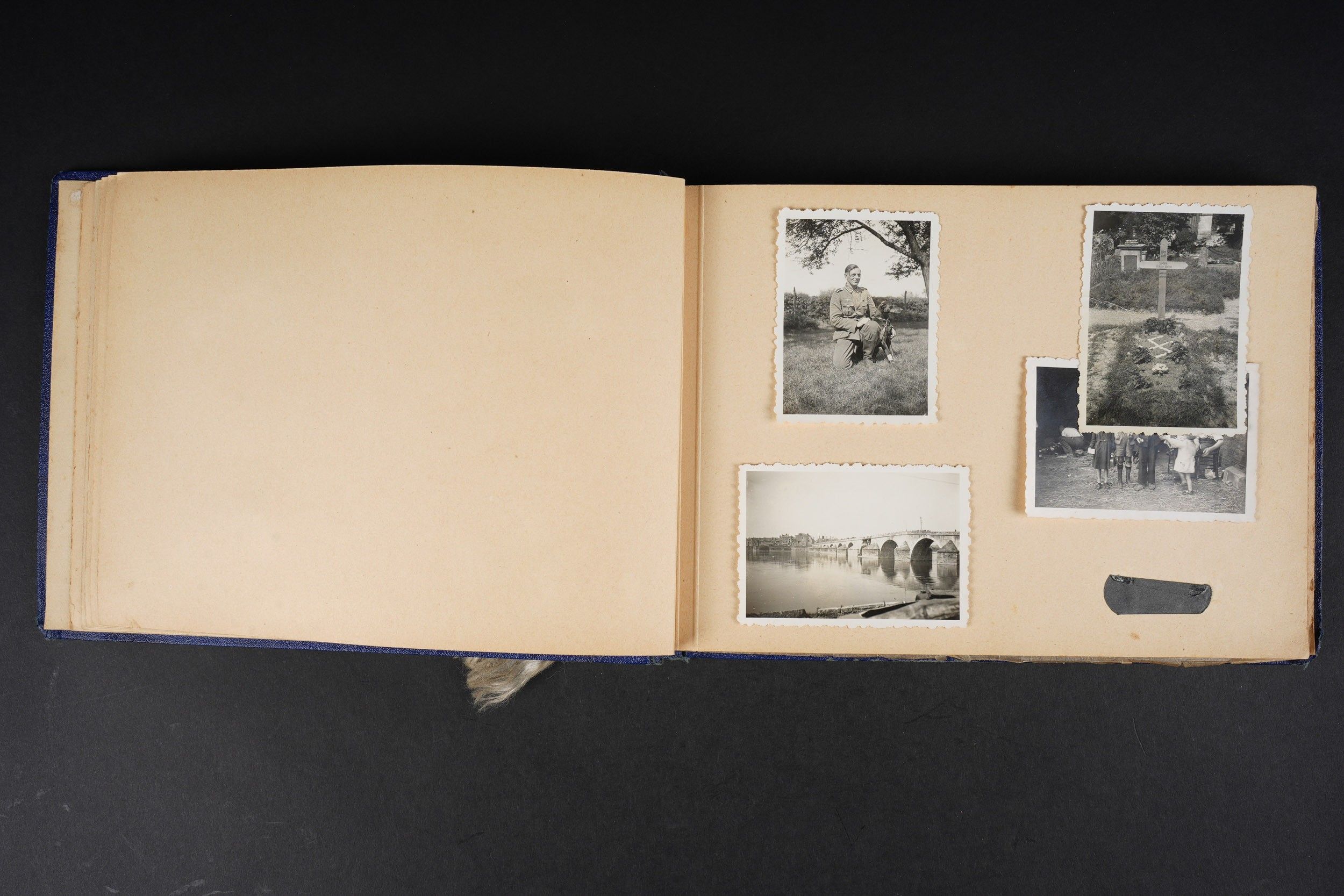 Luftwaffe and Heer photo album. Cover in blue imitation leather. Nice metal Heer eagle, officer model, mention Meine Dienstzeit. The string holding the pages is present, but frayed. Contains approximately 91 photographs. Numerous views in barracks, but also during campaigns. Some photos of an officer on horseback, but also in the company of his men. Some views of vehicles. Typical album of the French campaign, we can distinguish signposts such as Senlis and Paris. The Luftwaffe photos are of the 24th Flak Division. Some photos of musicians and orchestras. A photo of Valencienne station. A photo with a sign of the Fliegerhorst Kommandantur Oldenburg. Some wear and patina to be noted. Condition II+. Luftwaffe and Heer photo album. Blue imitation-leather cover with metal Heer officer's eagle and the title Meine Dienstzeit. Binding cord present but frayed. Contains approximately 91 photographs, including barracks life, field scenes, officers on horseback, soldiers, and vehicles. Typical France campaign album with road signs for Senlis and Paris. Luftwaffe photos relate to the 24th Flak Division. Includes musicians, orchestra scenes, Valenciennes railway station, and a sign Fliegerhorst Kommandantur Oldenburg. Shows wear and patina. Condition II+.