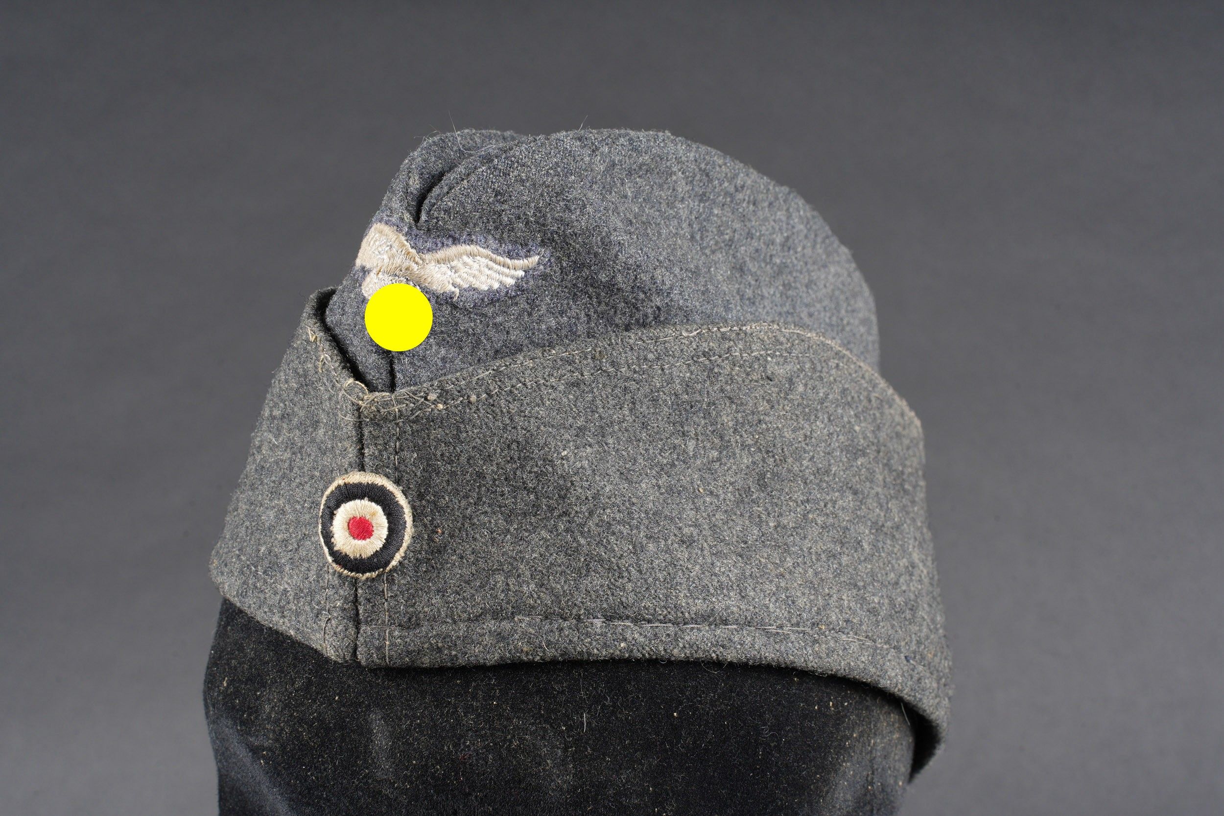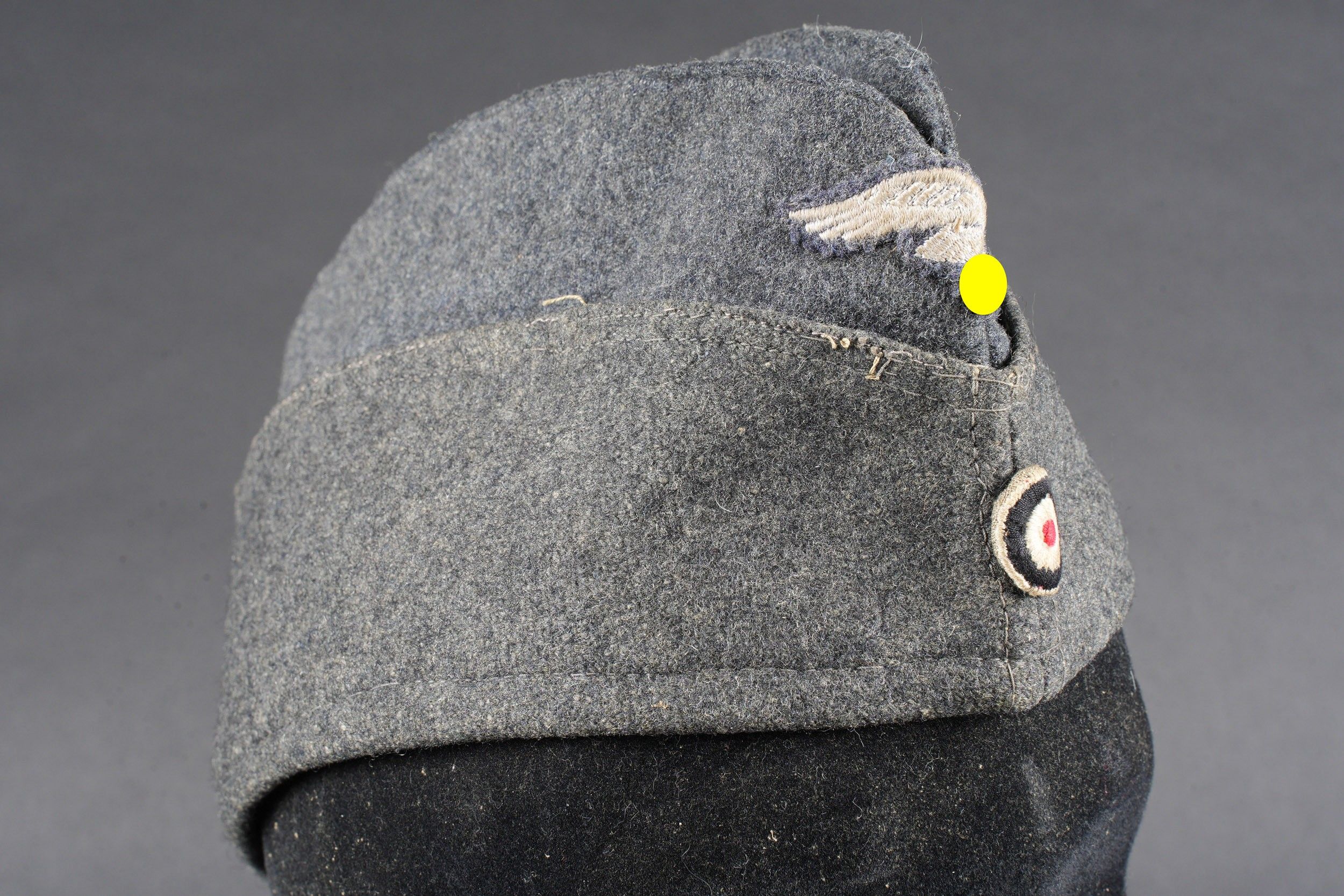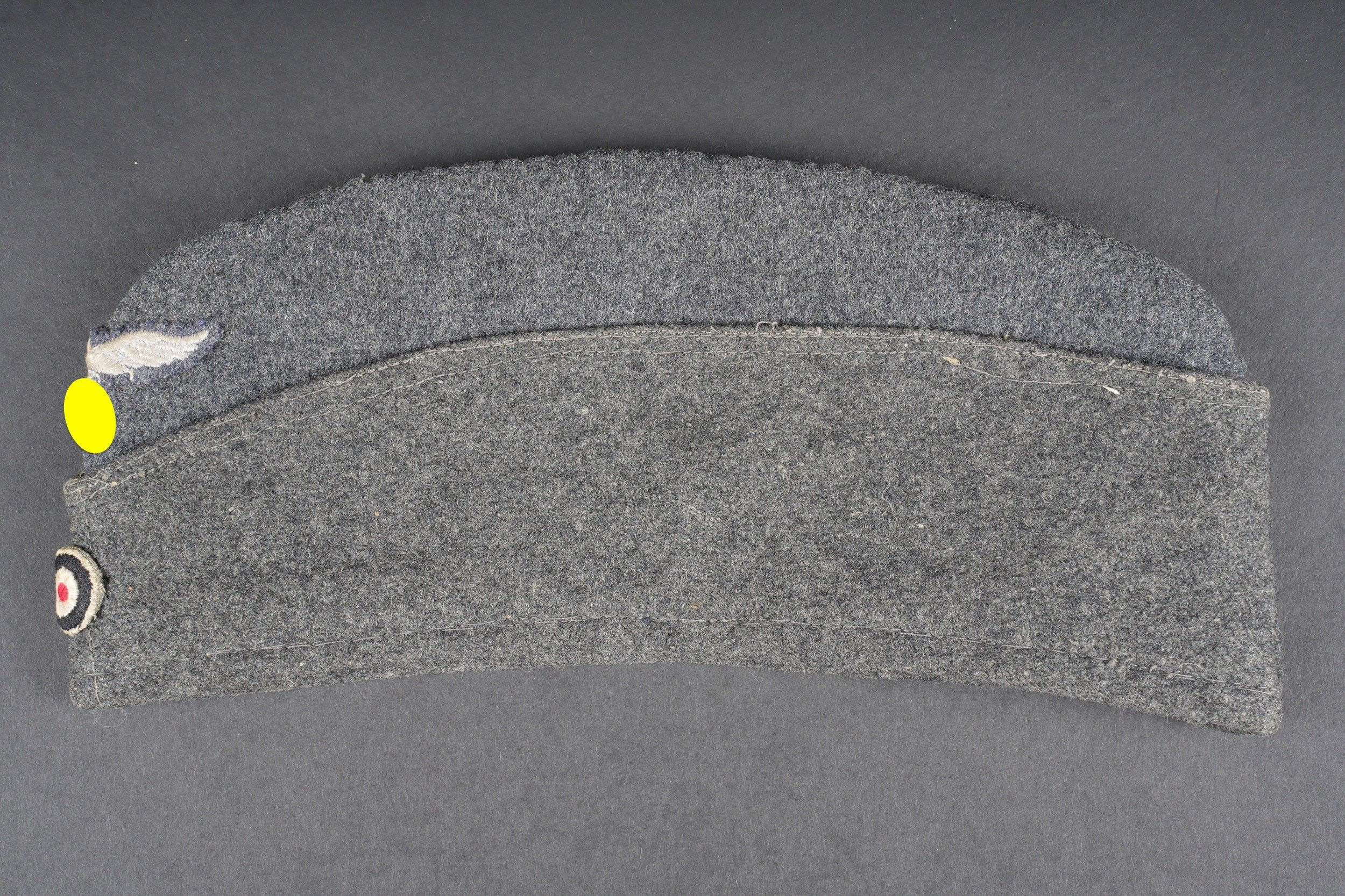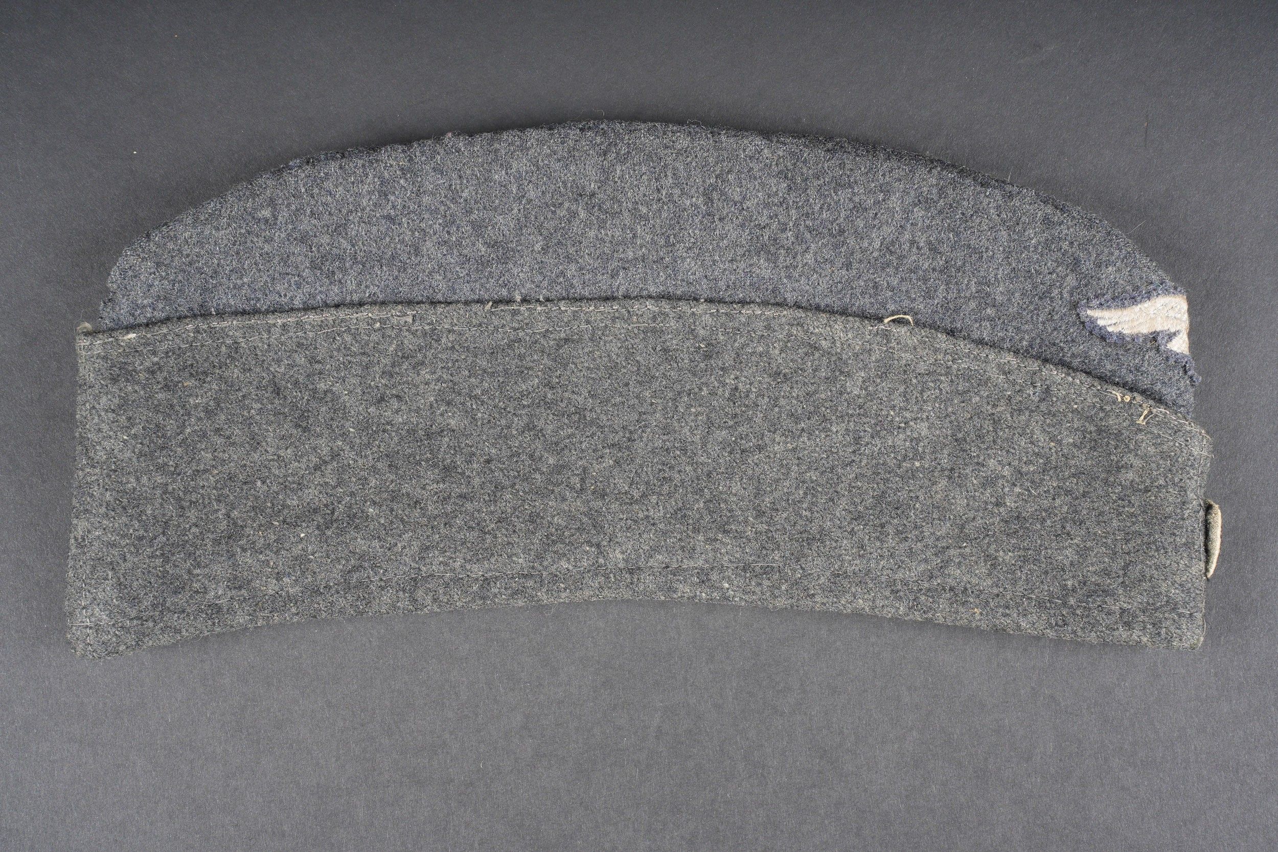 Luftwaffe cap. In grey/blue cloth. Hand-sewn embroidered eagle and roundel. Interior lined in blue cotton fabric. Handwritten marking 252. Some wear and patina. Condition II+. Luftwaffe side cap. Blue-grey wool. Hand-sewn embroidered eagle and cockade. Blue cotton lining. Handwritten marking 252. Shows wear and patina. Condition II+.