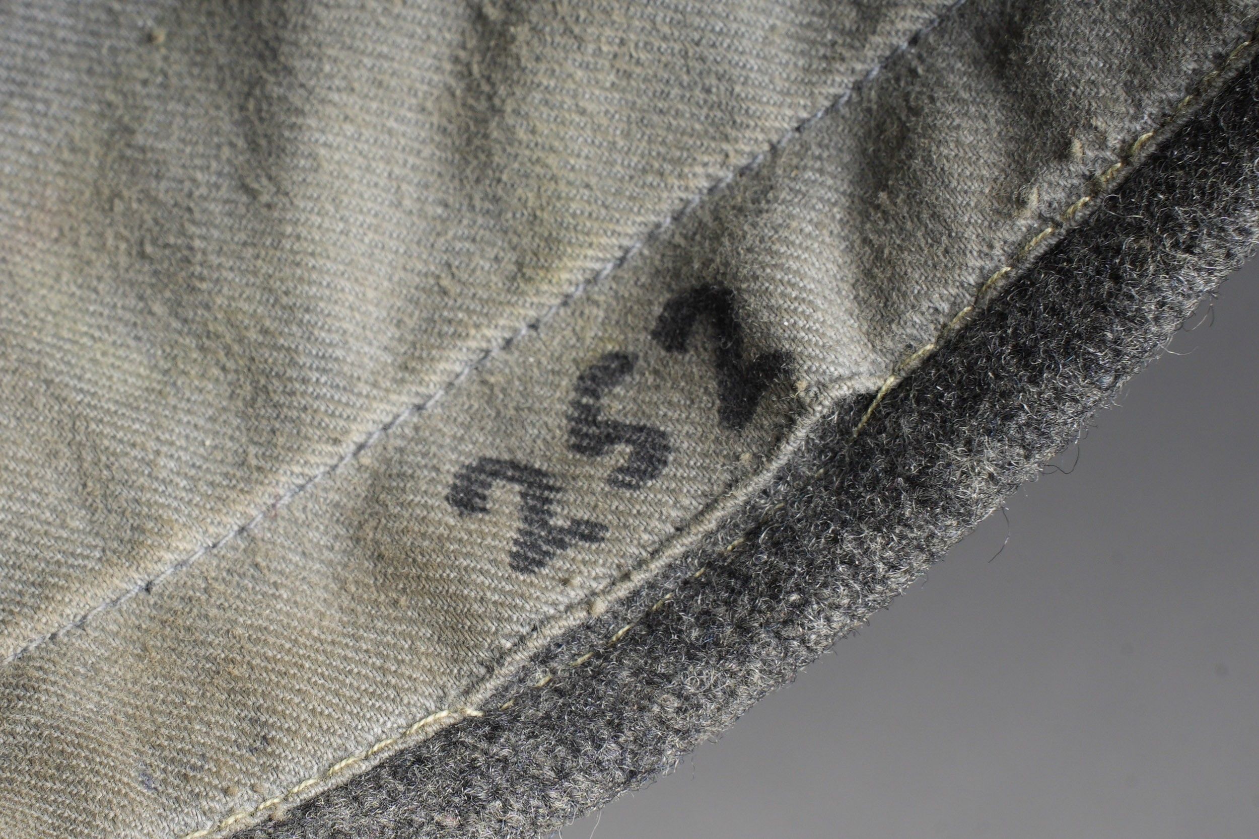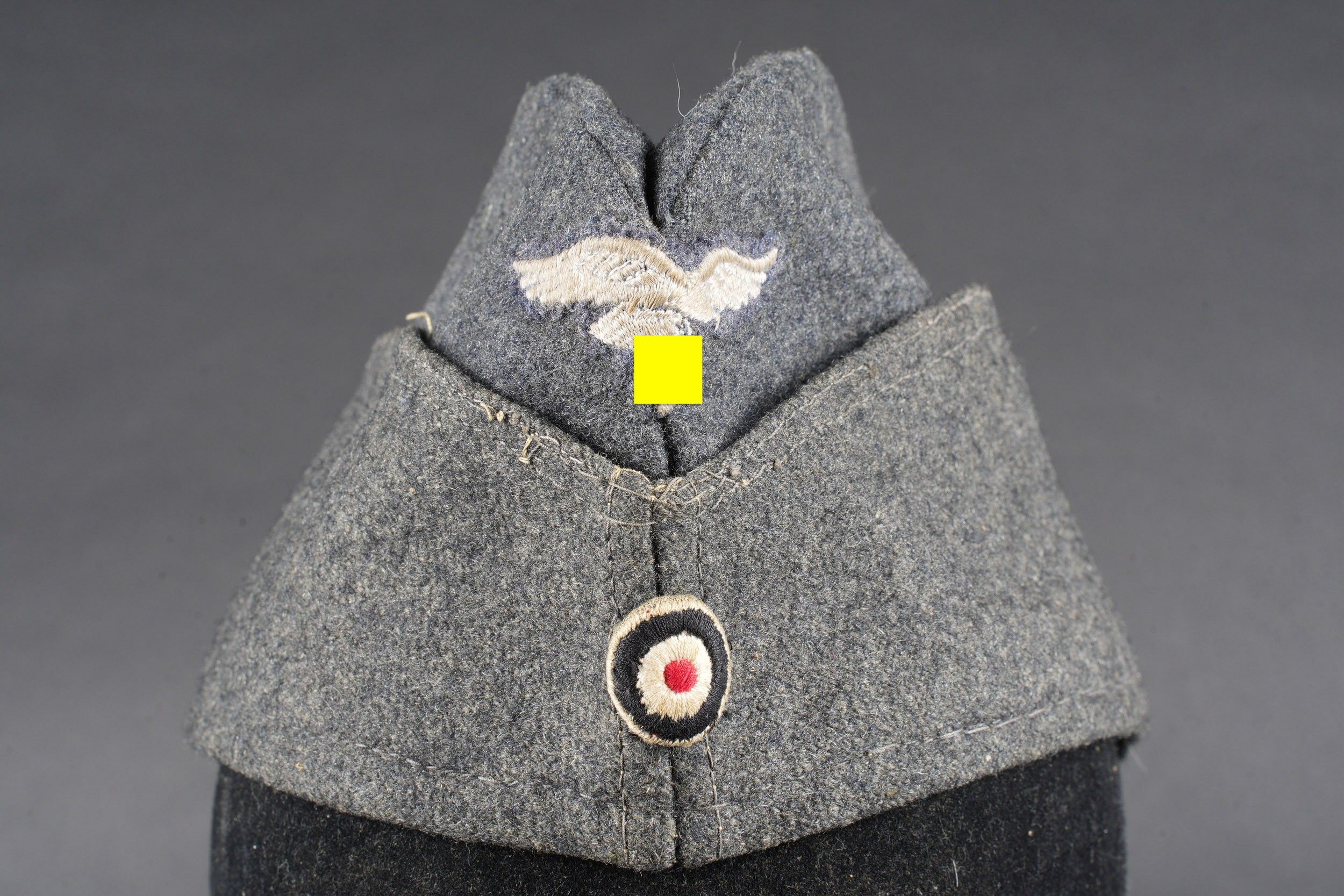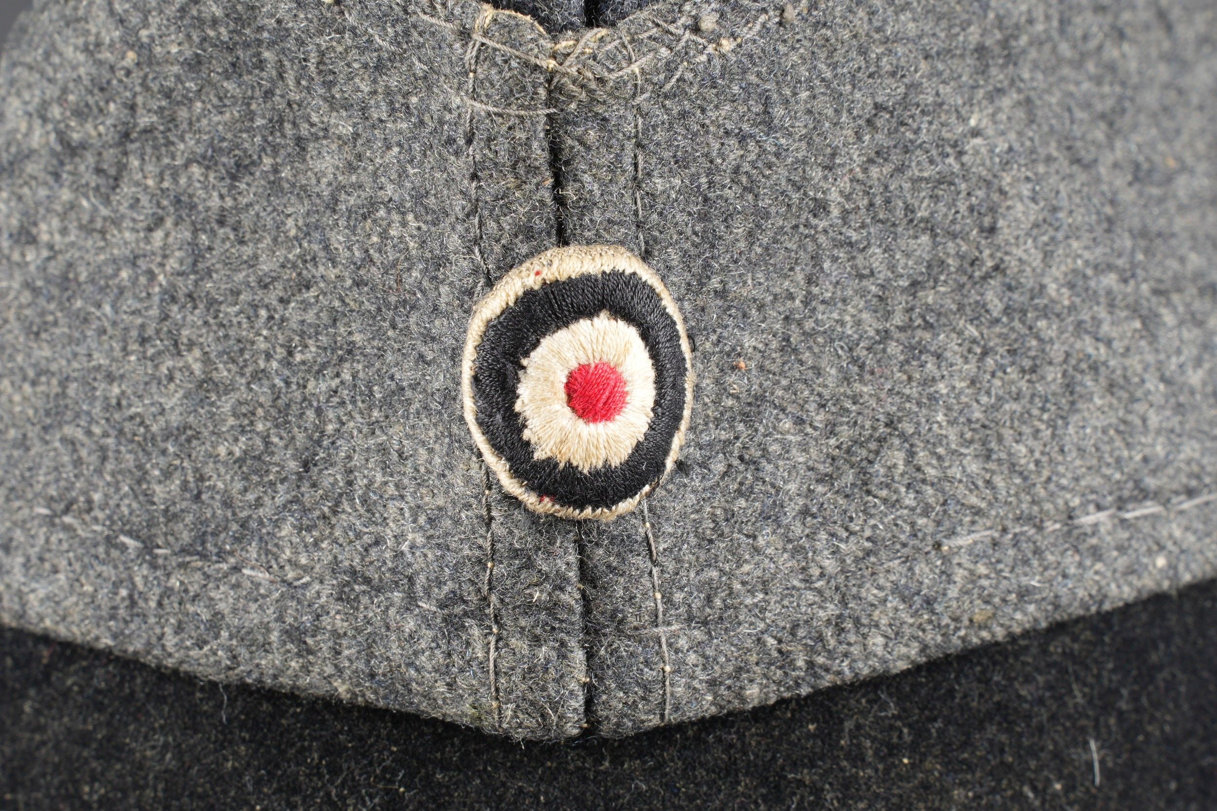 Luftwaffe cap. In grey/blue cloth. Hand-sewn embroidered eagle and roundel. Interior lined in blue cotton fabric. Handwritten marking 252. Some wear and patina. Condition II+. Luftwaffe side cap. Blue-grey wool. Hand-sewn embroidered eagle and cockade. Blue cotton lining. Handwritten marking 252. Shows wear and patina. Condition II+.