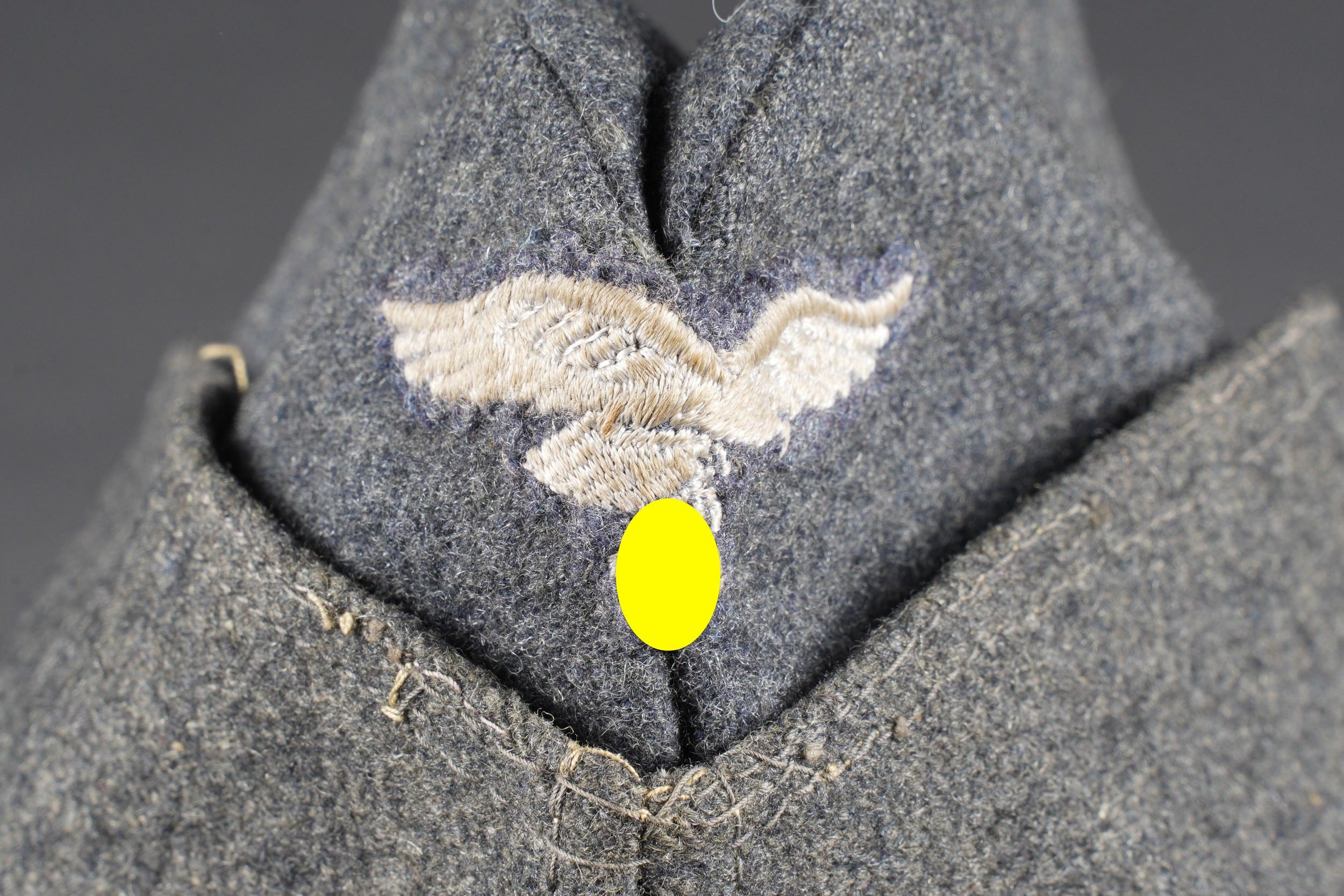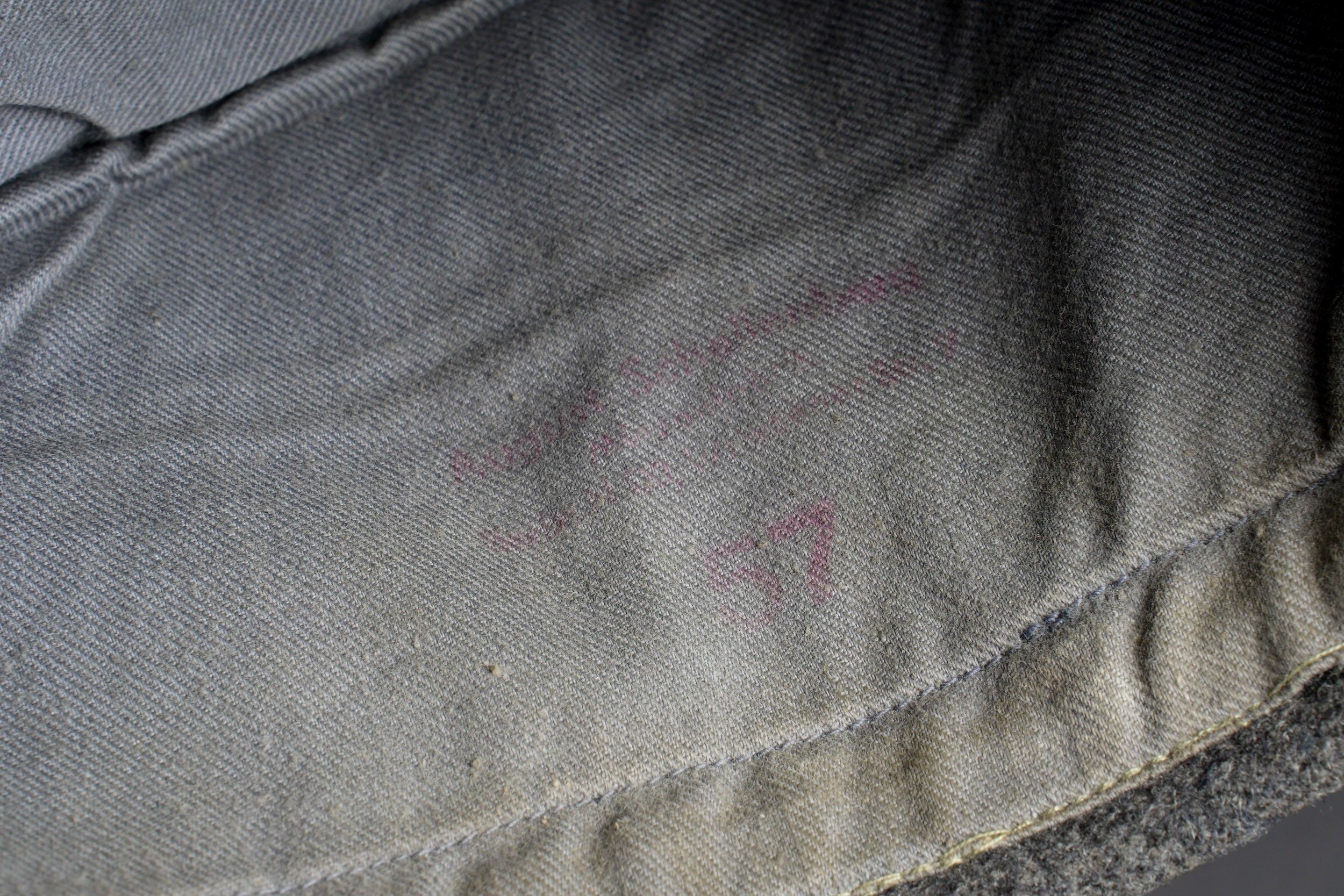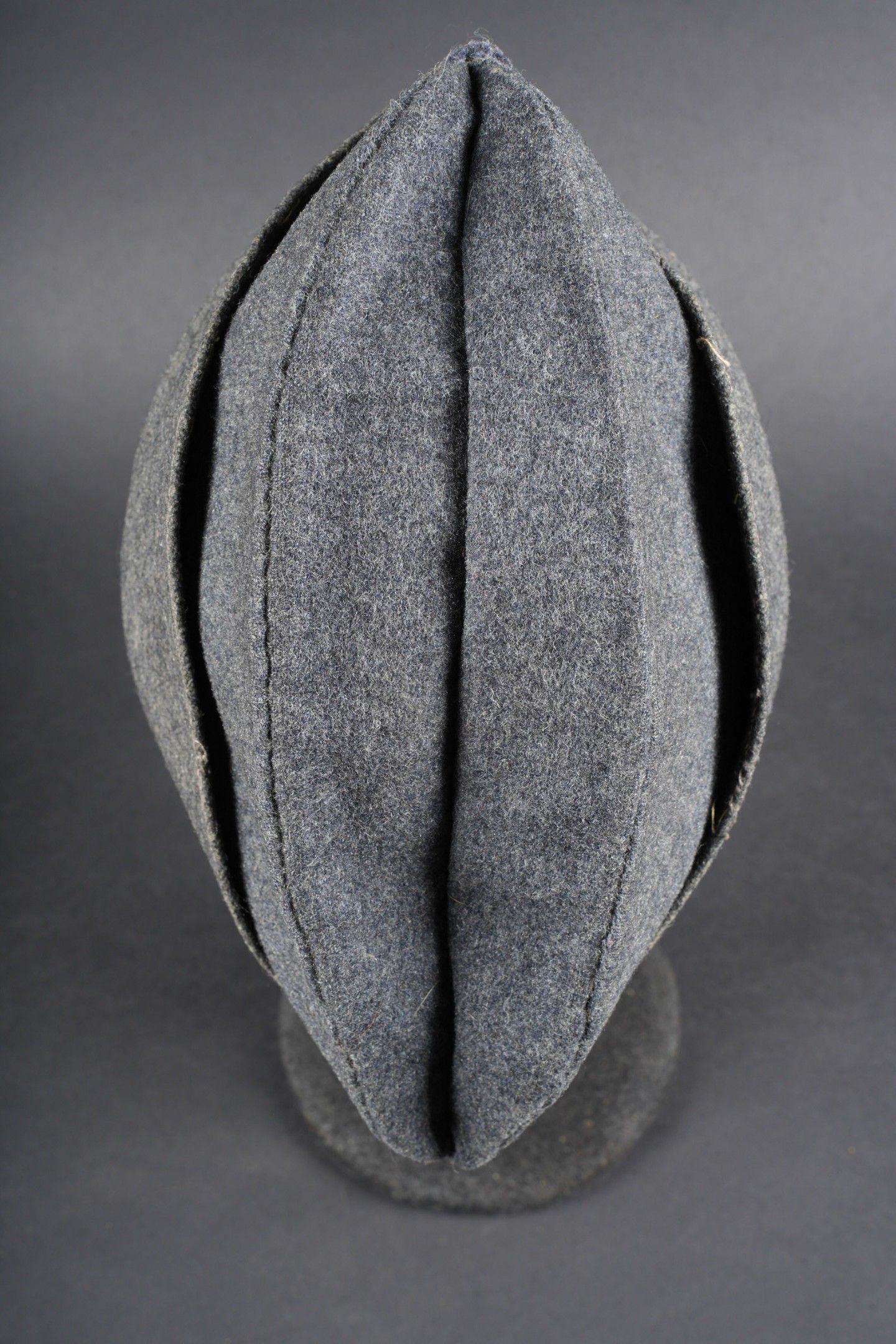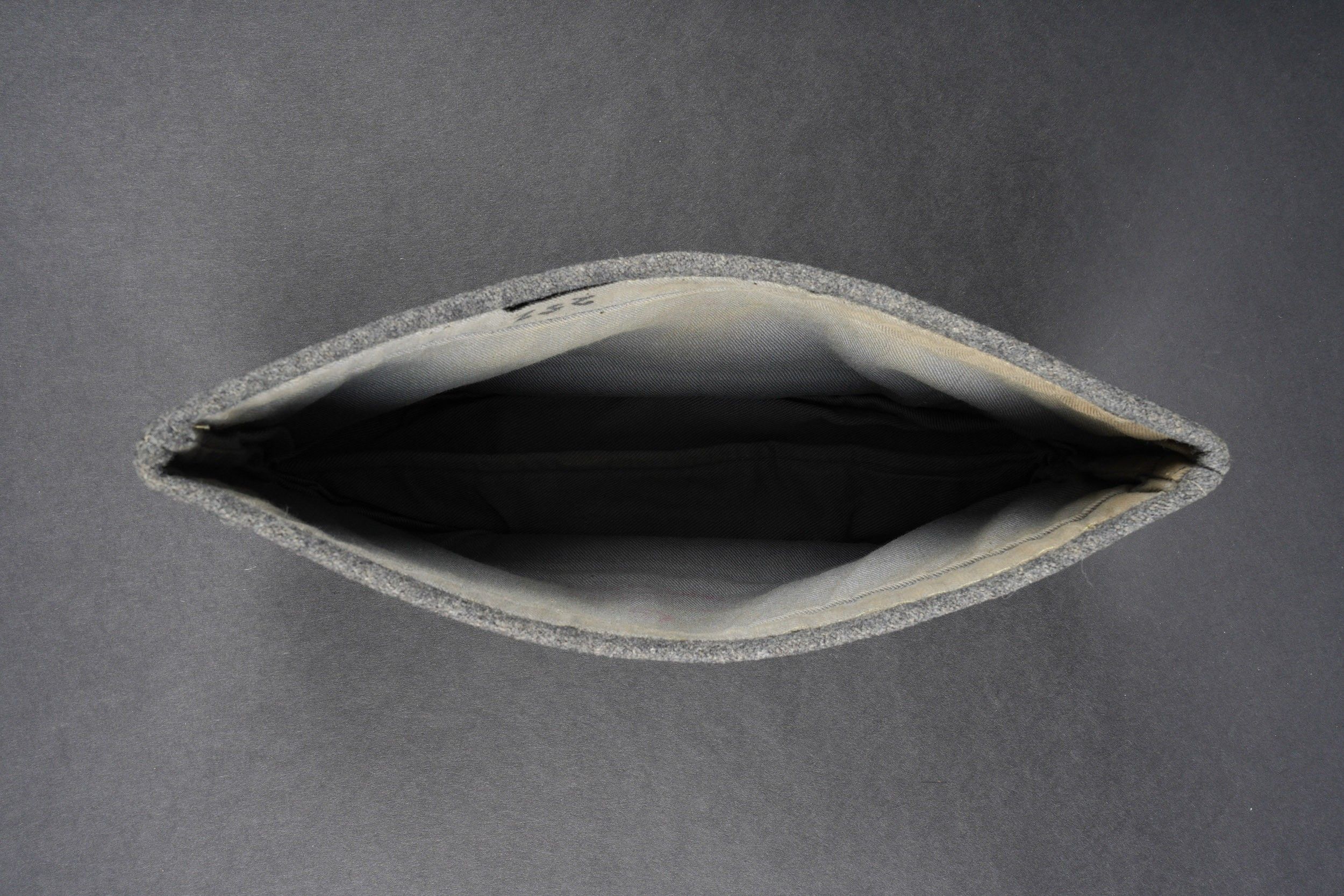 Luftwaffe cap. In grey/blue cloth. Hand-sewn embroidered eagle and roundel. Interior lined in blue cotton fabric. Handwritten marking 252. Some wear and patina. Condition II+. Luftwaffe side cap. Blue-grey wool. Hand-sewn embroidered eagle and cockade. Blue cotton lining. Handwritten marking 252. Shows wear and patina. Condition II+.
