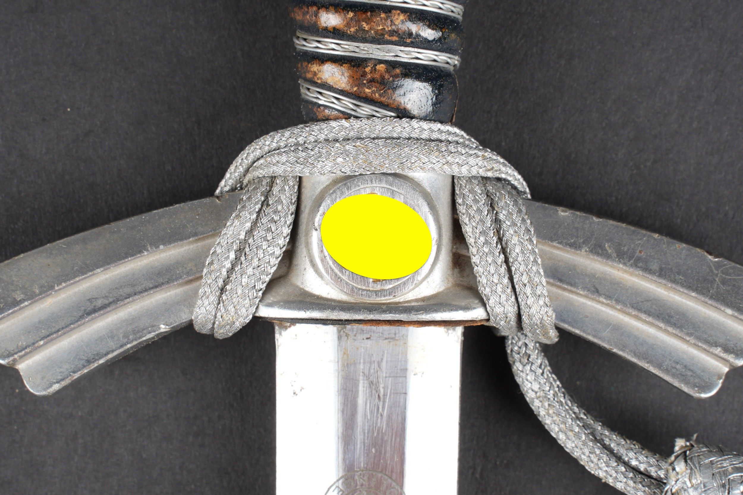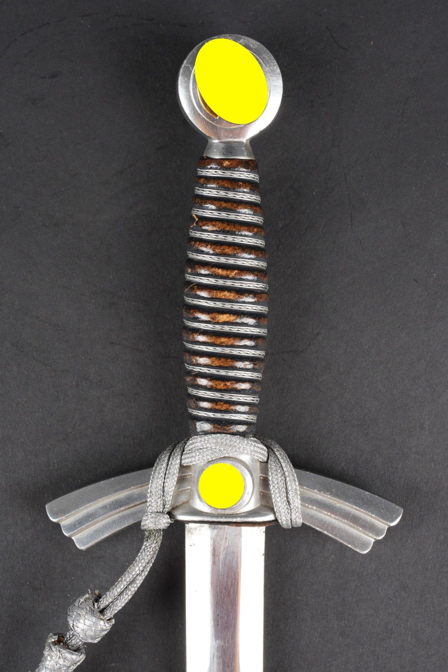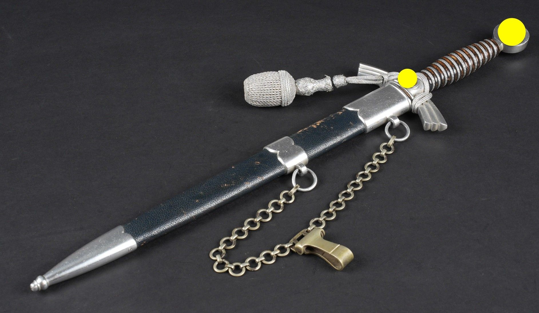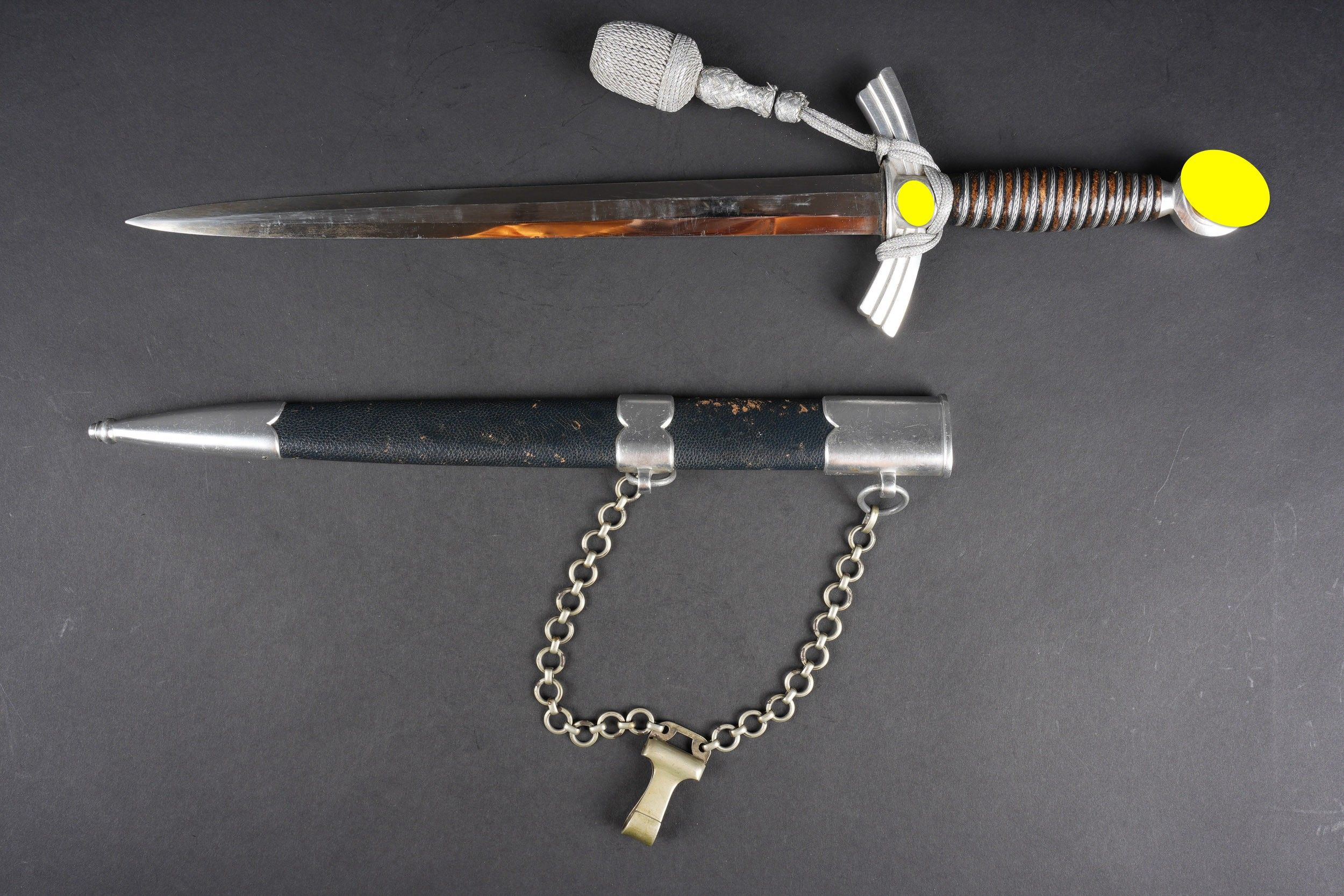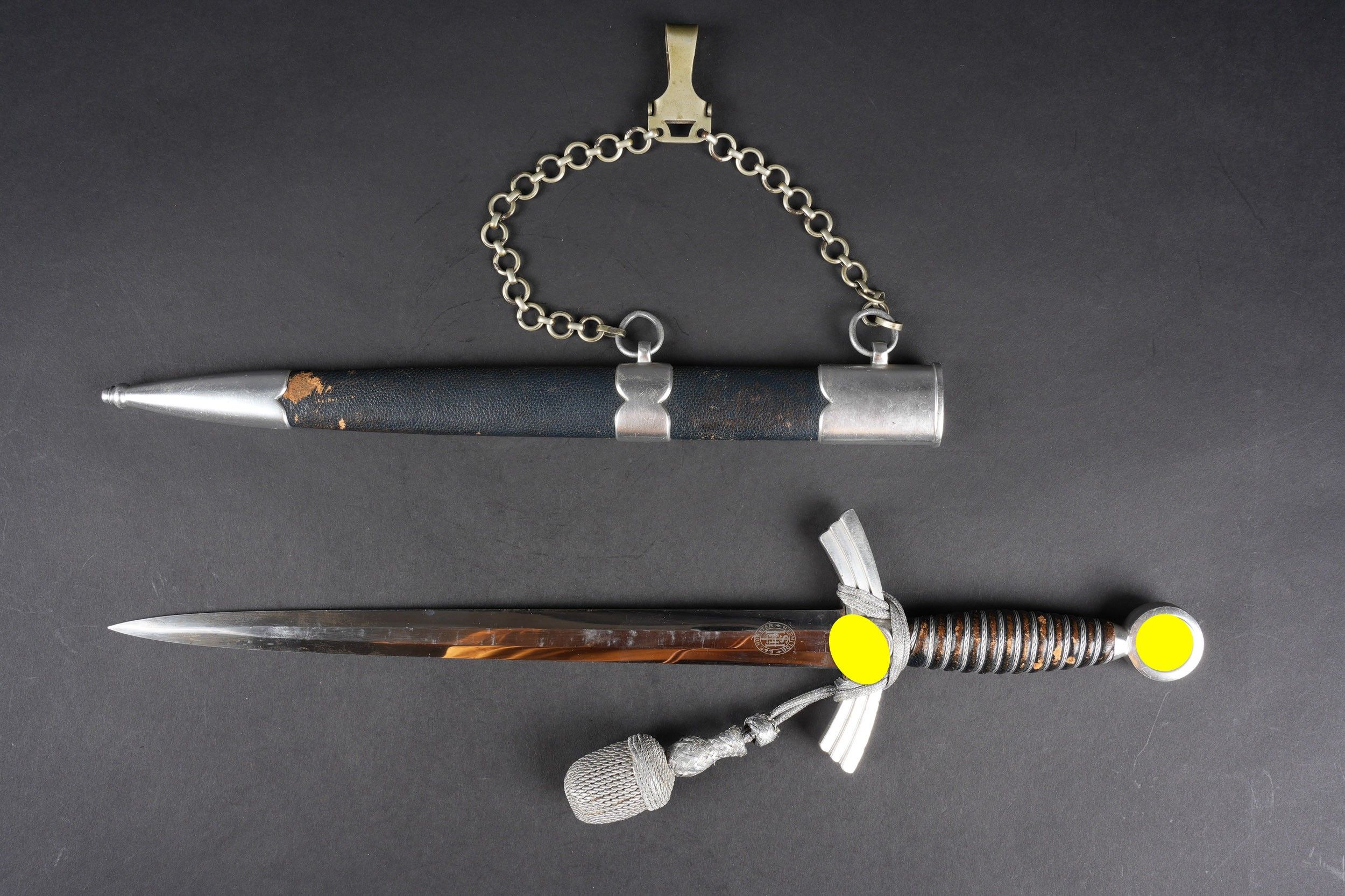 Luftwaffe officer's dagger. Silver-coloured metal fittings. The gilding of the national insignia is present. Blue Moroccan handle, heavily worn. Beautiful Hörster Solingen blade. Lanyard tied in accordance with regulations. The scabbard is covered with blue Moroccan cloth and shows some wear. Chain straps complete, functional snap hook. Some wear and patina. Condition II+. Luftwaffe officer's dagger. Metal fittings with silver finish. The gilding of the national emblems is still present. Blue Moroccan leather grip, heavily worn. Fine blade by Hörster Solingen. Portepee tied in regulation manner. Scabbard covered with blue Moroccan leather showing some losses. Complete chain hangers with functional snap hook. Some wear and patina throughout. Condition II+.