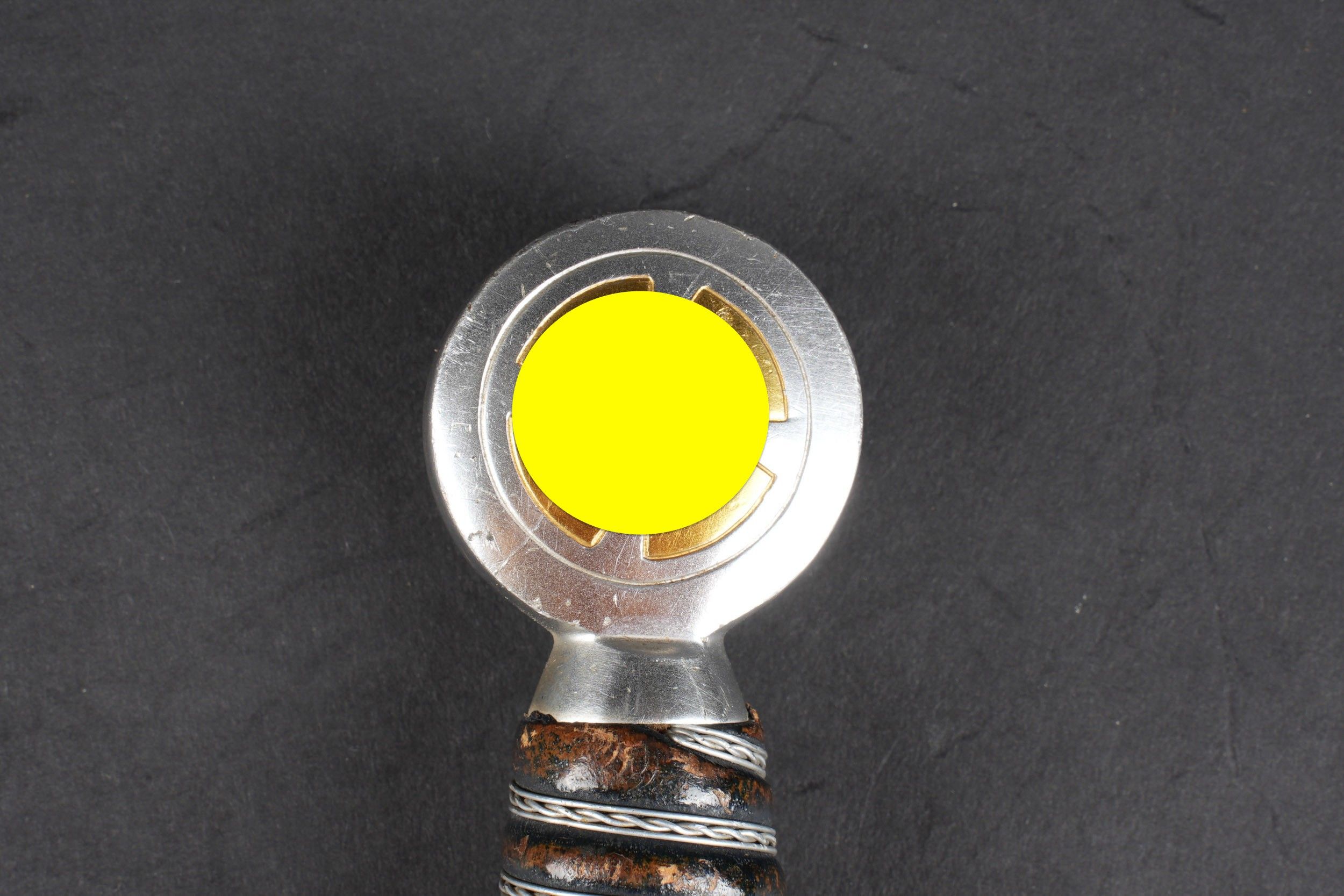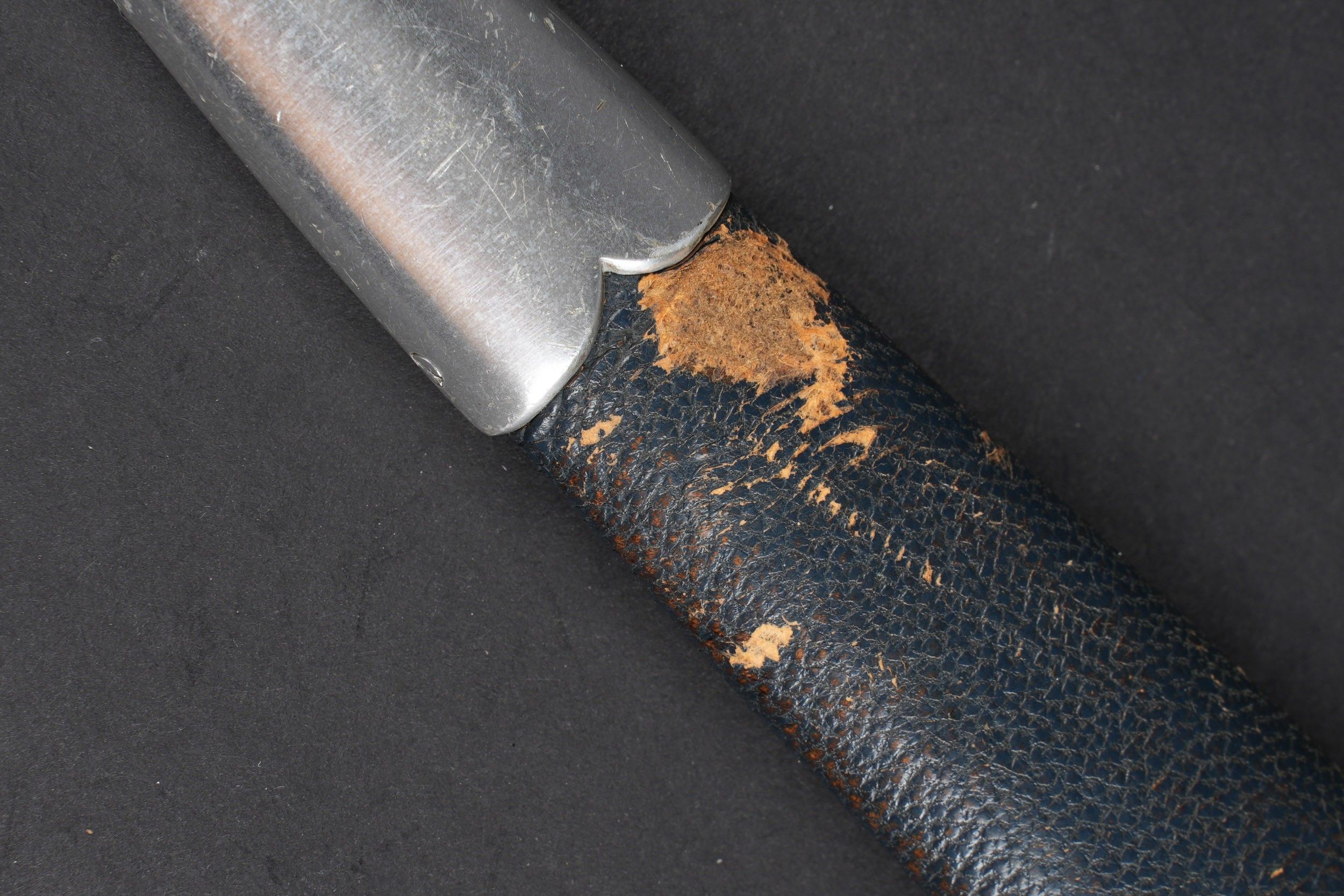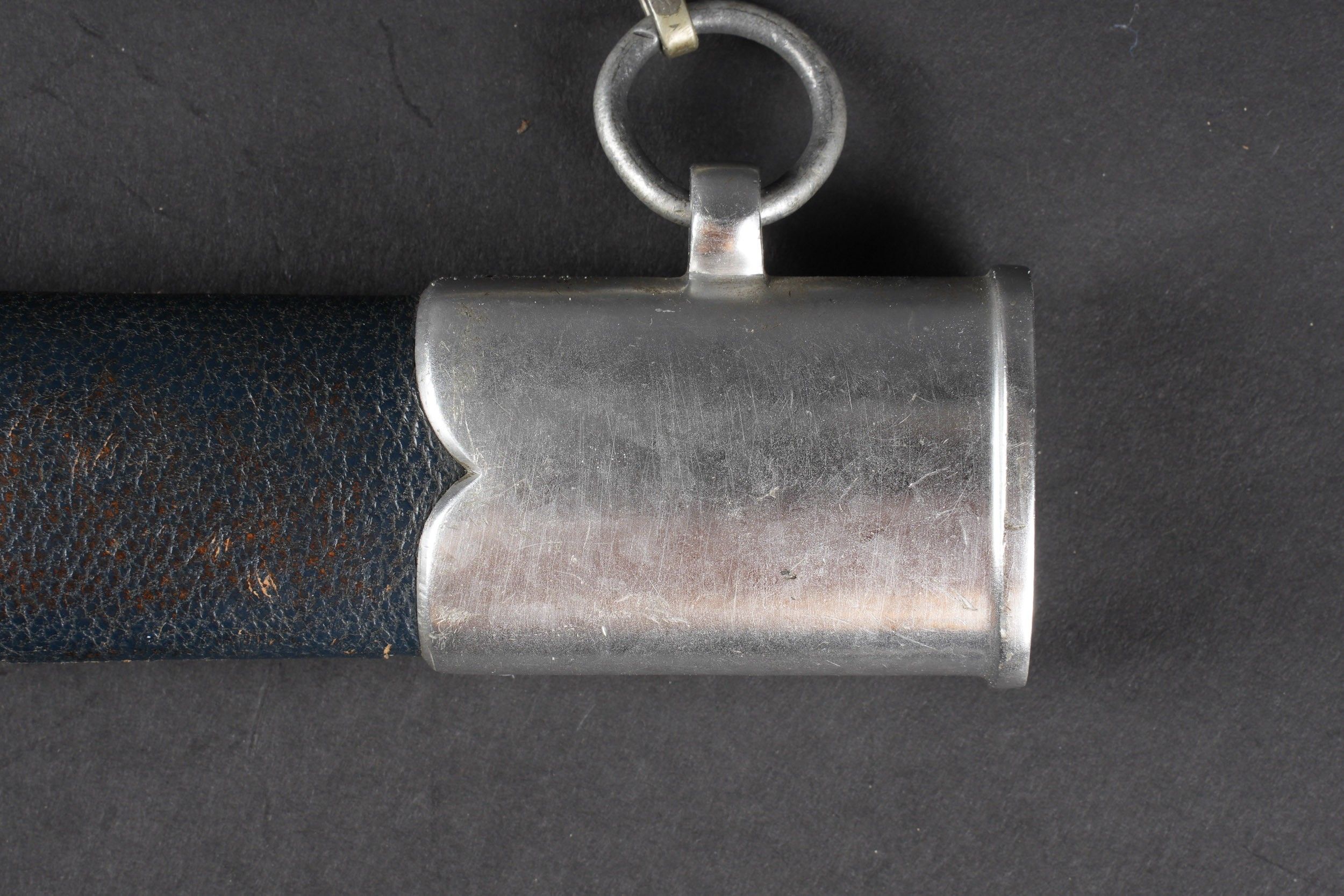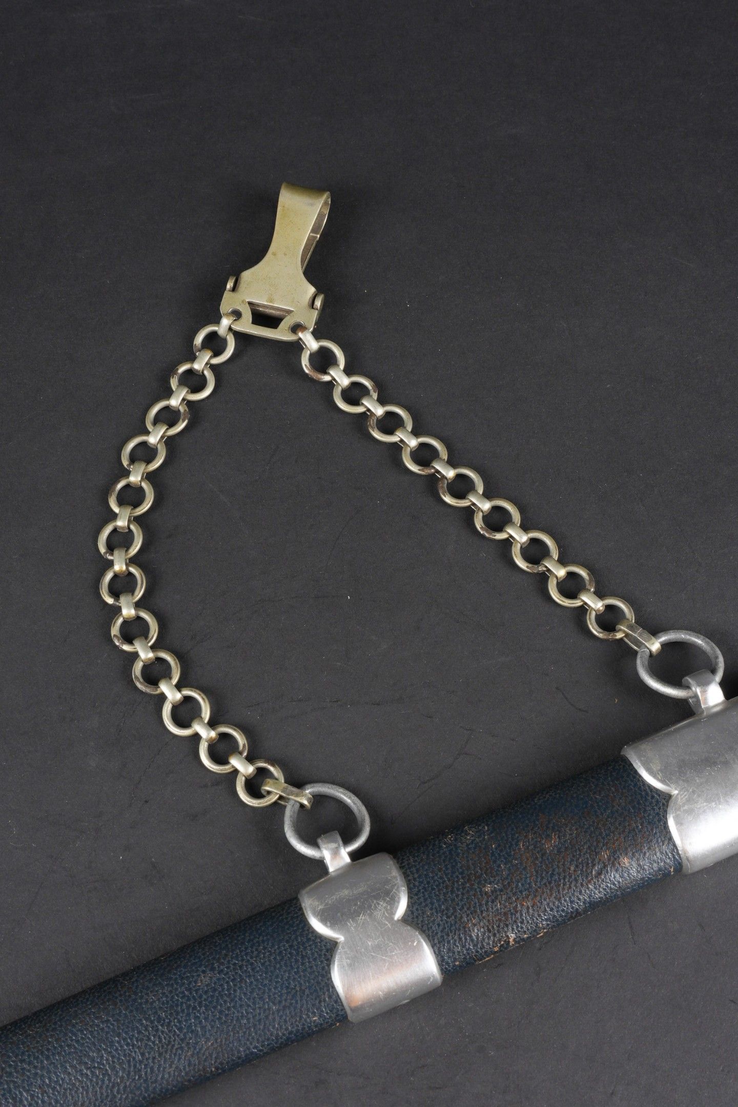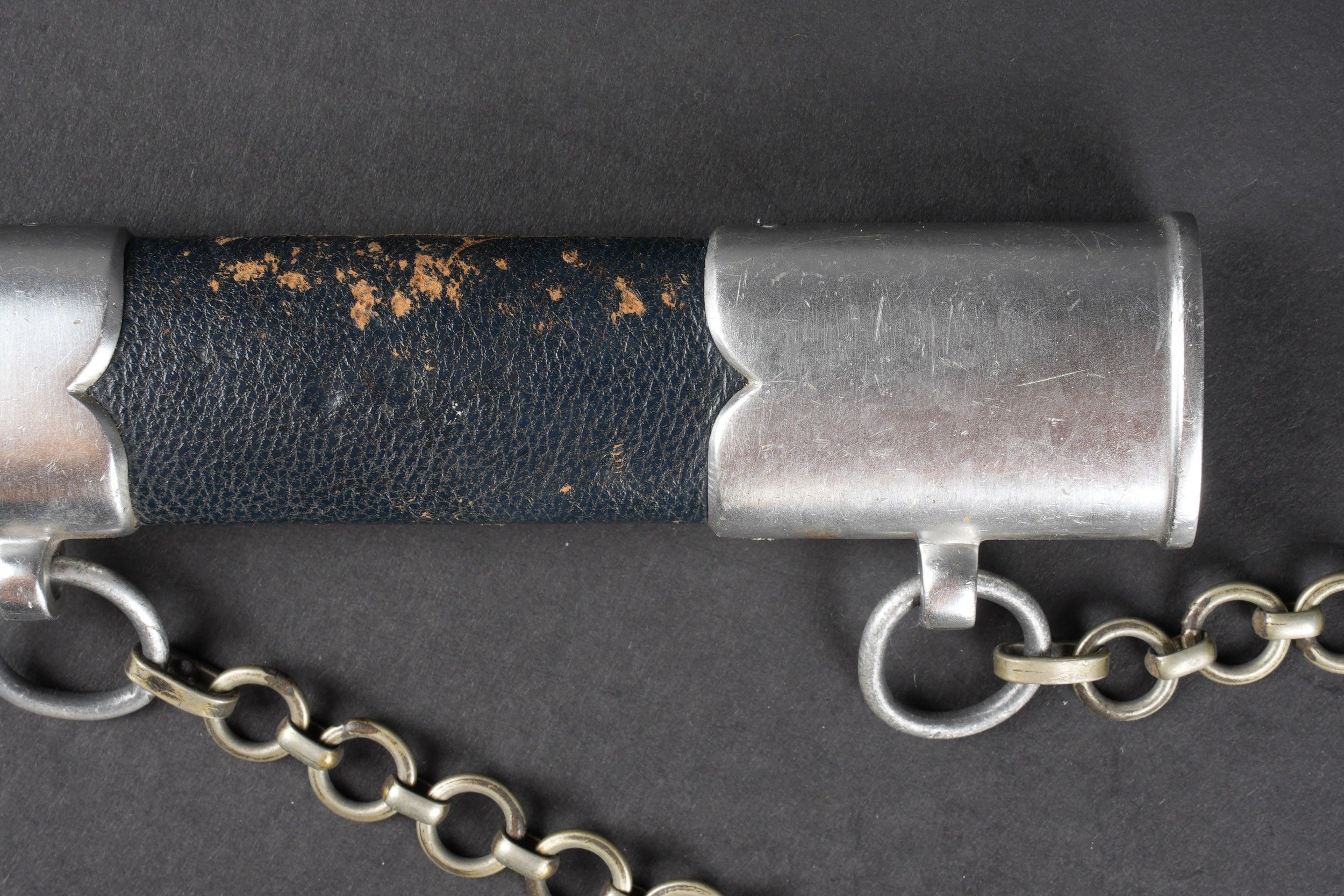 Luftwaffe officer's dagger. Silver-coloured metal fittings. The gilding of the national insignia is present. Blue Moroccan handle, heavily worn. Beautiful Hörster Solingen blade. Lanyard tied in accordance with regulations. The scabbard is covered with blue Moroccan cloth and shows some wear. Chain straps complete, functional snap hook. Some wear and patina. Condition II+. Luftwaffe officer's dagger. Metal fittings with silver finish. The gilding of the national emblems is still present. Blue Moroccan leather grip, heavily worn. Fine blade by Hörster Solingen. Portepee tied in regulation manner. Scabbard covered with blue Moroccan leather showing some losses. Complete chain hangers with functional snap hook. Some wear and patina throughout. Condition II+.