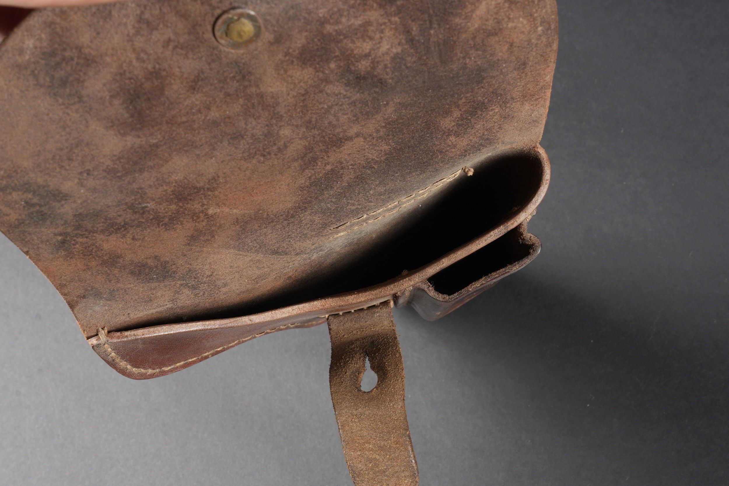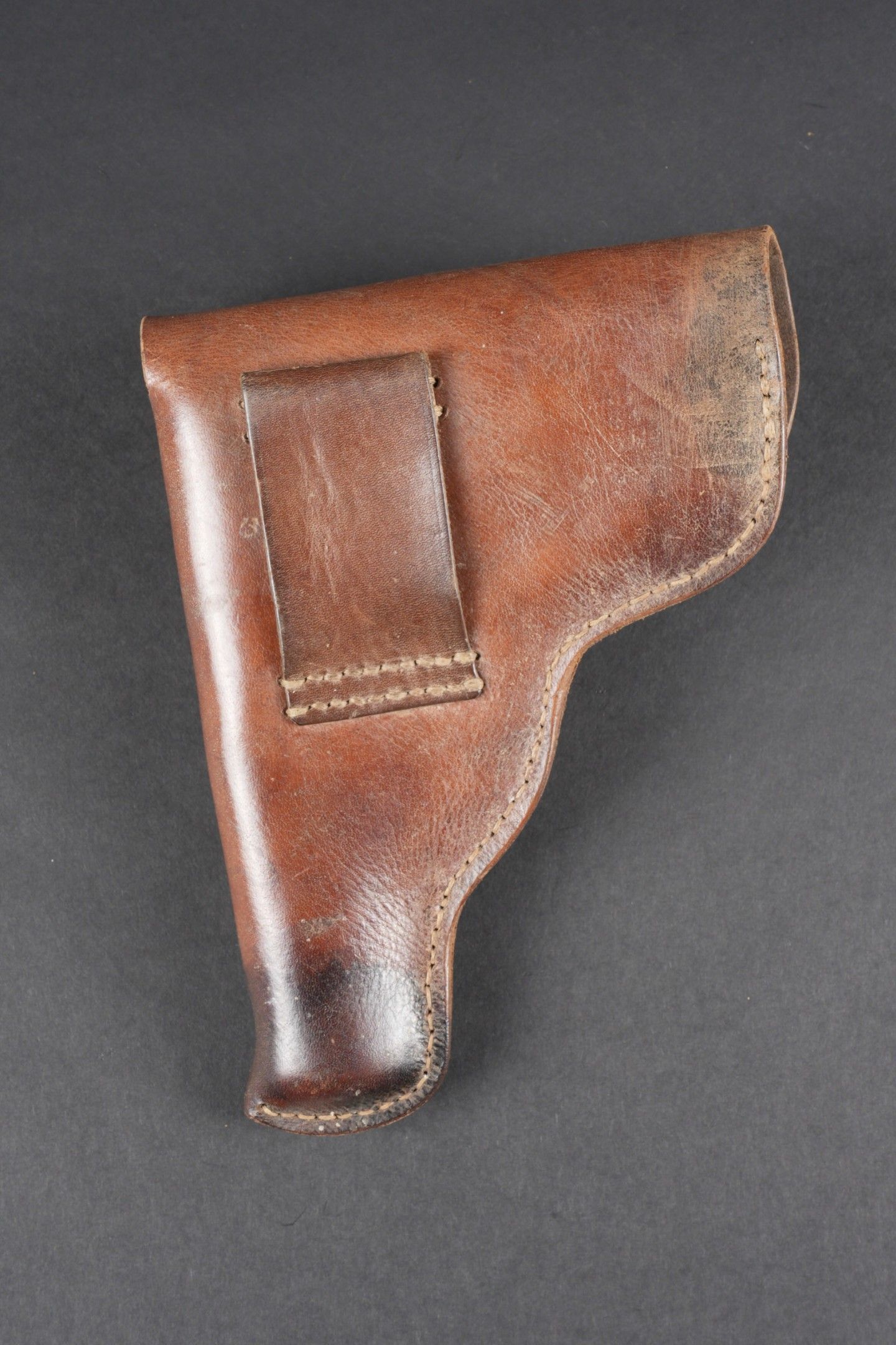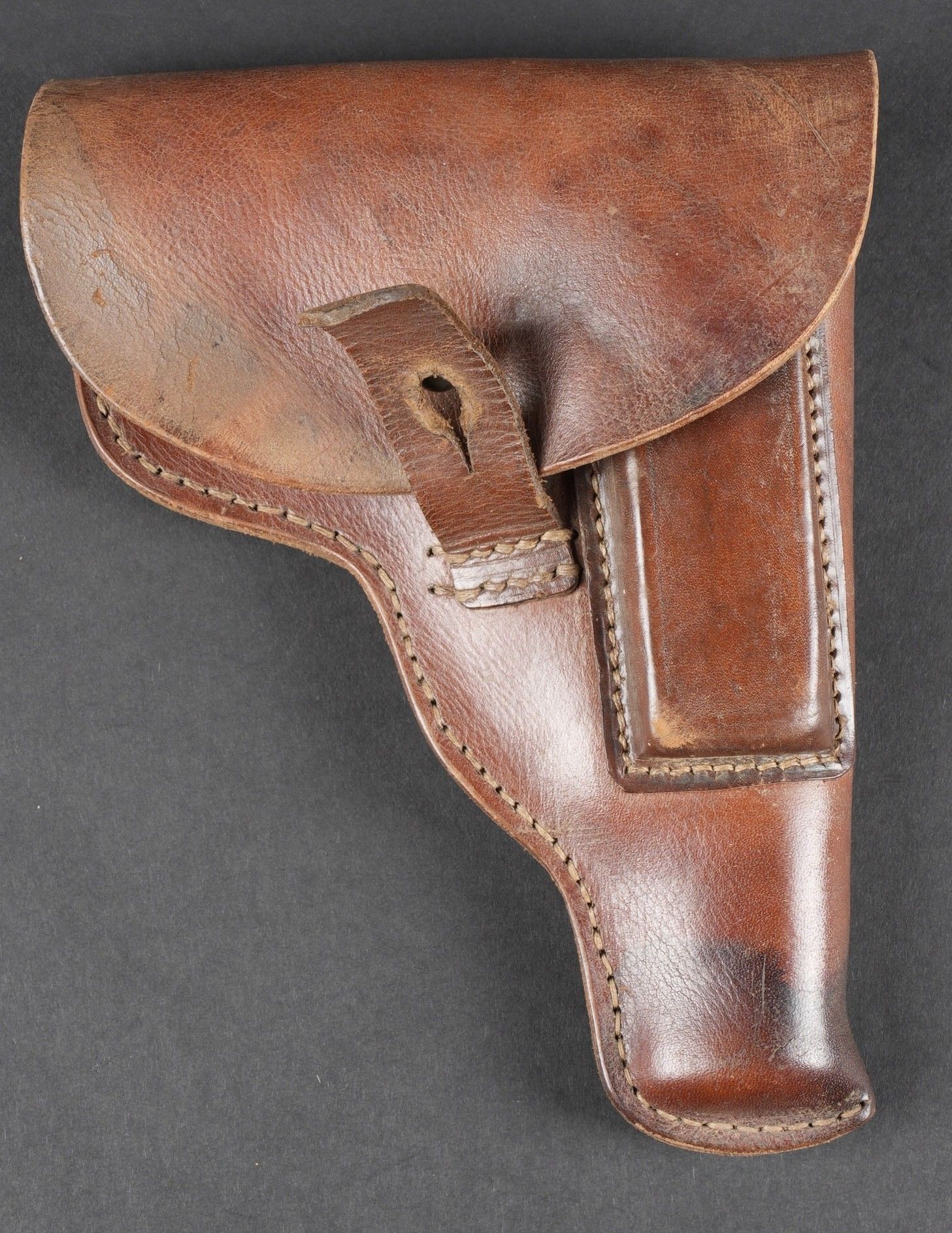 German pistol holster. Brown leather. The closure tab is complete, as is the loop on the back. No visible markings. Some wear and patina. Condition II+. German pistol holster. Brown leather holster with complete closure strap and rear belt loop. No visible markings. Shows service wear and light patina. Condition II+.
