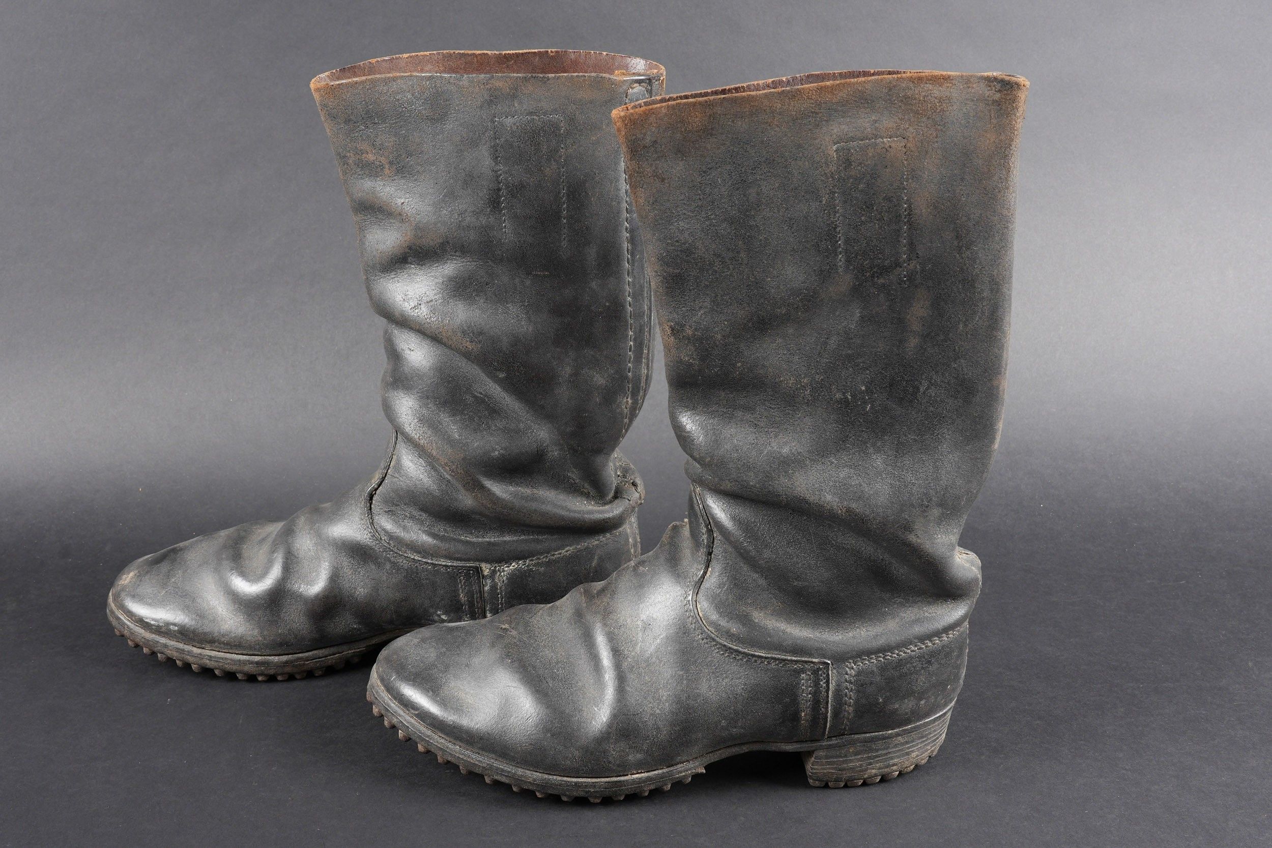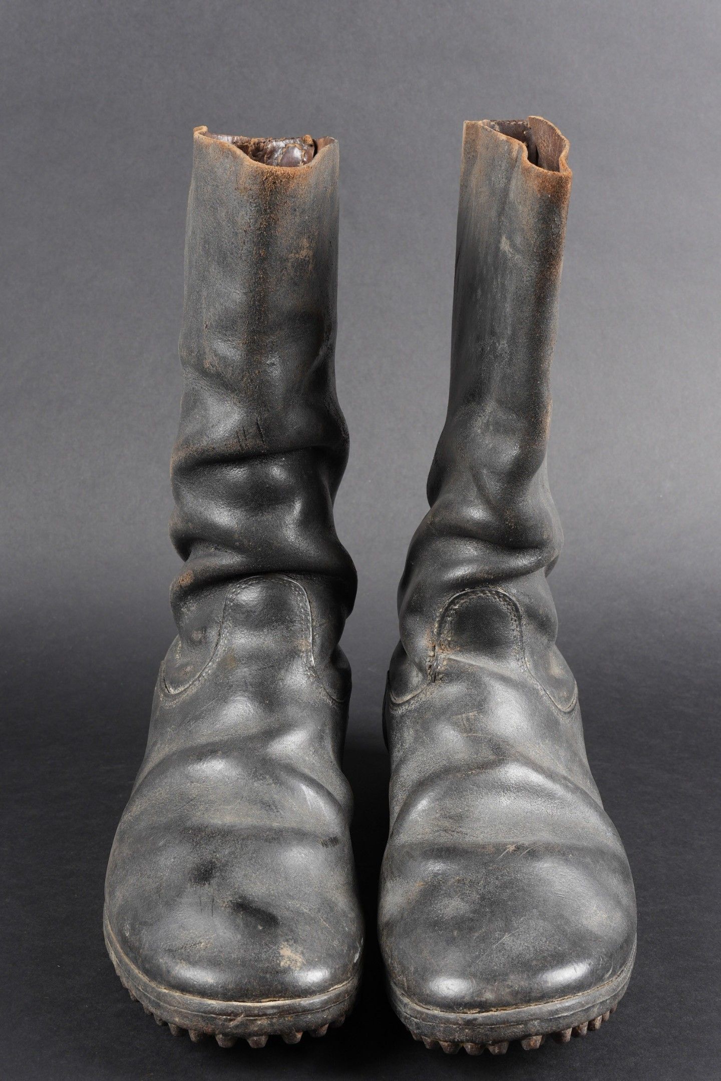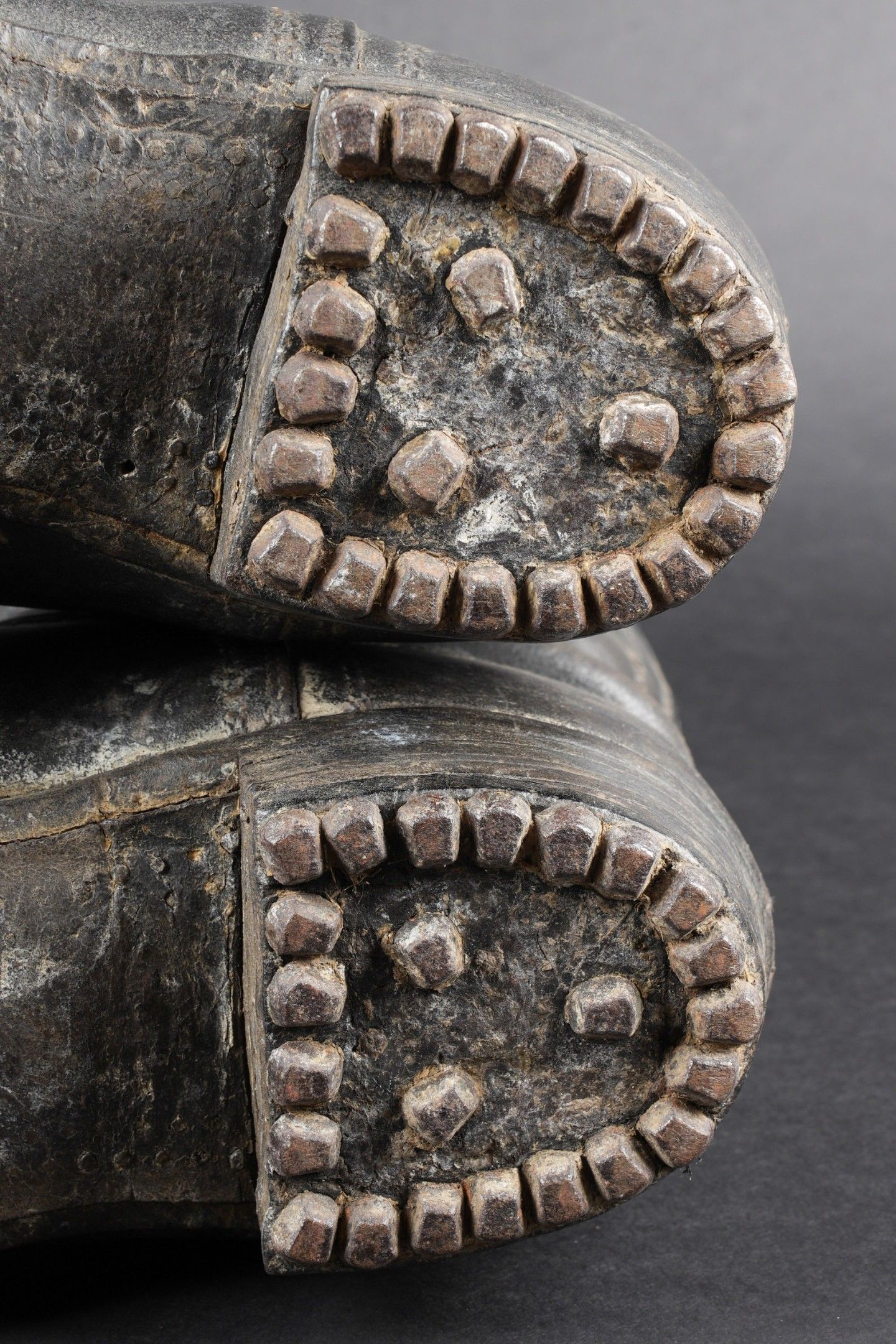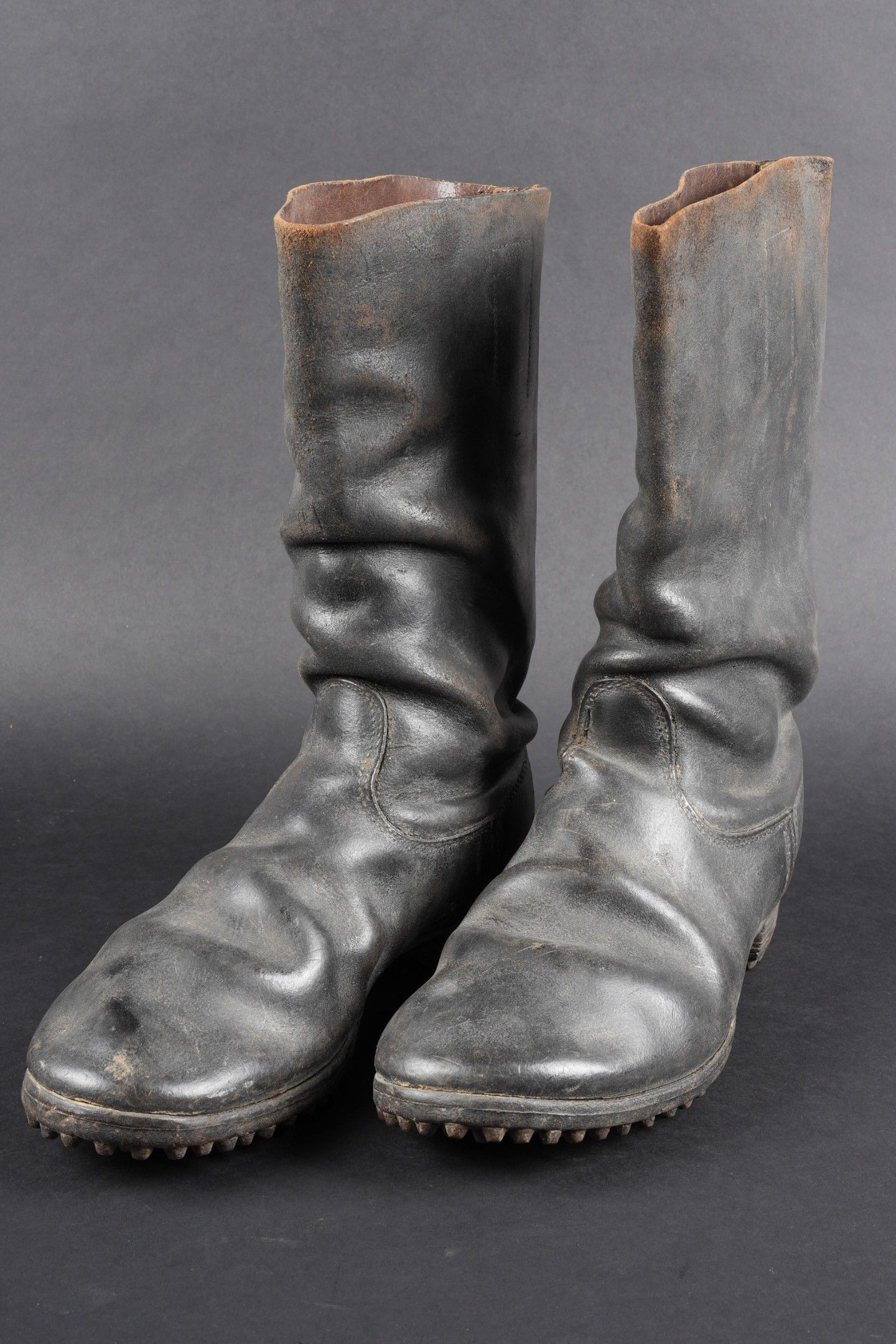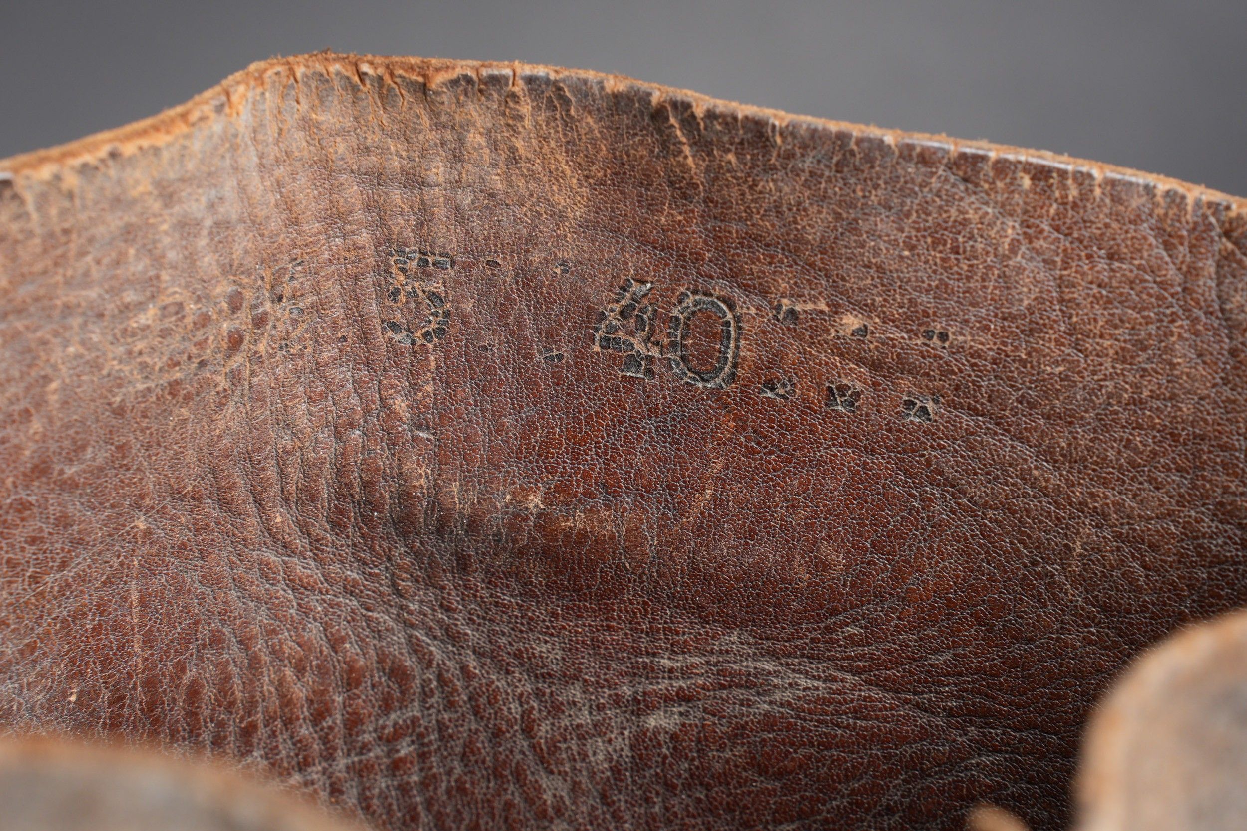 German boots. Short uppers. Homogenous pair. Internal markings 28 1/2 5 40. Studded heels and soles. Some wear and patina. Condition II+. German Boots. Short shaft model, matching pair. Inside markings 28 1/2 5 40. Studded heels and soles. Shows expected service wear and patina. Condition II+.