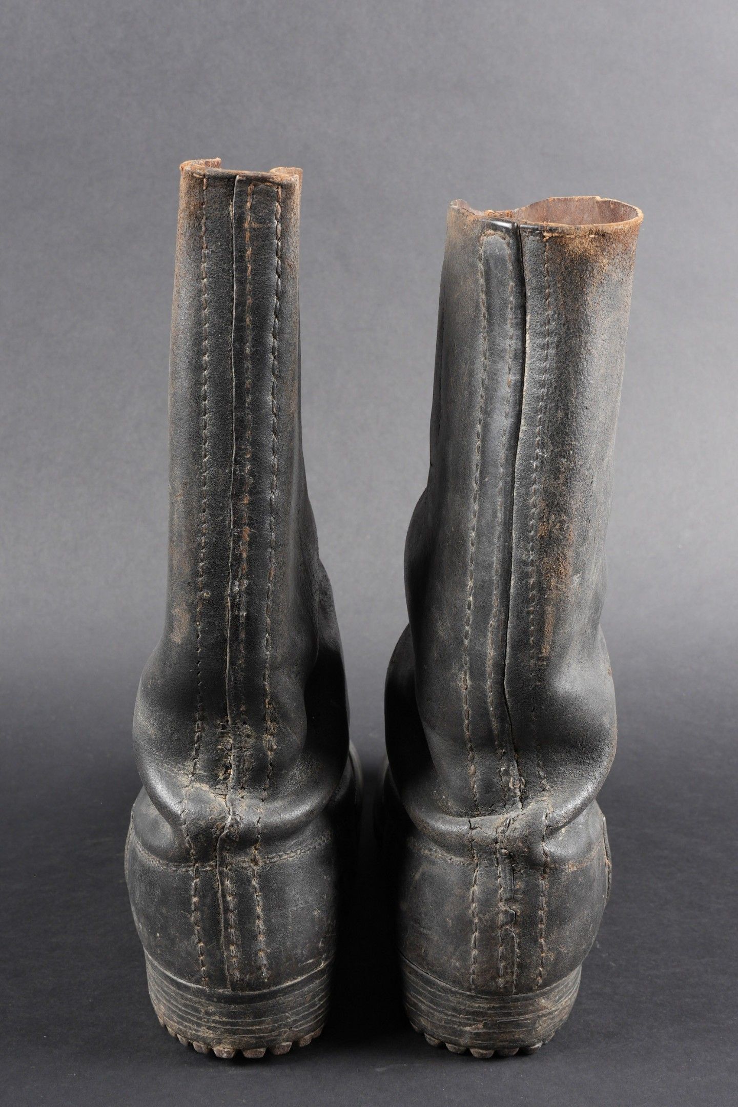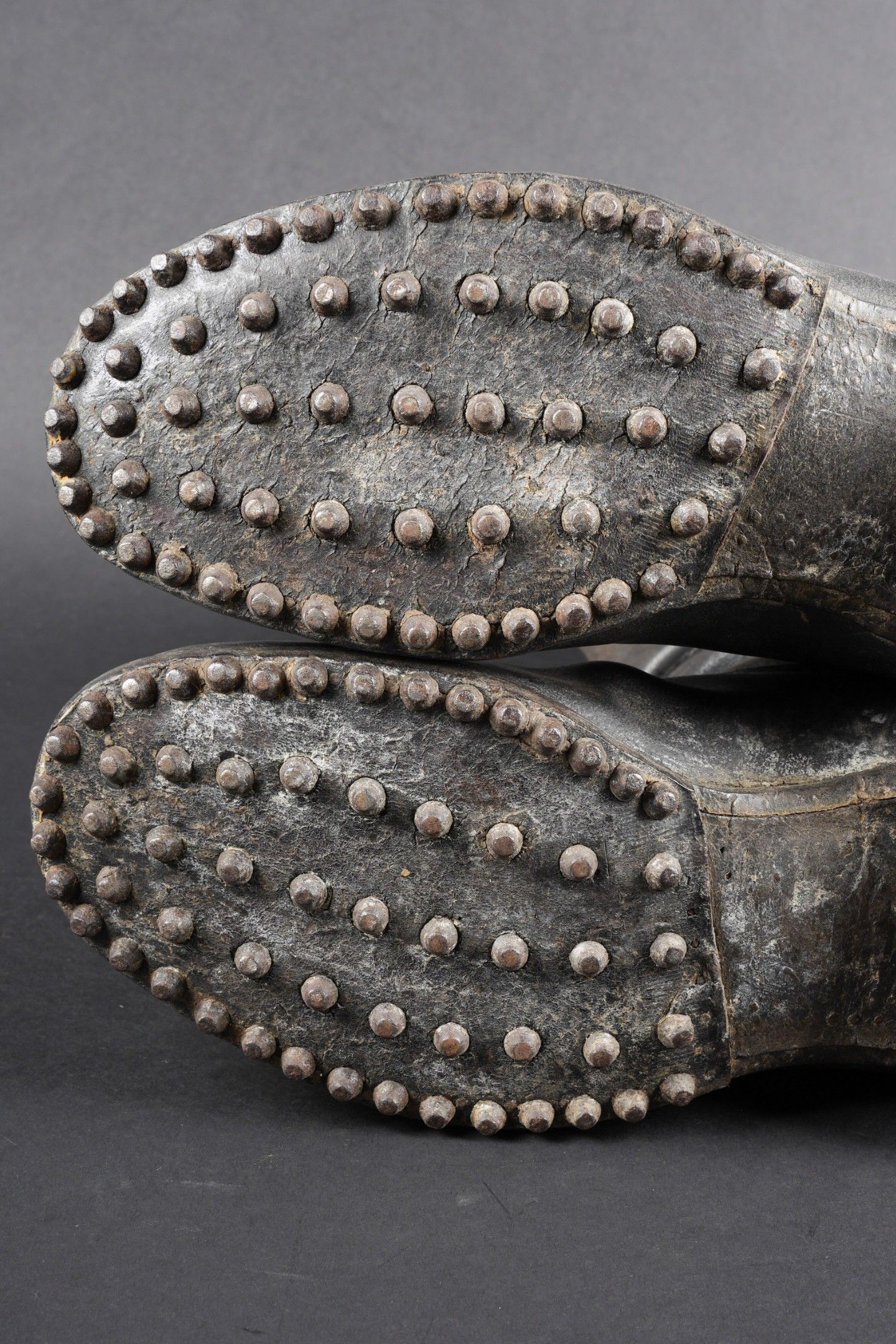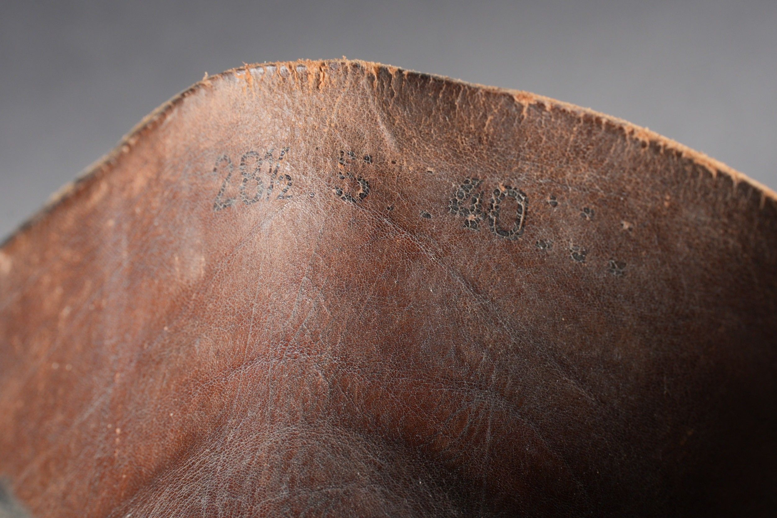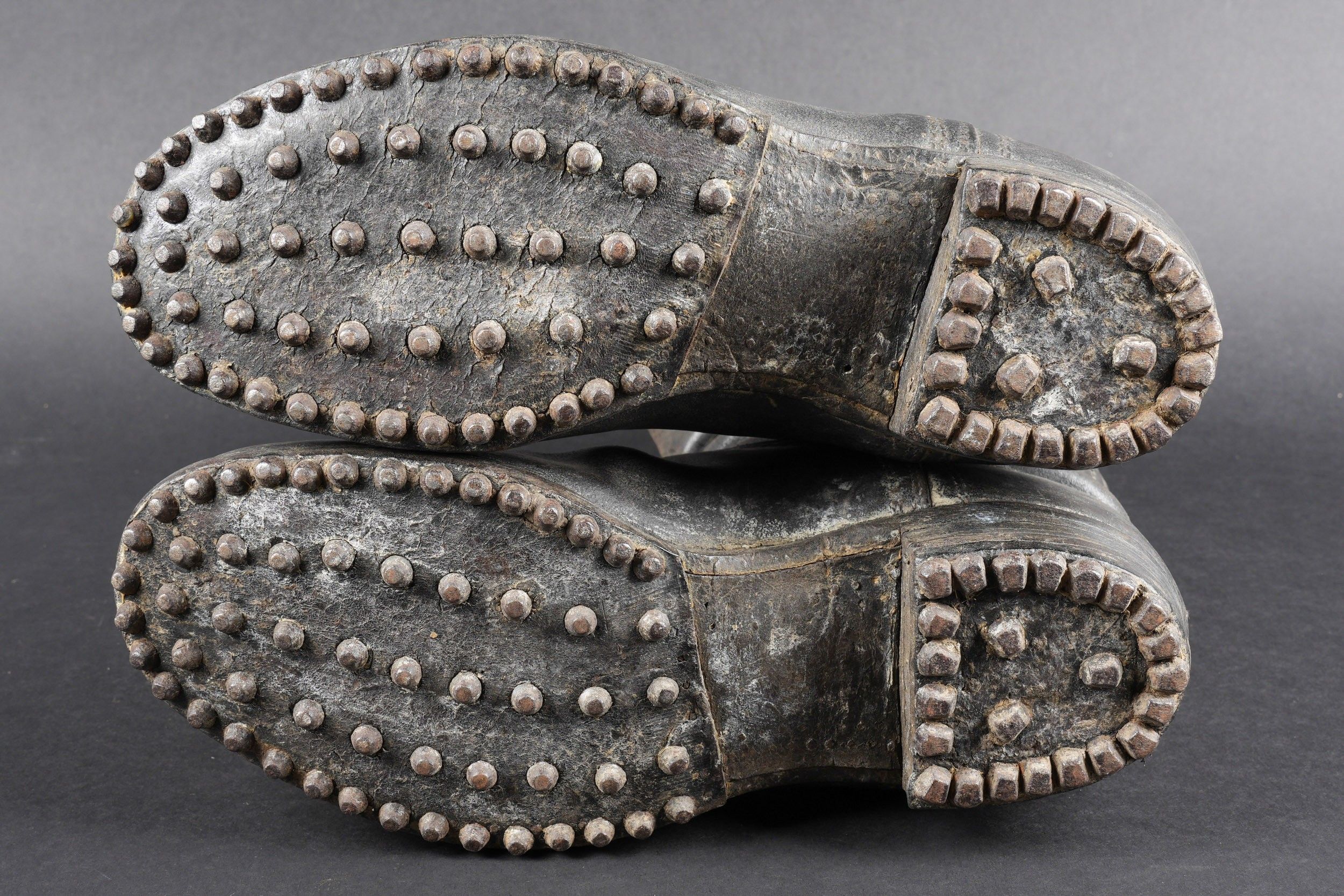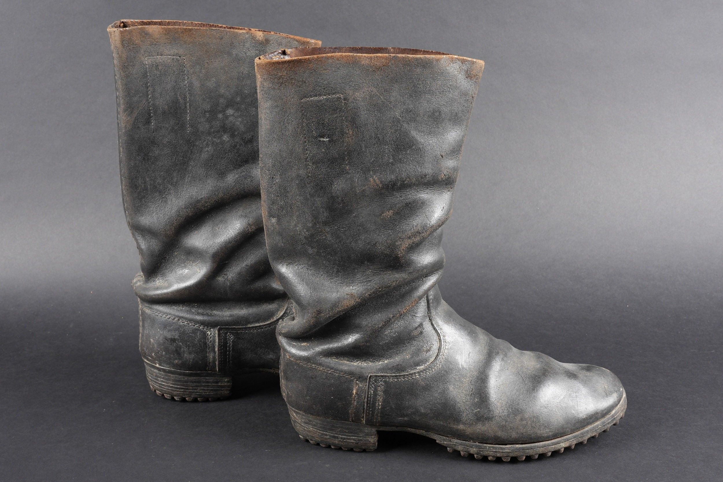 German boots. Short uppers. Homogenous pair. Internal markings 28 1/2 5 40. Studded heels and soles. Some wear and patina. Condition II+. German Boots. Short shaft model, matching pair. Inside markings 28 1/2 5 40. Studded heels and soles. Shows expected service wear and patina. Condition II+.