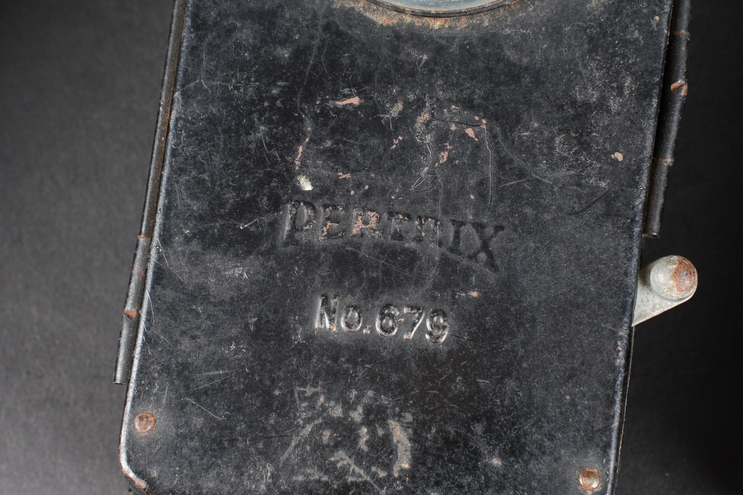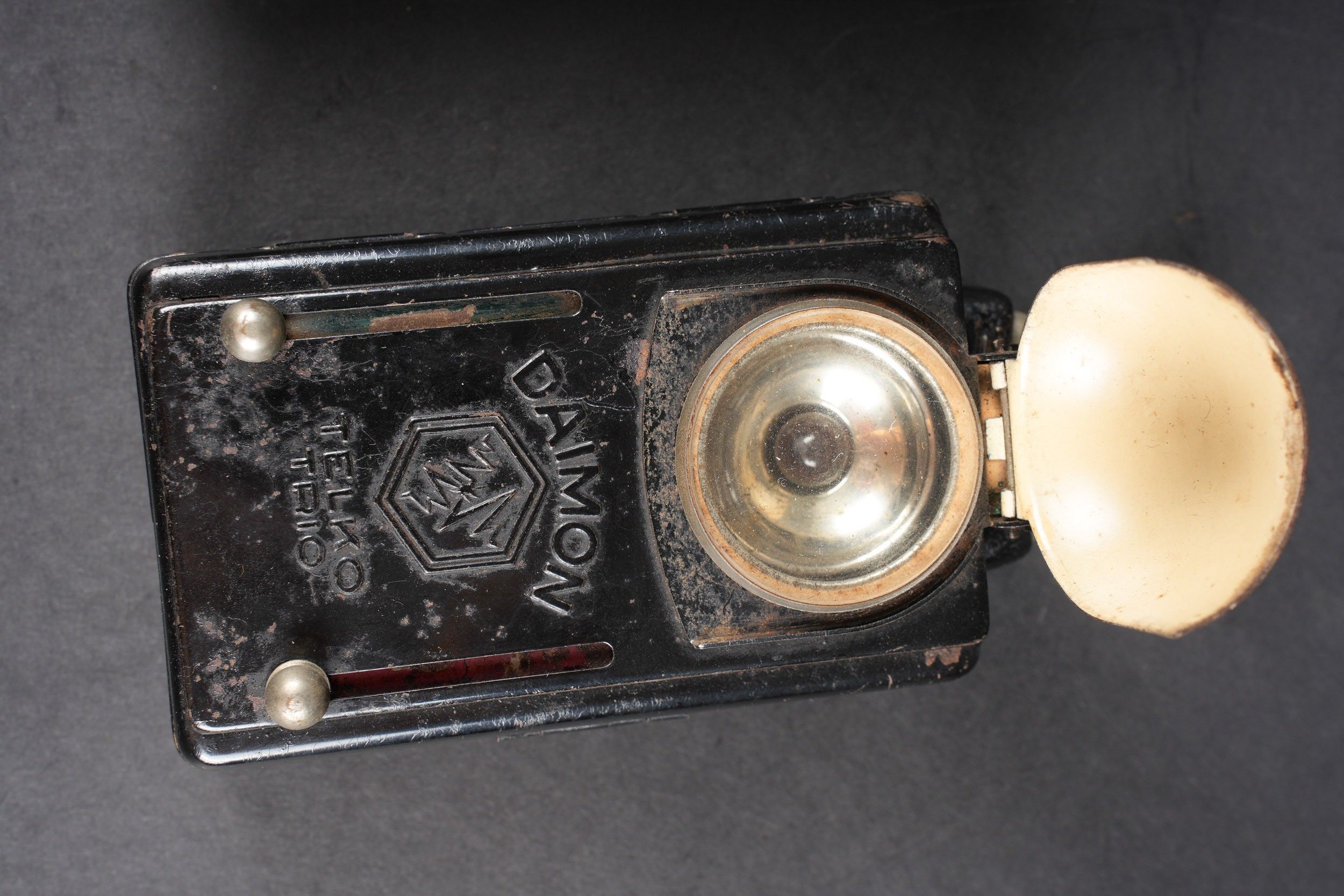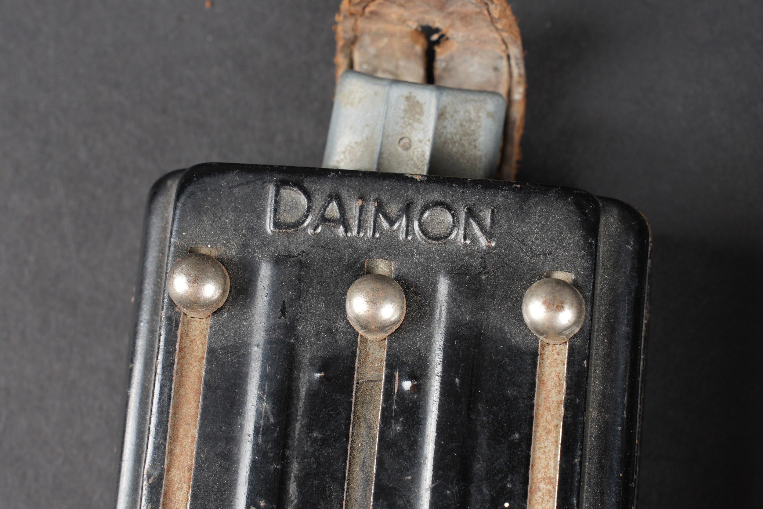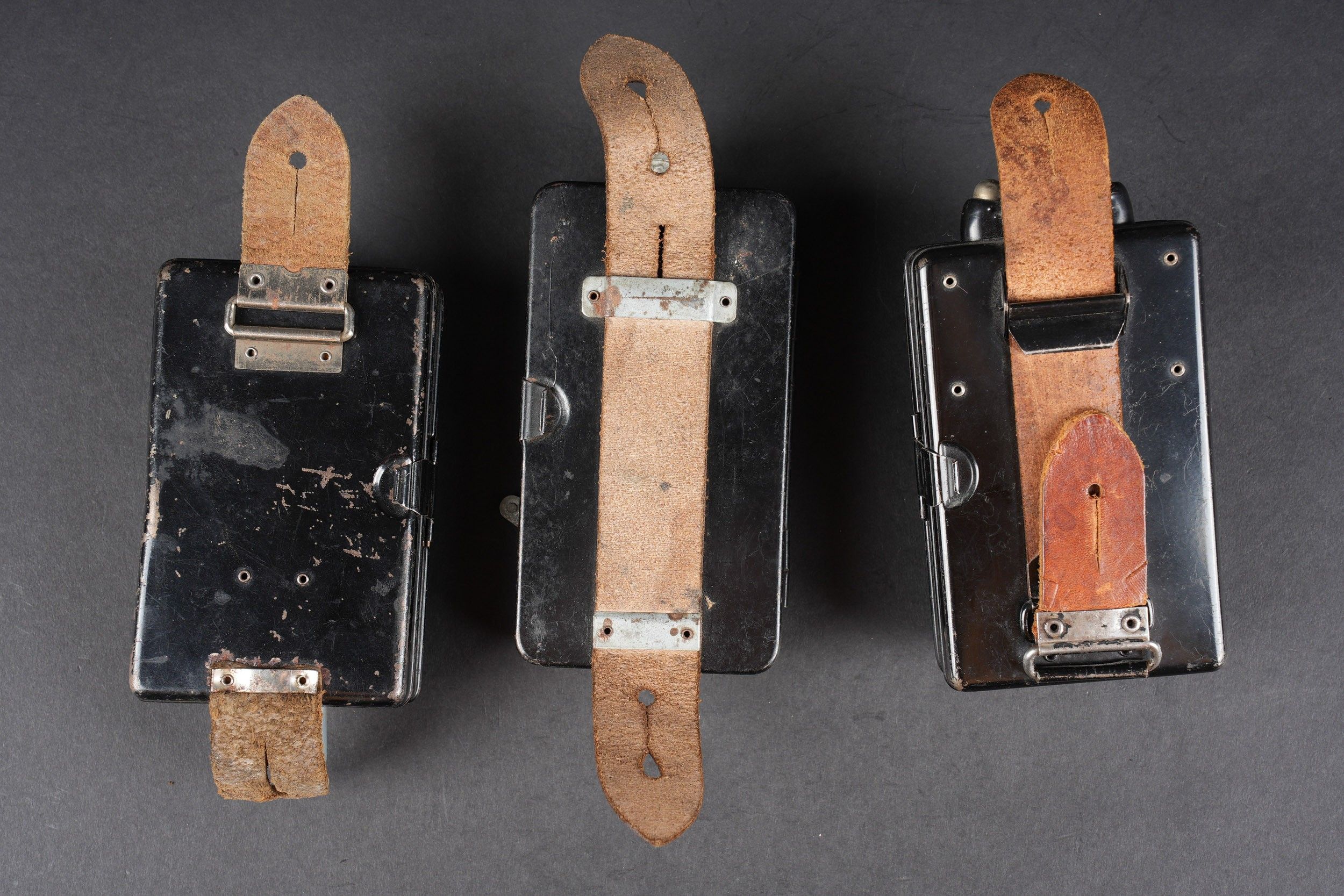 German torch. Comprising one metal torch, bulb present, batteries missing, leather feet present, Daimon manufacture. A metal torch, all metal parts present, leather feet present, Daimon Telko Trio manufacture, bulb present, battery missing. A metal torch, bulb and battery missing, leather feet present. Made by Pertrix 679. Some wear and patina to be noted. Condition II+. German Flashlights. Includes: one metal flashlight with bulb, missing batteries, leather straps intact, maker Daimon. One Daimon Telko Trio metal flashlight with bulb present, battery missing, leather fittings complete. One Pertrix 679 metal flashlight, bulb and battery absent, straps present. All show minor wear and patina. Condition II+.